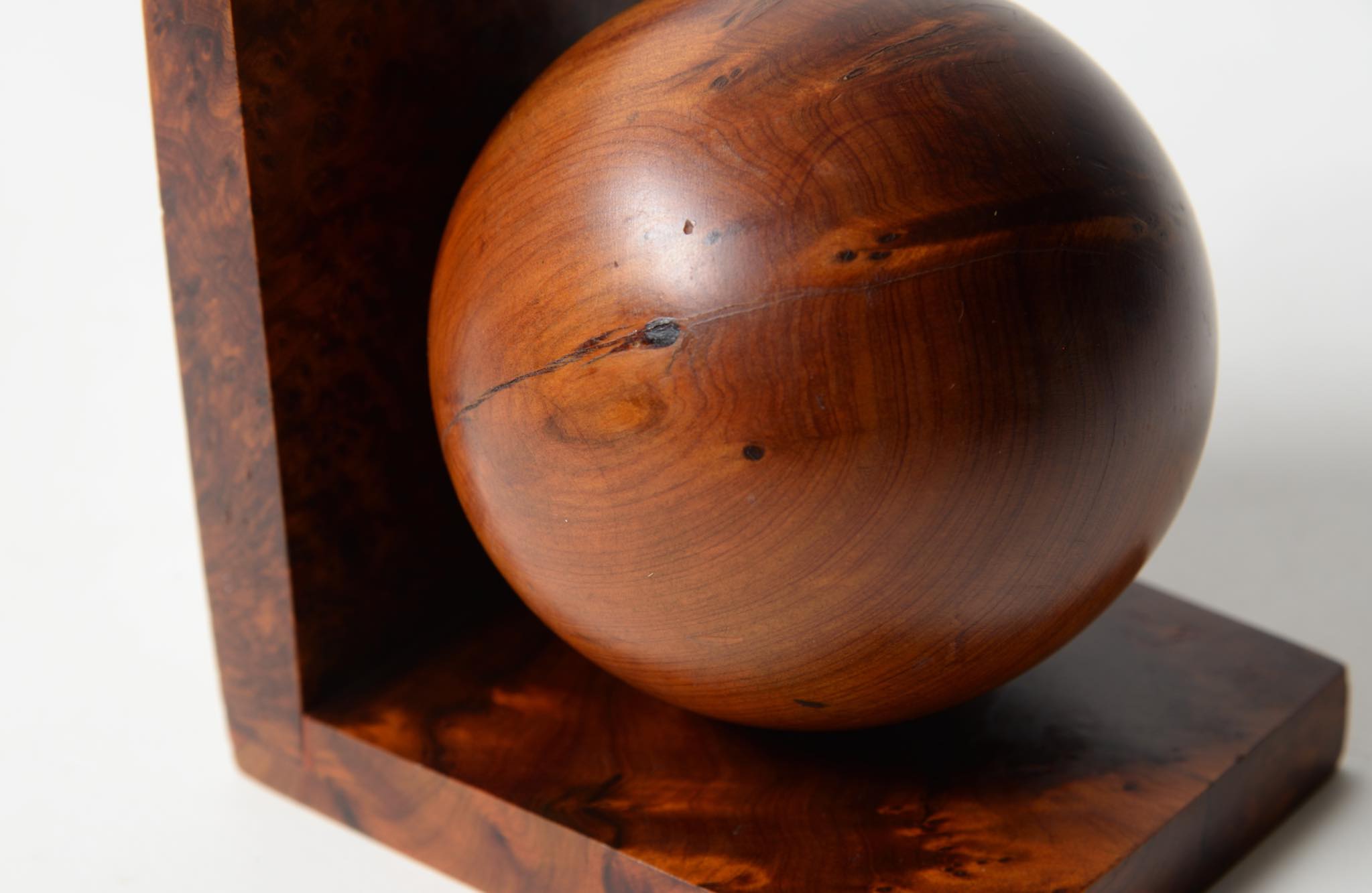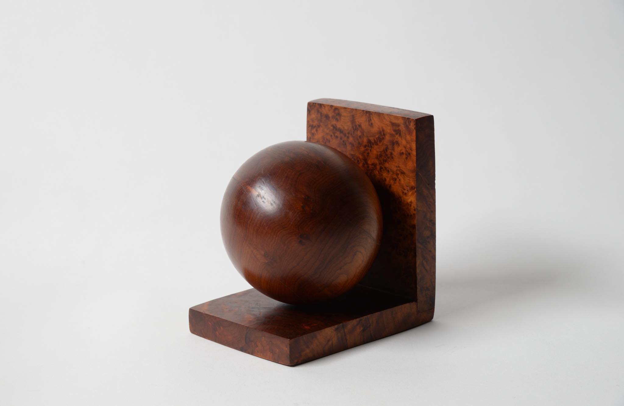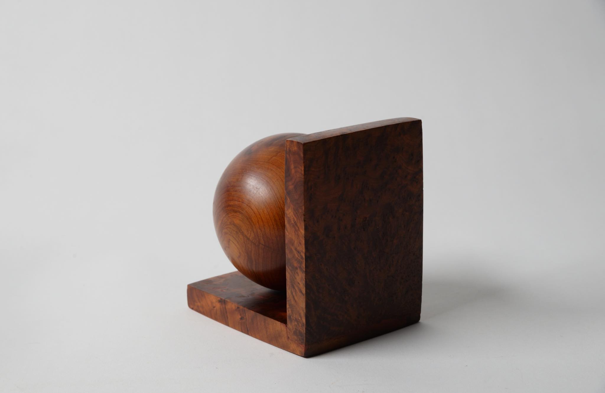 デンマークの木工芸職人によって作られたブックエンドです。1930年代頃のものでしょう。アール・デコ様式の作品で、バール杢の板にコーカサス・ウォルナット材と思われる削り出しの球体が備わっています。重量はそれほど重くないので、機能というよりは装飾的な置き物としてお考えいただいた方が良いでしょう。