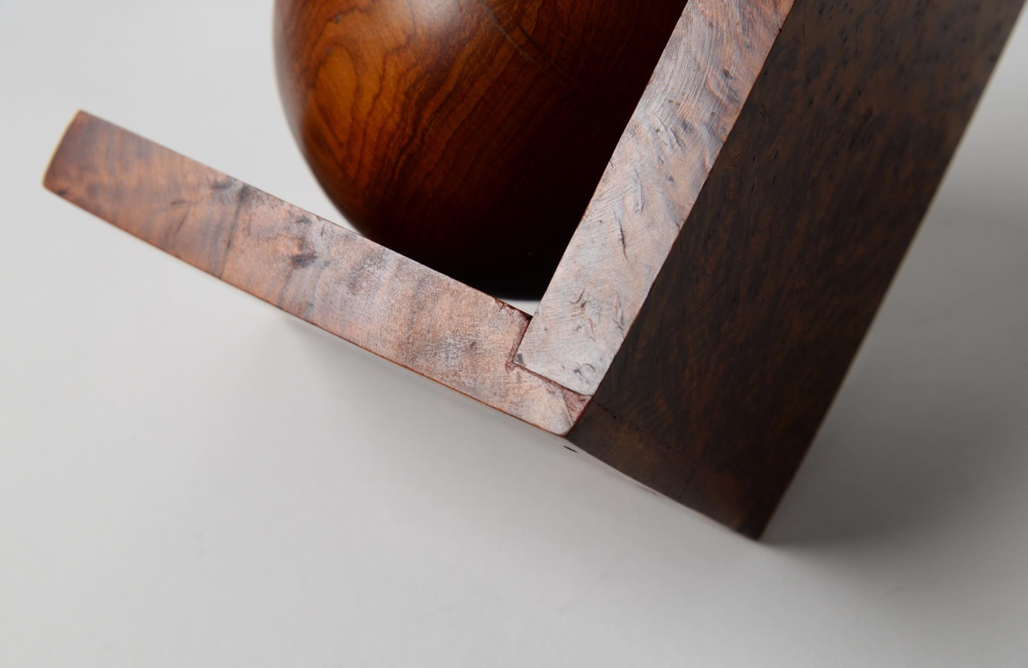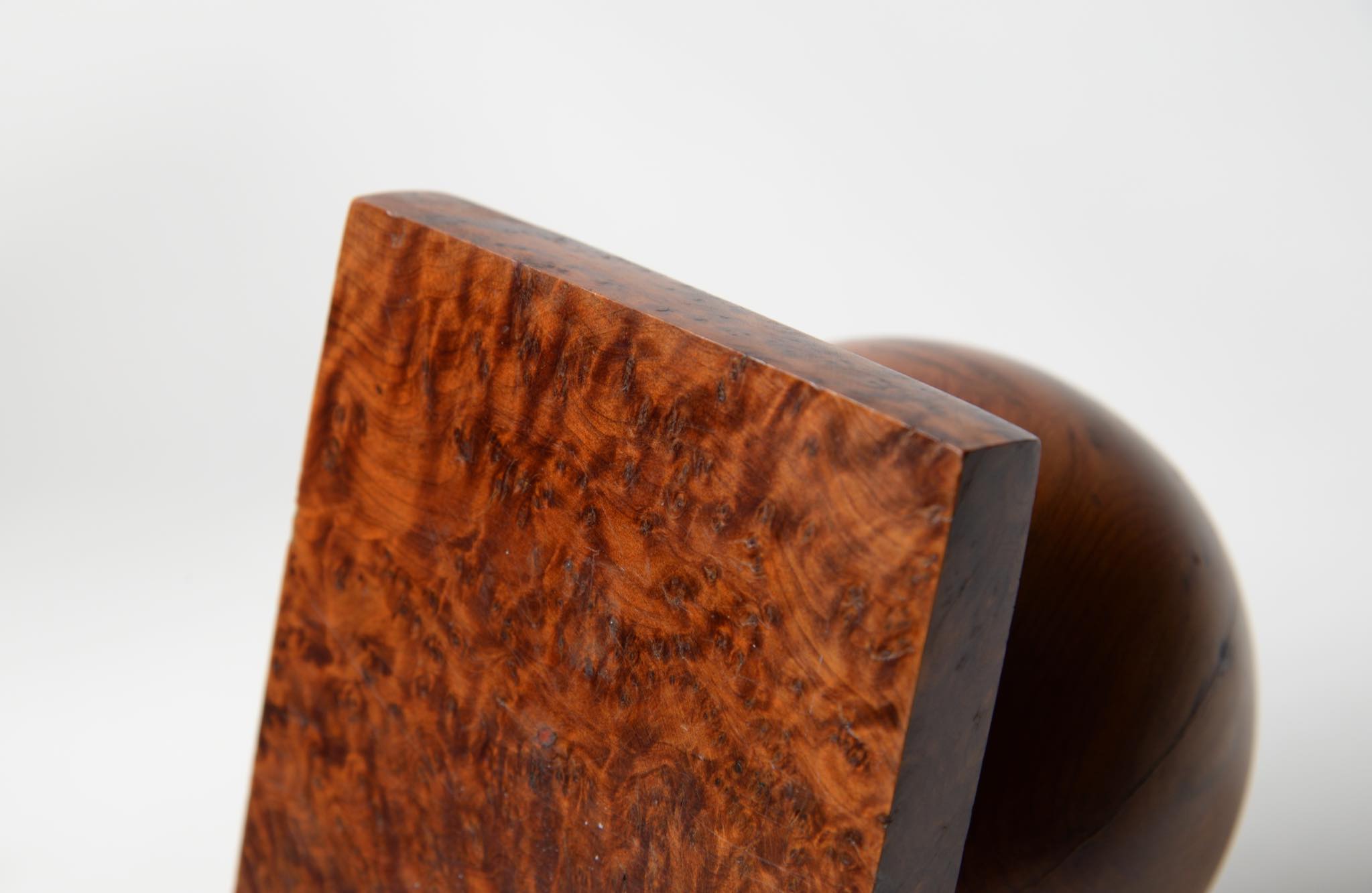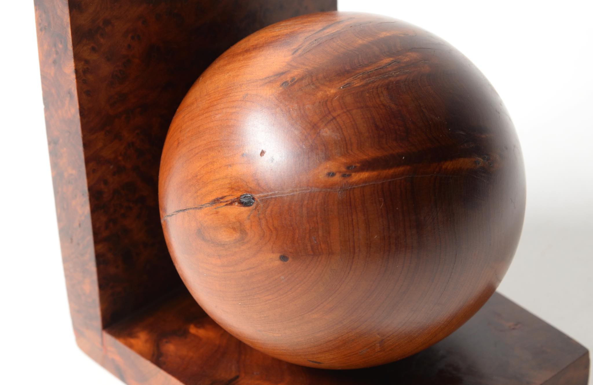 デンマークの木工芸職人によって作られたブックエンドです。1930年代頃のものでしょう。アール・デコ様式の作品で、バール杢の板にコーカサス・ウォルナット材と思われる削り出しの球体が備わっています。重量はそれほど重くないので、機能というよりは装飾的な置き物としてお考えいただいた方が良いでしょう。