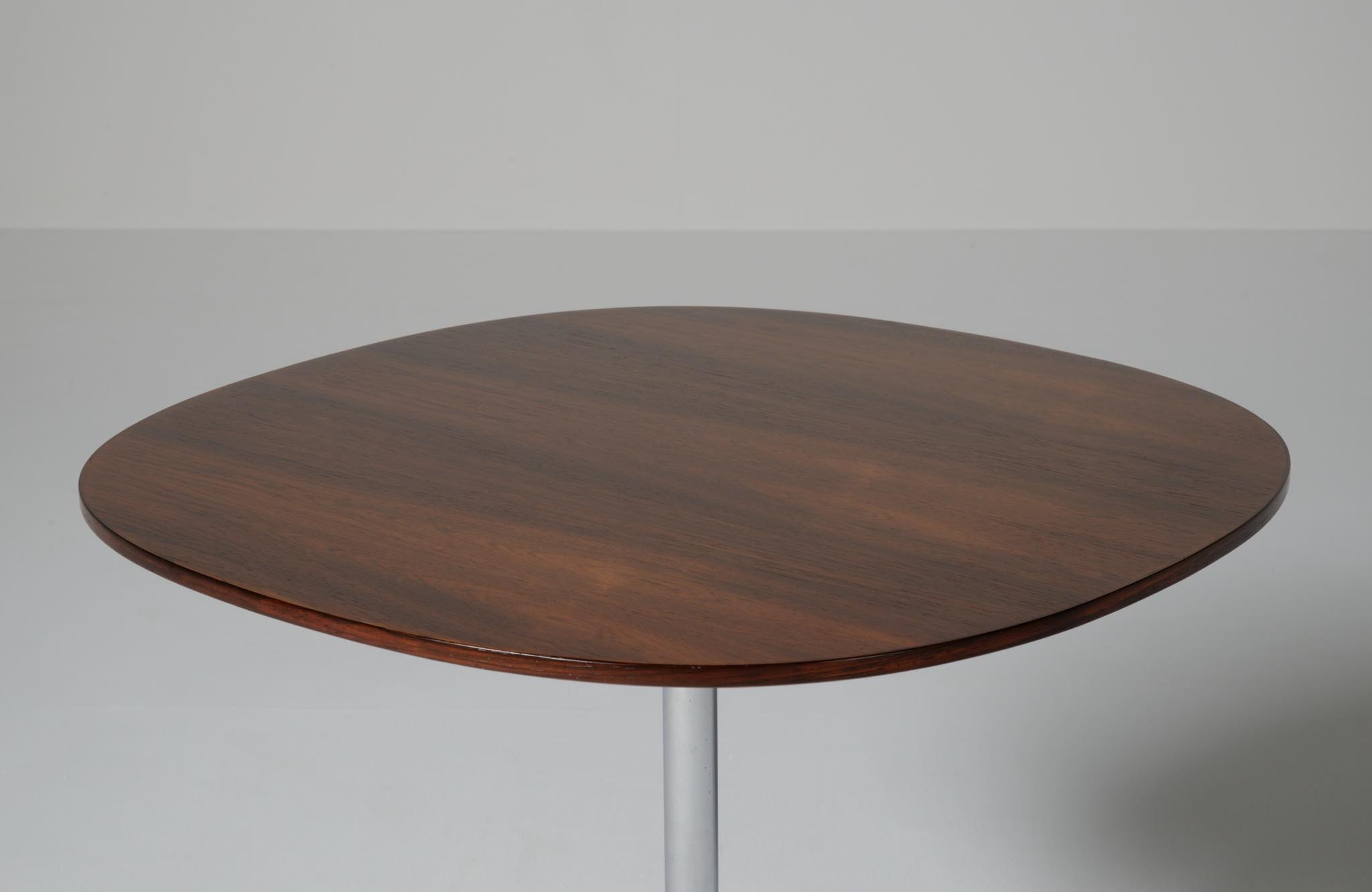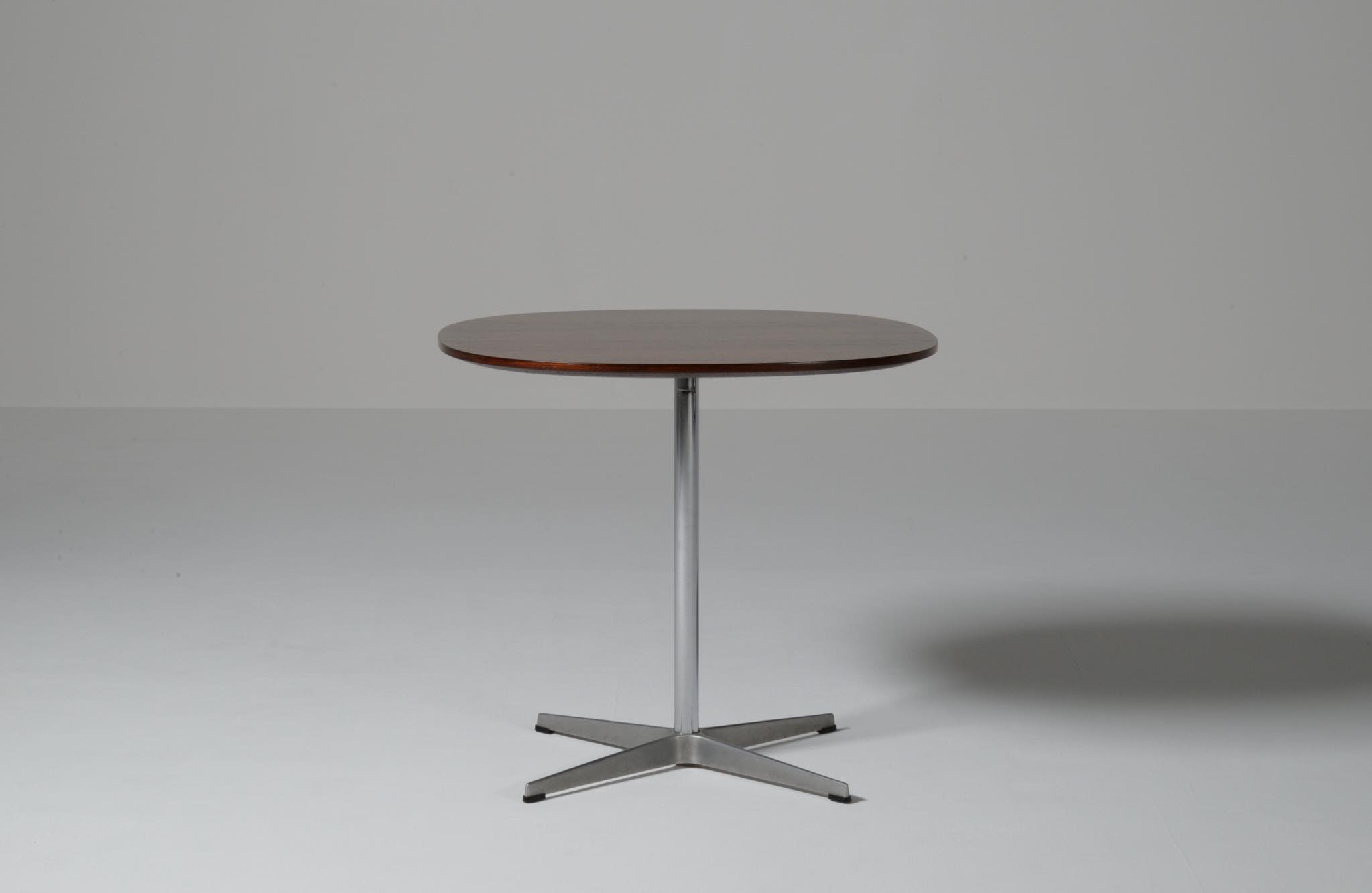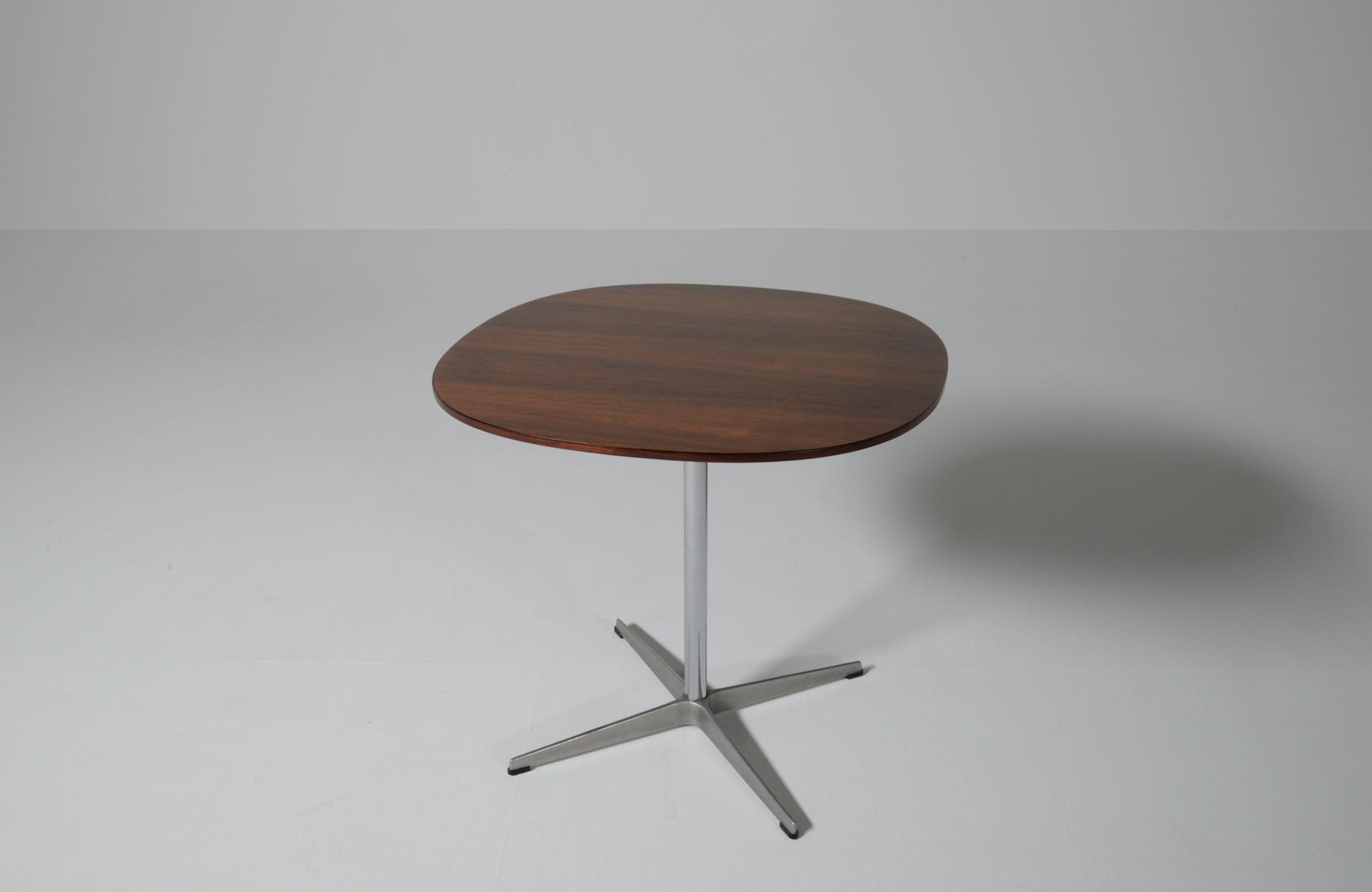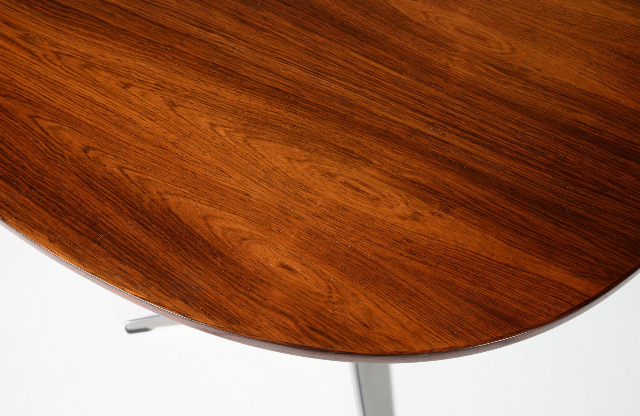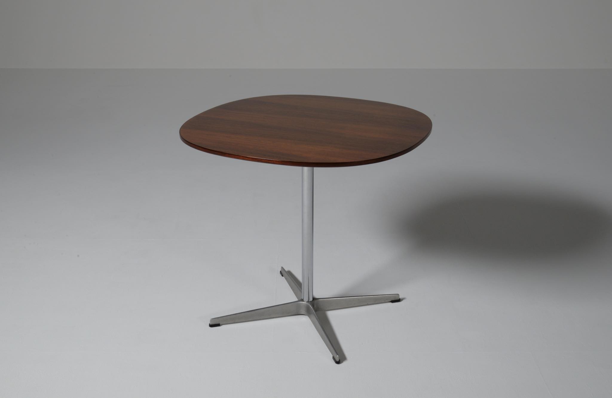 デンマークを代表する建築家のArne Jacobsen/アルネ・ヤコブセンによるカフェテーブルです。1970年代頃に作られたものでしょう。ブラジリアンと思しきローズウッドを用いており、ピート・ハインのデザインと思しき角丸四角形の天板に、ヤコブセンによるスチールレッグの組み合わせです。天板はラッカーにて仕上げました。とても綺麗な状態です。