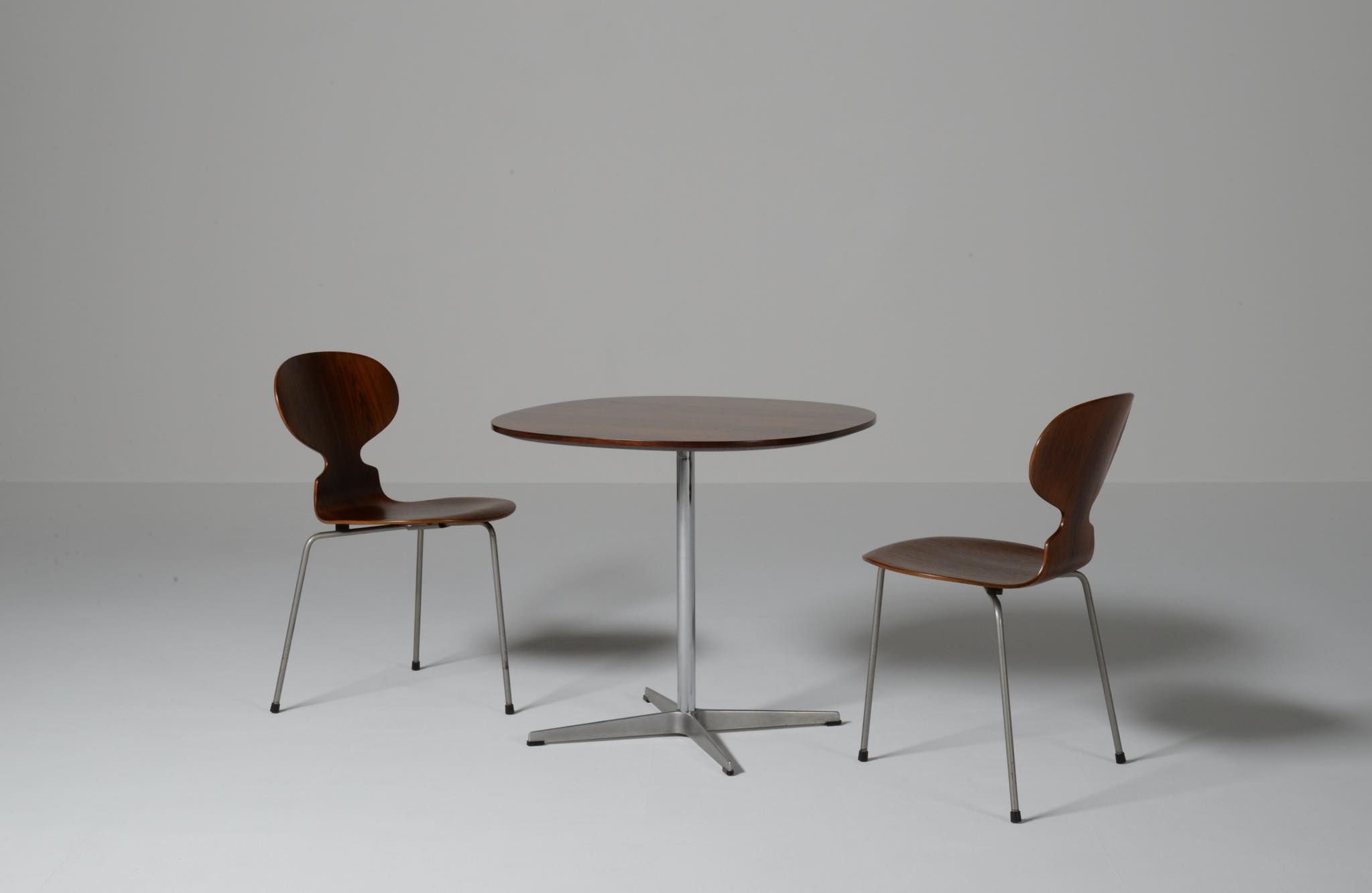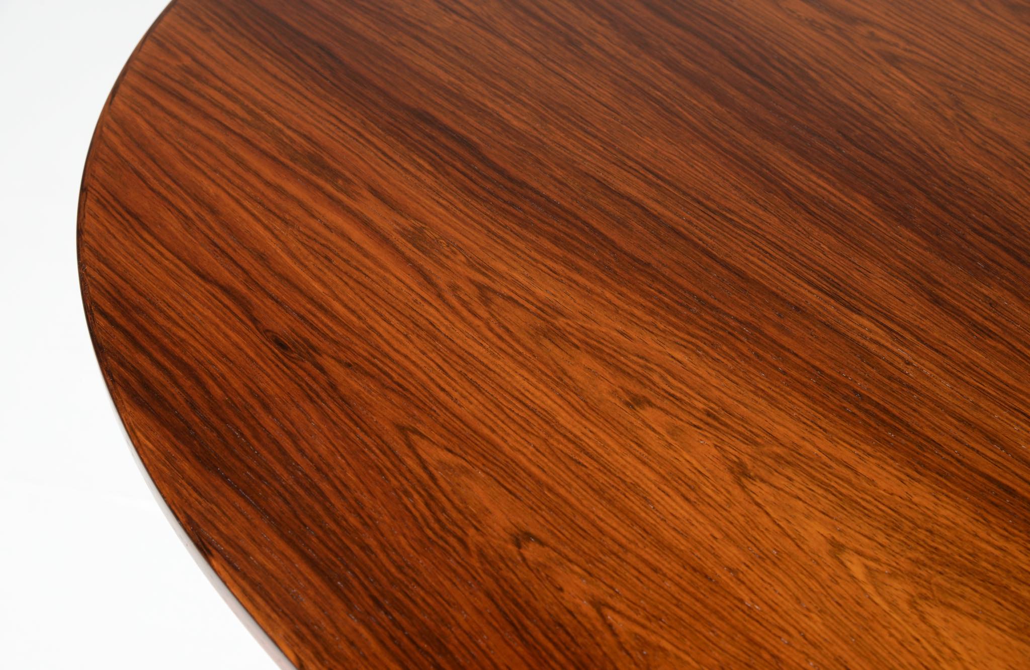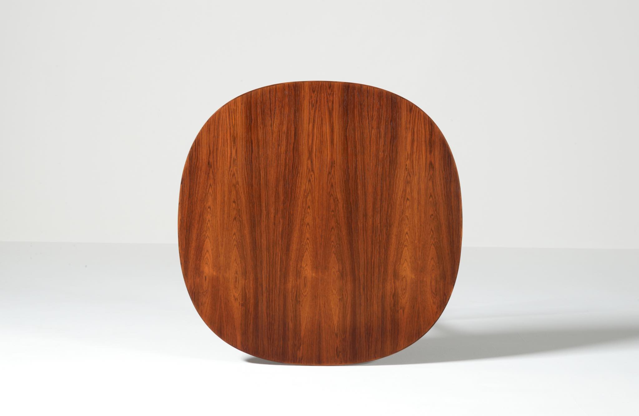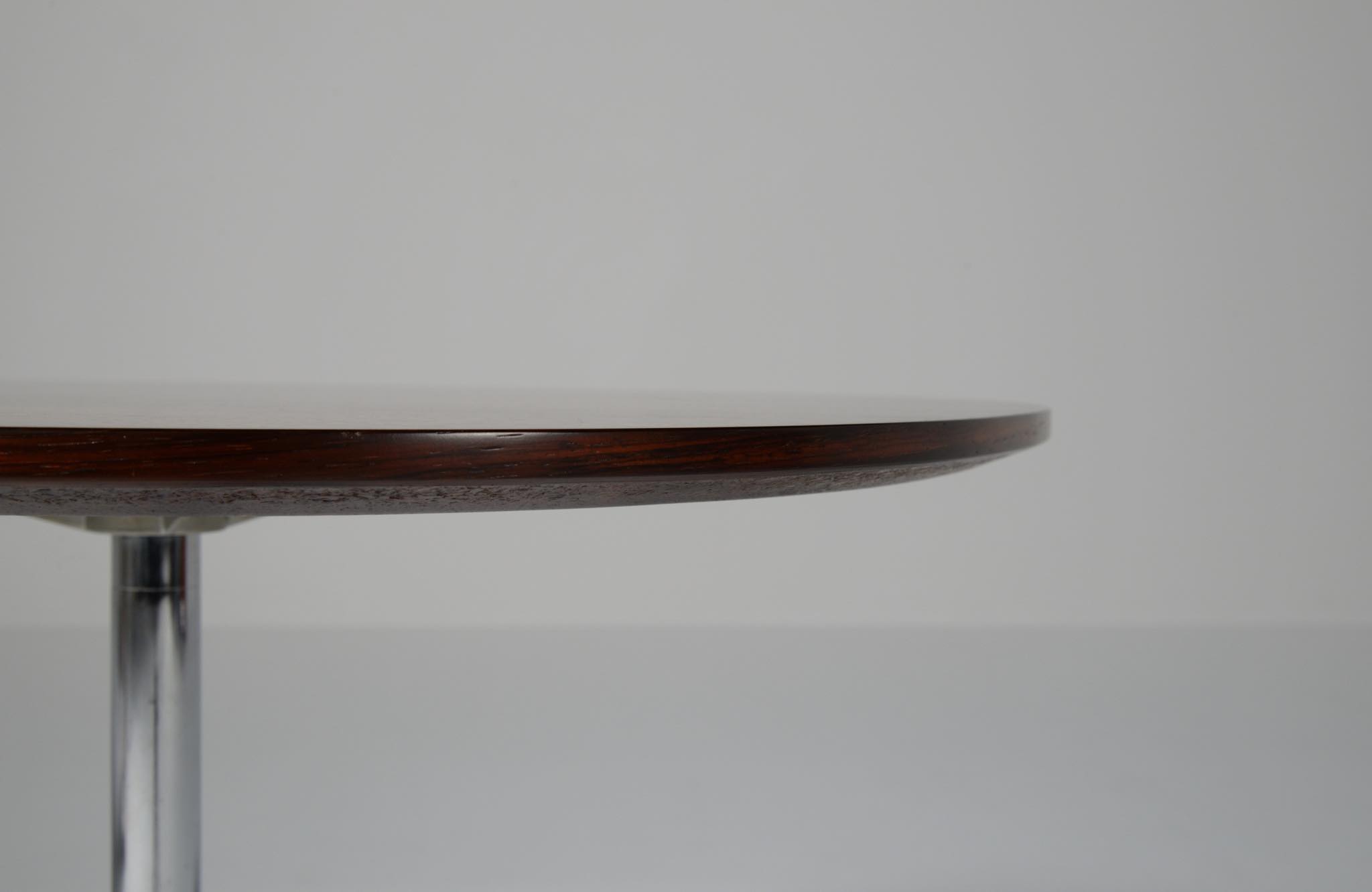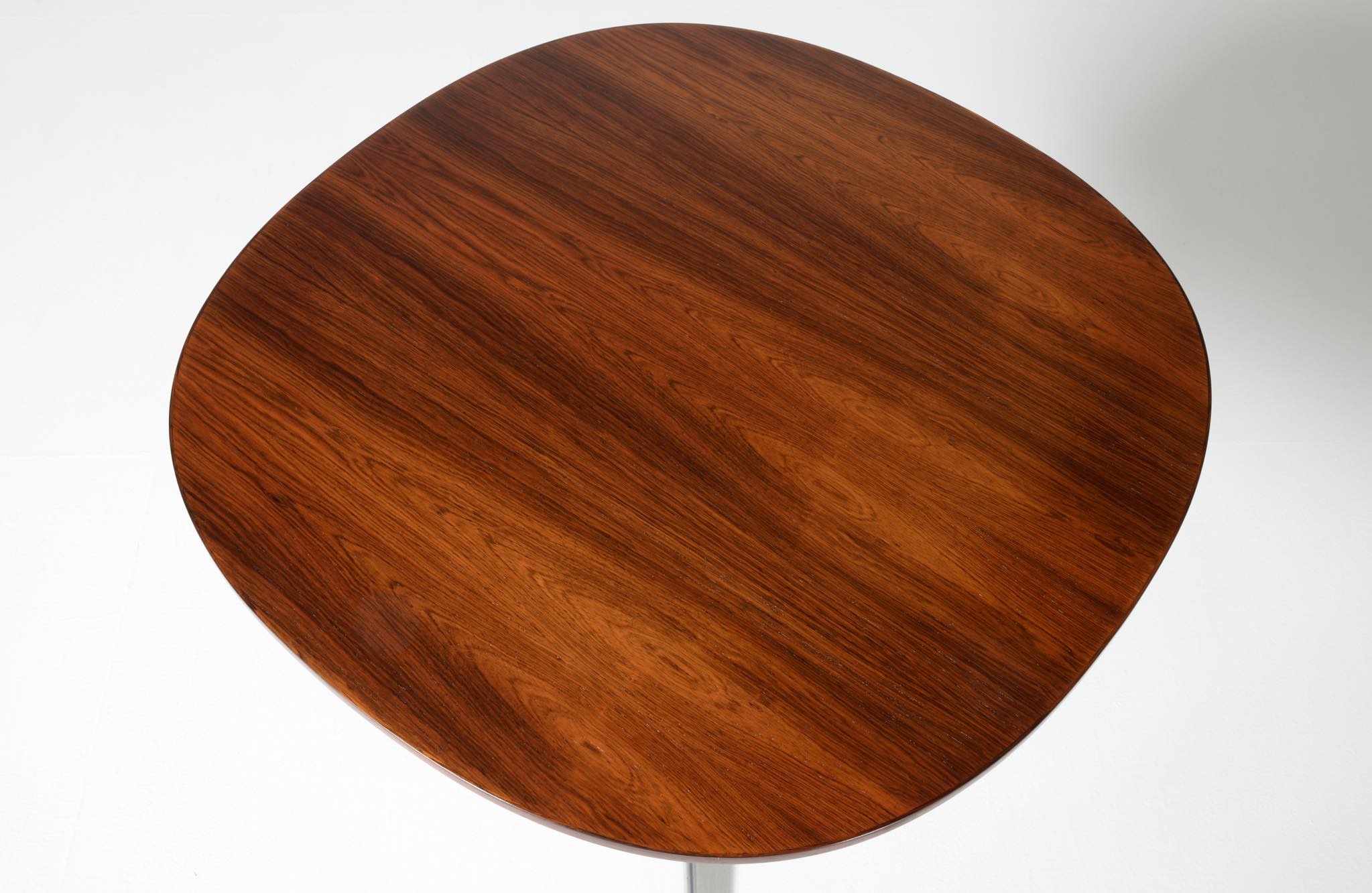 デンマークを代表する建築家のArne Jacobsen/アルネ・ヤコブセンによるカフェテーブルです。1970年代頃に作られたものでしょう。ブラジリアンと思しきローズウッドを用いており、ピート・ハインのデザインと思しき角丸四角形の天板に、ヤコブセンによるスチールレッグの組み合わせです。天板はラッカーにて仕上げました。とても綺麗な状態です。