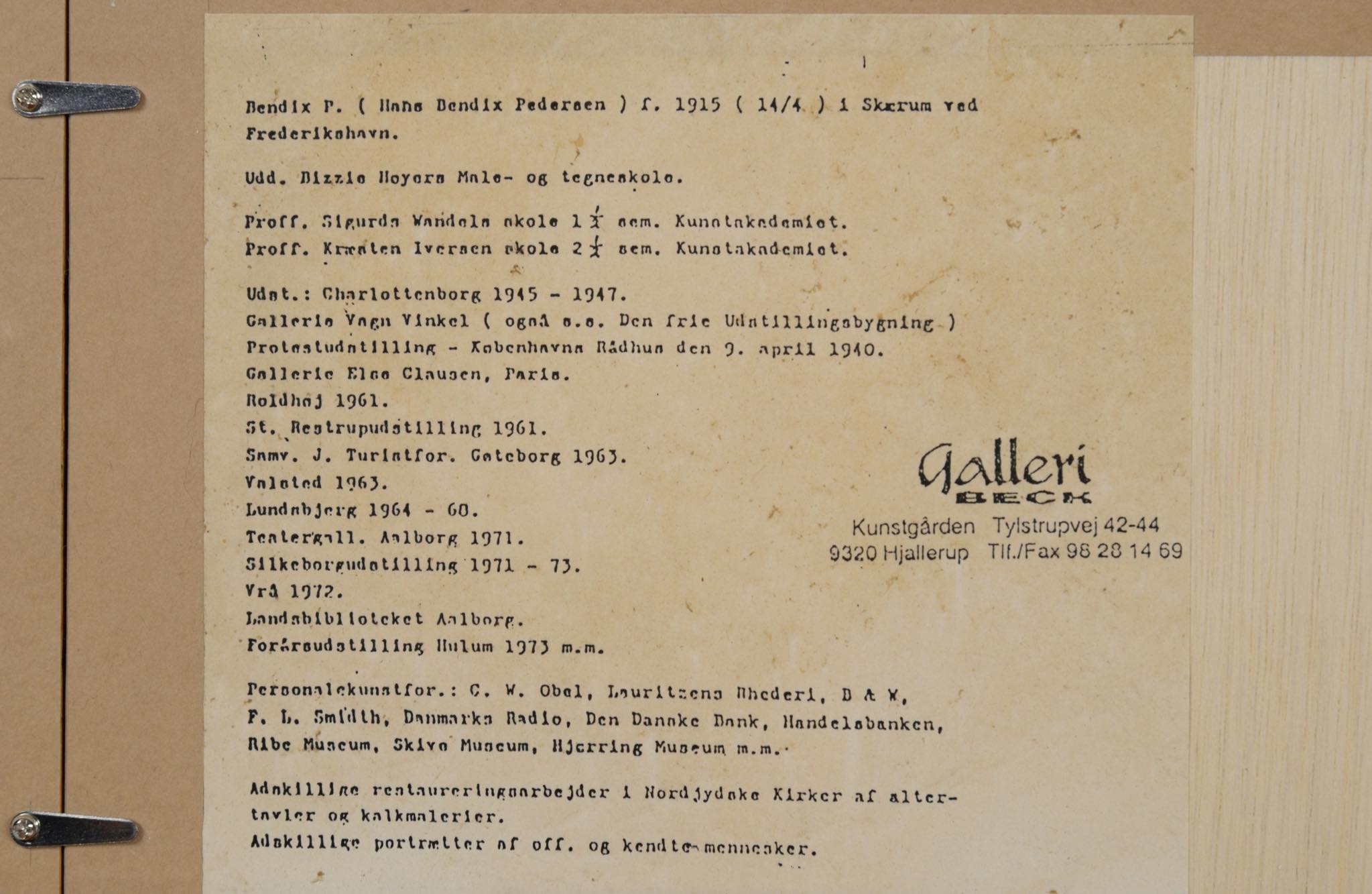 デンマークのスケーラムに生まれ、幼少期から絵を描いて過ごします。コペンハーゲンの王立芸術アカデミーで教育を受け、1949年からの数年間をフランス、パリの芸術環境で過ごし、そこで描かれた数多くの作品が残されています。氏の作風は自然からのインスピレーションを得た表現がなされており、肖像画も描いています。デンマークの風刺画で知られるHans Bendix/ハンス・ベンディックスとは別人で、よく混同されるとのことです。