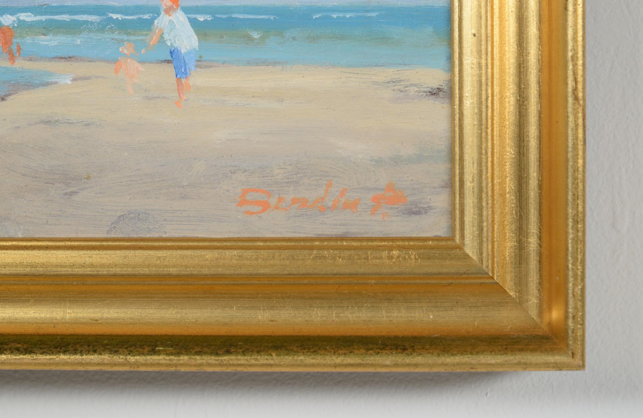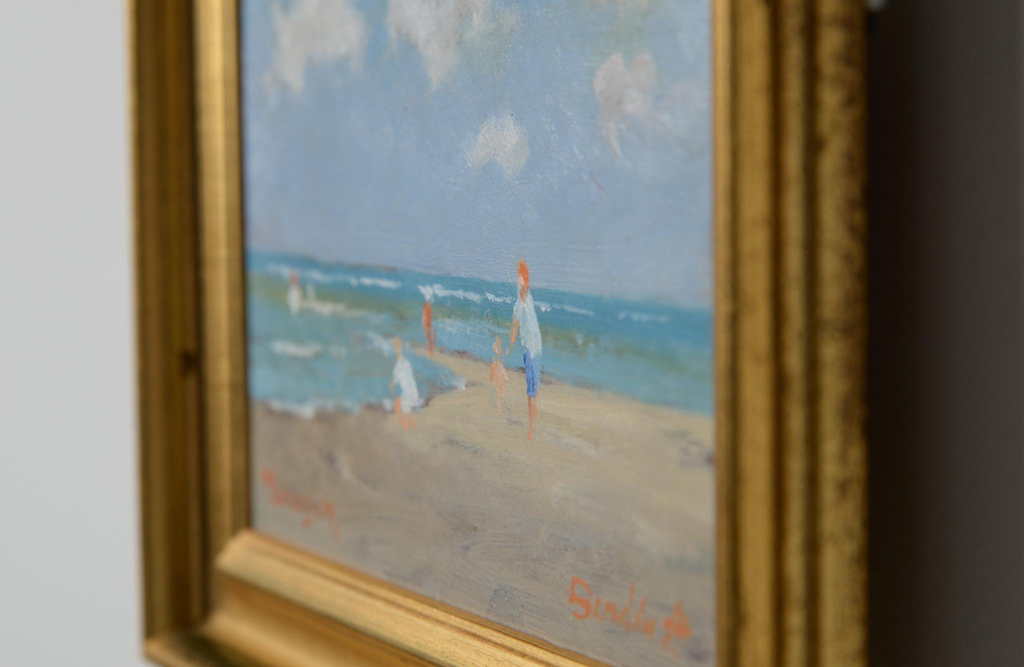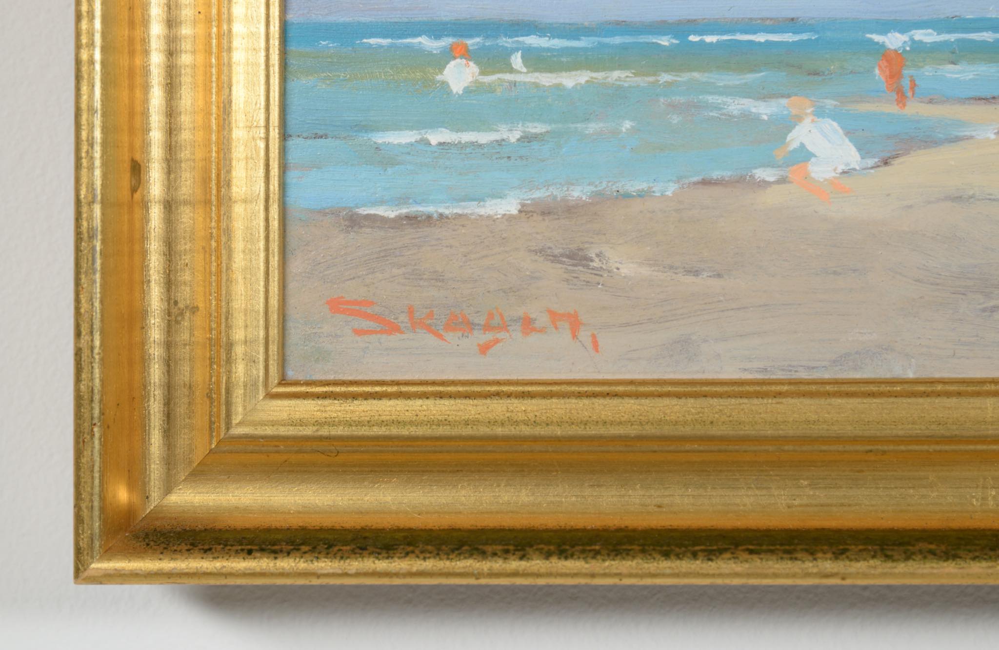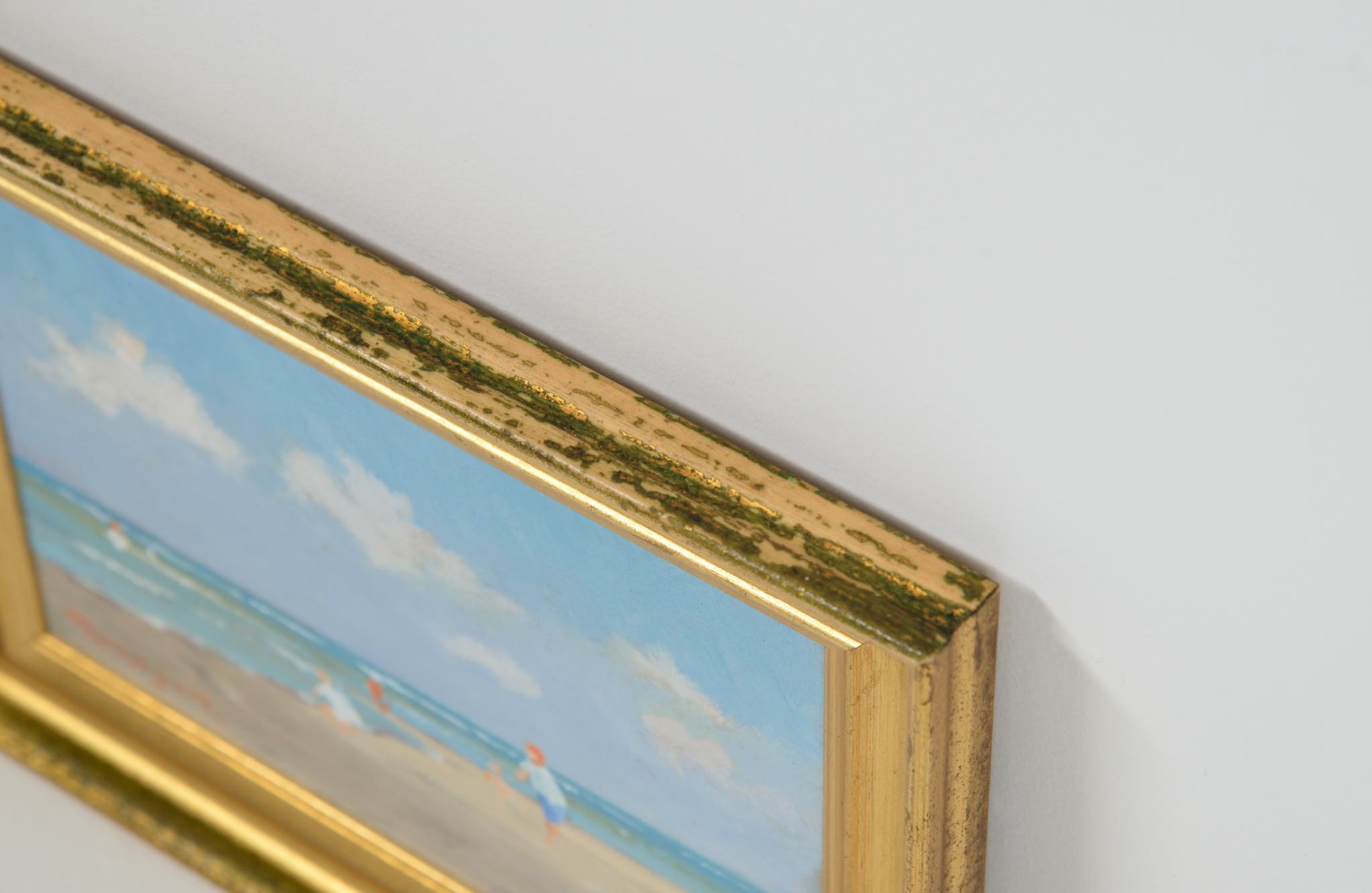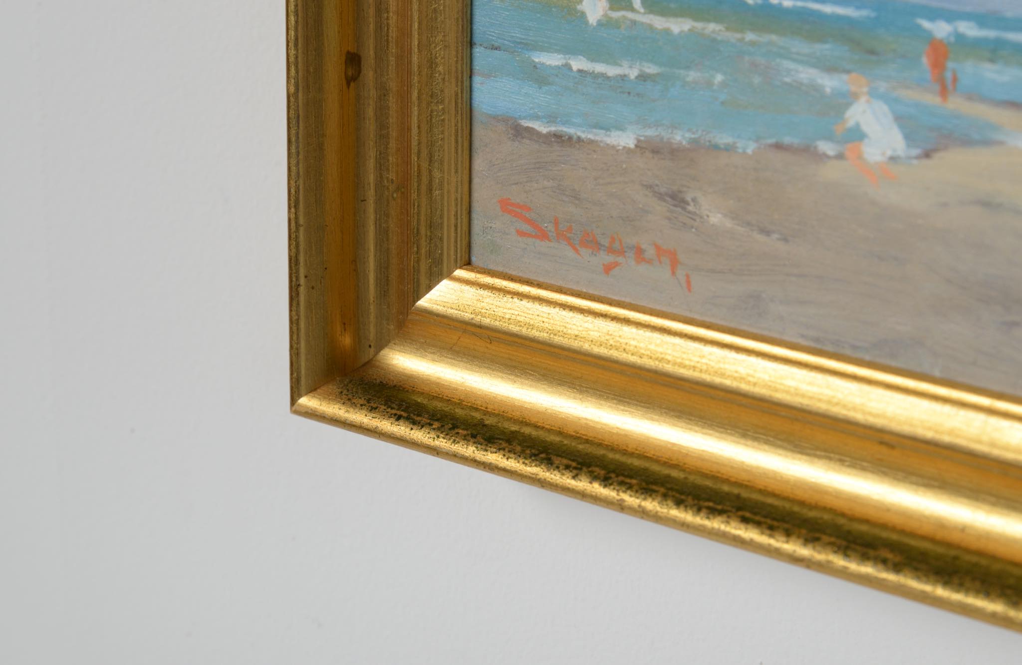 デンマークの画家、Hans Bendix Pedersen/ハンス・ベンディックス・ぺダーセンによる海を描いた小振りな風景画作品です。デンマーク、ユトランド半島、最北端のスケーンを描いたもので、浜辺で遊ぶ子供たちの元気な様子や、夏の日差しとその大気感が表現されています。金箔のフレームはオリジナルのようで、コンデションは良好です。