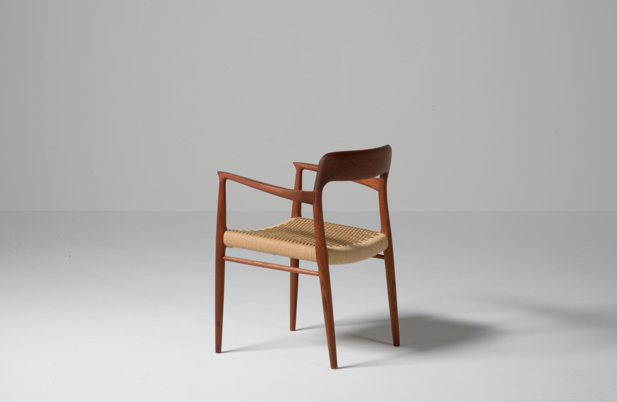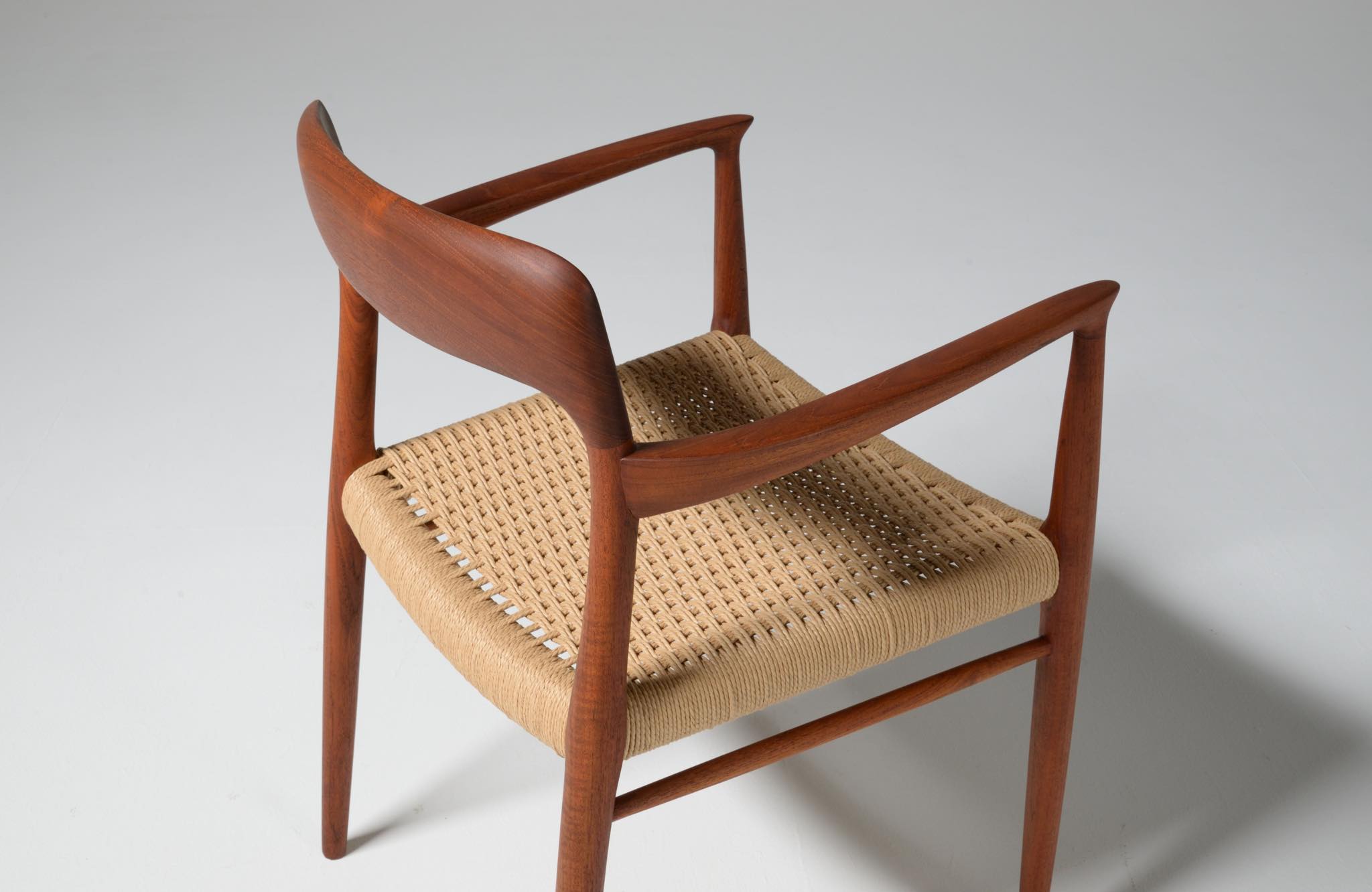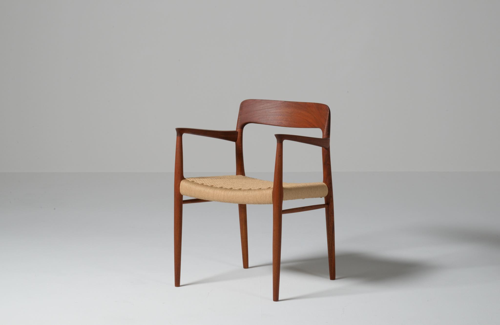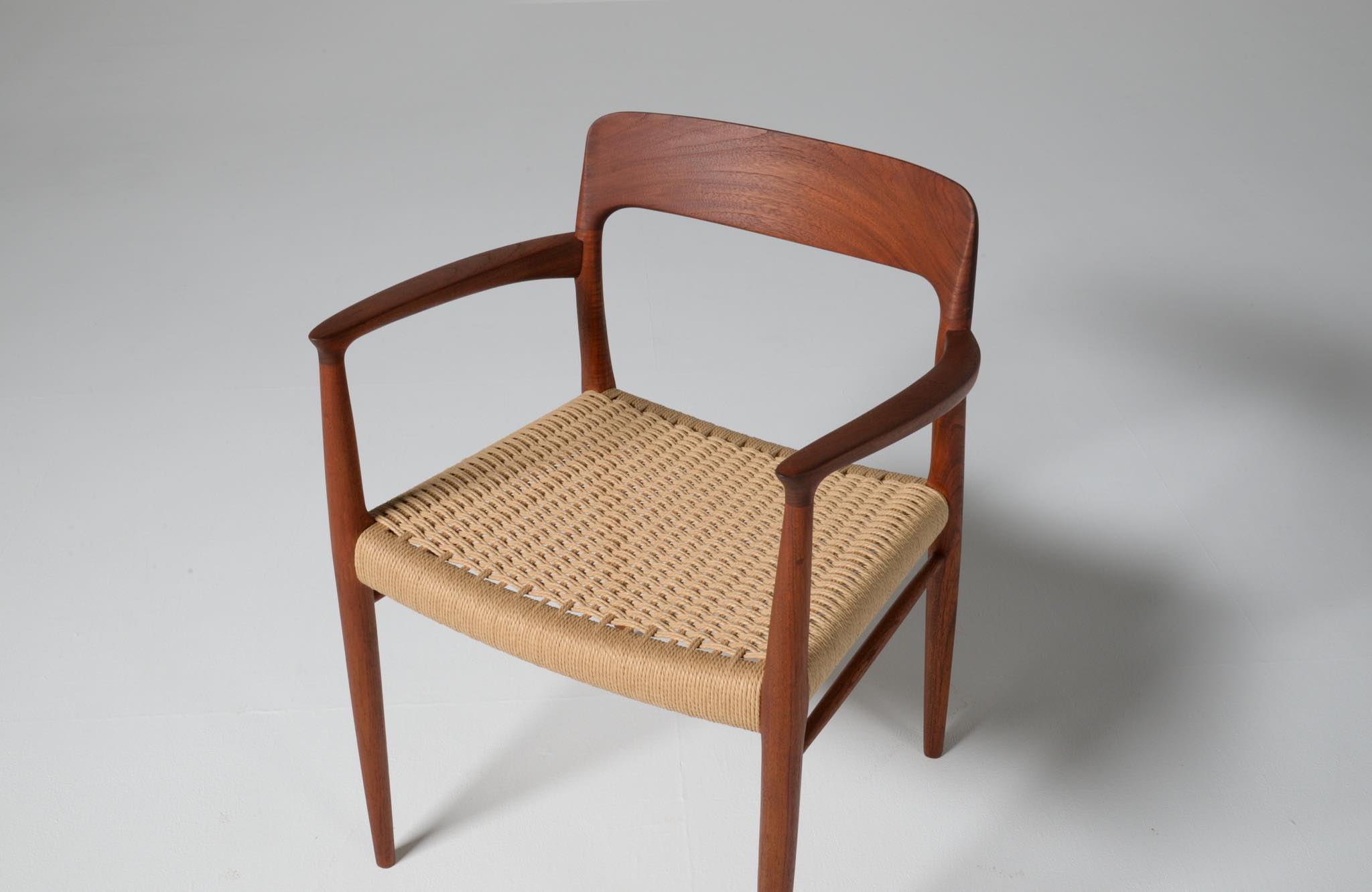 デンマークのデザイナー、N.O. Møller/ニルス・オットー・モラーによるアーム付きダイニングチェアです。自身の工房、J.L.Møller/J.L.モラーによるもので、1960年代頃に作られたものでしょう。チーク材のフレームは程よい経年感があり、目立った傷もなく良好です。座面のペーパーコードは新たに張り替えました。
