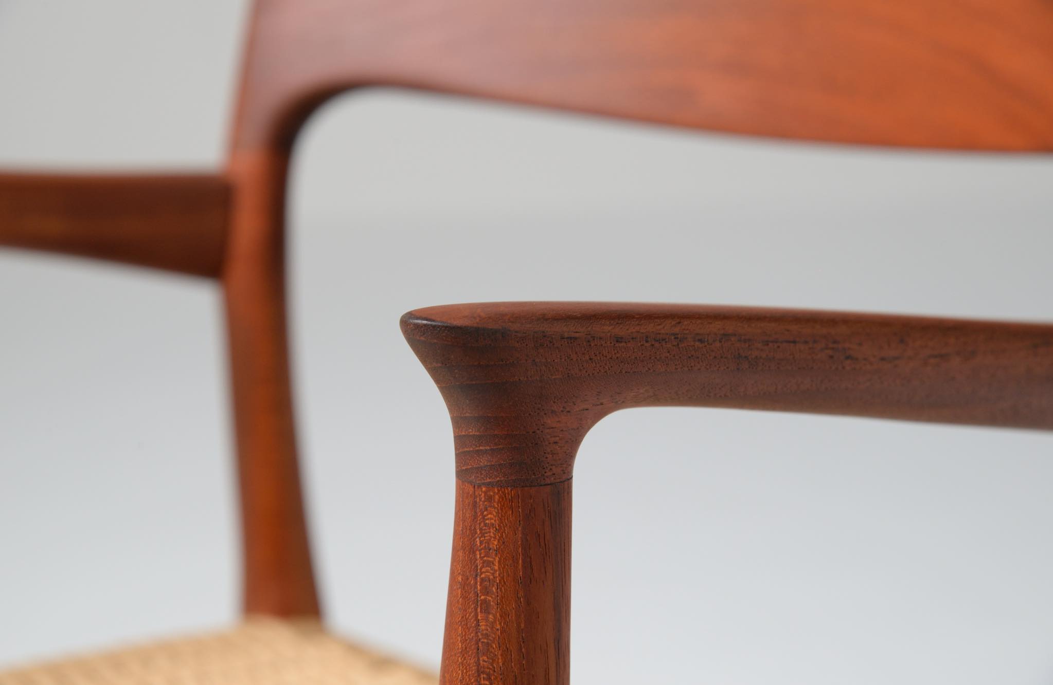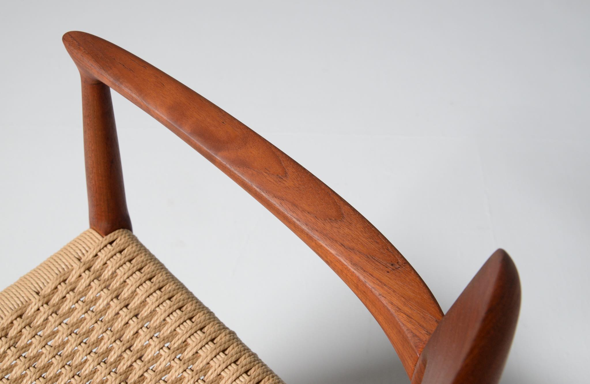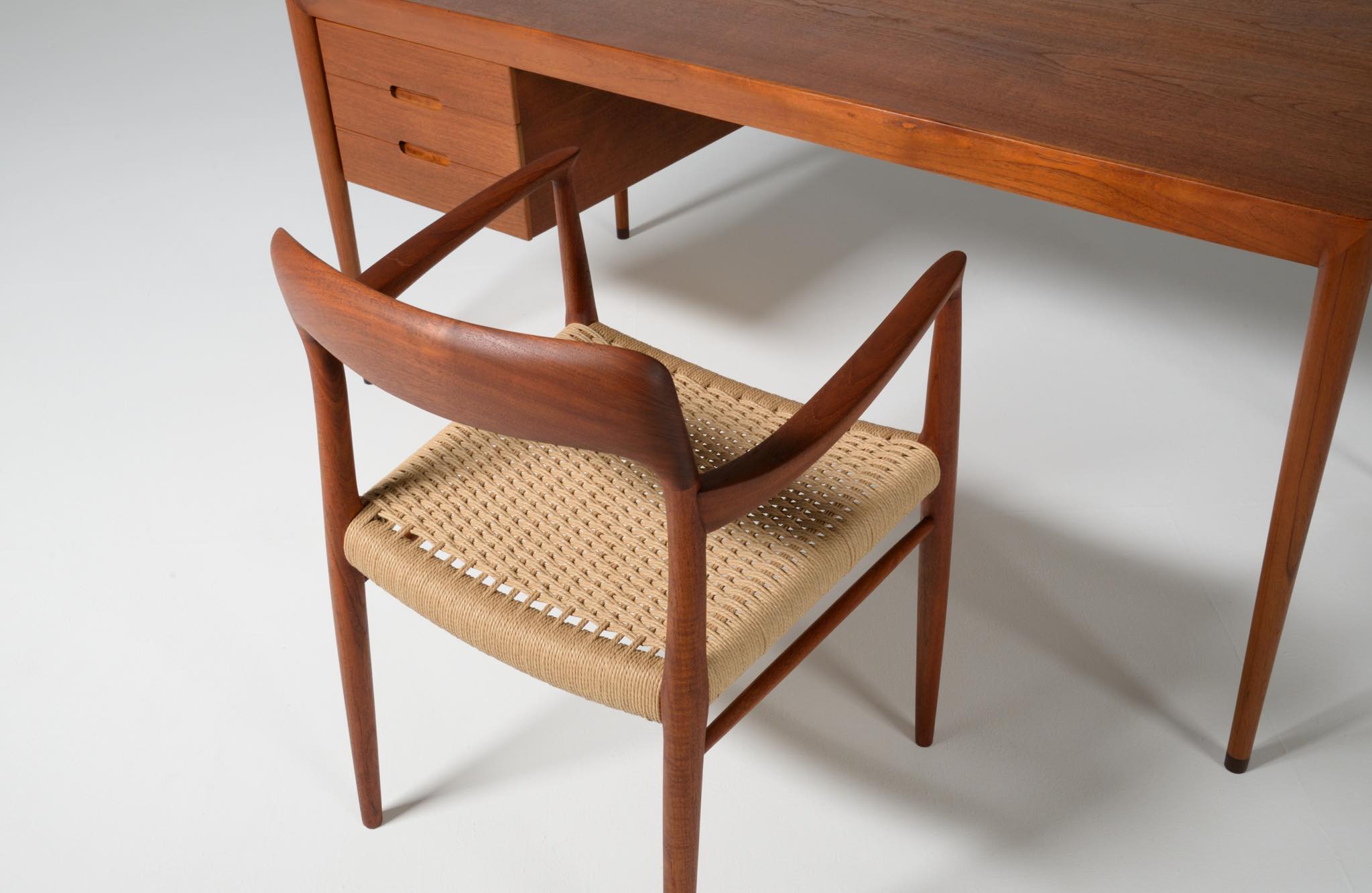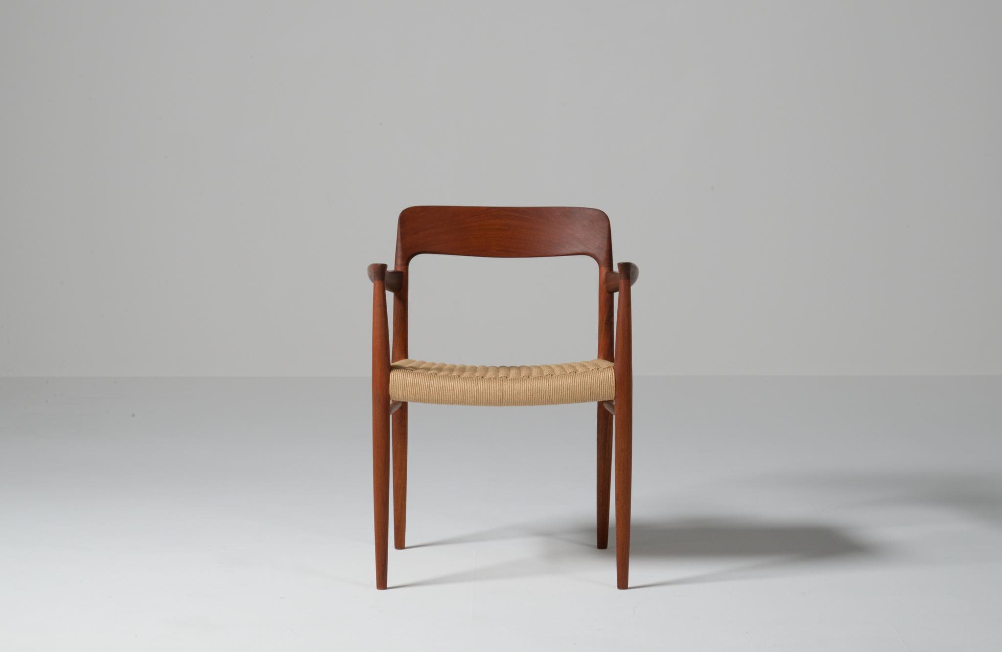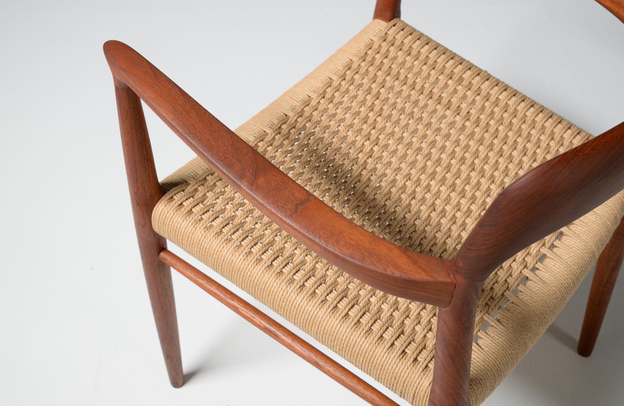 デンマークのデザイナー、N.O. Møller/ニルス・オットー・モラーによるアーム付きダイニングチェアです。自身の工房、J.L.Møller/J.L.モラーによるもので、1960年代頃に作られたものでしょう。チーク材のフレームは程よい経年感があり、目立った傷もなく良好です。座面のペーパーコードは新たに張り替えました。