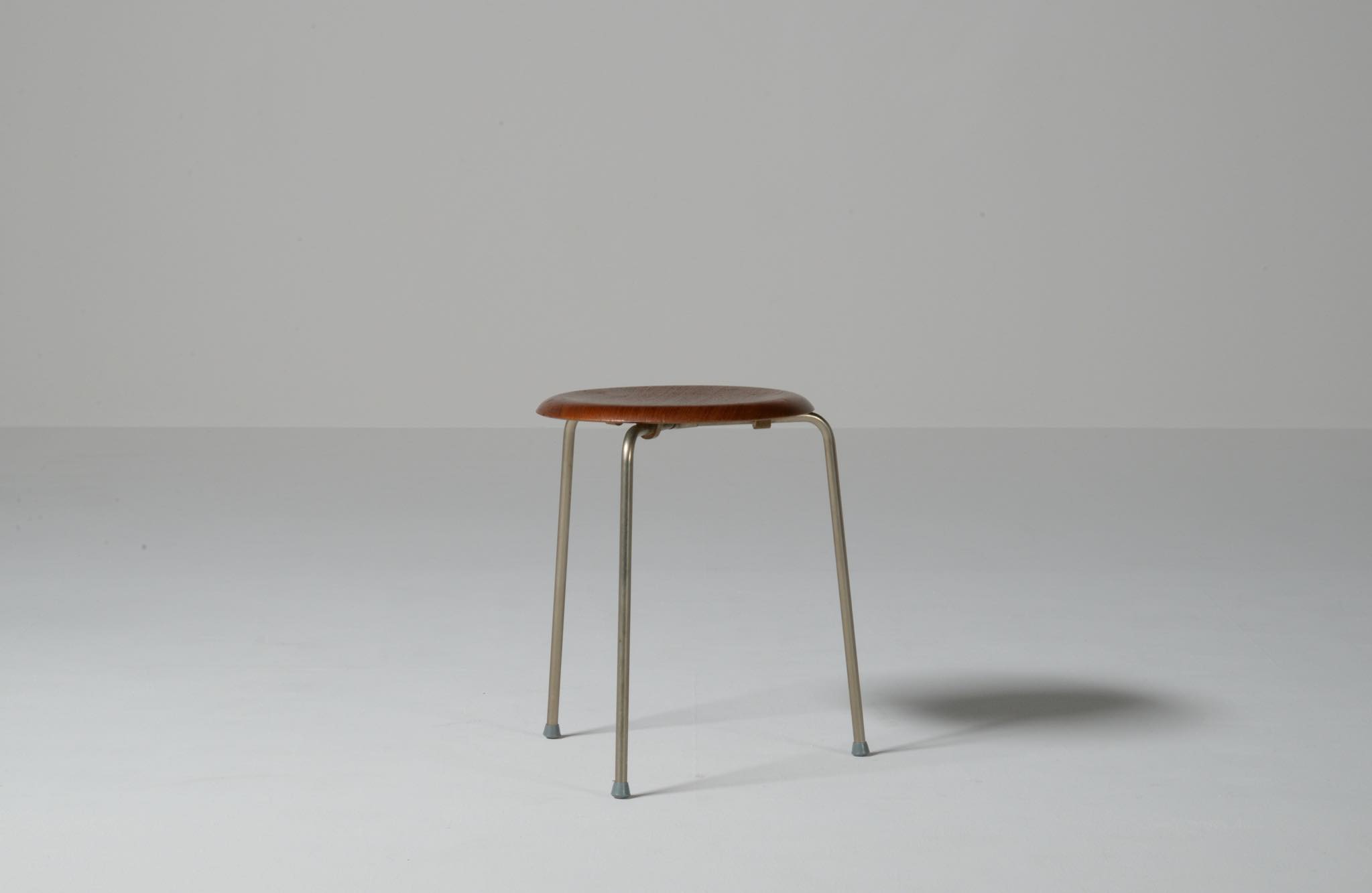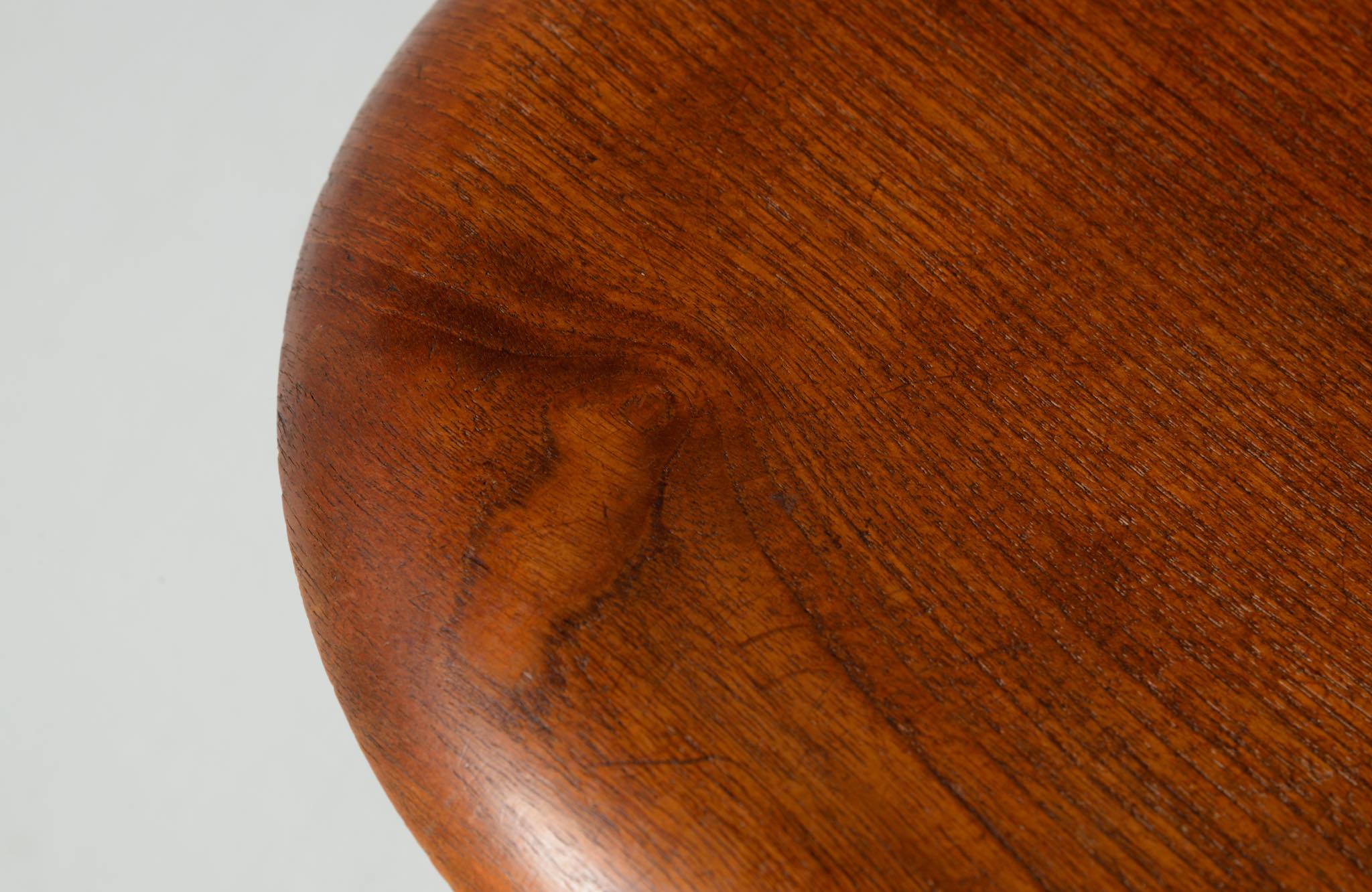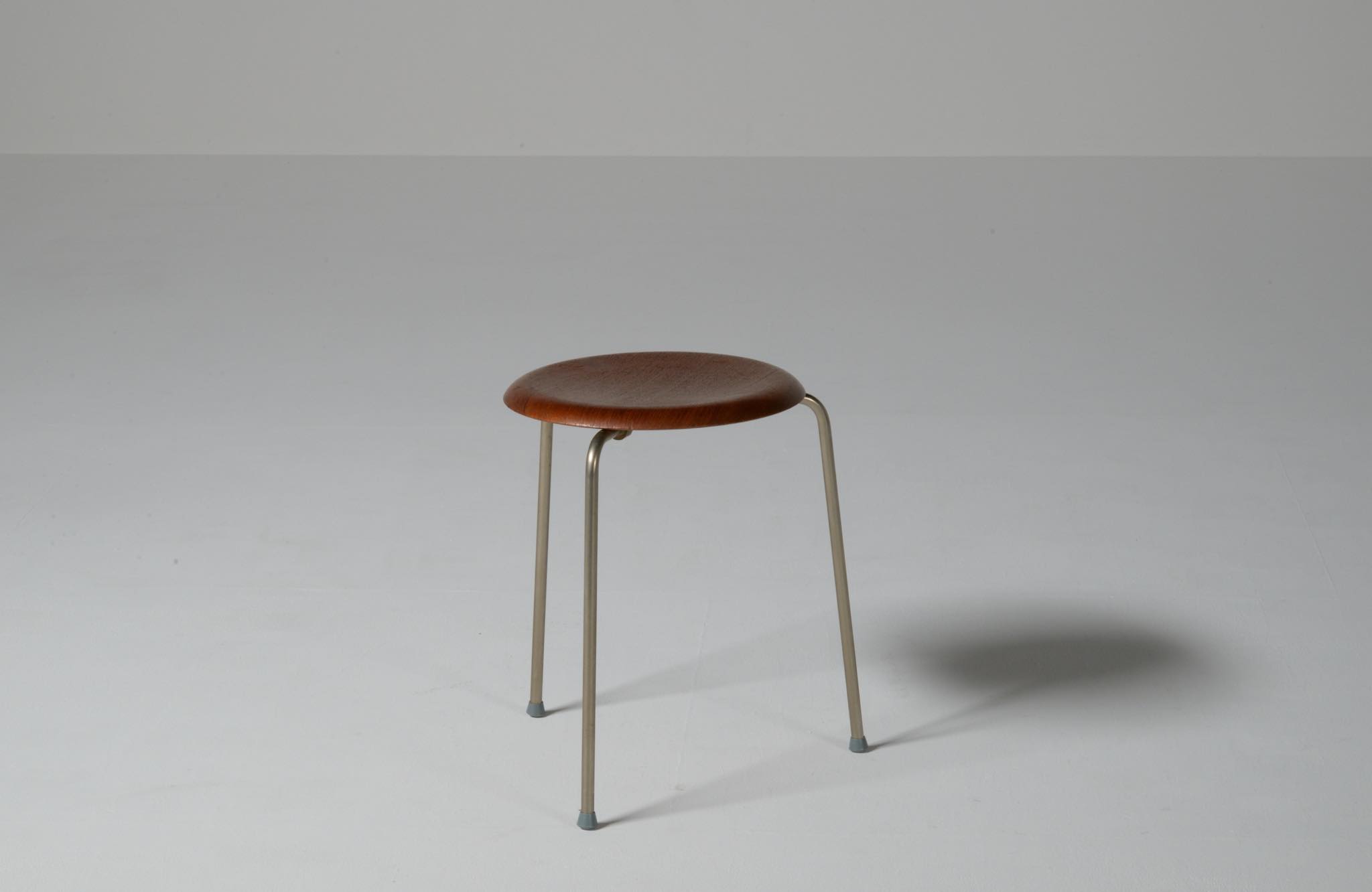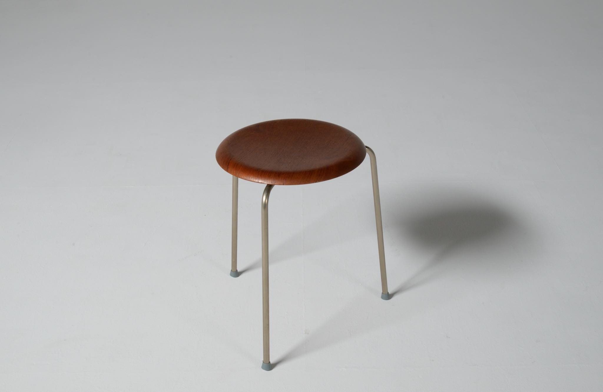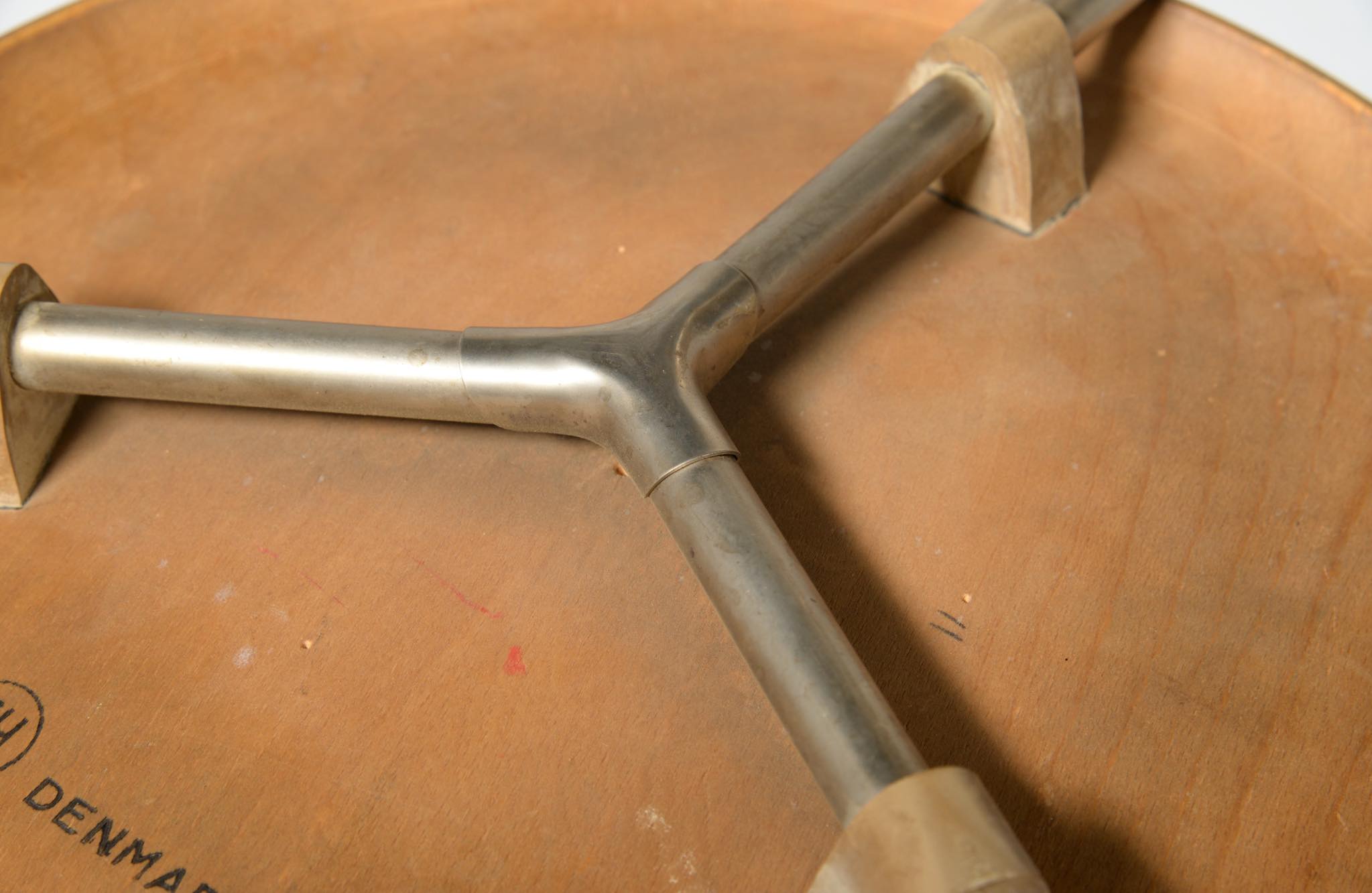 デンマークの家具工房、Fritz Hansen/フリッツ・ハンセンによるチーク材とスチールのスツールです。1950年代頃に作られたものでしょう。立体的に整形合板したシートに、ニッケルメッキを施したパイプスチールの3本脚が軽快な印象のモデルです。こちらは単体での販売となり、それぞれ木目紋様やグライズの色、コンディションが異なるので、店頭での現物確認販売を前提とさせていただきます。脚部の錆や小傷等は否めませんが、どれも概ね良い状態です。
