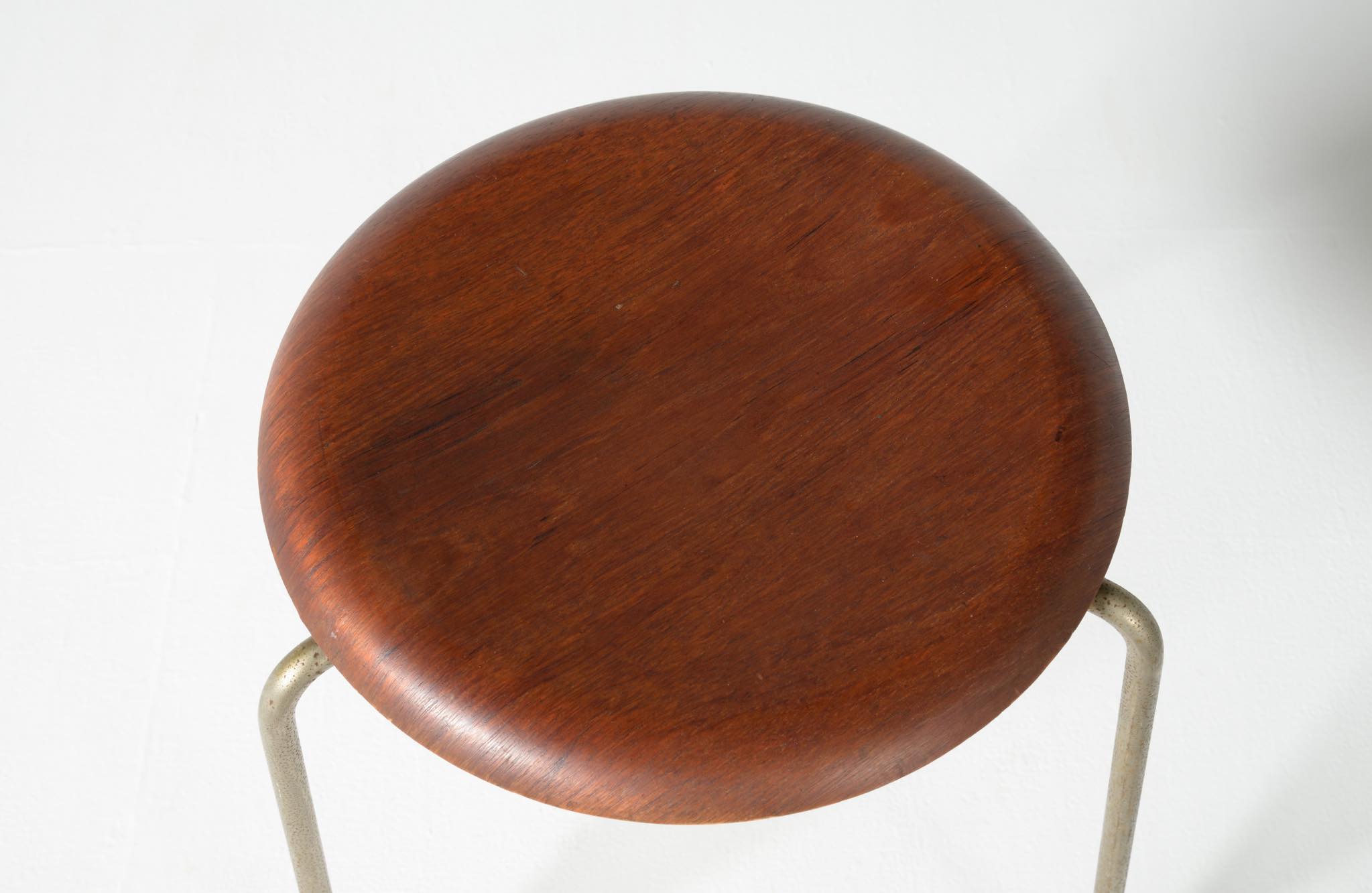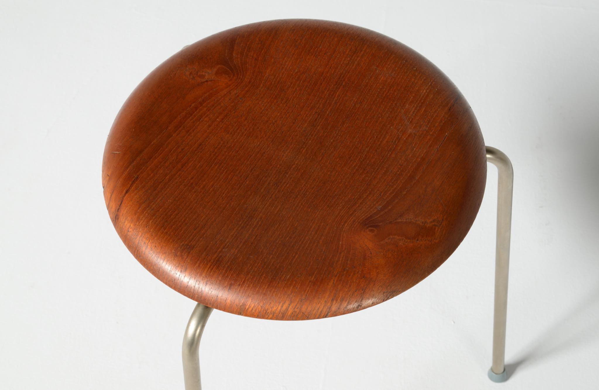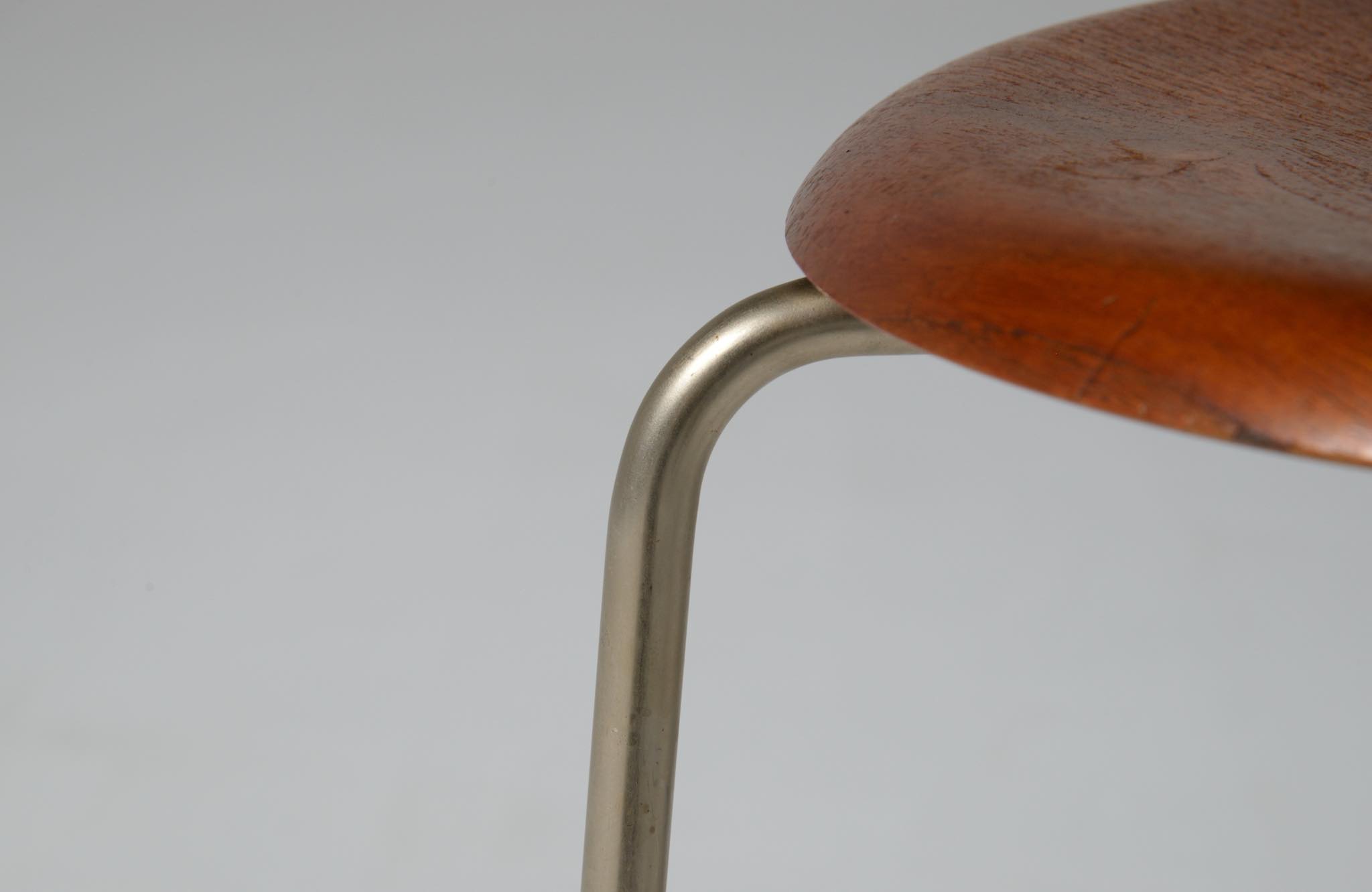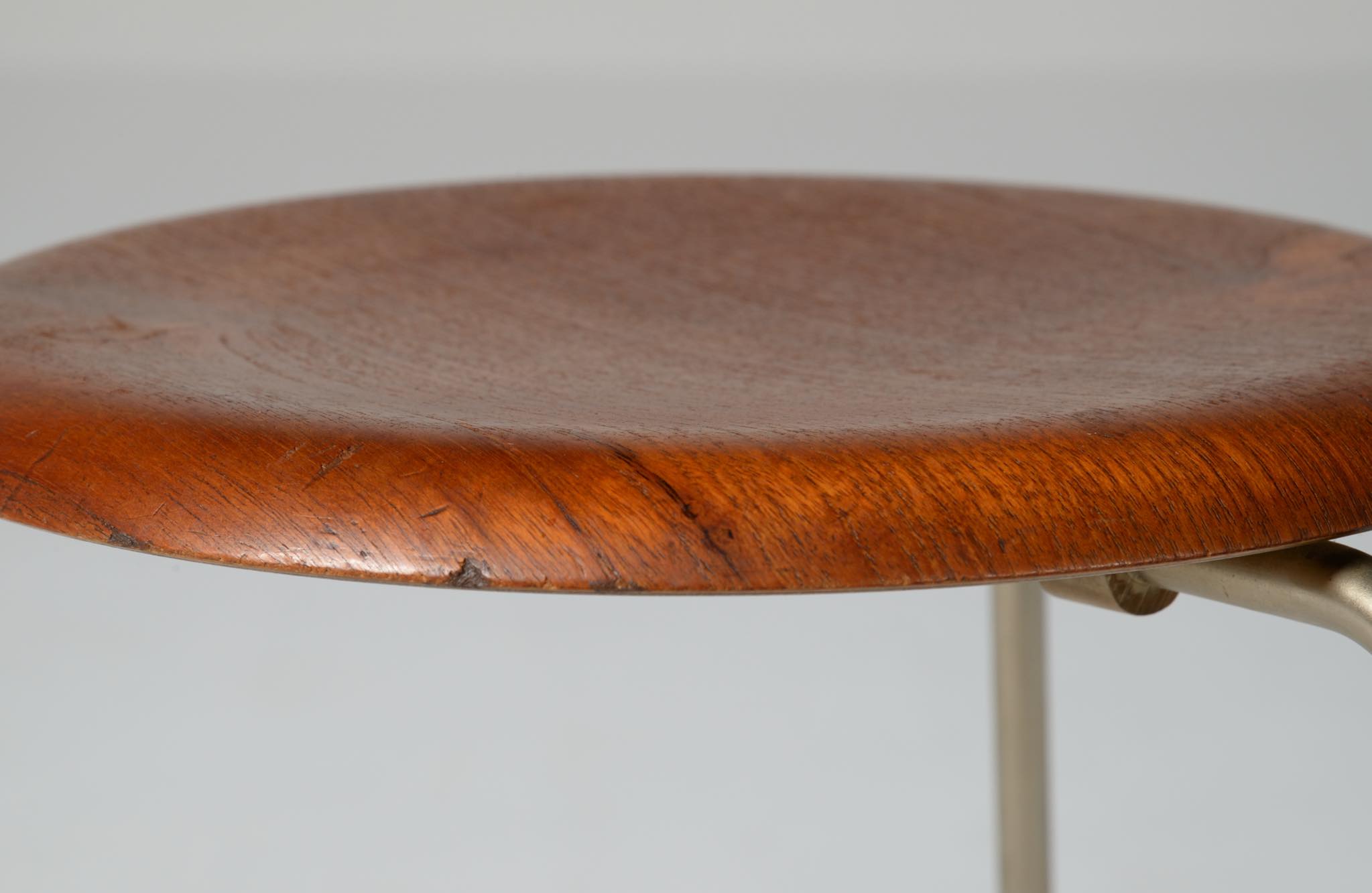 デンマークの家具工房、Fritz Hansen/フリッツ・ハンセンによるチーク材とスチールのスツールです。1950年代頃に作られたものでしょう。立体的に整形合板したシートに、ニッケルメッキを施したパイプスチールの3本脚が軽快な印象のモデルです。こちらは単体での販売となり、それぞれ木目紋様やグライズの色、コンディションが異なるので、店頭での現物確認販売を前提とさせていただきます。脚部の錆や小傷等は否めませんが、どれも概ね良い状態です。