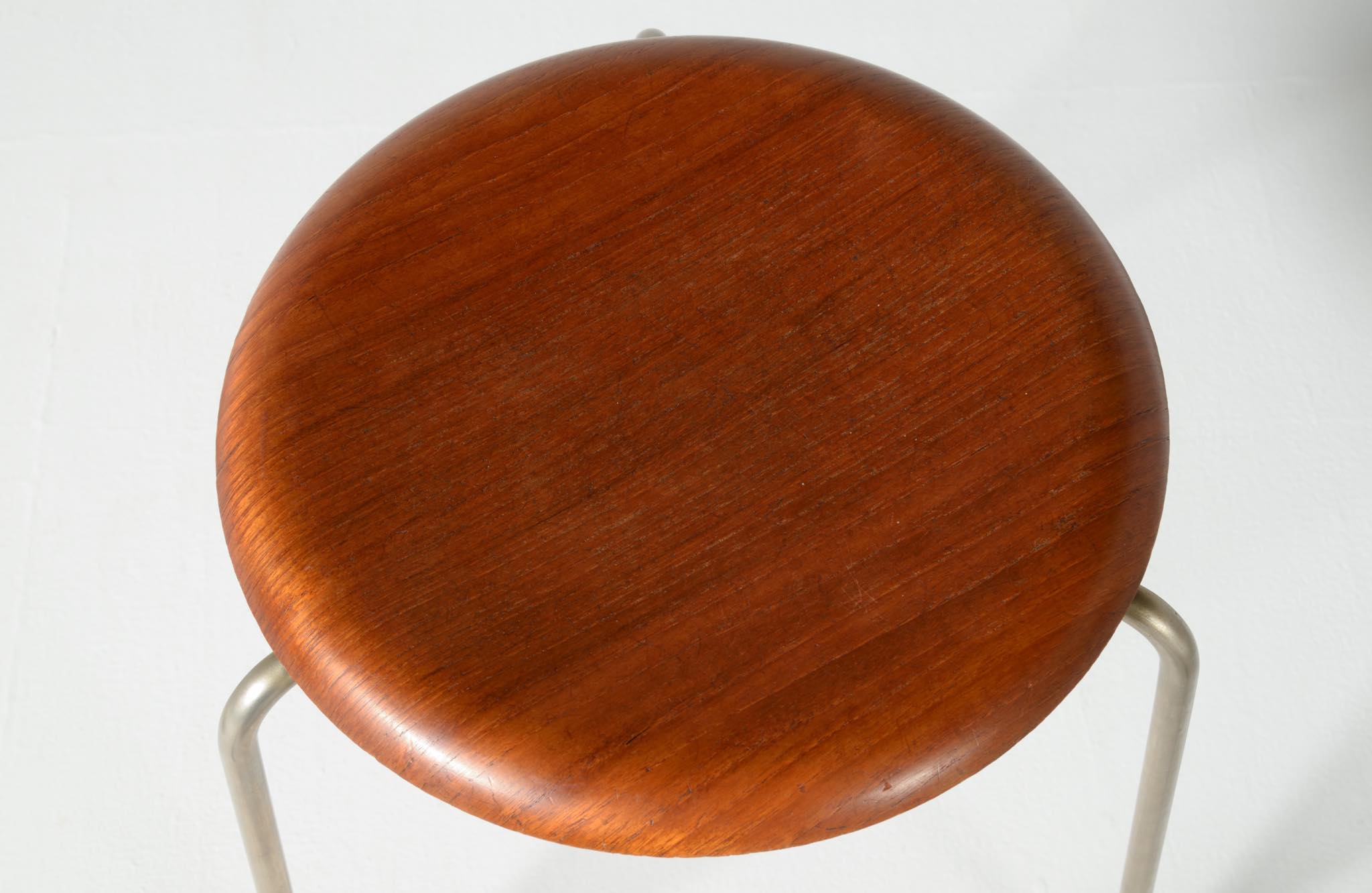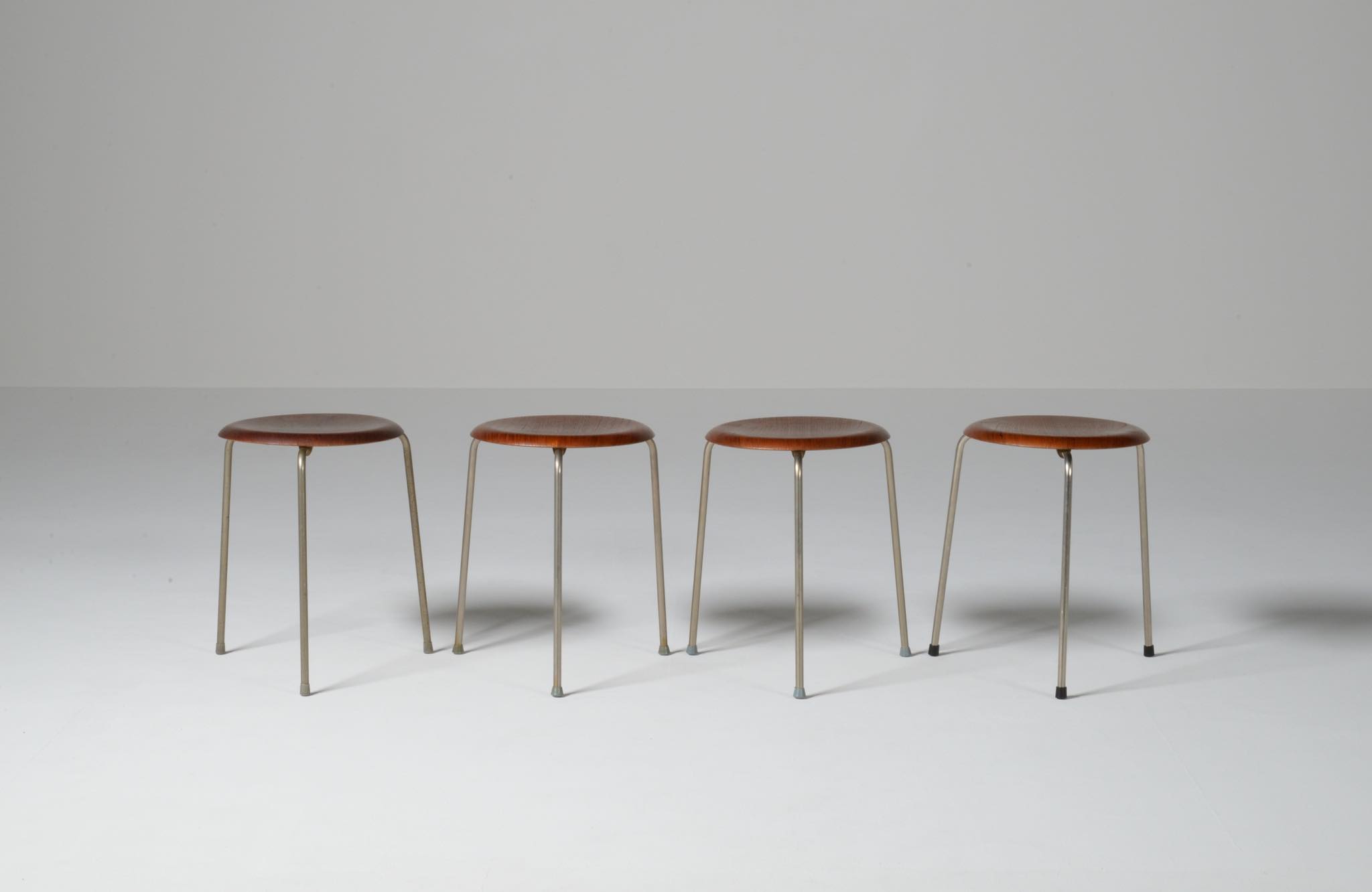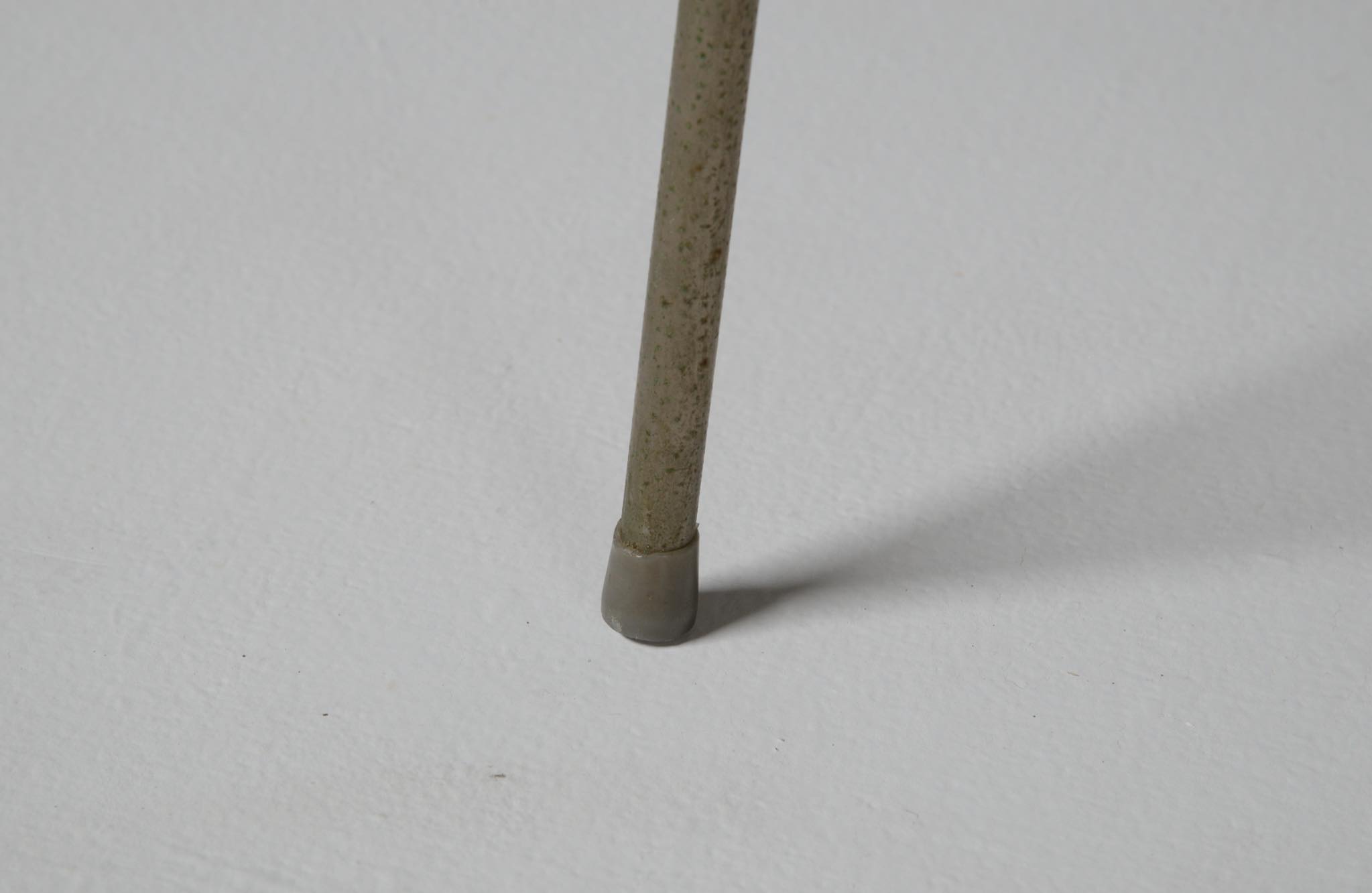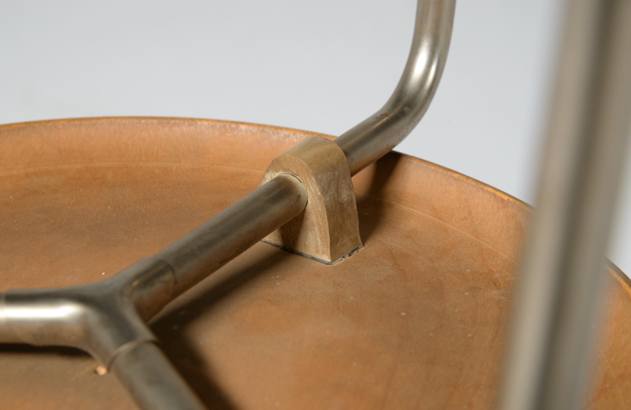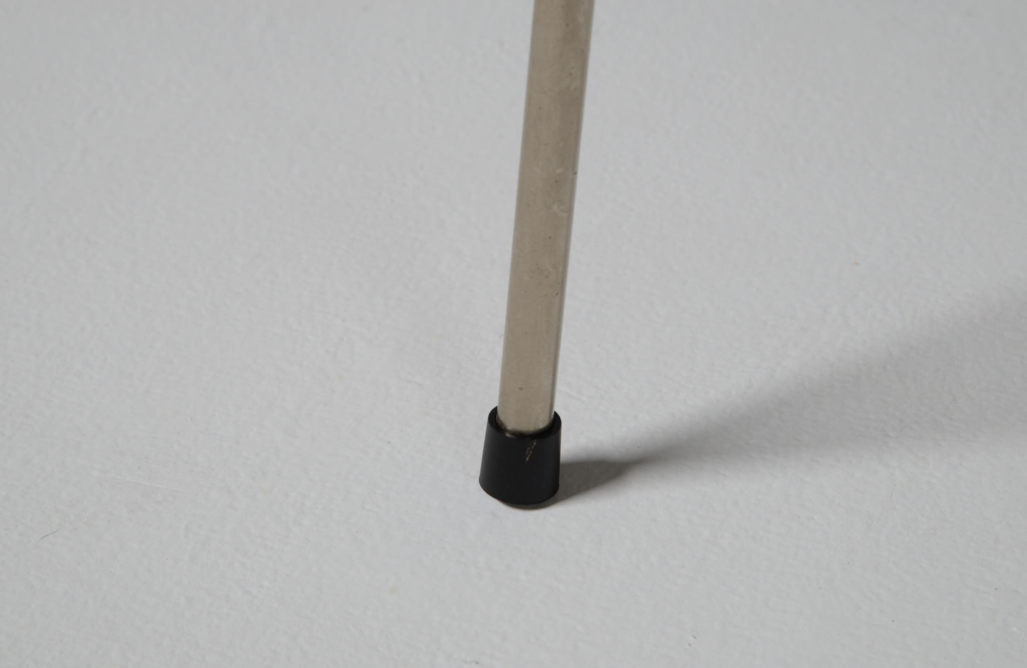 デンマークの家具工房、Fritz Hansen/フリッツ・ハンセンによるチーク材とスチールのスツールです。1950年代頃に作られたものでしょう。立体的に整形合板したシートに、ニッケルメッキを施したパイプスチールの3本脚が軽快な印象のモデルです。こちらは単体での販売となり、それぞれ木目紋様やグライズの色、コンディションが異なるので、店頭での現物確認販売を前提とさせていただきます。脚部の錆や小傷等は否めませんが、どれも概ね良い状態です。