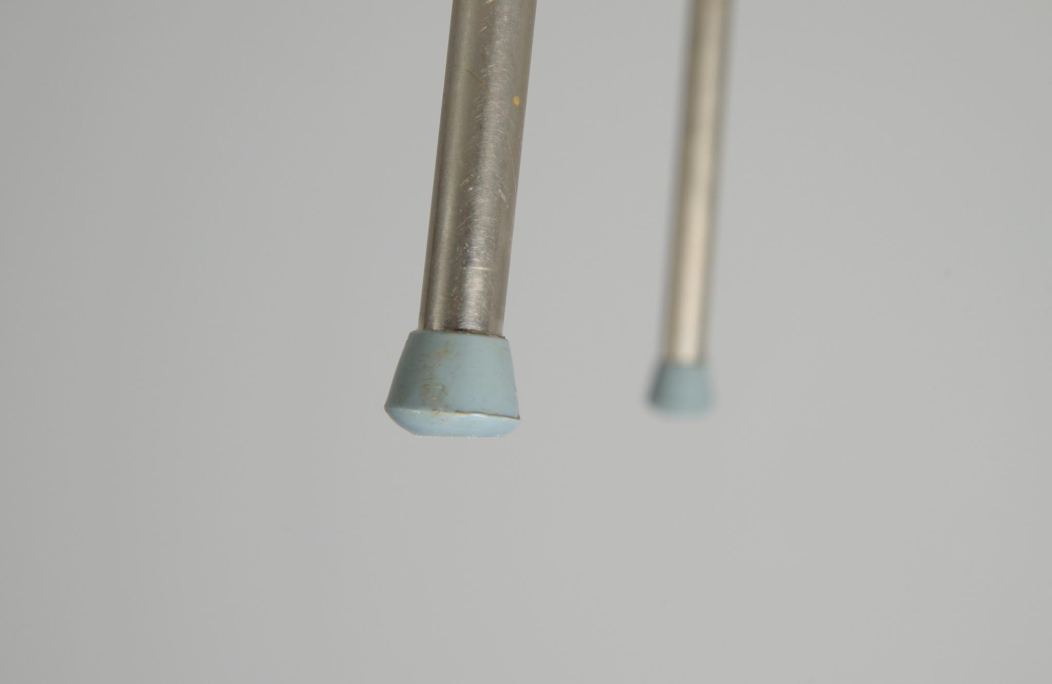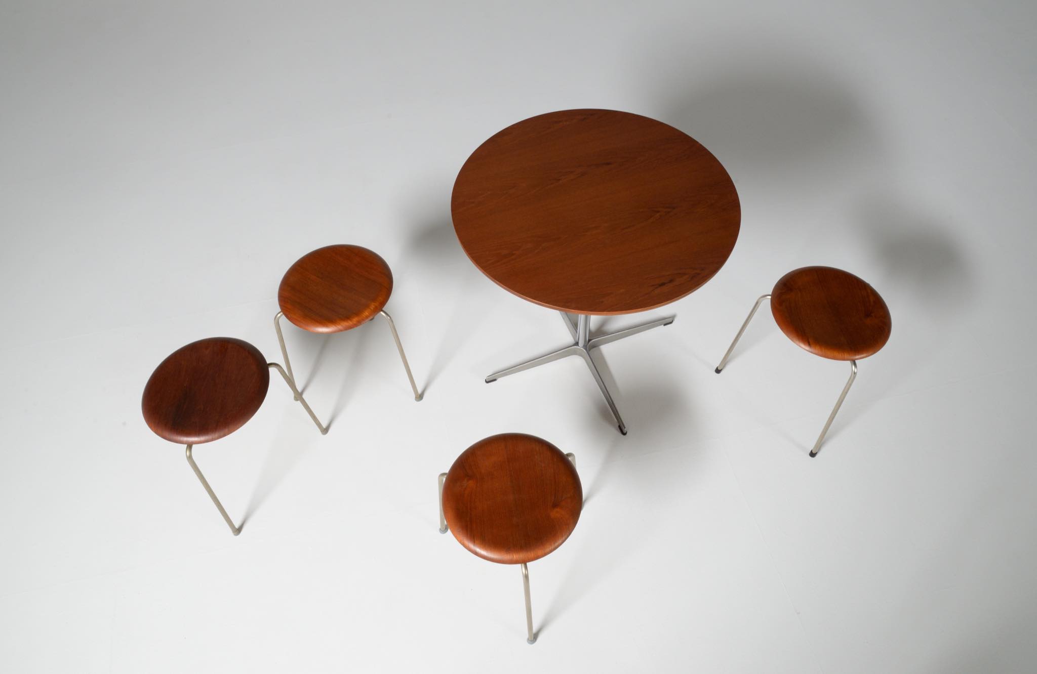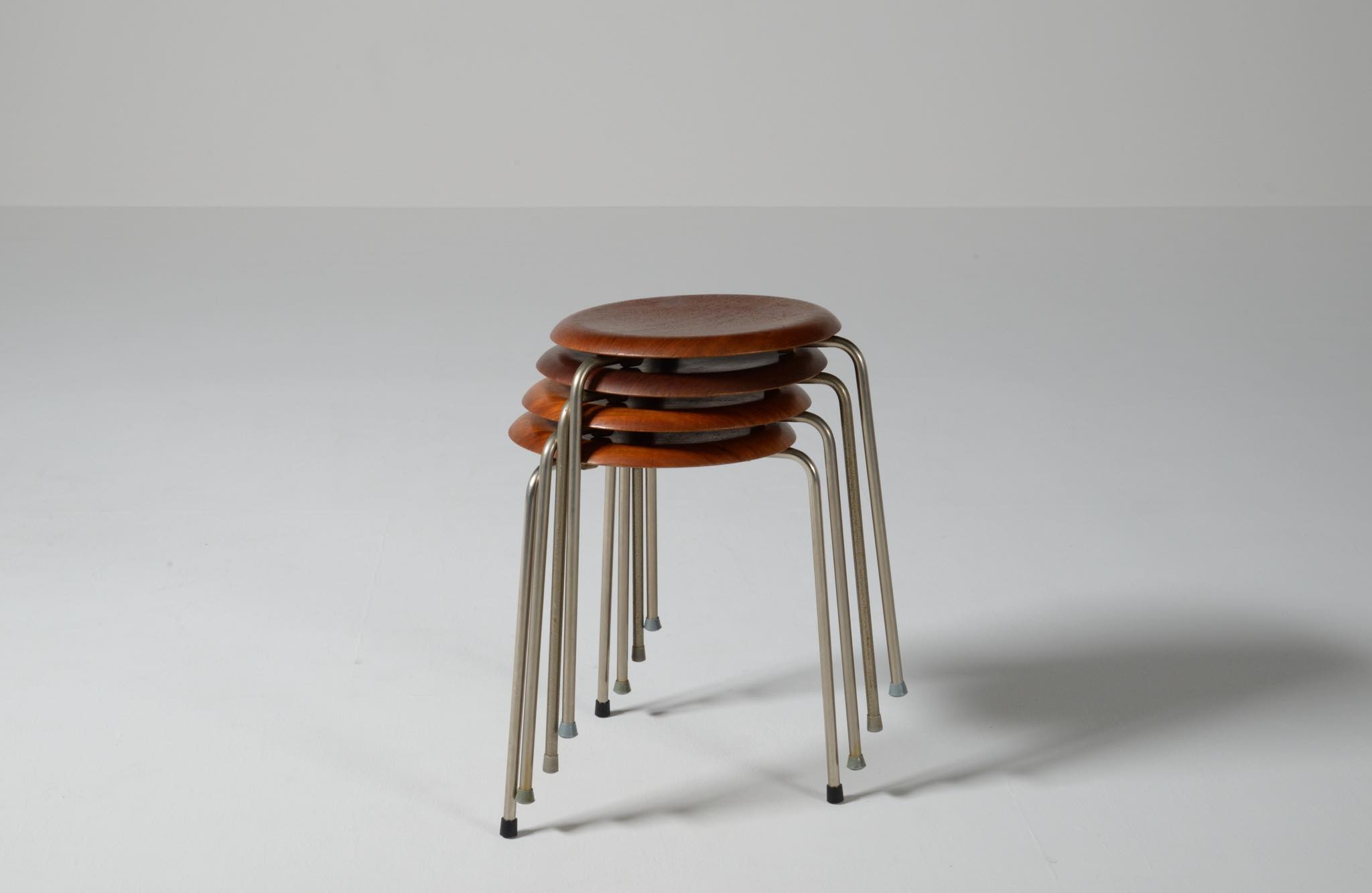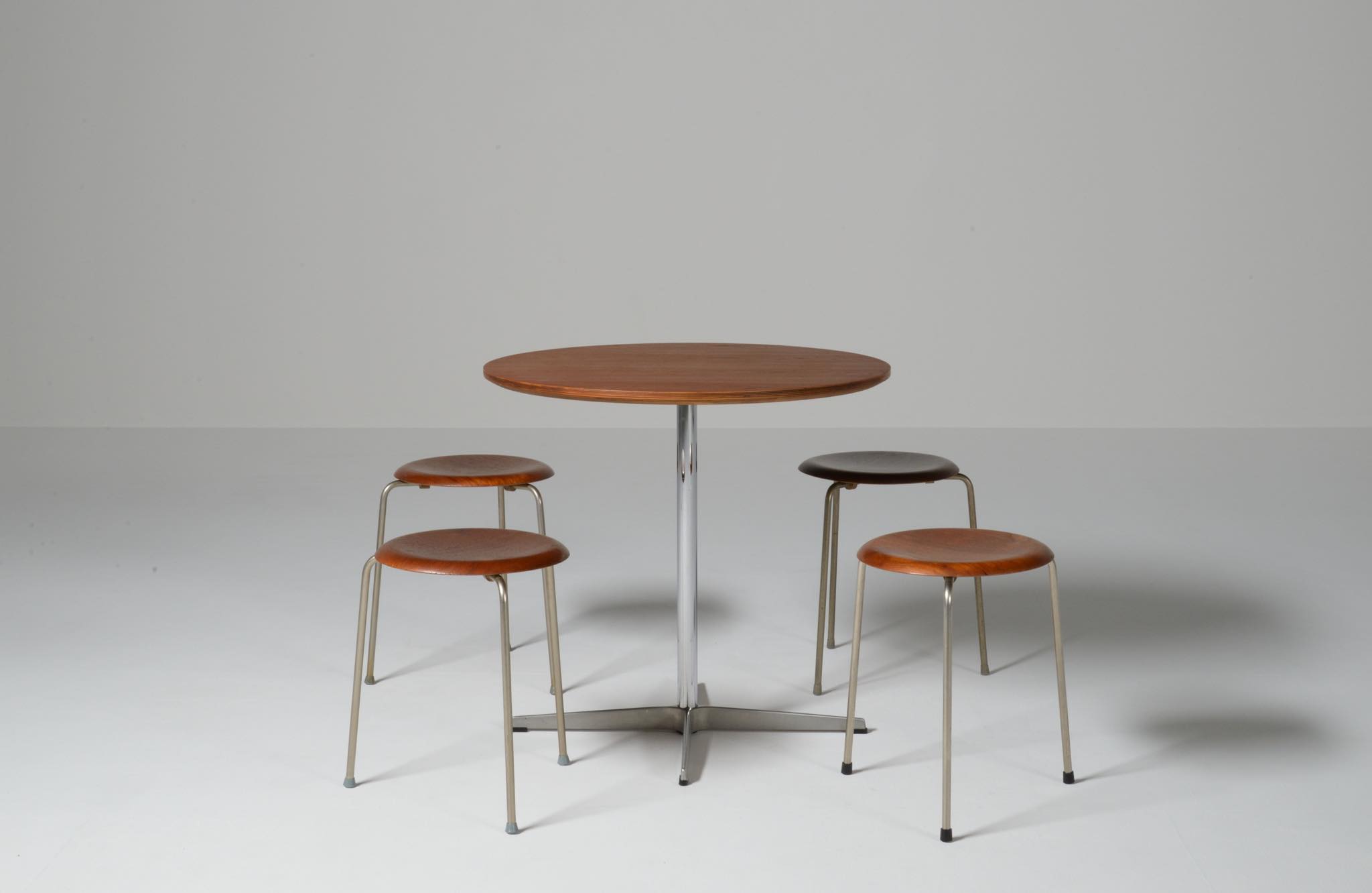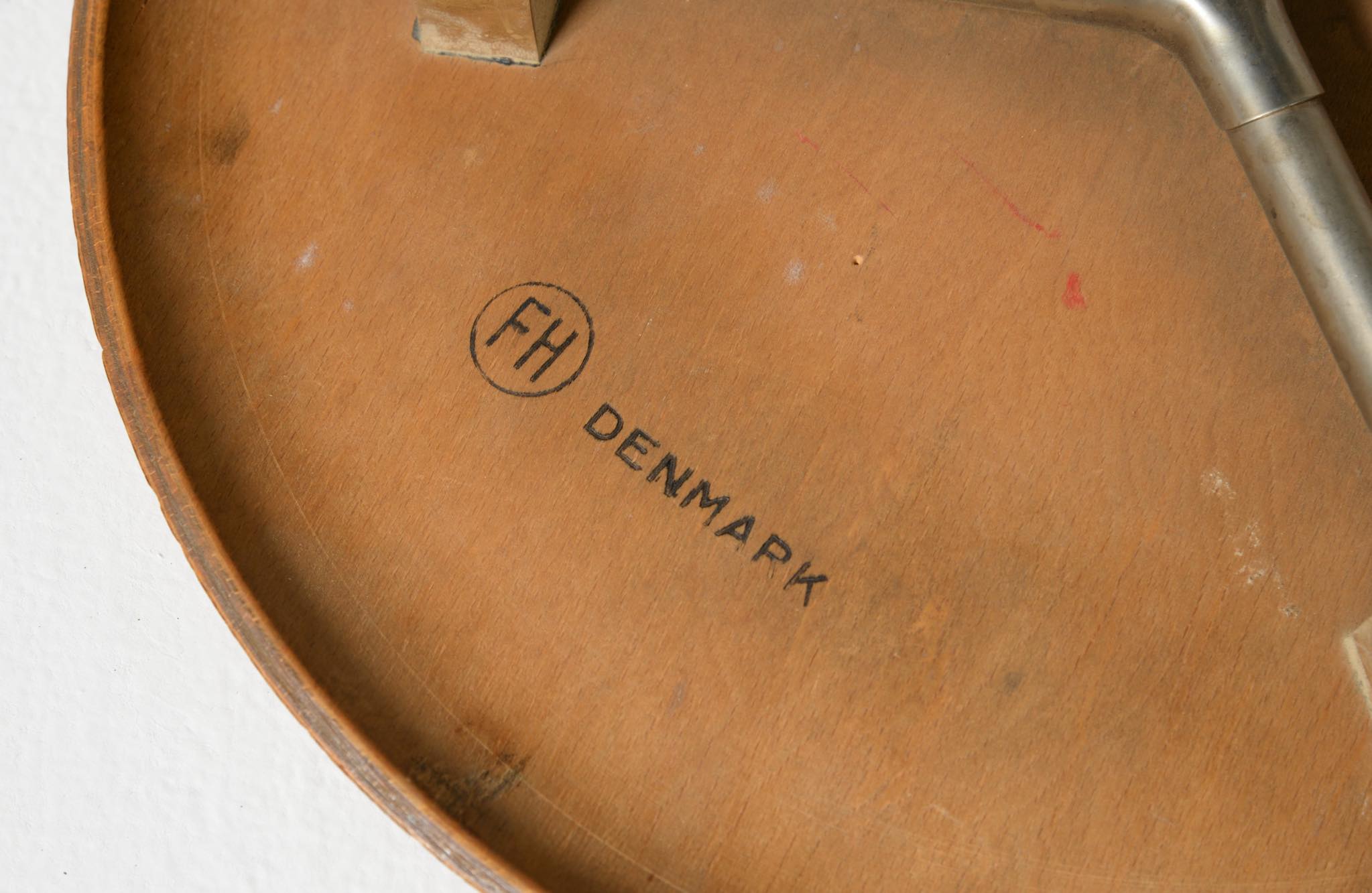 デンマークの家具工房、Fritz Hansen/フリッツ・ハンセンによるチーク材とスチールのスツールです。1950年代頃に作られたものでしょう。立体的に整形合板したシートに、ニッケルメッキを施したパイプスチールの3本脚が軽快な印象のモデルです。こちらは単体での販売となり、それぞれ木目紋様やグライズの色、コンディションが異なるので、店頭での現物確認販売を前提とさせていただきます。脚部の錆や小傷等は否めませんが、どれも概ね良い状態です。