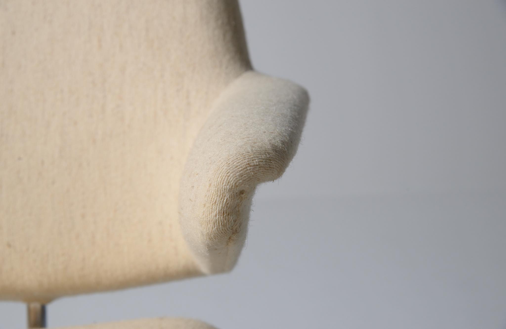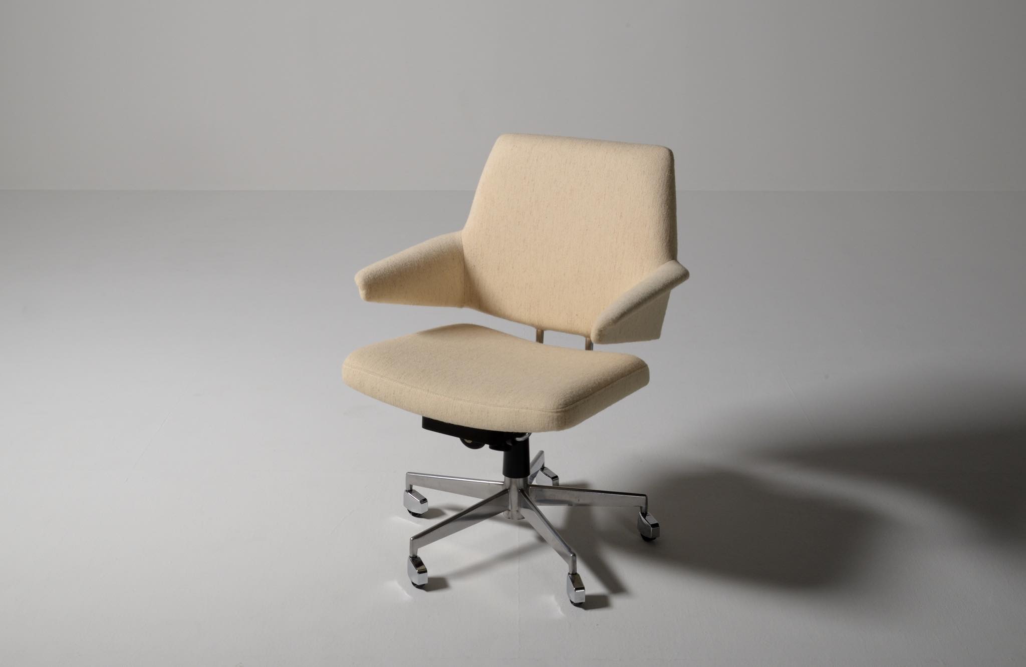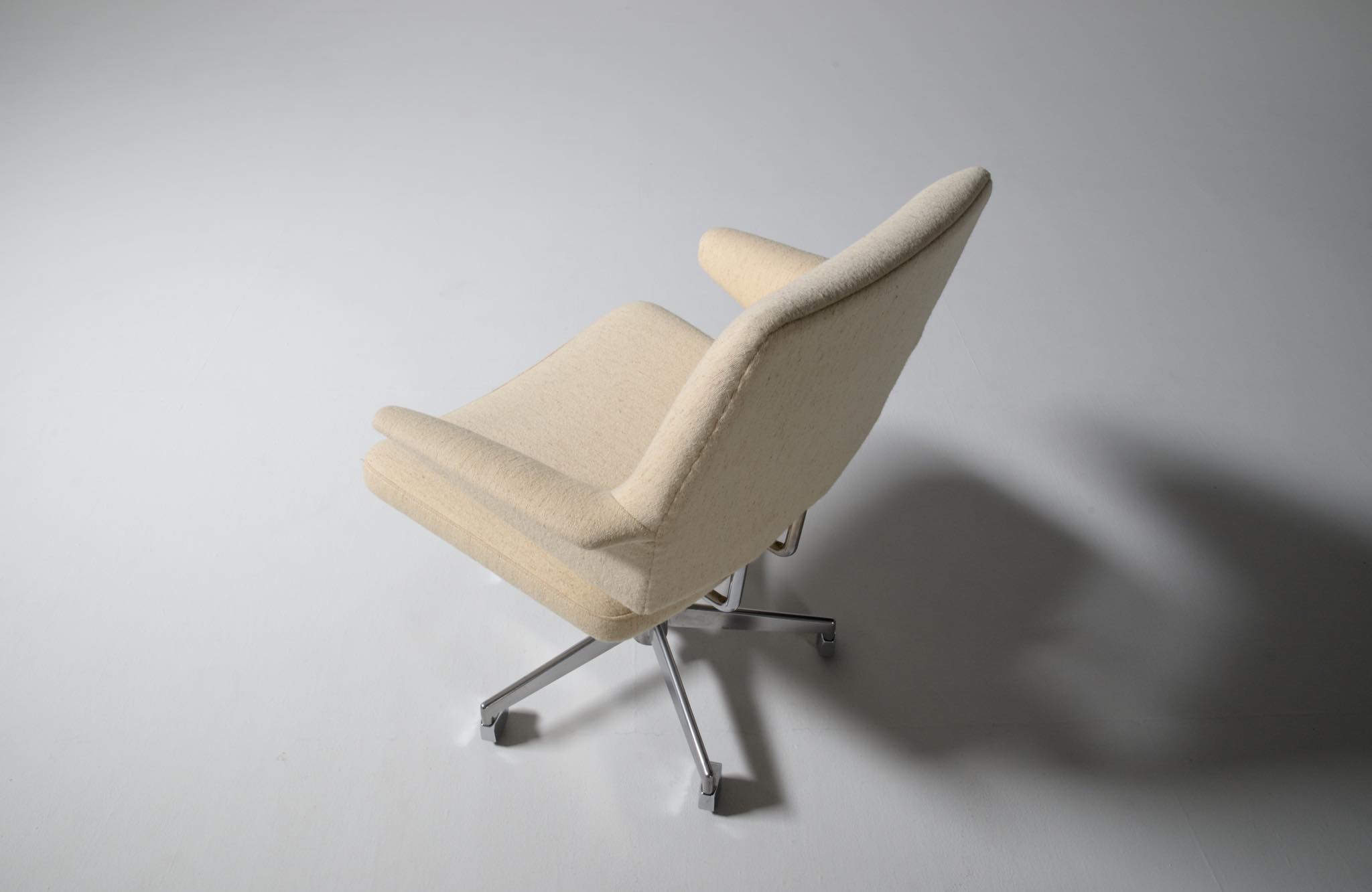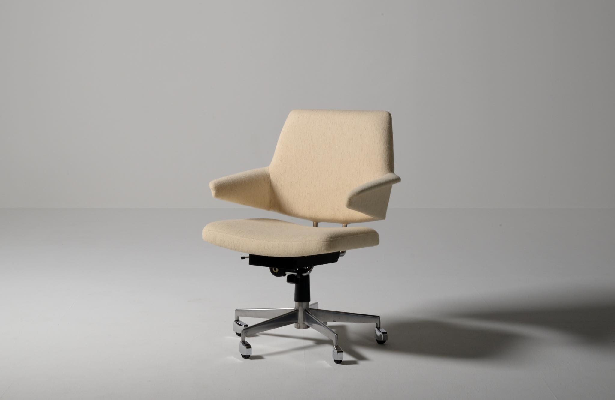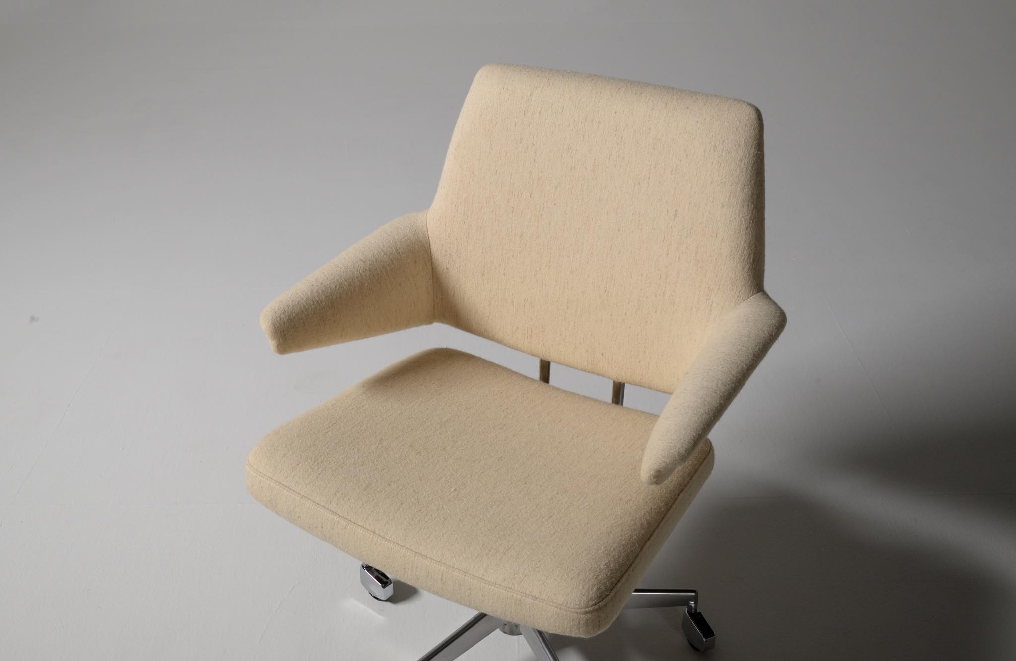 1960年以降のBang & Olufsenのチーフデザイナーとして活躍したプロダクトデザイナーの Jacob Jensen/ヤコブ・イェンセンによるスイヴェルチェアです。1960年代にデザイン、製作されたもので、氏ならではの独特なデザインがなされています。シートは背後にロッキングし、固定も可能です。昇降機能も備わります。新たにデンマークの生地で張り替えを行っており、コンディションは良好です。