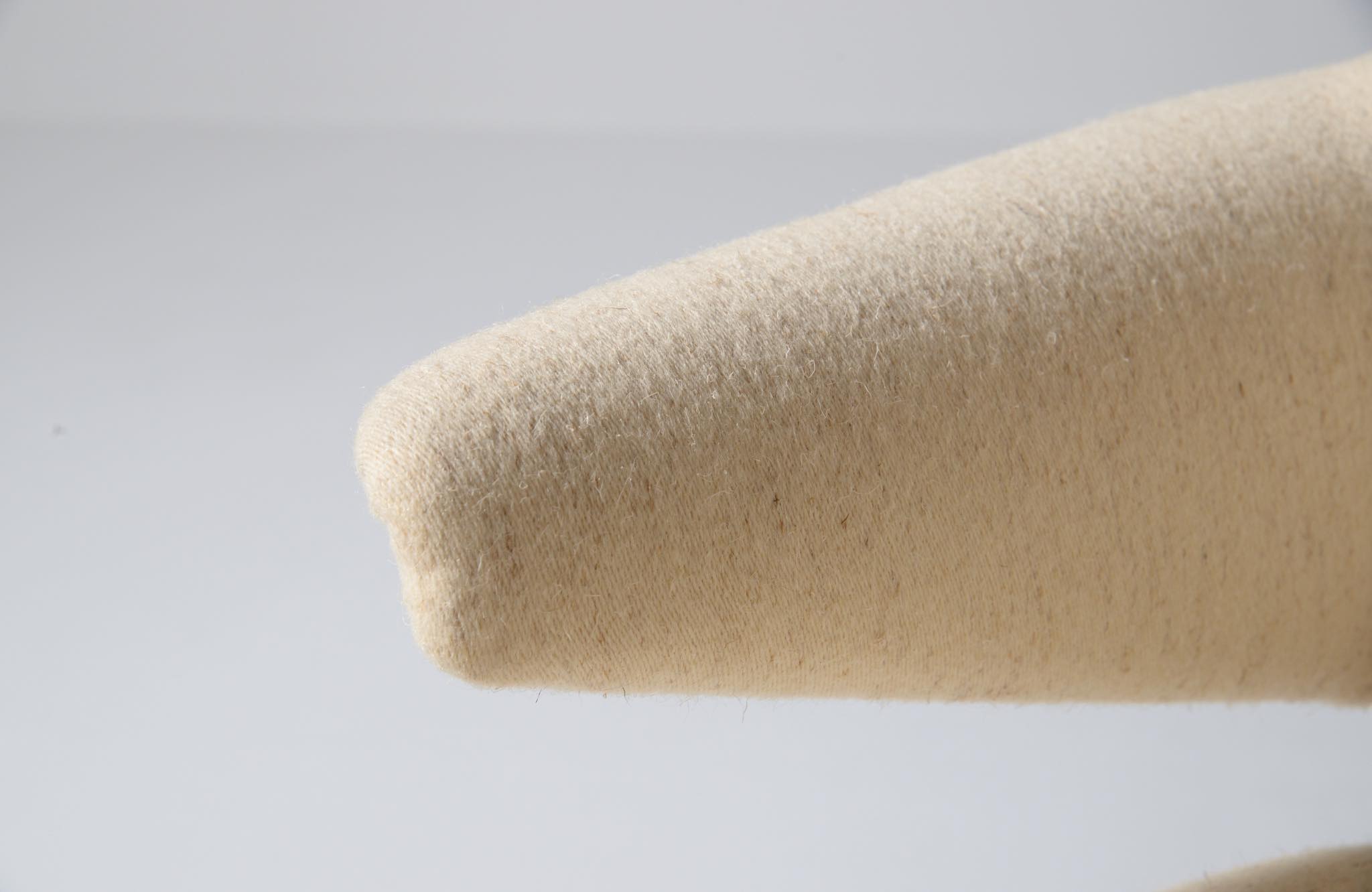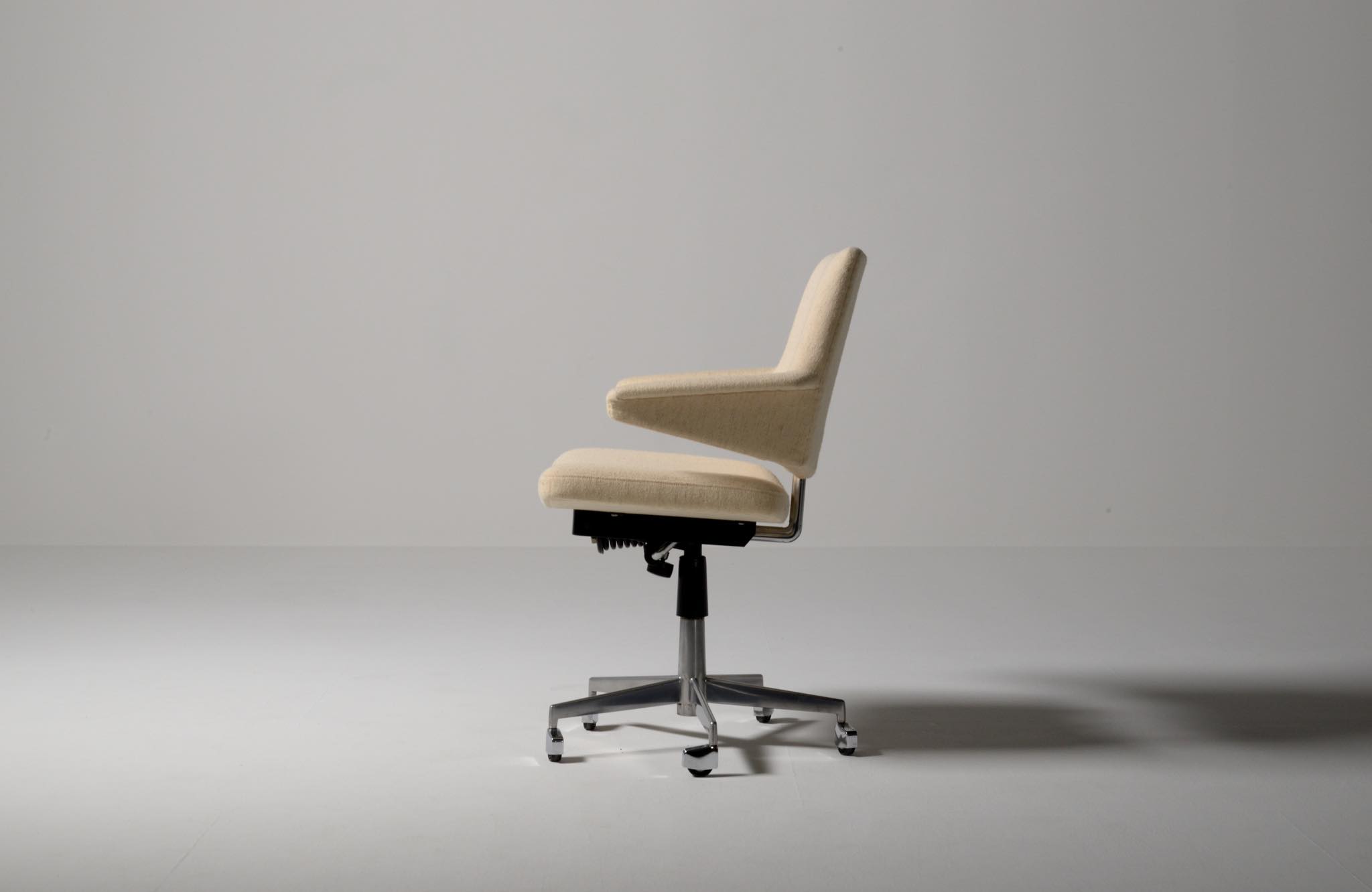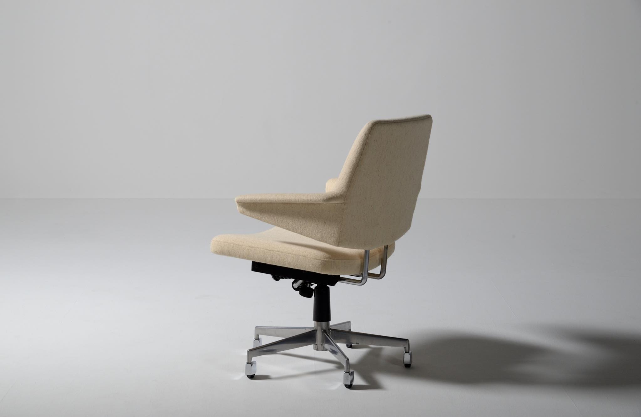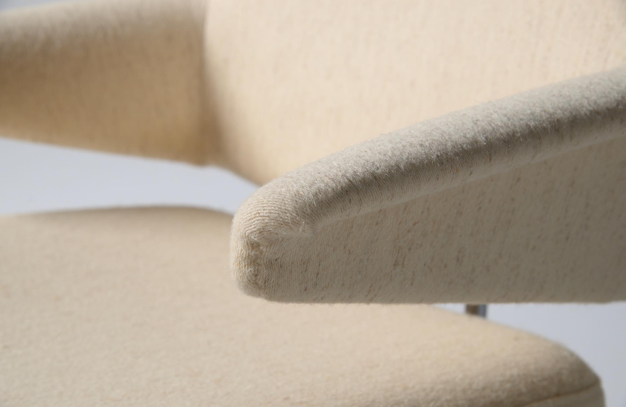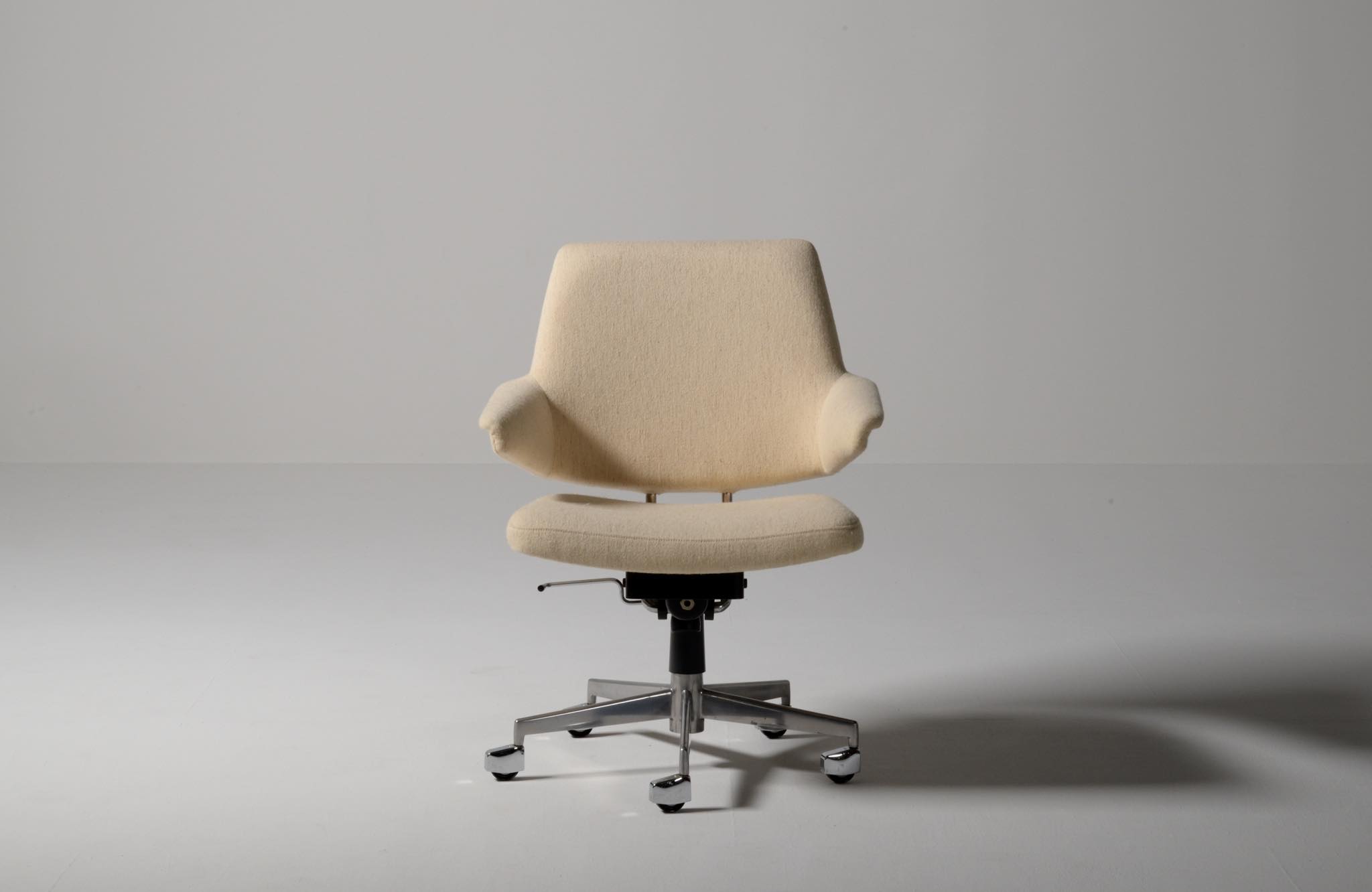 1960年以降のBang & Olufsenのチーフデザイナーとして活躍したプロダクトデザイナーの Jacob Jensen/ヤコブ・イェンセンによるスイヴェルチェアです。1960年代にデザイン、製作されたもので、氏ならではの独特なデザインがなされています。シートは背後にロッキングし、固定も可能です。昇降機能も備わります。新たにデンマークの生地で張り替えを行っており、コンディションは良好です。