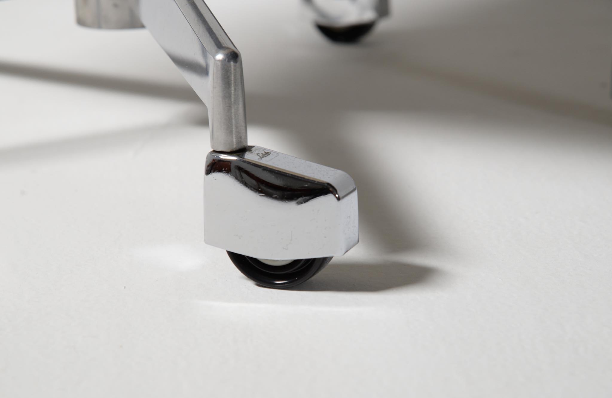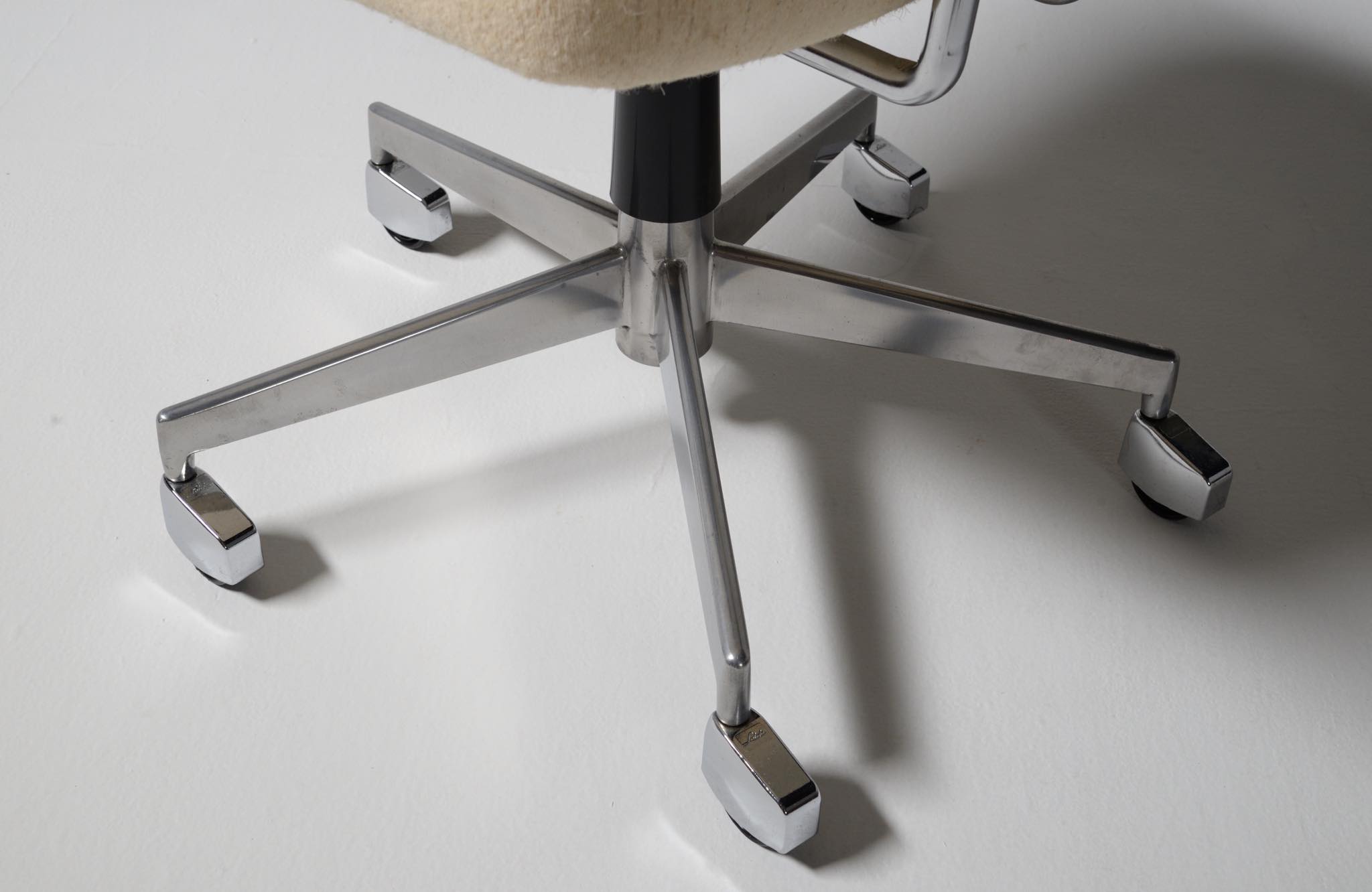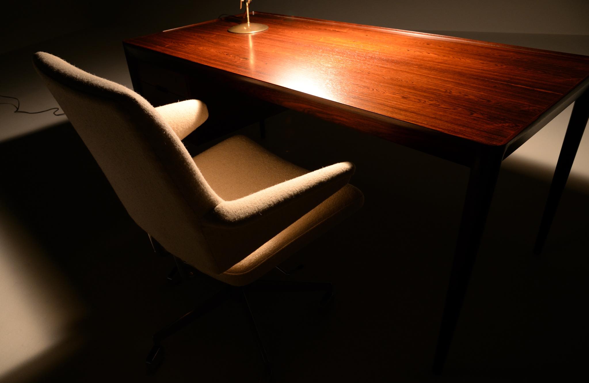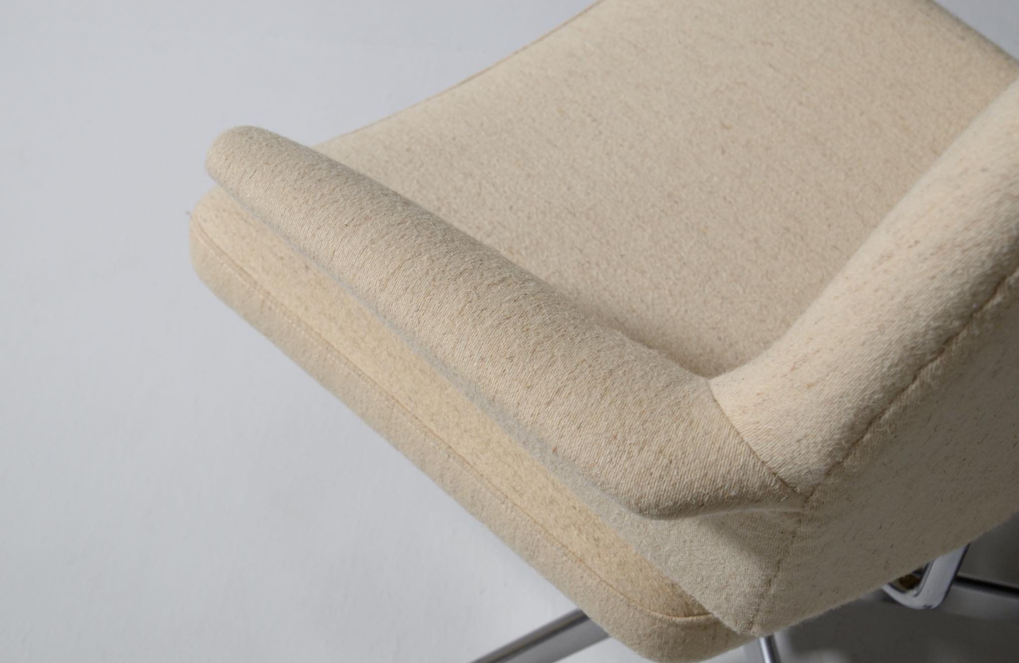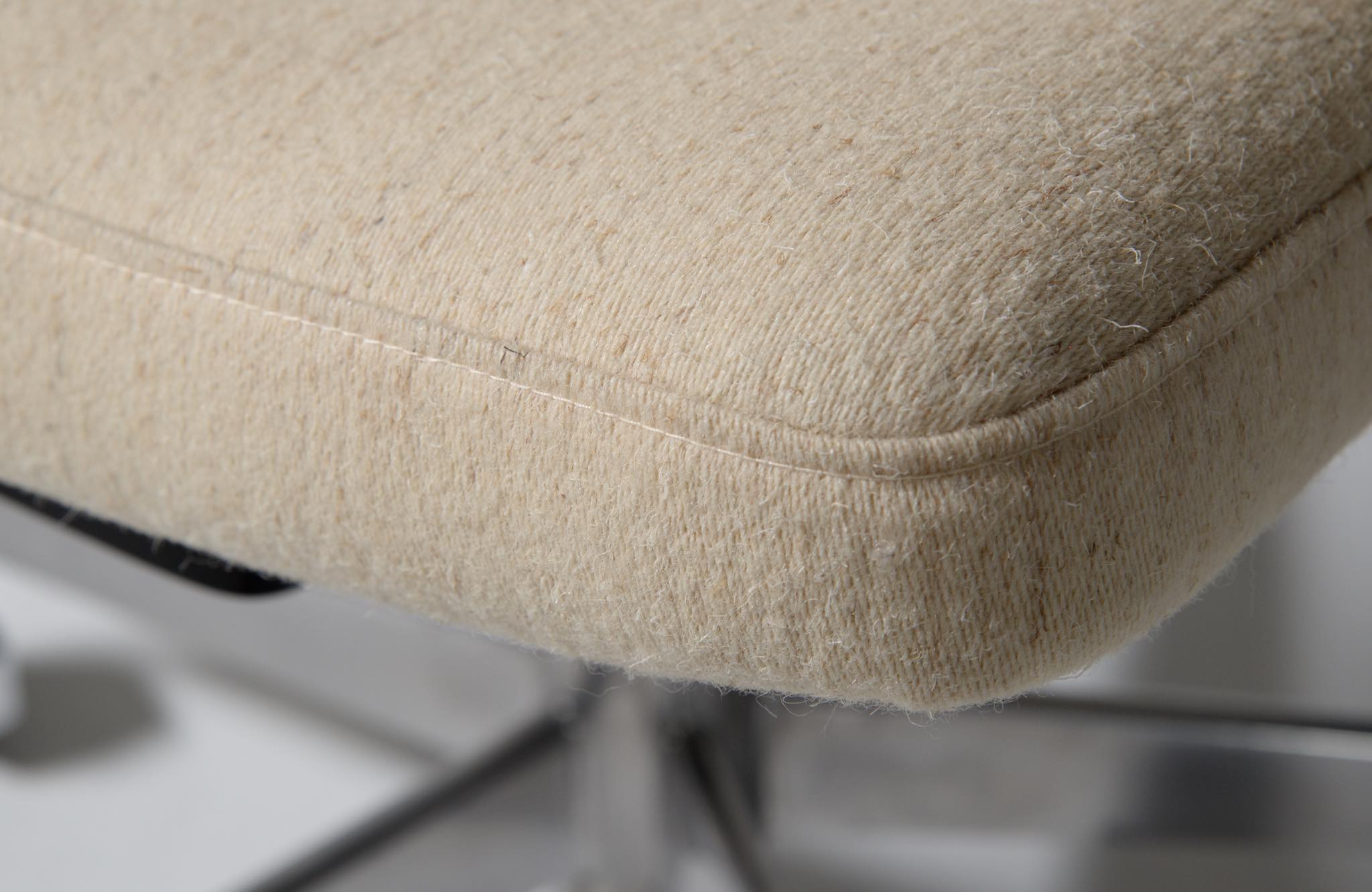 1960年以降のBang & Olufsenのチーフデザイナーとして活躍したプロダクトデザイナーの Jacob Jensen/ヤコブ・イェンセンによるスイヴェルチェアです。1960年代にデザイン、製作されたもので、氏ならではの独特なデザインがなされています。シートは背後にロッキングし、固定も可能です。昇降機能も備わります。新たにデンマークの生地で張り替えを行っており、コンディションは良好です。