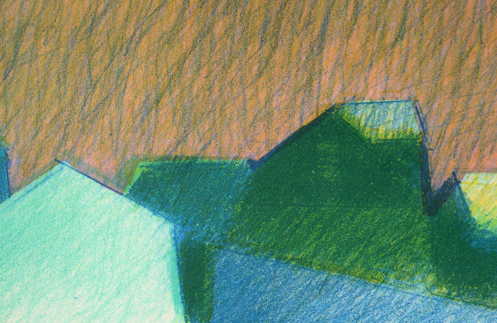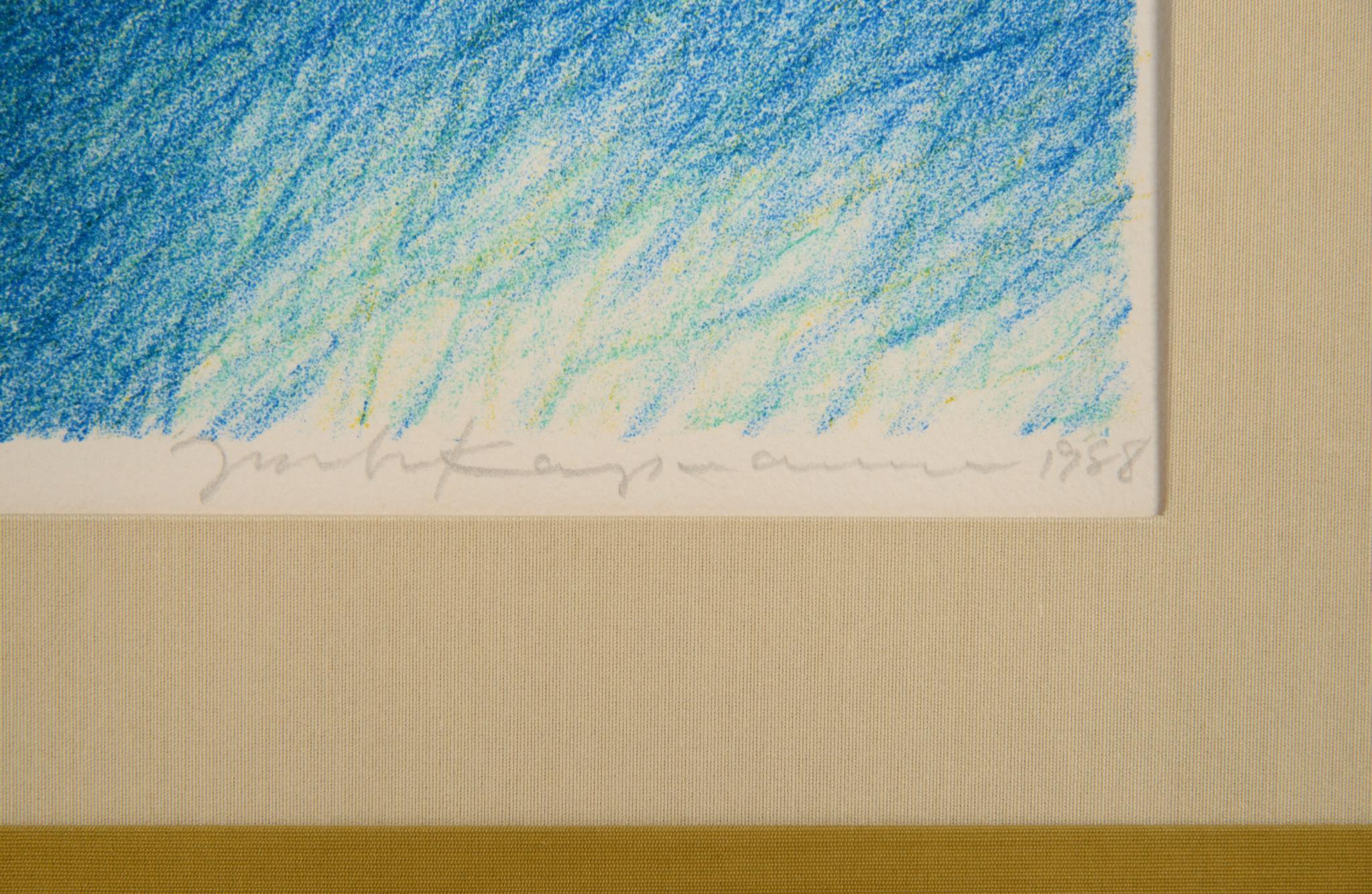 こちらは1988年に制作された小振りな作品です。夕暮れ時でしょうか、空が赤く染まり、夜の帳が下りる頃の様子を描いているようです。鉛筆の細かな線で、建物や大地や影、大気感を表現するのは1980年代に見られる技法です。オリジナルの木製フレームに表面的な劣化が見られたので塗装して整えました。マットは新たに整えました。コンディションは良好です。
