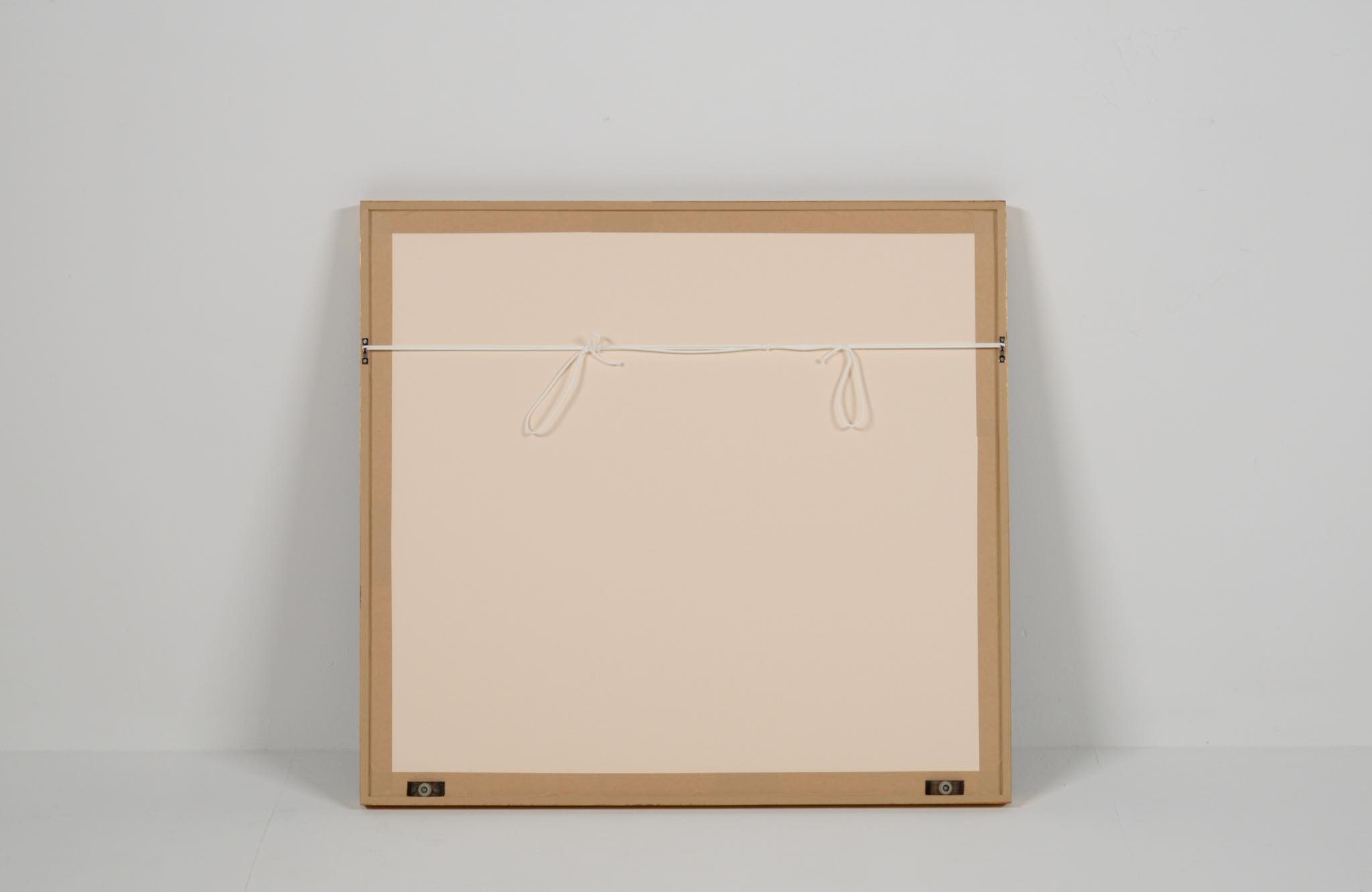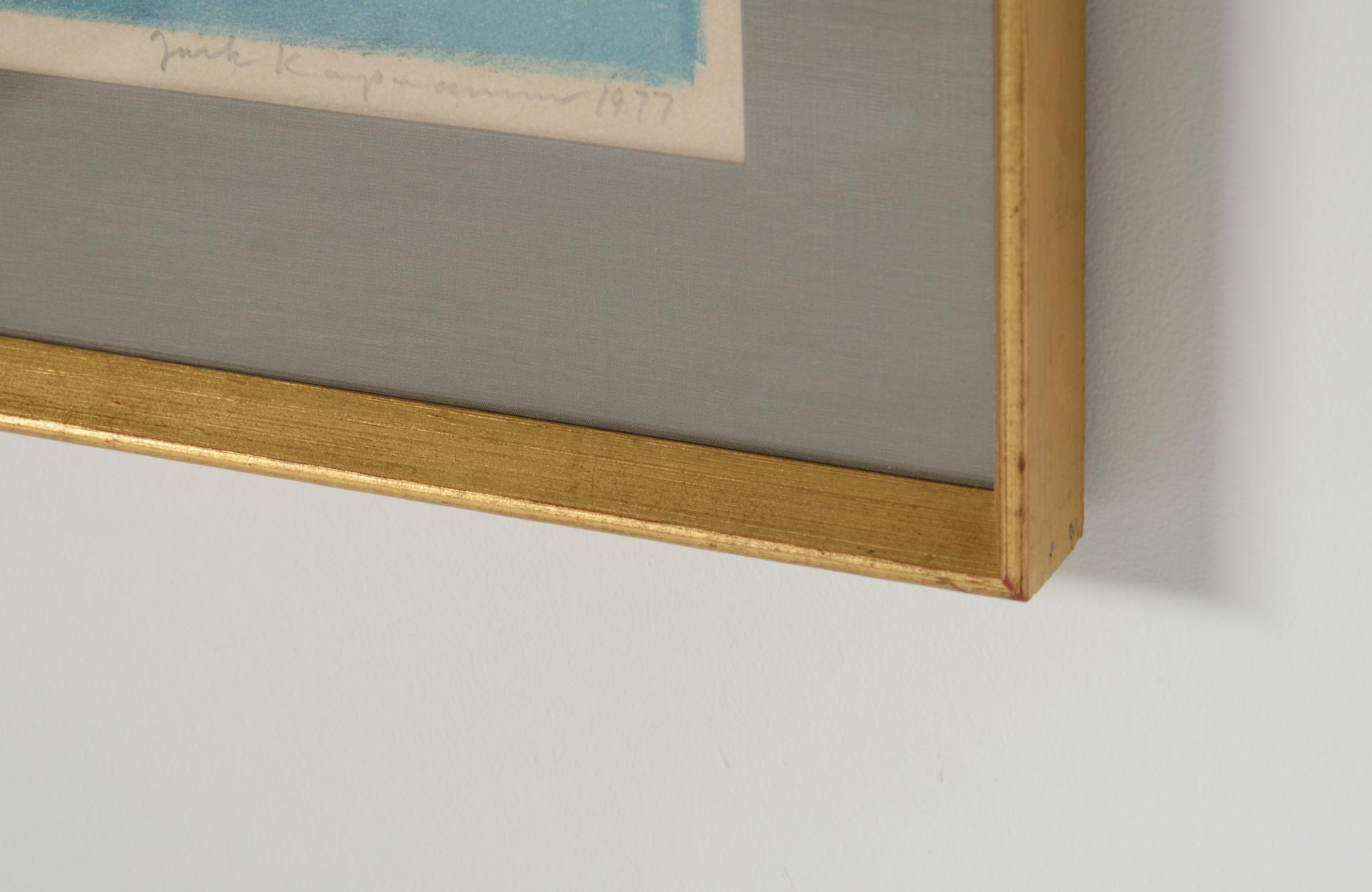 こちらは1977年に制作された作品で、海岸沿いに佇む集落を表現しています。金箔のフレームはオリジナルで、マットは新たに誂えました。コンディションは良好です。