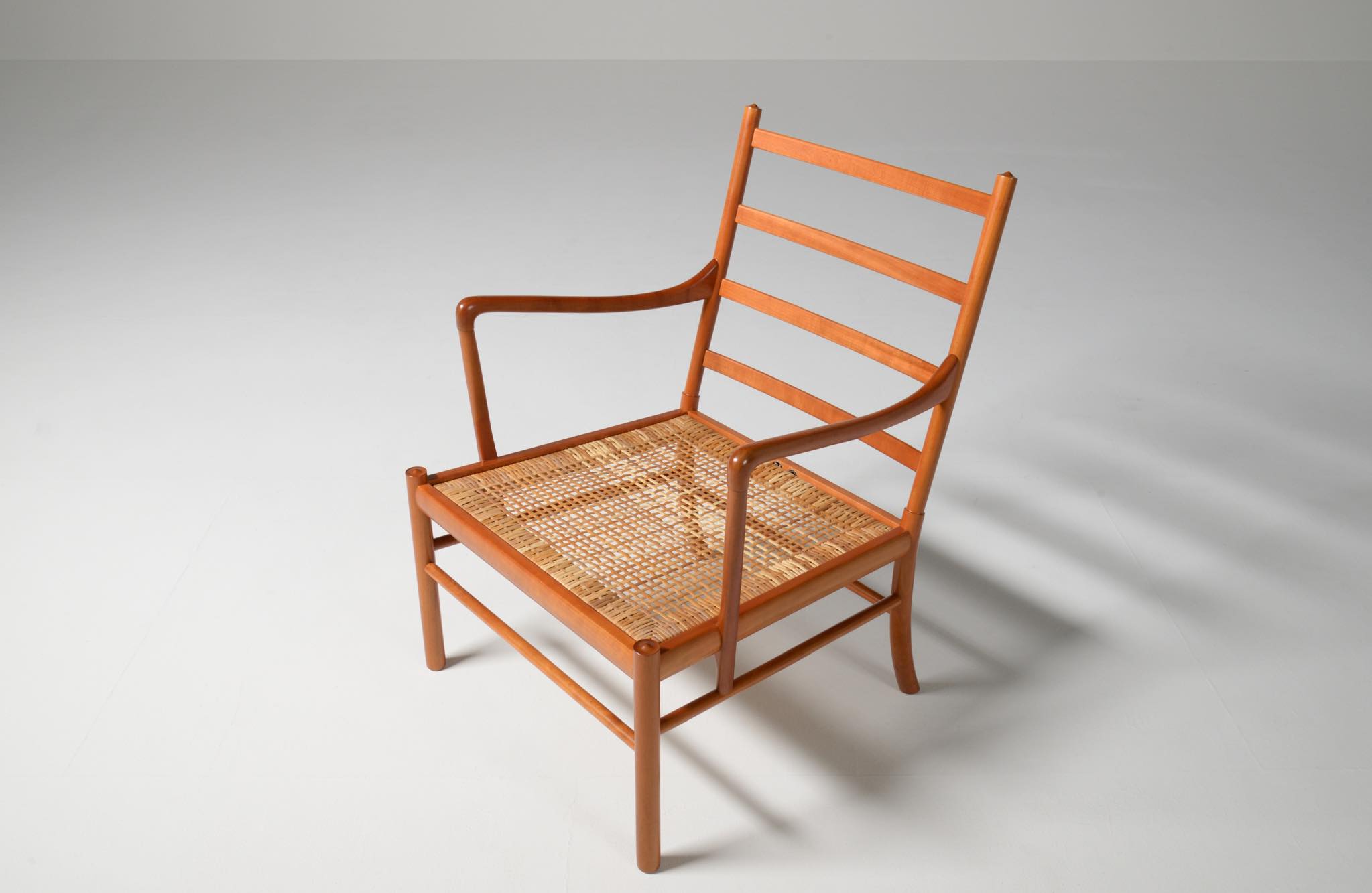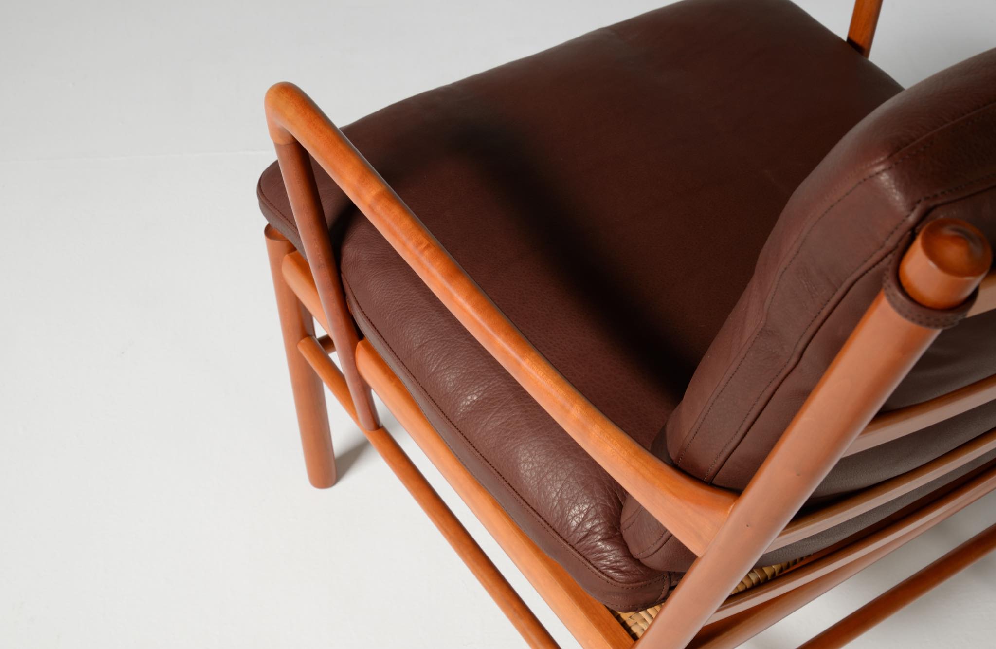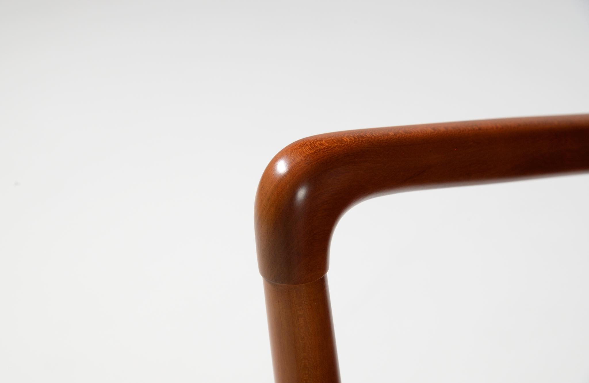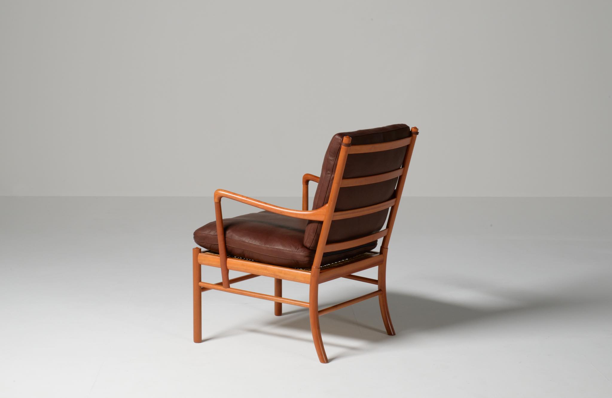 デンマークの家具デザイナーとして20世紀前中葉に活躍し、王立アカデミー家具科の教授も務めた Ole Wanscher/オーレ・ヴァンシャーによる名作椅子、コロニアルチェアです。1970~80年代に作られたものと思われ、チェリー材が用いられています。クッションには劣化が見られたため、緩衝材には多めの羽毛を用いてつぶれにくいように製作しました。皮革はデンマークのCAMOレザーを用いています。コンディションは良好です。