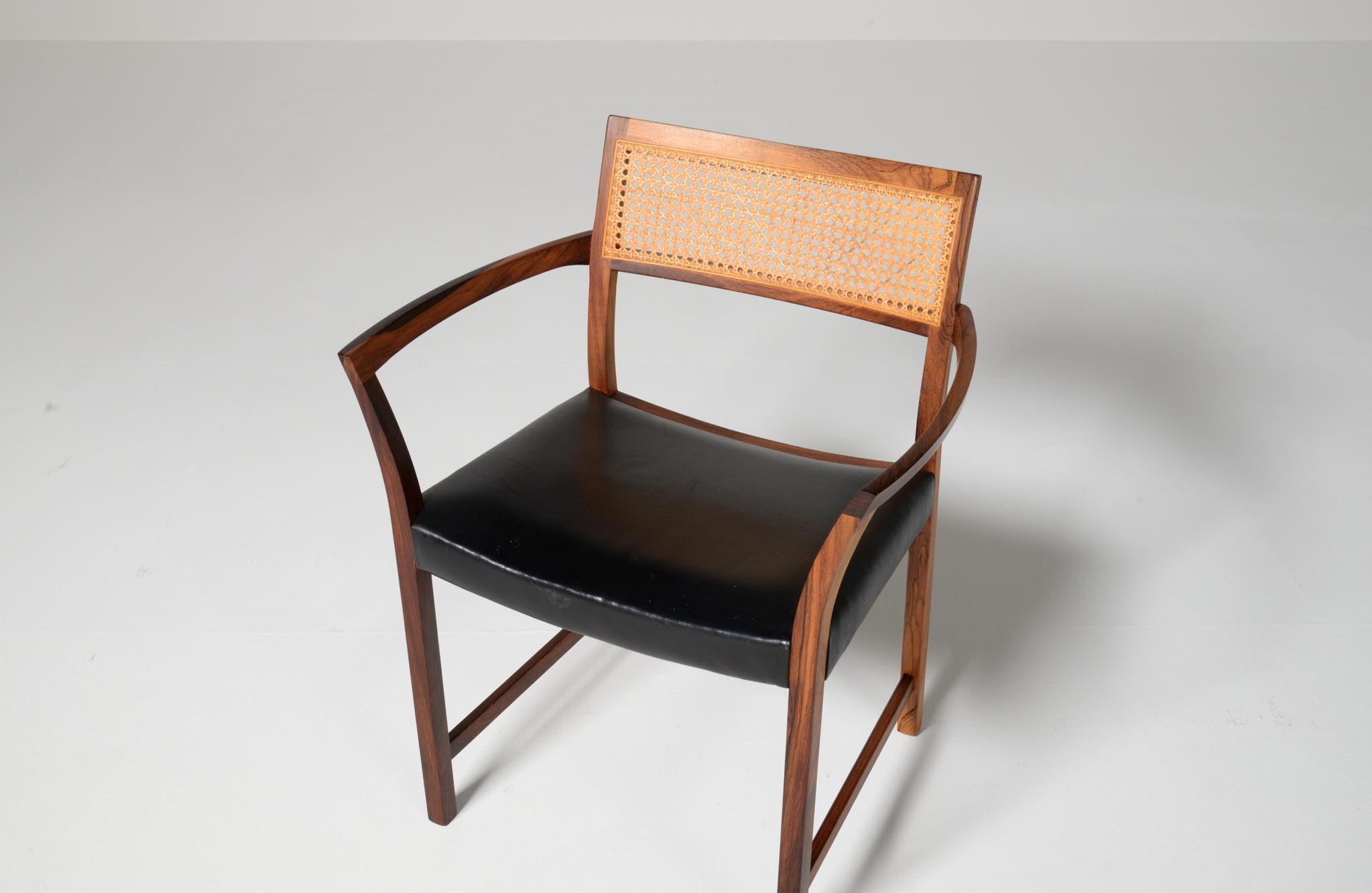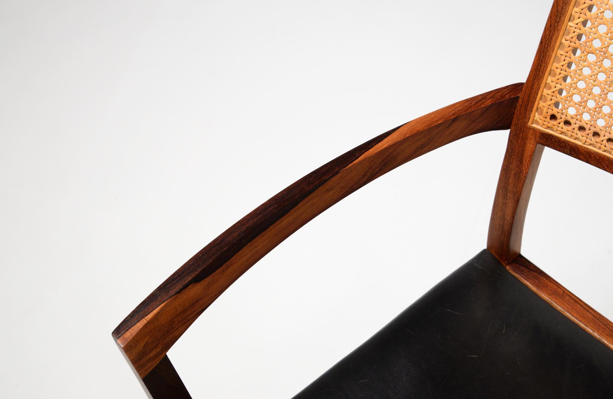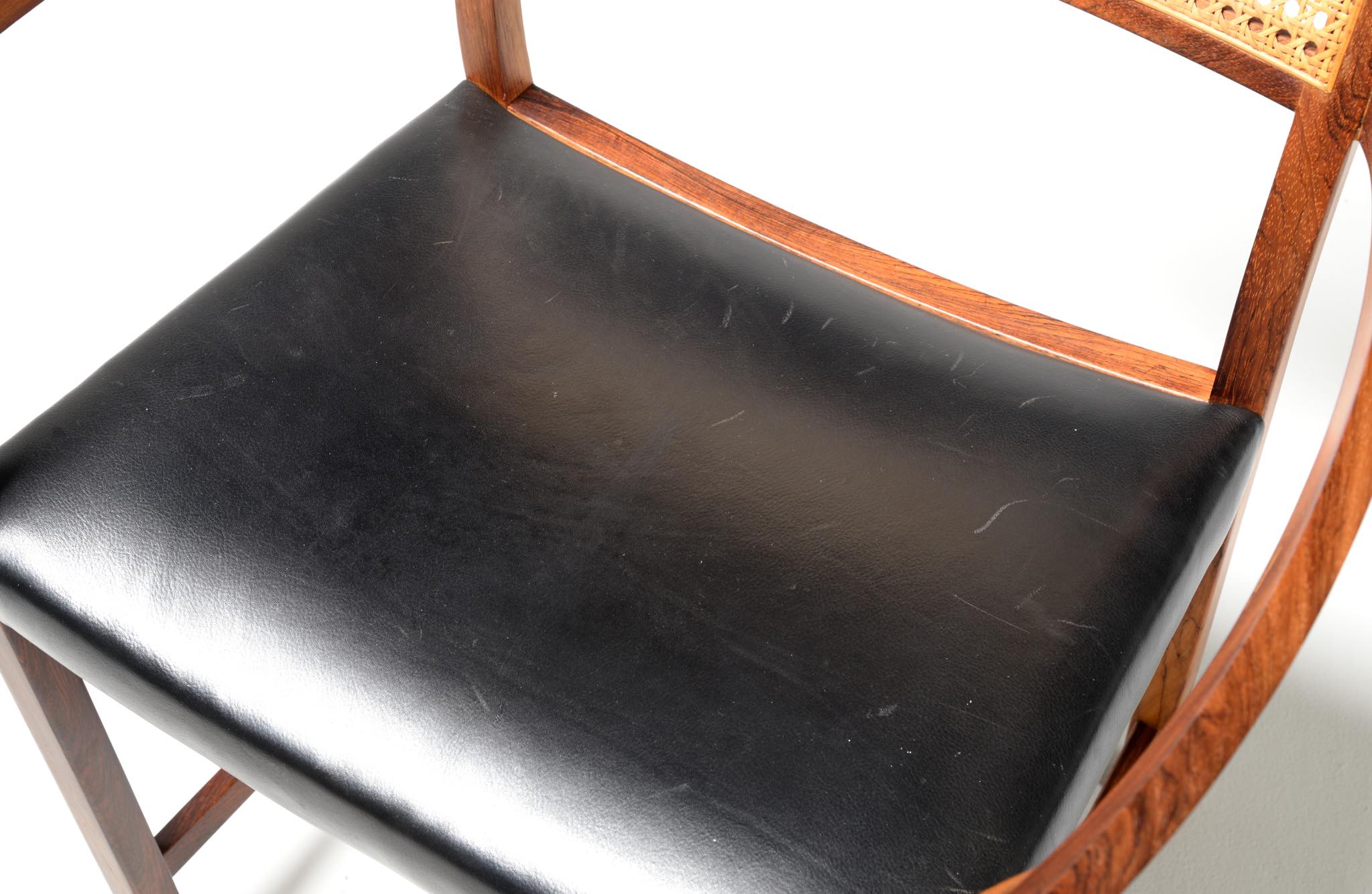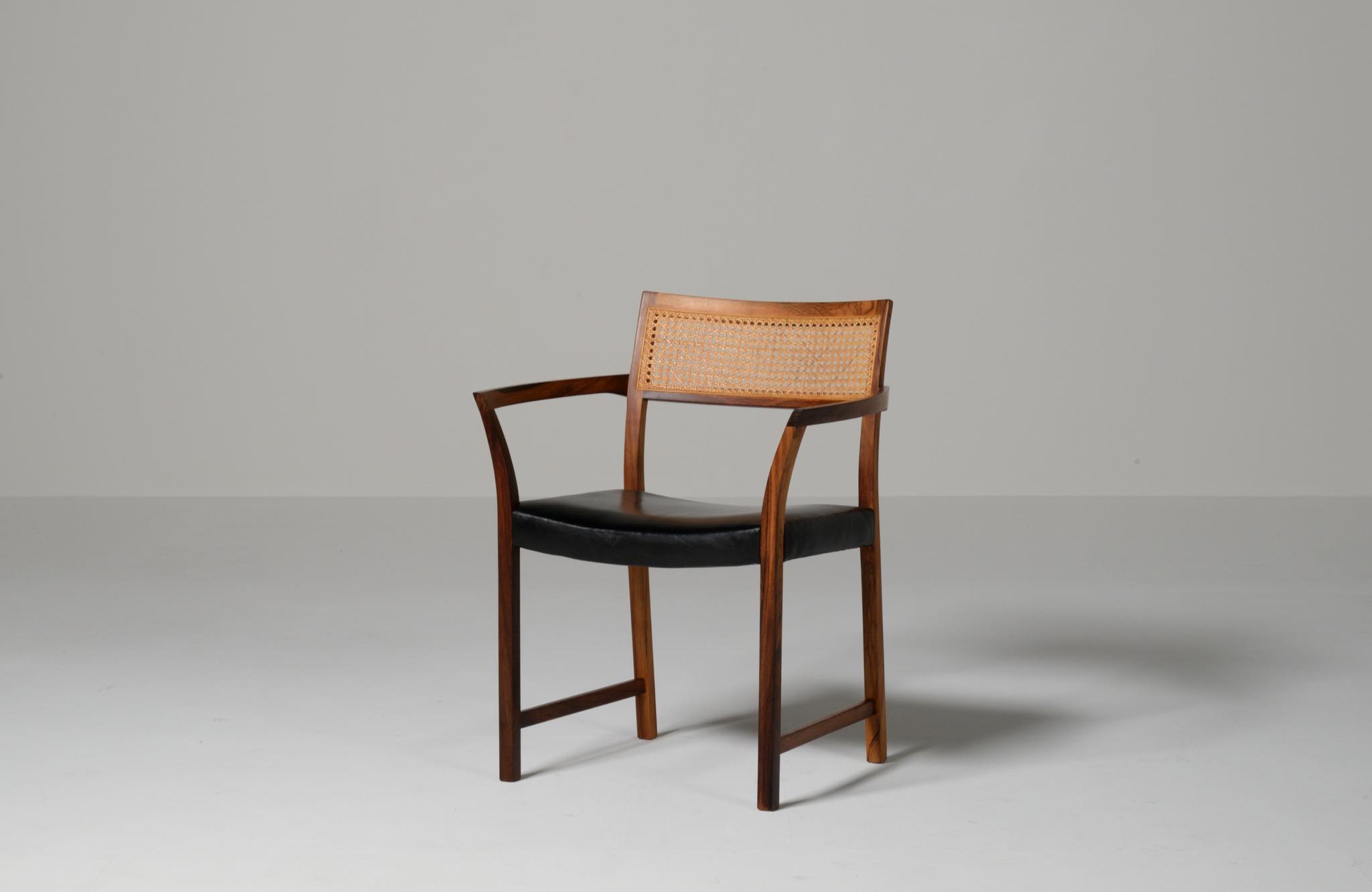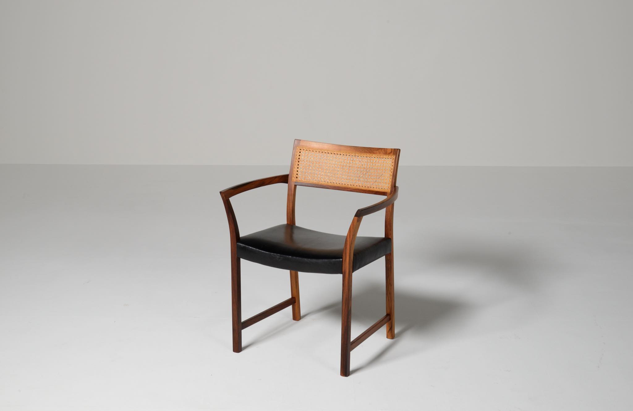 デンマークの家具デザイナー、Illum Wikkelsø/イルム・ヴィッケルソによるアームチェアです。応接の"Campus"シリーズのものと思われます。ローズウッドの際立った木目紋様とその鋭い削り出しが特徴的です。シートは皮革張りで、籐張りの状態もよく、コンディションは良好です。