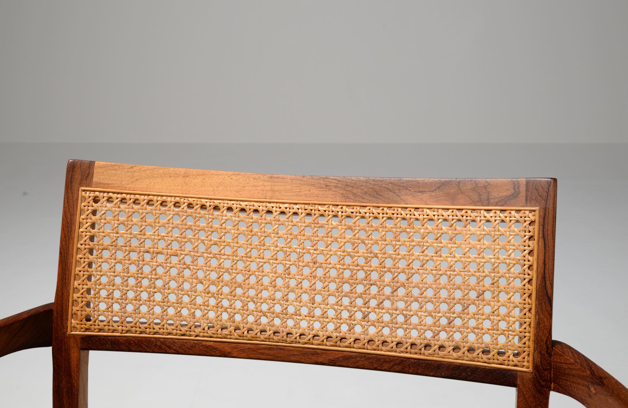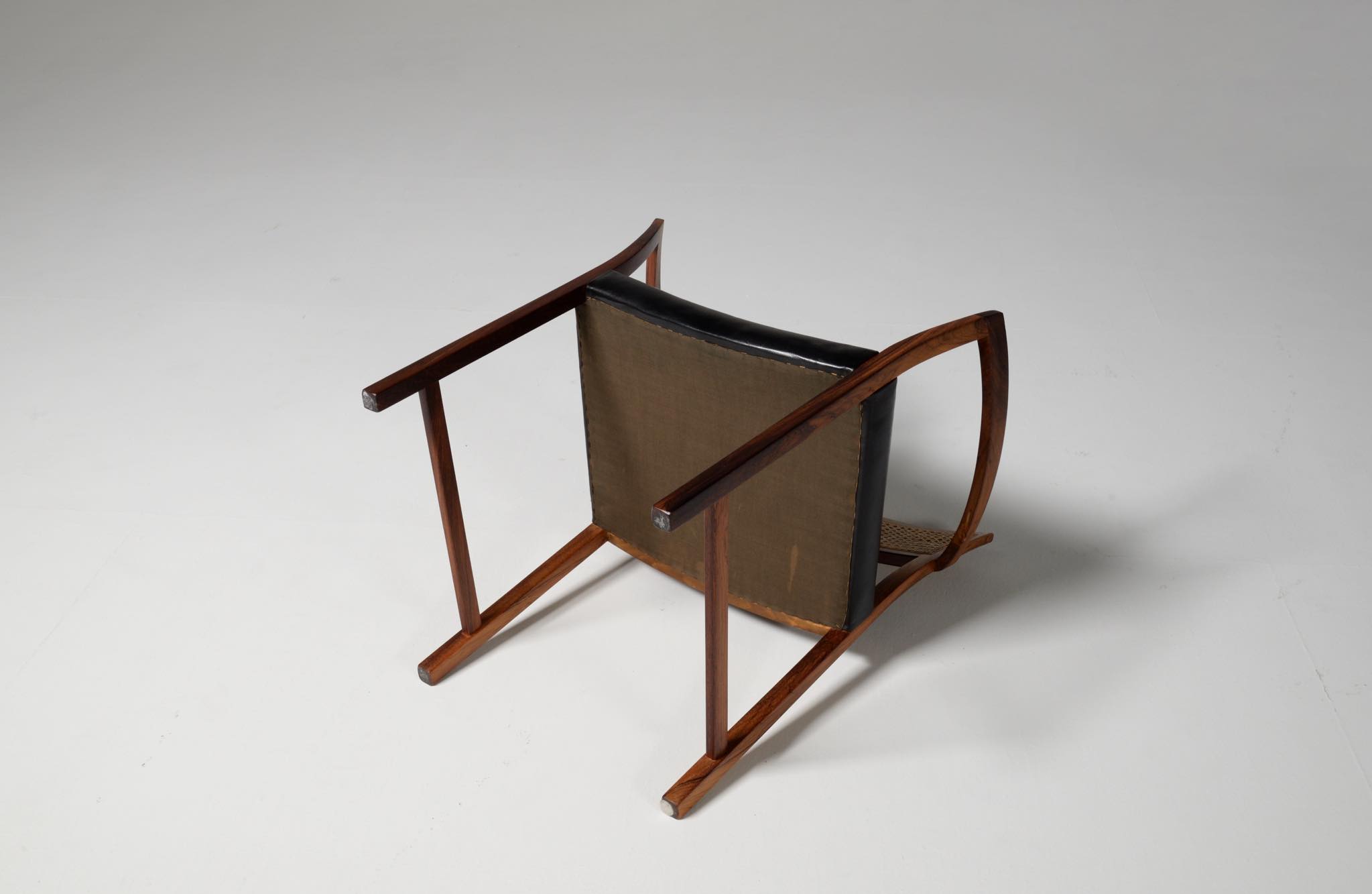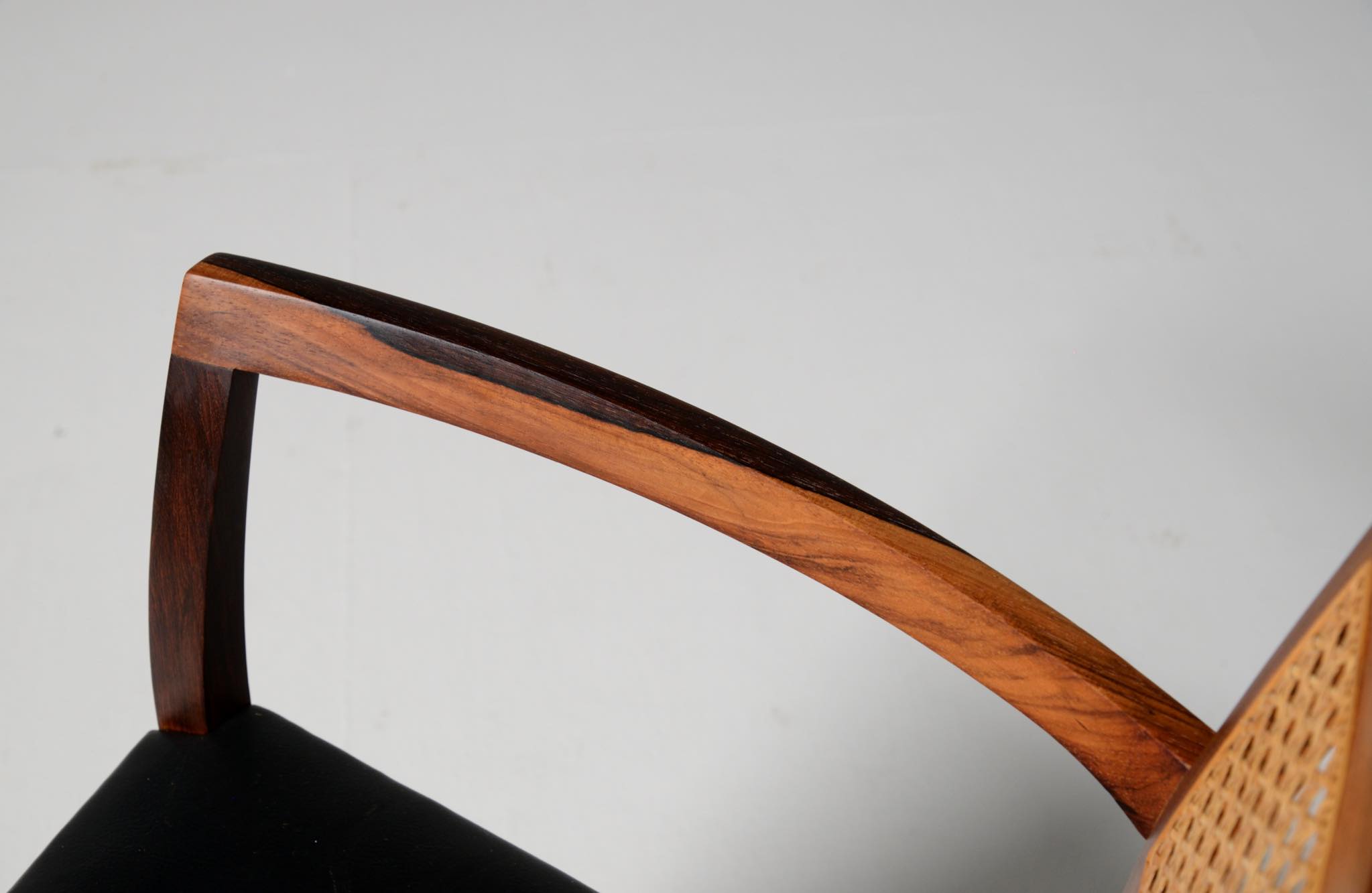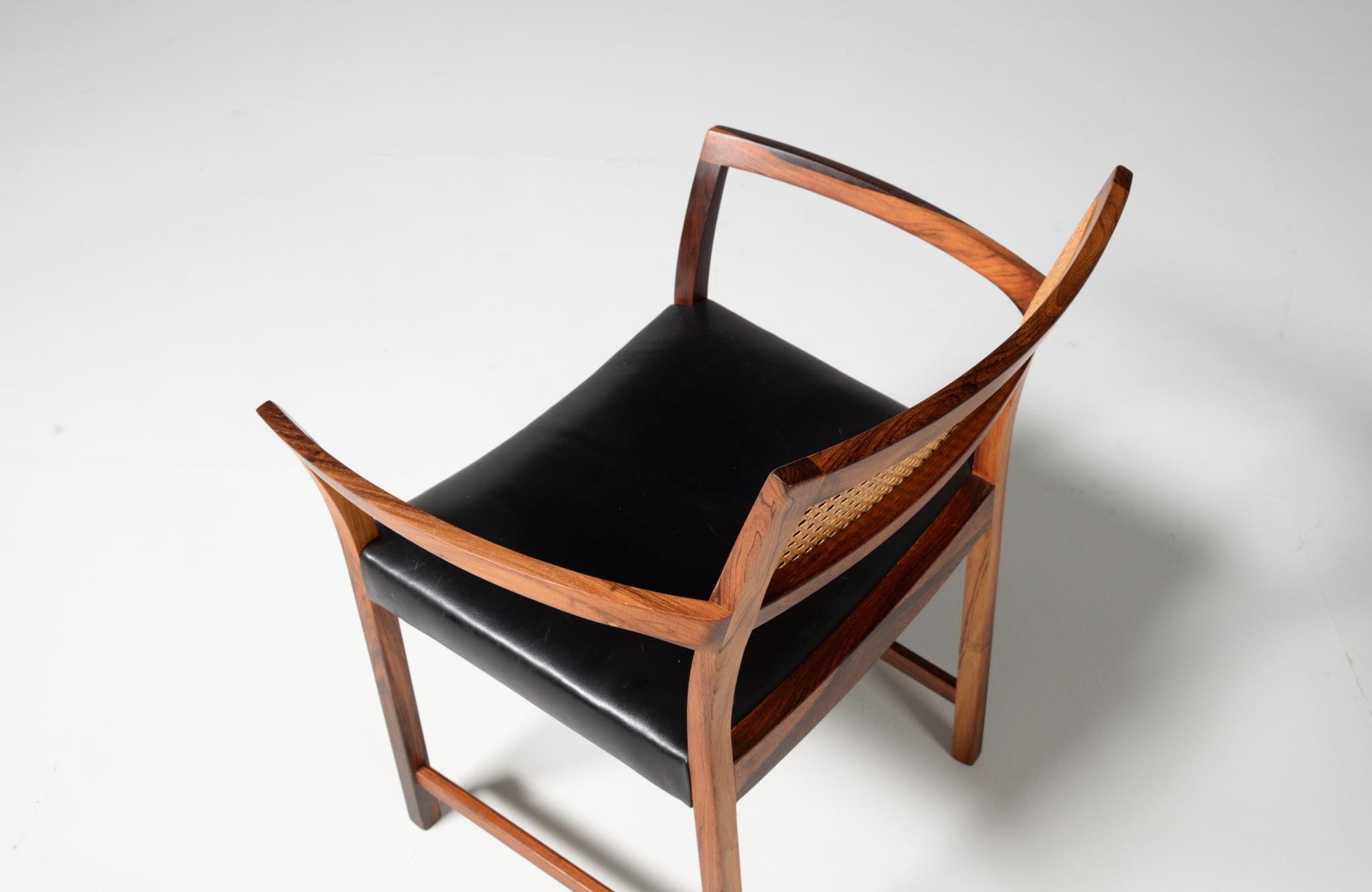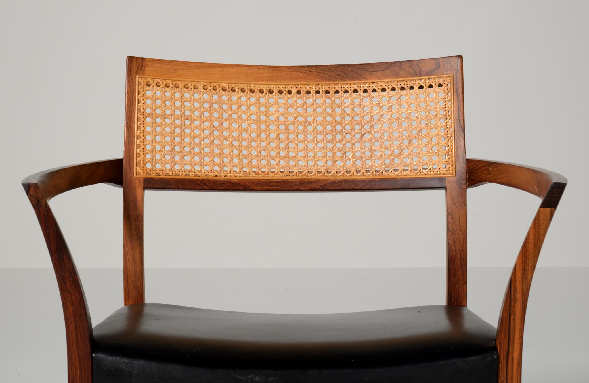 デンマークの家具デザイナー、Illum Wikkelsø/イルム・ヴィッケルソによるアームチェアです。応接の"Campus"シリーズのものと思われます。ローズウッドの際立った木目紋様とその鋭い削り出しが特徴的です。シートは皮革張りで、籐張りの状態もよく、コンディションは良好です。