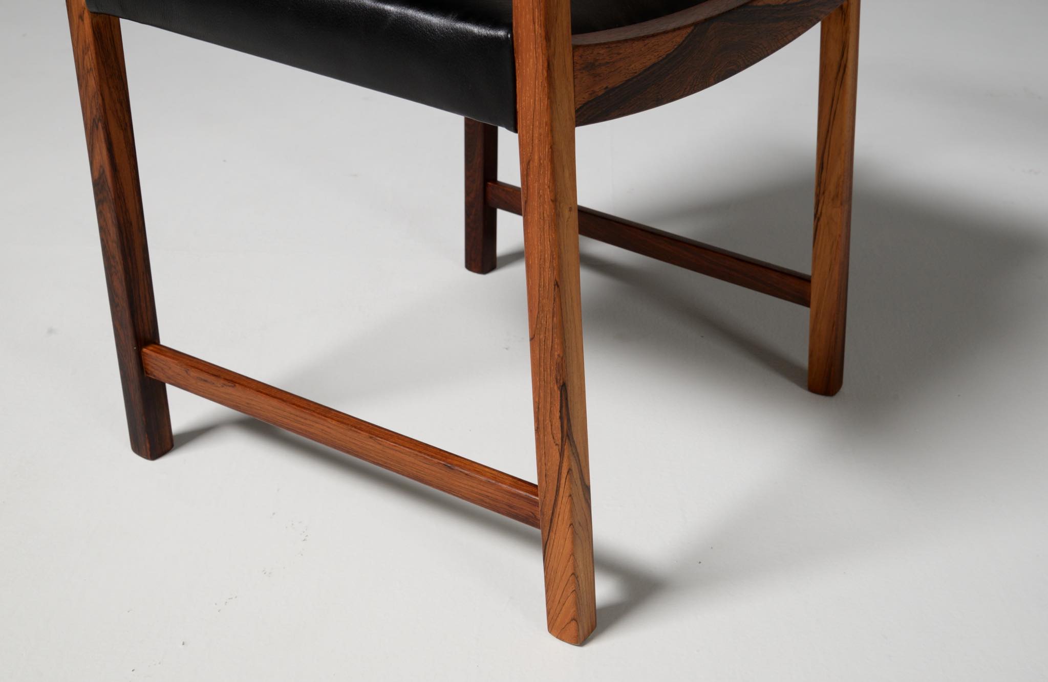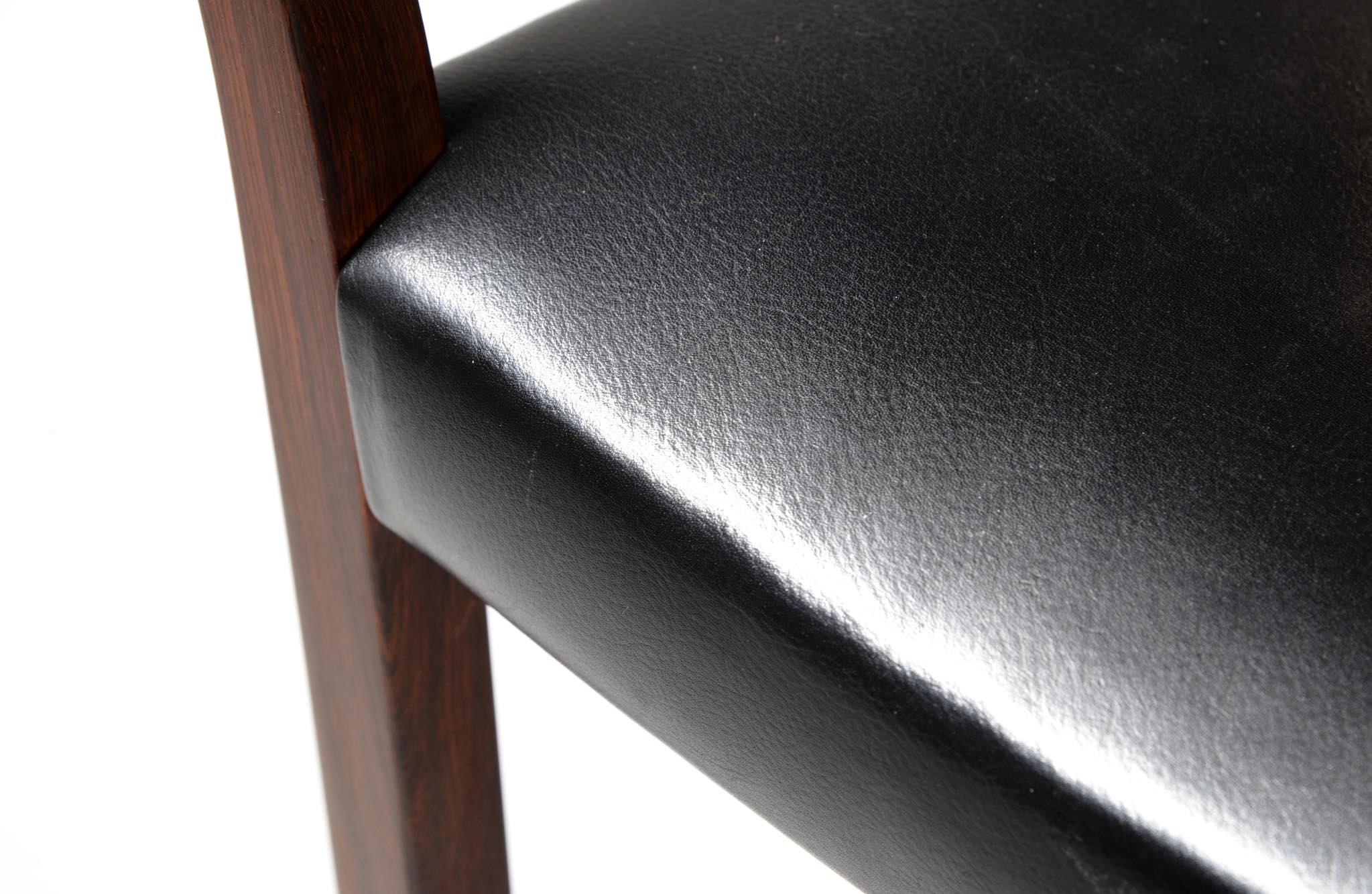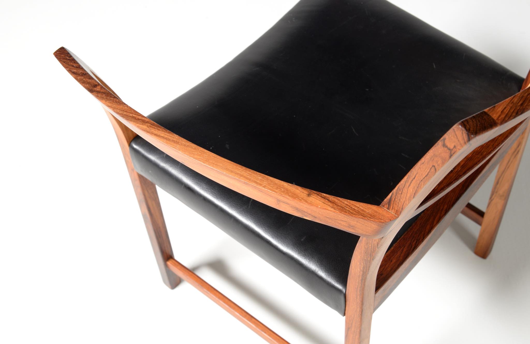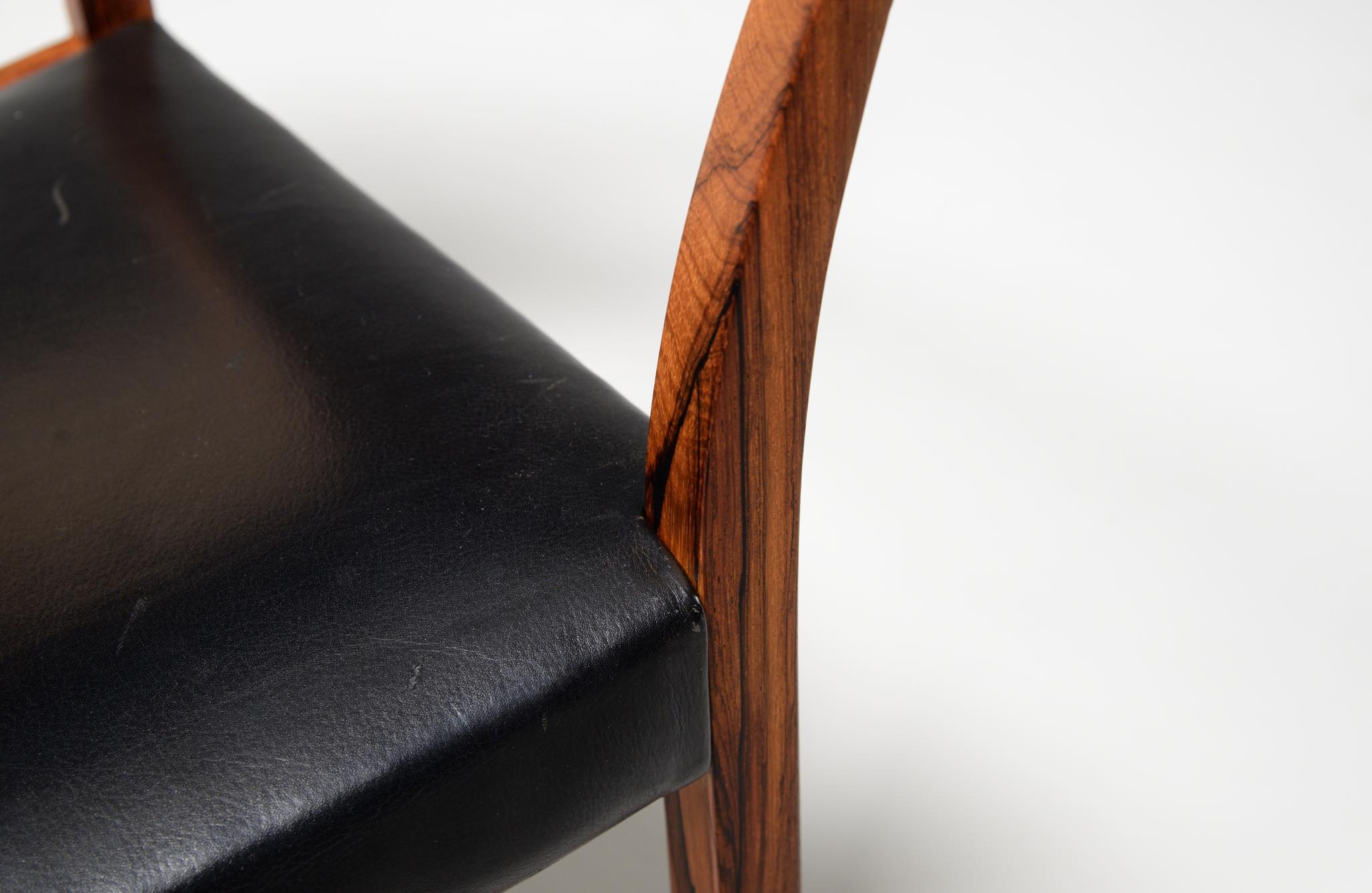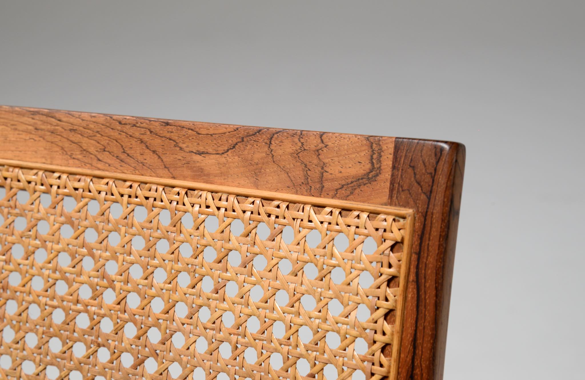 デンマークの家具デザイナー、Illum Wikkelsø/イルム・ヴィッケルソによるアームチェアです。応接の"Campus"シリーズのものと思われます。ローズウッドの際立った木目紋様とその鋭い削り出しが特徴的です。シートは皮革張りで、籐張りの状態もよく、コンディションは良好です。