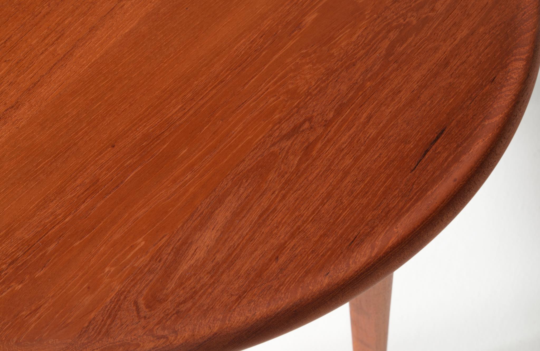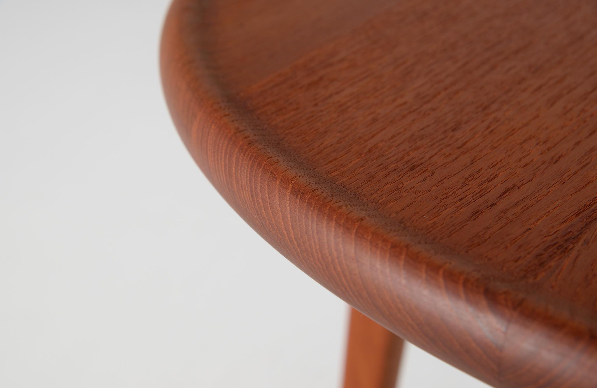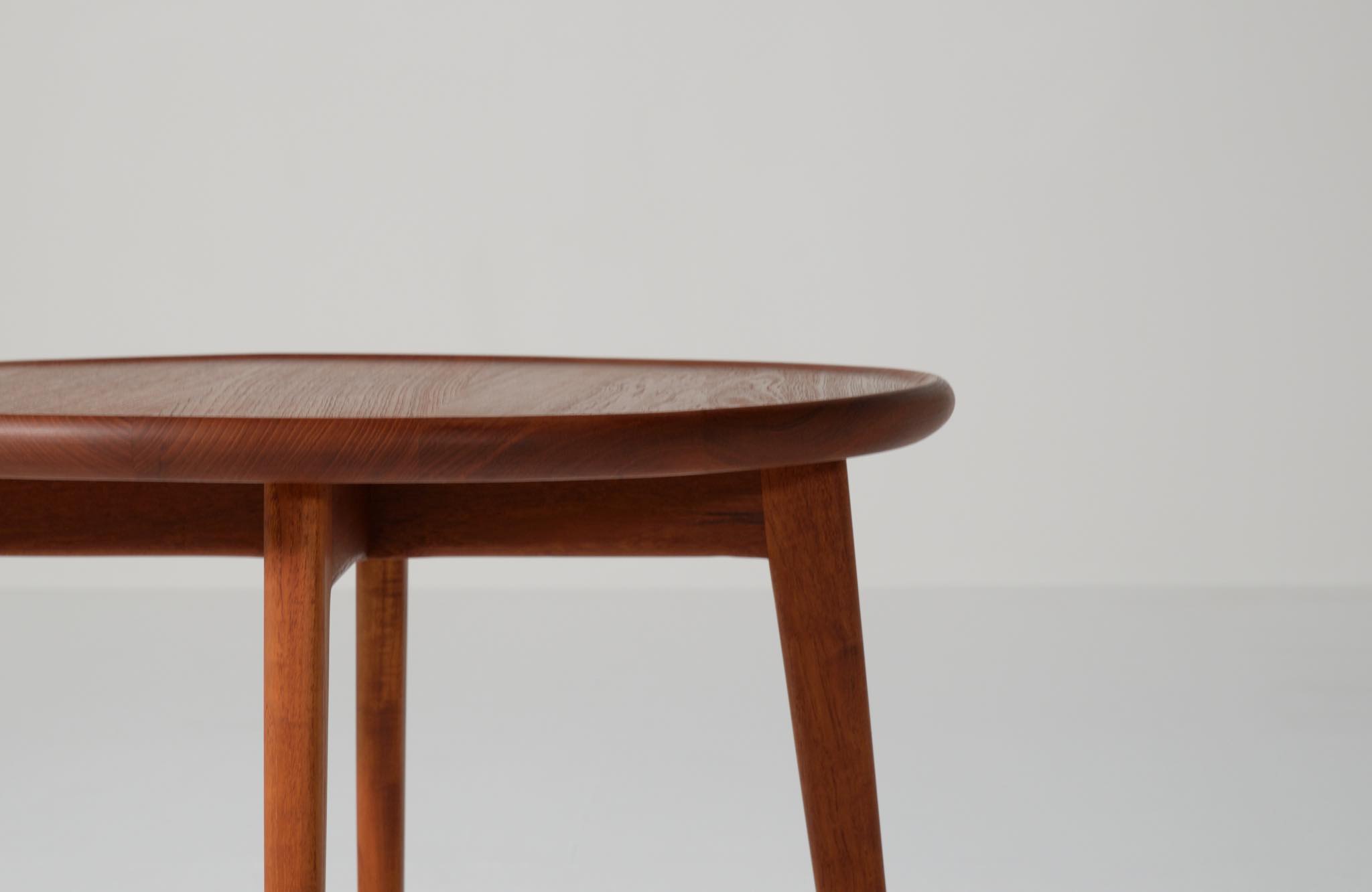 チークの無垢材が魅力のラウンドテーブルです。ボーエ・モーエンセンなどの作品を手掛けたSøborg Møblerによって作られたもので、タイ原産と思しき良質なチークの質感を楽しめます。タイ原産のチークは中でも最上とされ、1950年代の終わりに木材の出荷をタイ政府によって規制されたと云われています。チーク材が育つための土壌や、毎年安定した雨量や、季節の寒暖差によって、木目の肌理や、年毎に重ねてゆく年輪が綺麗に揃うようです。