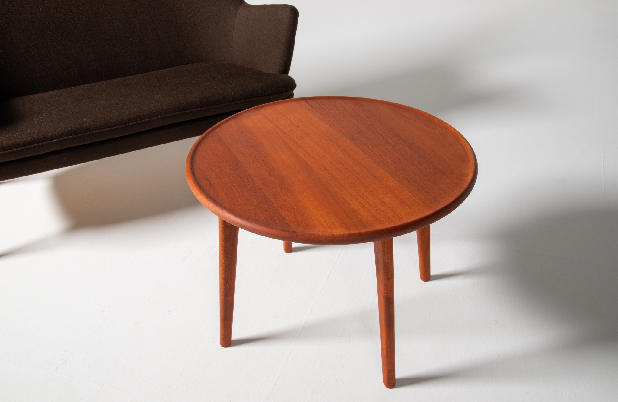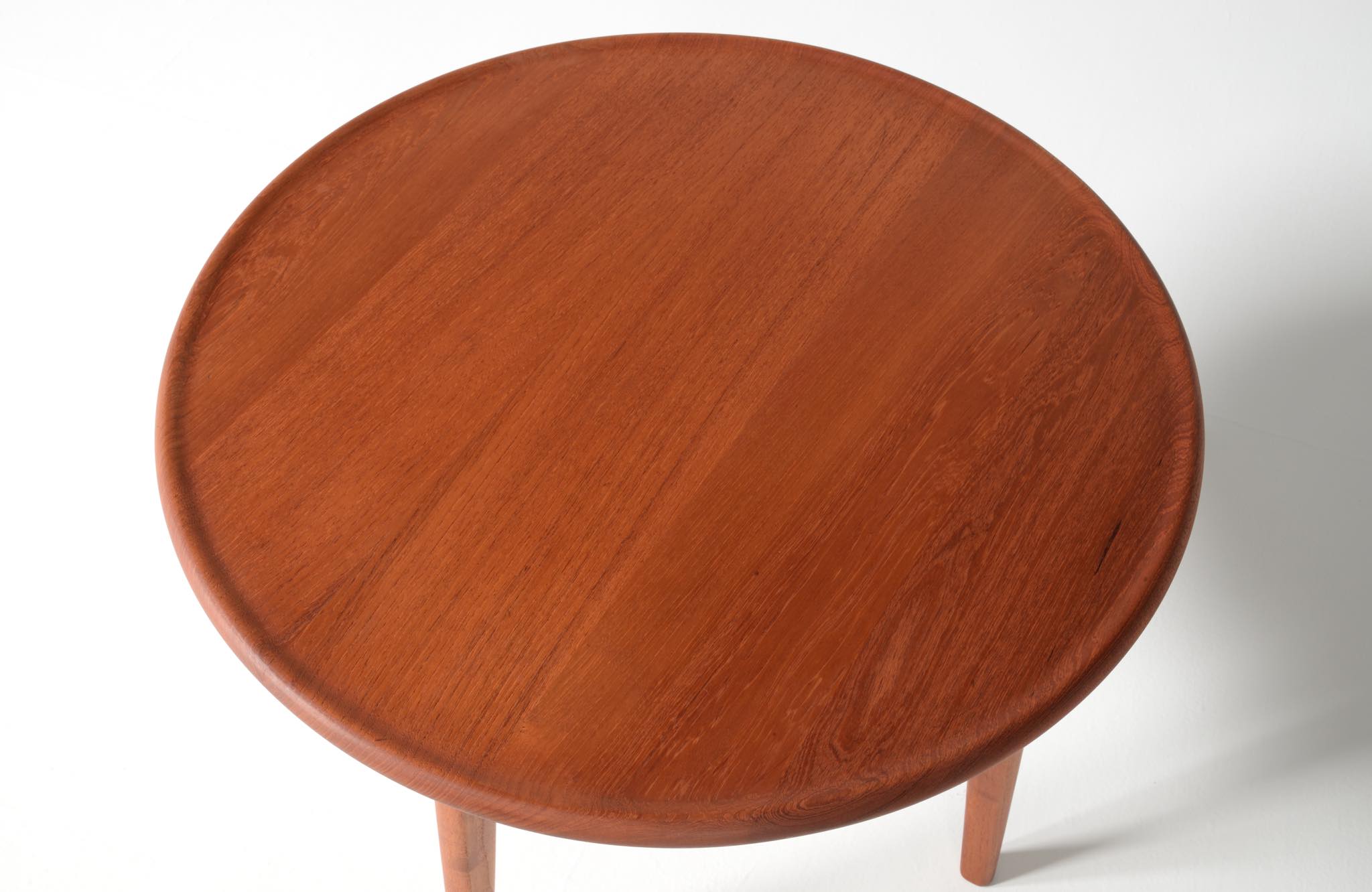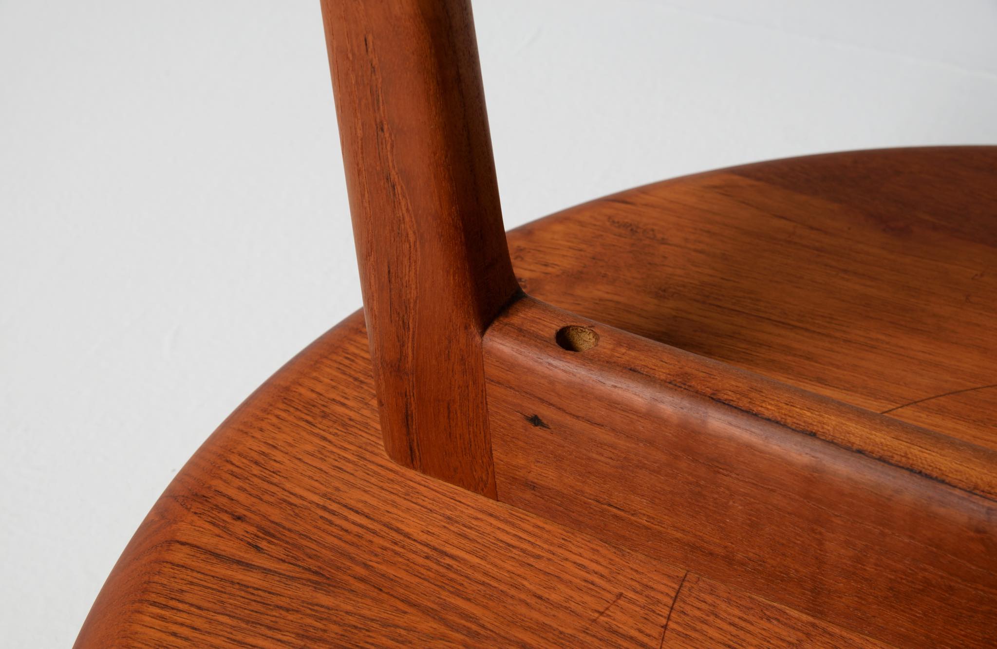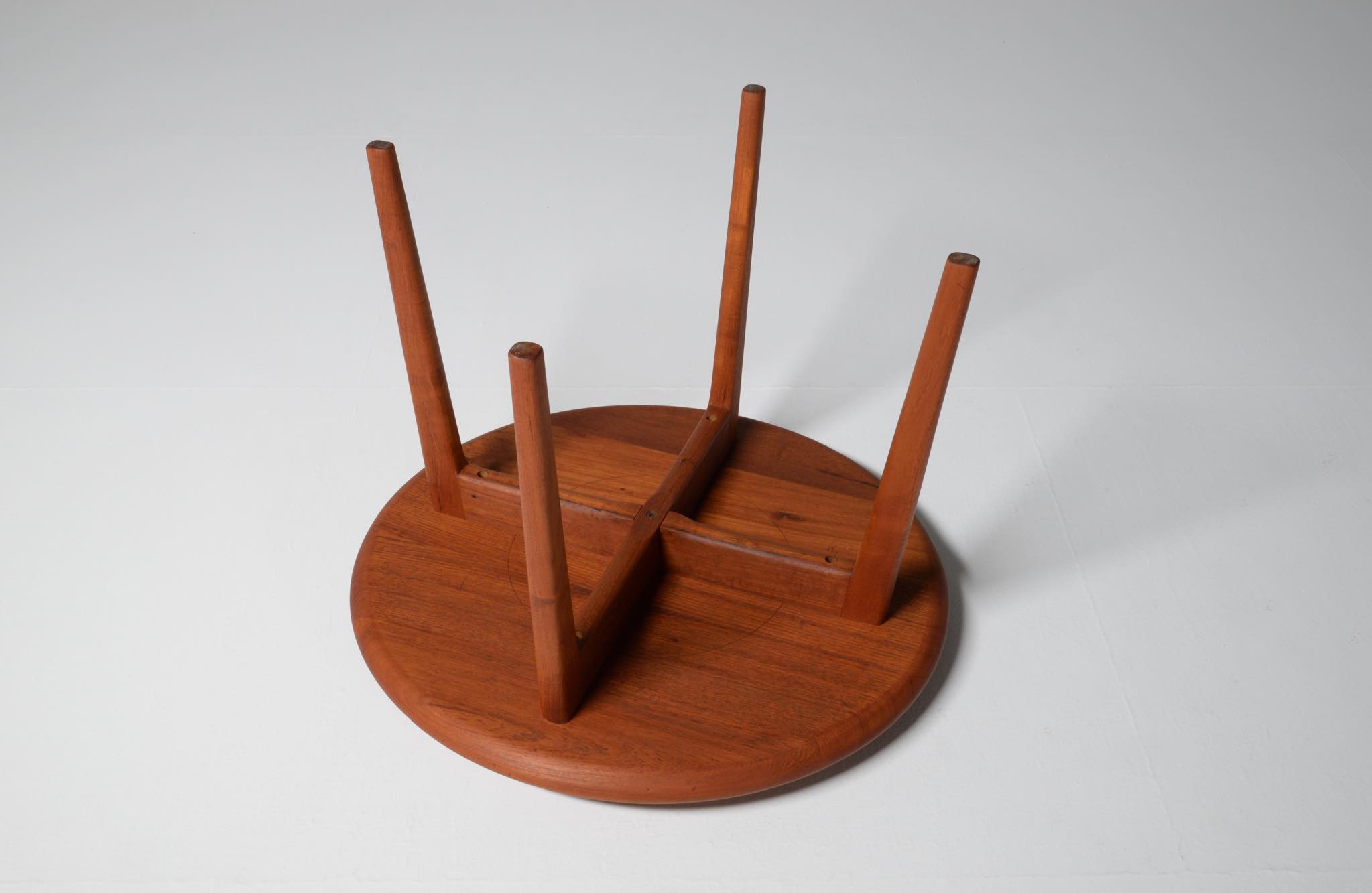 チークの無垢材が魅力のラウンドテーブルです。ボーエ・モーエンセンなどの作品を手掛けたSøborg Møblerによって作られたもので、タイ原産と思しき良質なチークの質感を楽しめます。タイ原産のチークは中でも最上とされ、1950年代の終わりに木材の出荷をタイ政府によって規制されたと云われています。チーク材が育つための土壌や、毎年安定した雨量や、季節の寒暖差によって、木目の肌理や、年毎に重ねてゆく年輪が綺麗に揃うようです。