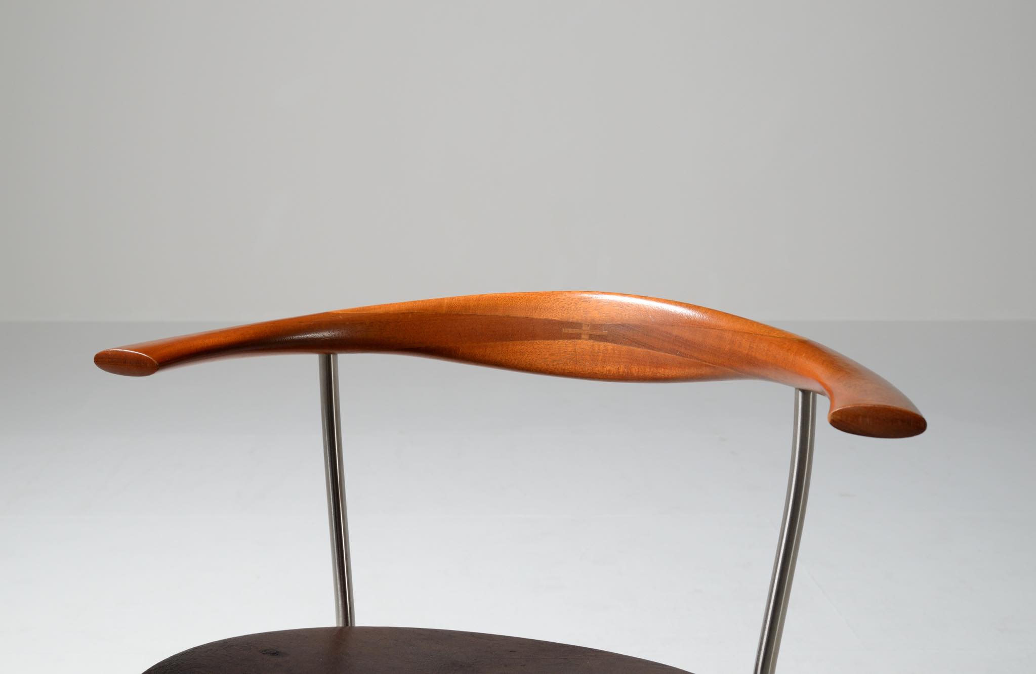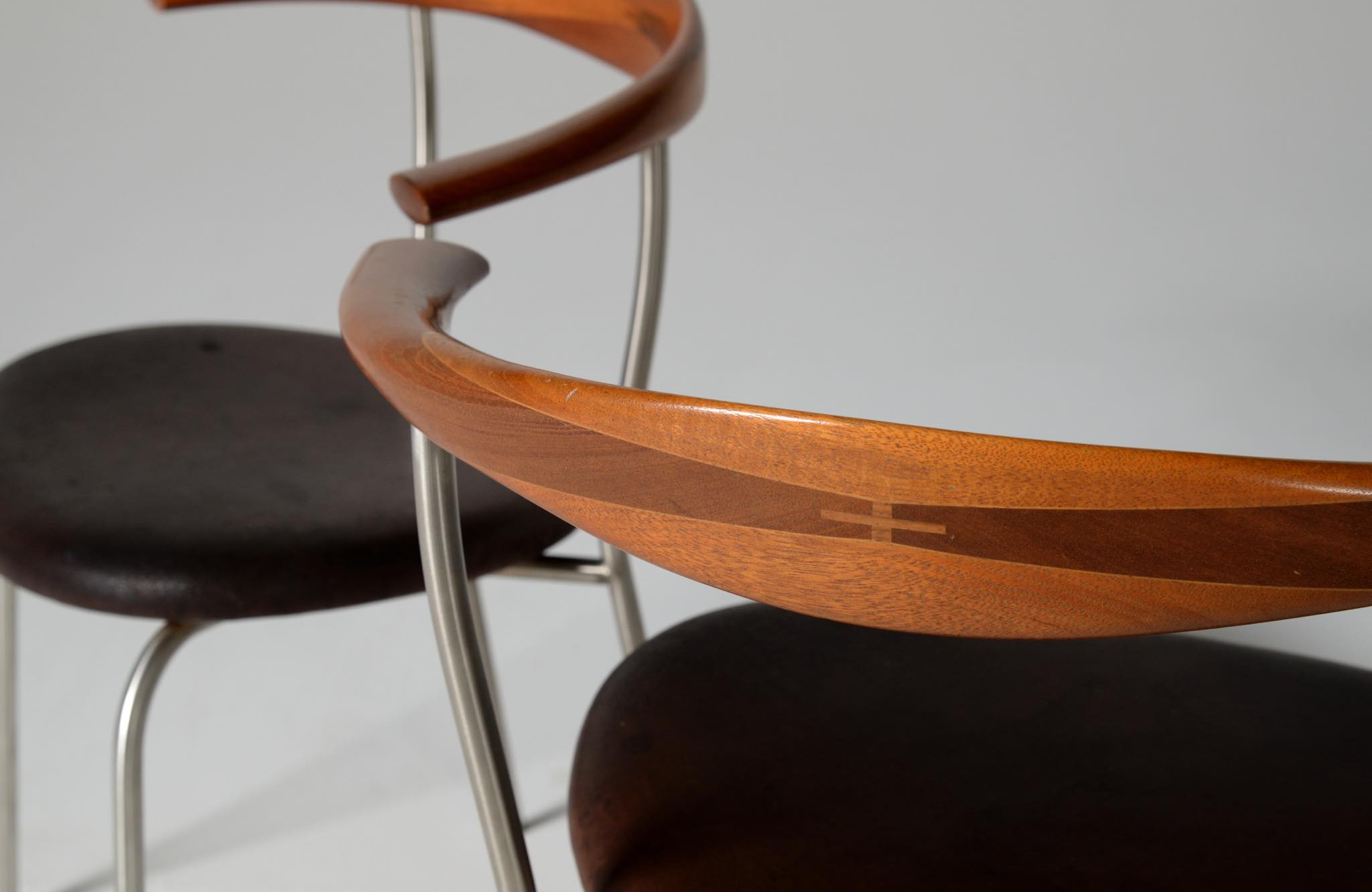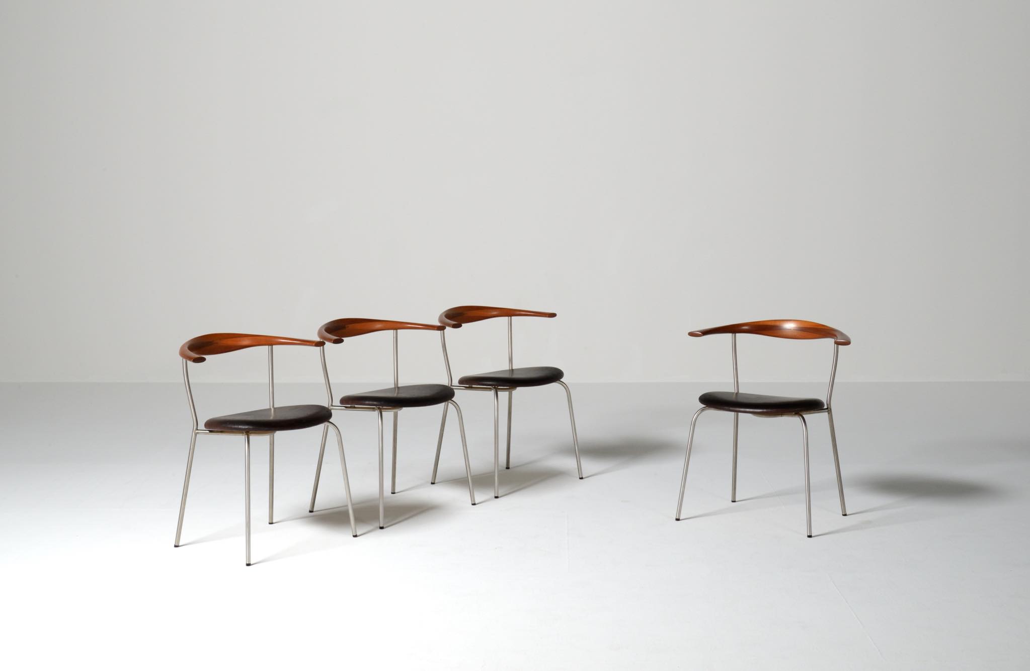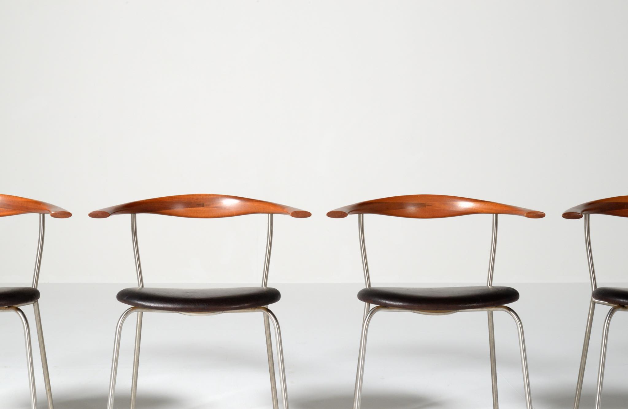 デンマークを代表する家具デザイナー、Hans J. Wegner/ハンス・ウェグナーによる ”PP701"ダイニングチェア、4脚セットです。2002年にPPモブラー社にて作られたもので、マホガニー材のタイプです。PP701の笠木の削り出しは、2000年初頭頃までは手加工で行われ、その後はNCルーターで効率化が図られたようです。こちらのセットは手加工の頃のものとされています。
