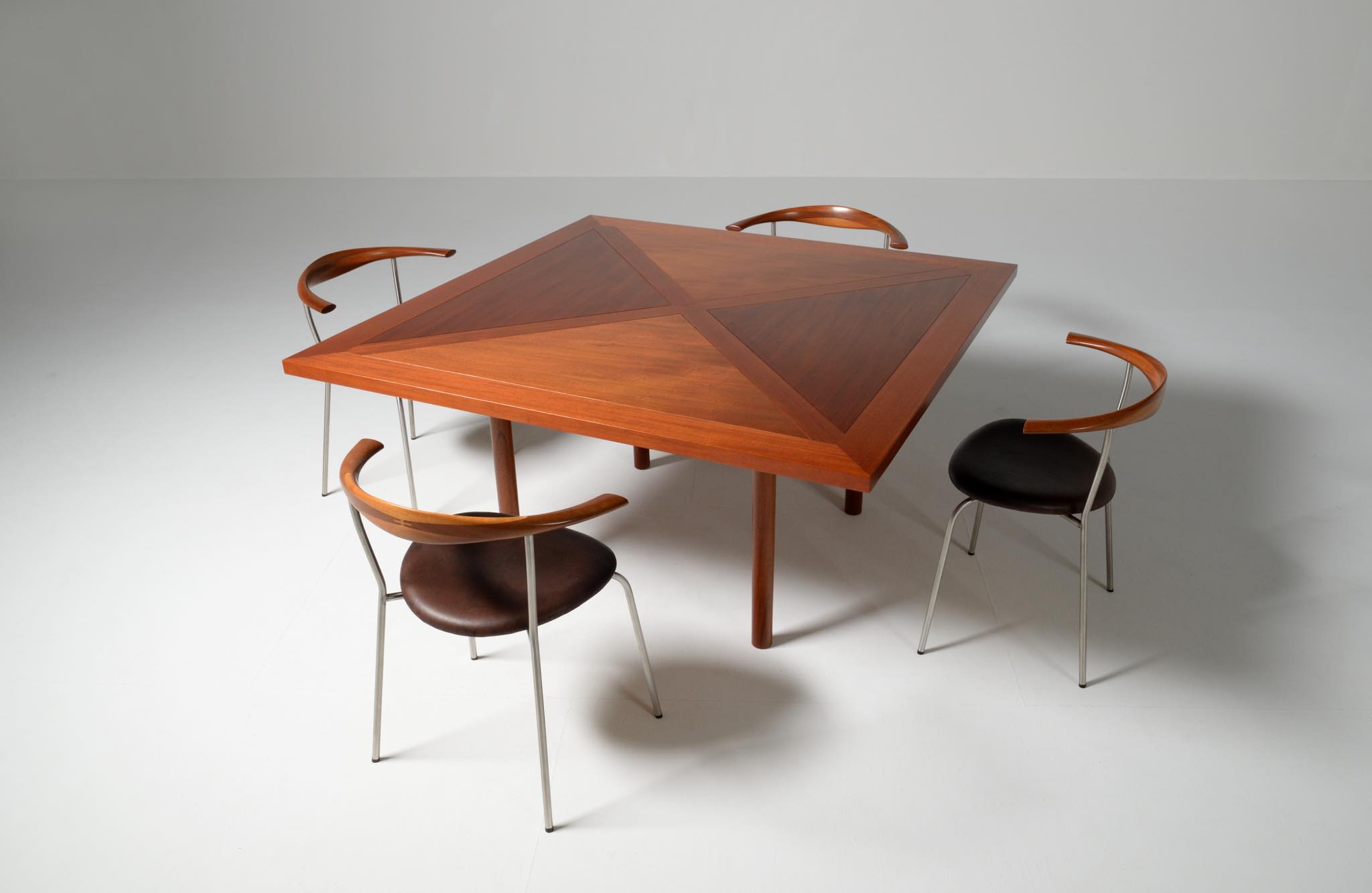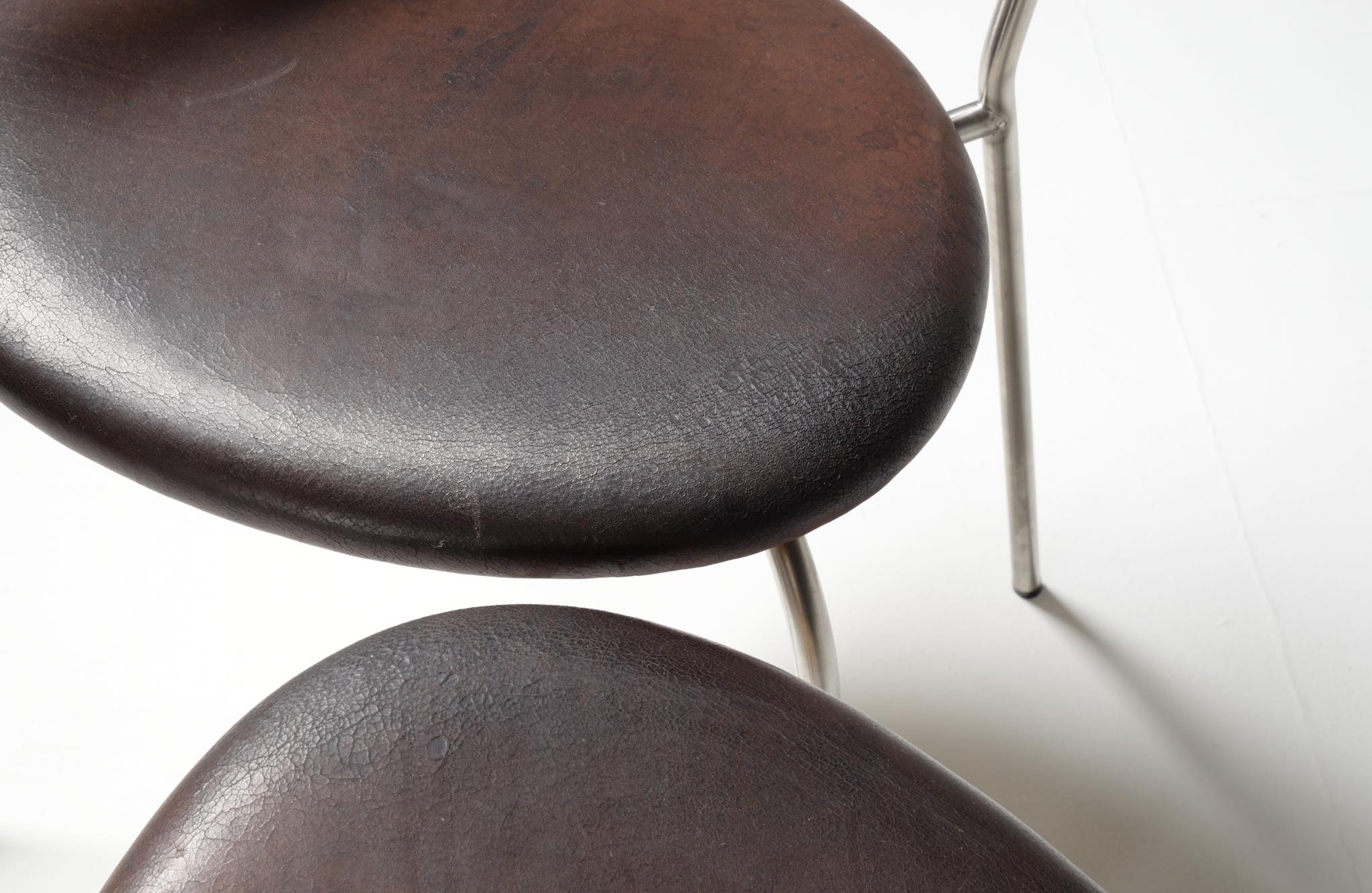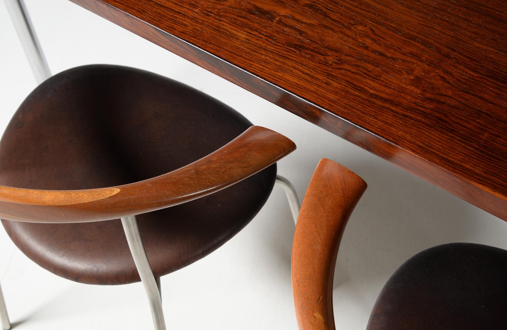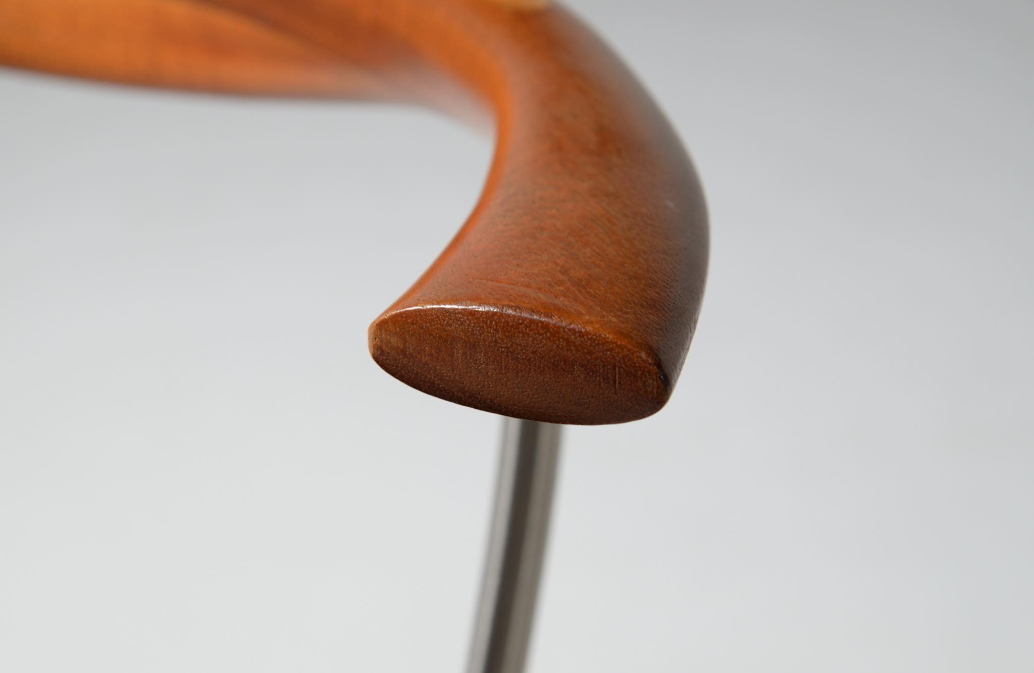 デンマークを代表する家具デザイナー、Hans J. Wegner/ハンス・ウェグナーによる ”PP701"ダイニングチェア、4脚セットです。2002年にPPモブラー社にて作られたもので、マホガニー材のタイプです。PP701の笠木の削り出しは、2000年初頭頃までは手加工で行われ、その後はNCルーターで効率化が図られたようです。こちらのセットは手加工の頃のものとされています。