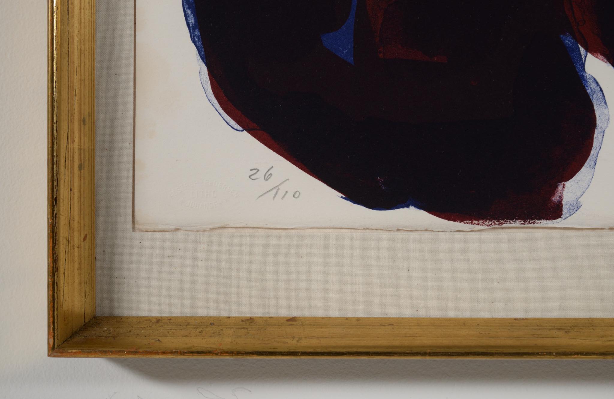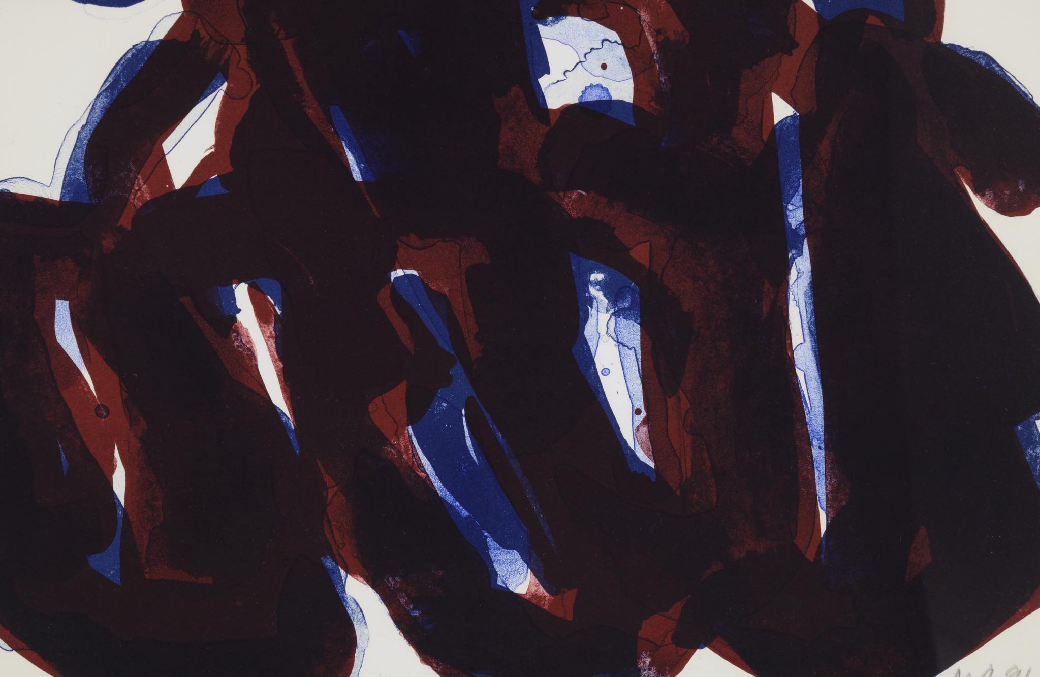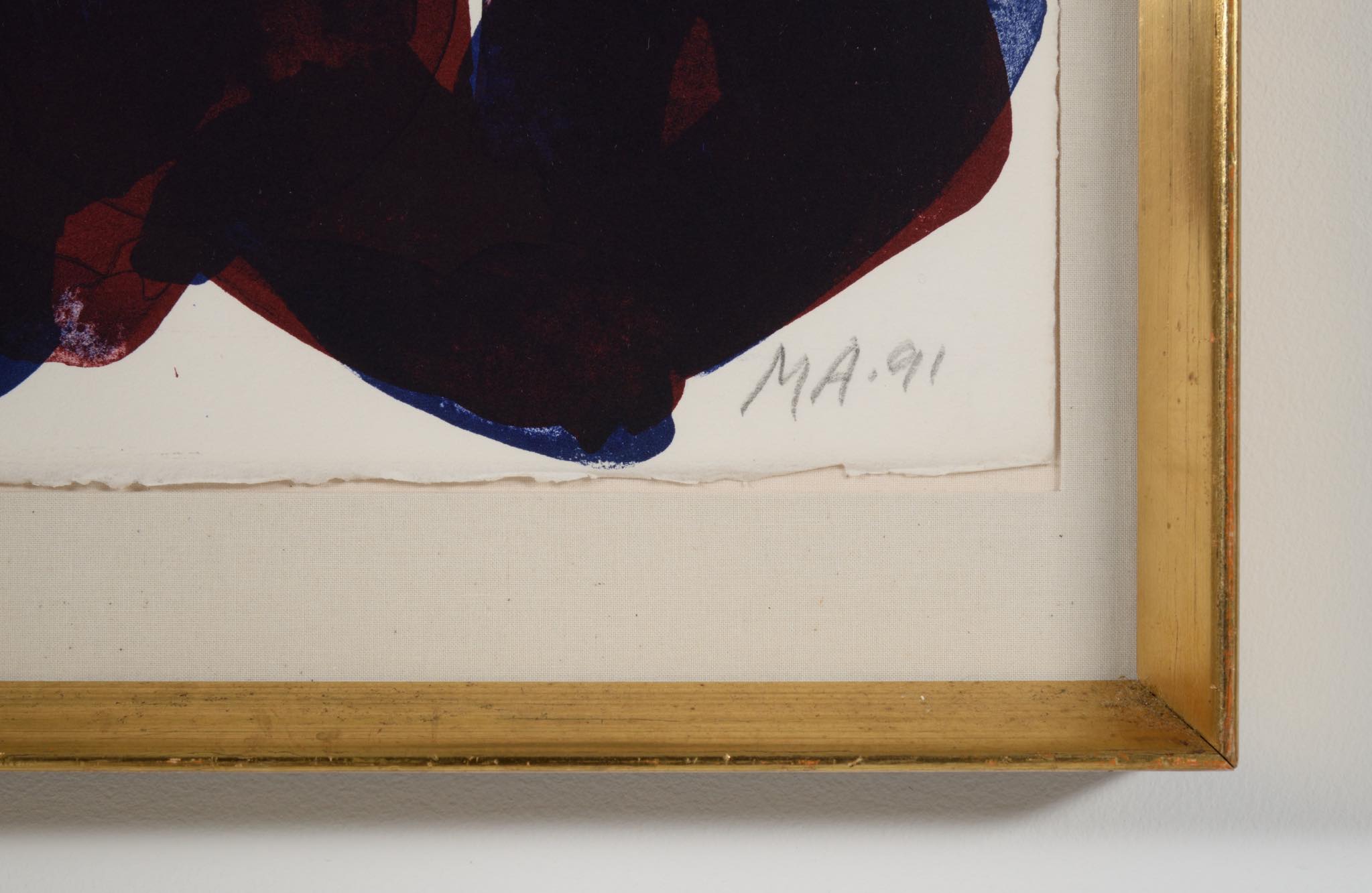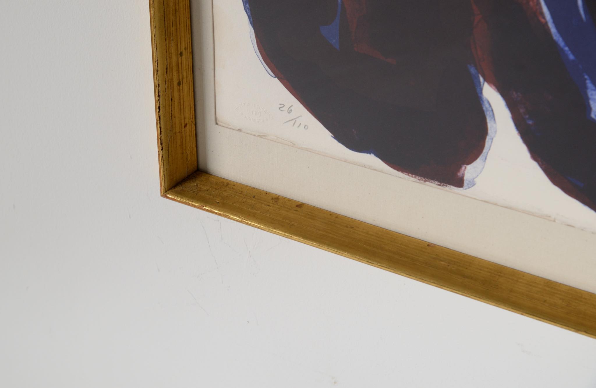20世紀に活躍したデンマークの芸術家、モーエンス・アナセンによるリトグラフ作品、1991年に制作されたものです。太くダイナミックなストロークで描かれた抽象的な作風は独自の世界観を表現しています。黒色をベースに青色と土留色を背後に重ねた表現で、飾りやすいサイズ感の作品です。金箔のフレームはオリジナルで、布被せのマットを新調して整えました。コンディションは良好です。