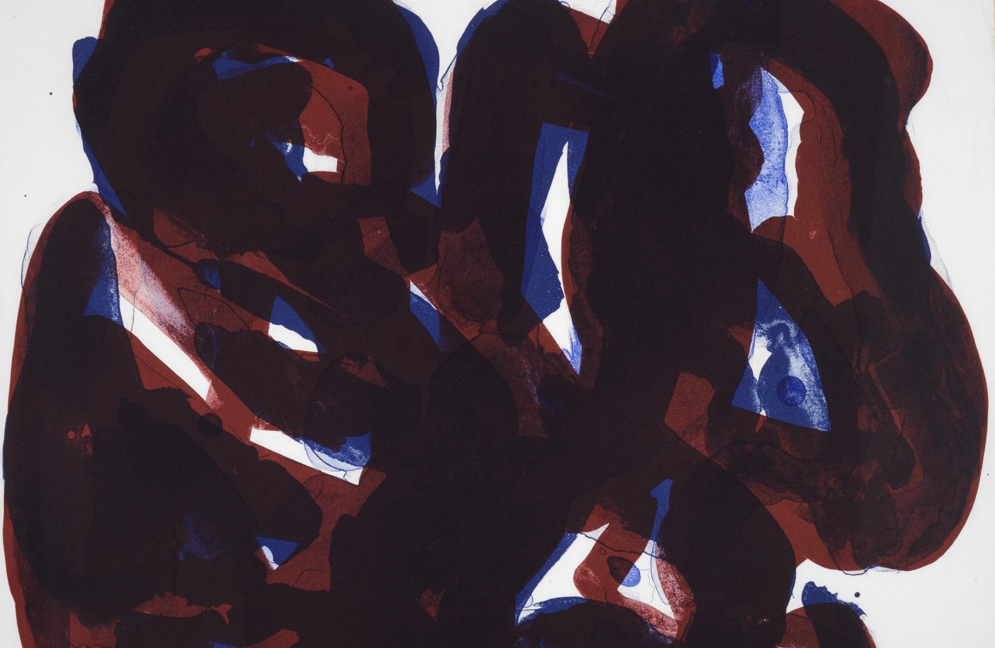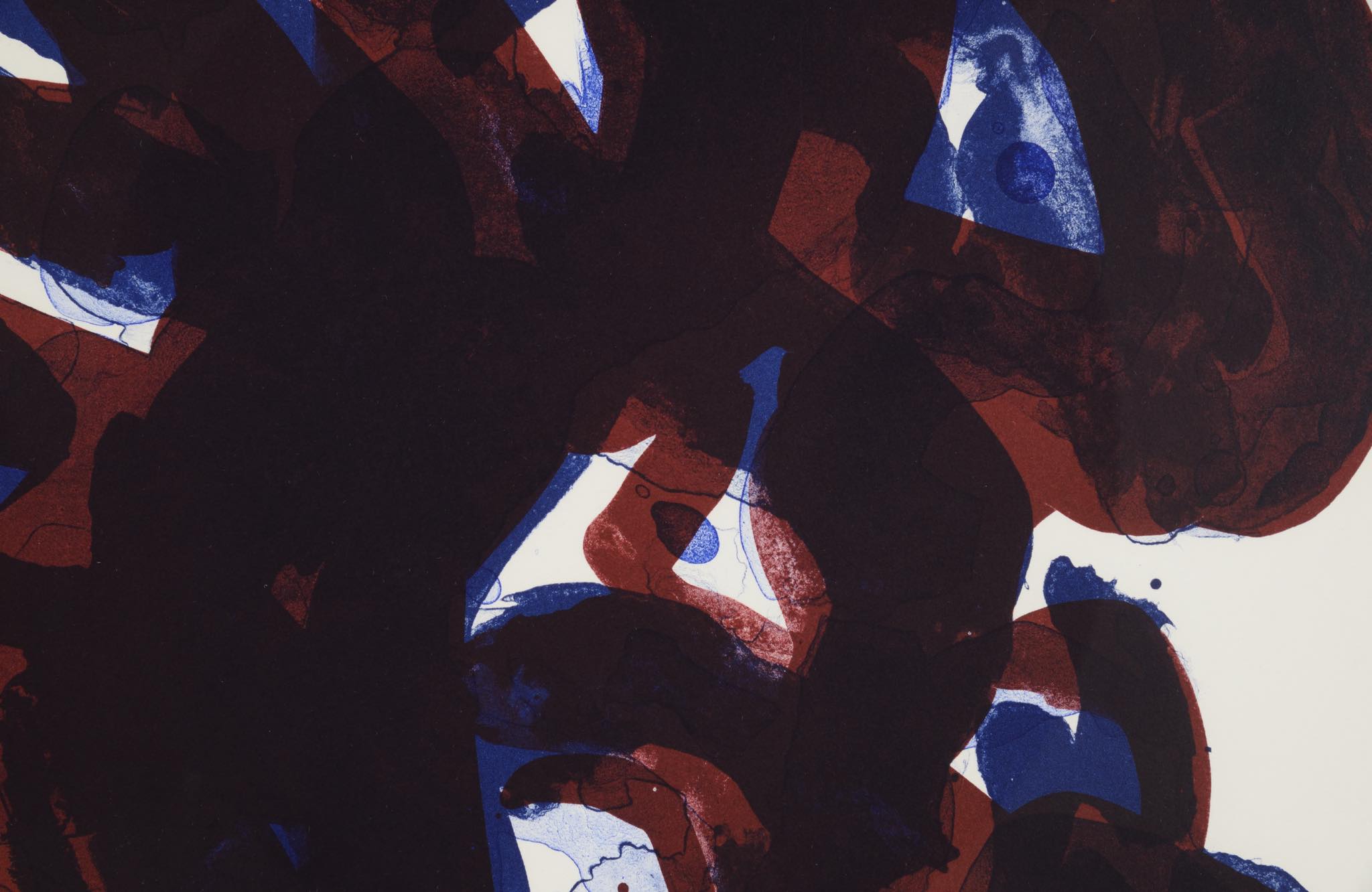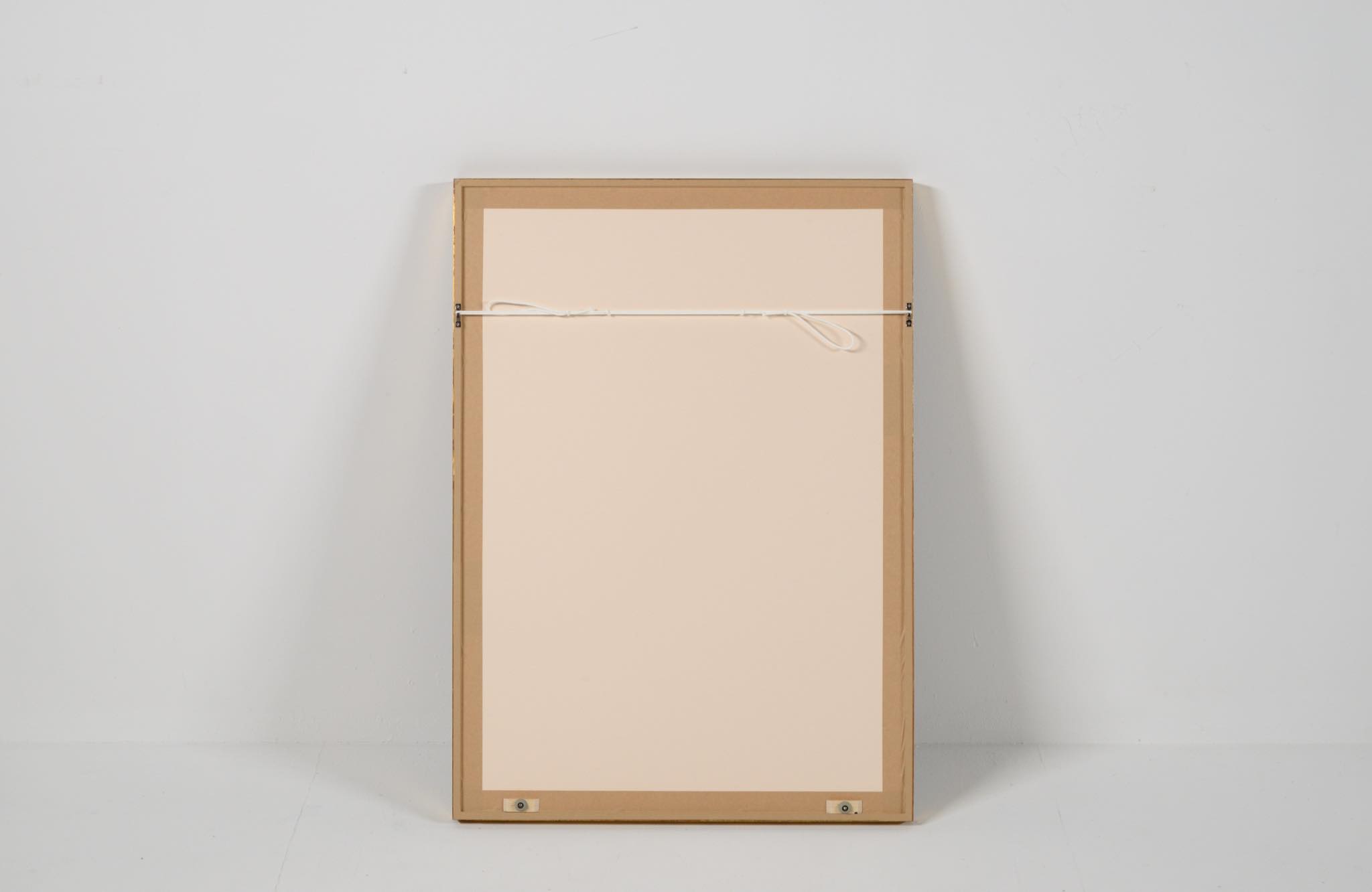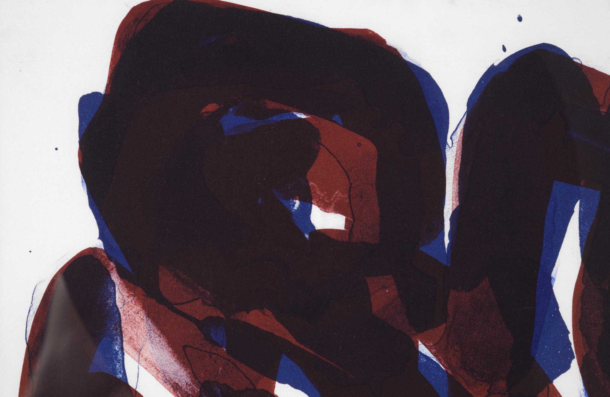 20世紀に活躍したデンマークの芸術家、モーエンス・アナセンによるリトグラフ作品、1991年に制作されたものです。太くダイナミックなストロークで描かれた抽象的な作風は独自の世界観を表現しています。黒色をベースに青色と土留色を背後に重ねた表現で、飾りやすいサイズ感の作品です。金箔のフレームはオリジナルで、布被せのマットを新調して整えました。コンディションは良好です。