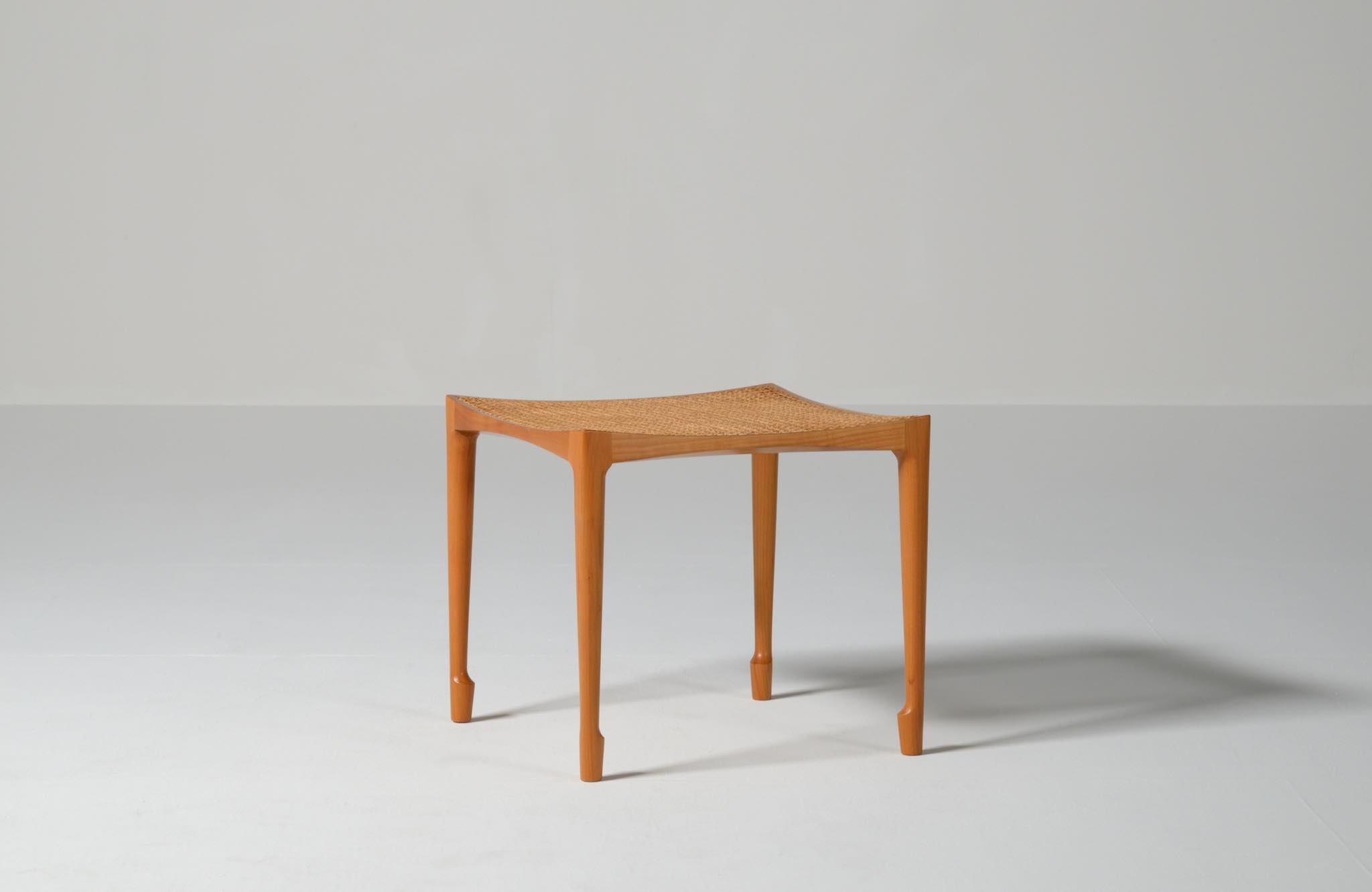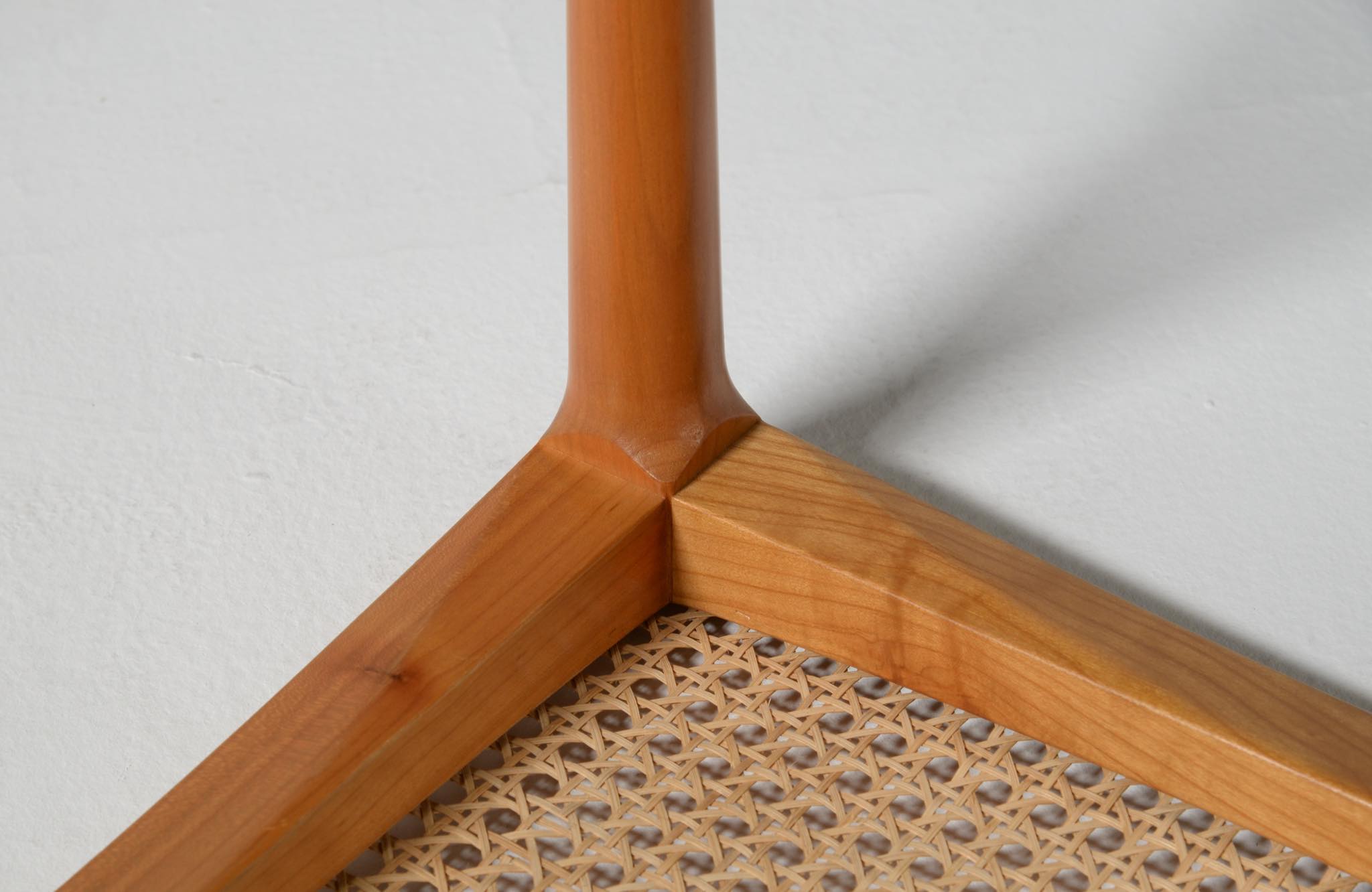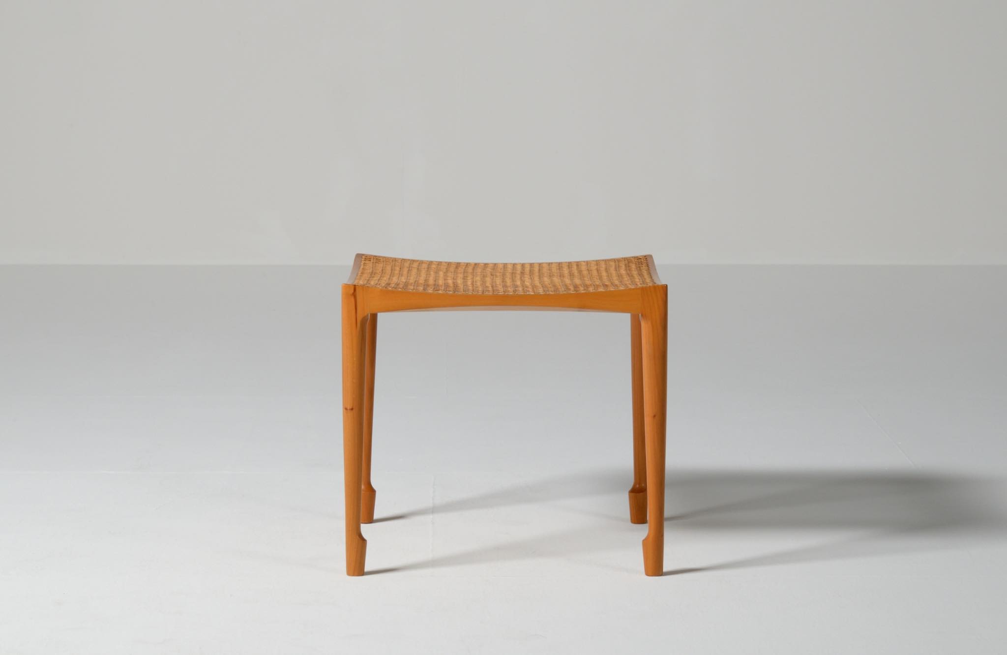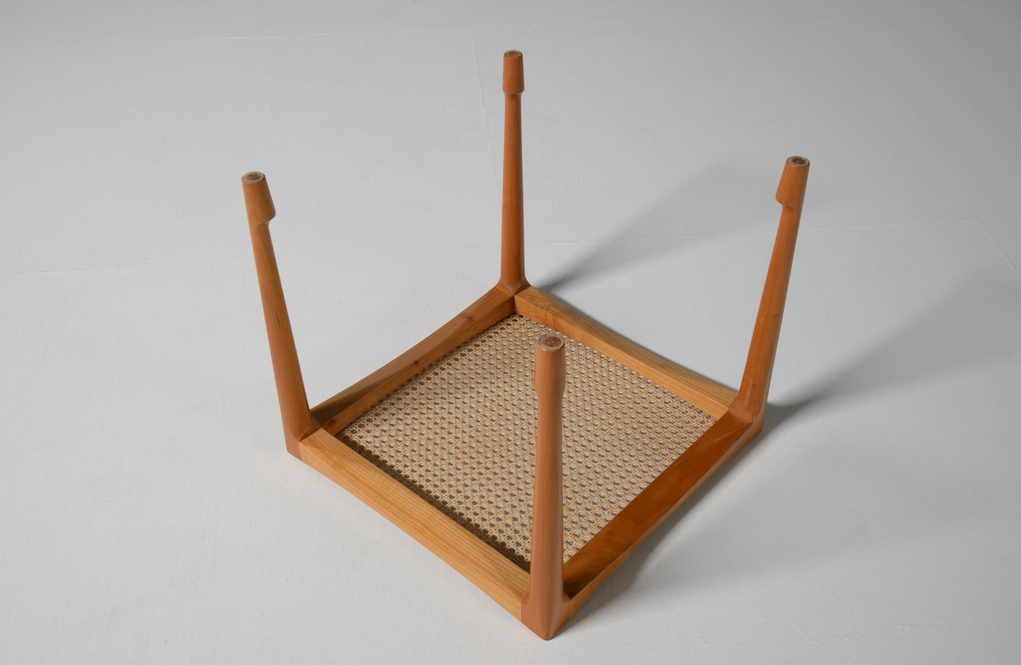デンマークの家具デザイナー、Bernt/ベアントによる代表作のスツールです。卒業制作で発表し高評価を得た作品として知られています。近年まで Rud. Rasmussen工房にて作られていましたが、こちらのスツールは初期の工房の Wørtz Møbelsnedkeriにて、1960年代頃に作られたものとされています。無垢のチェリー材が用いられており、籐張りの劣化も無さそうです。綺麗な状態です。