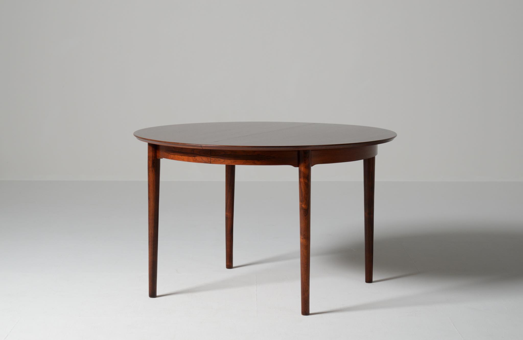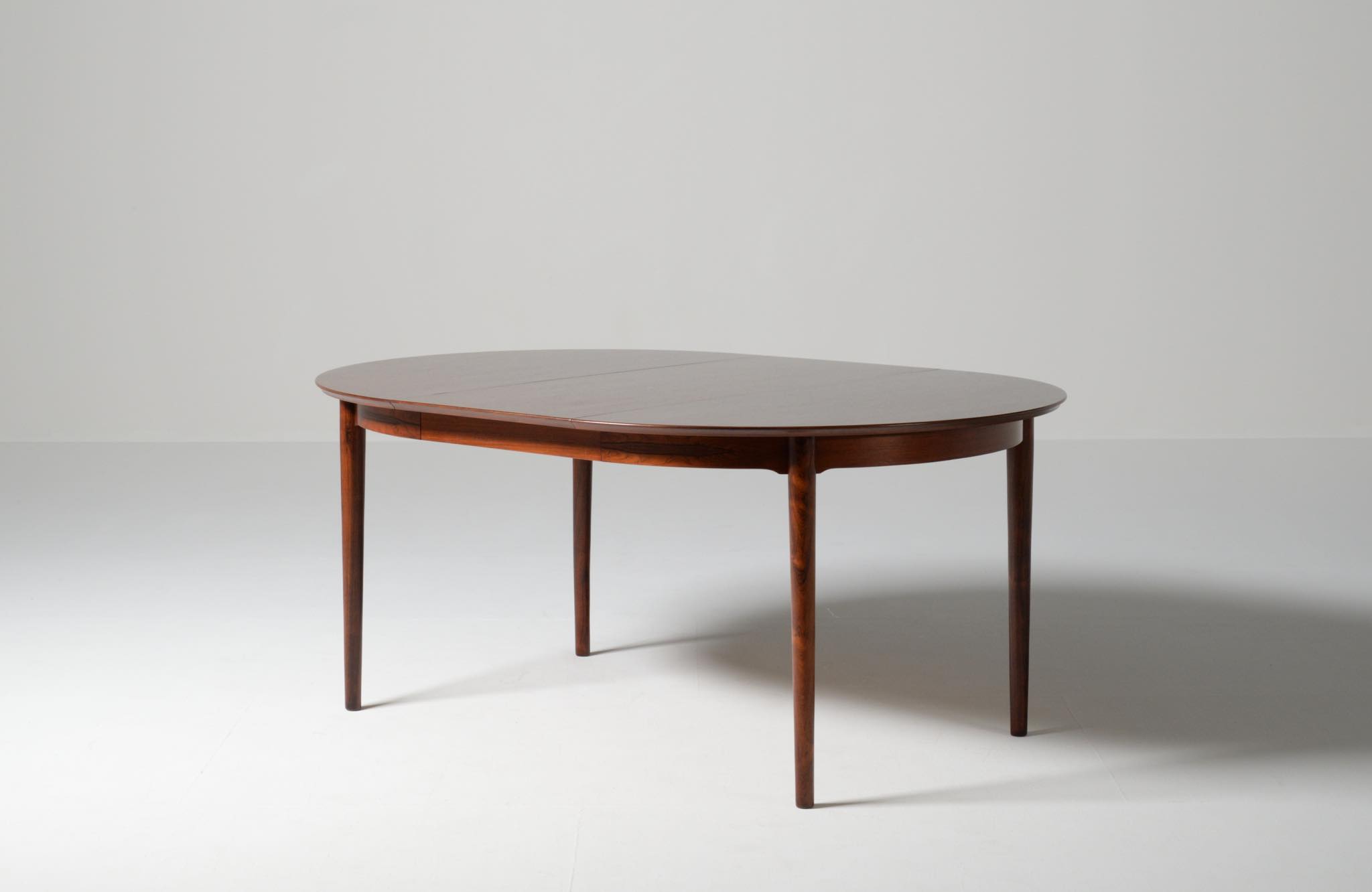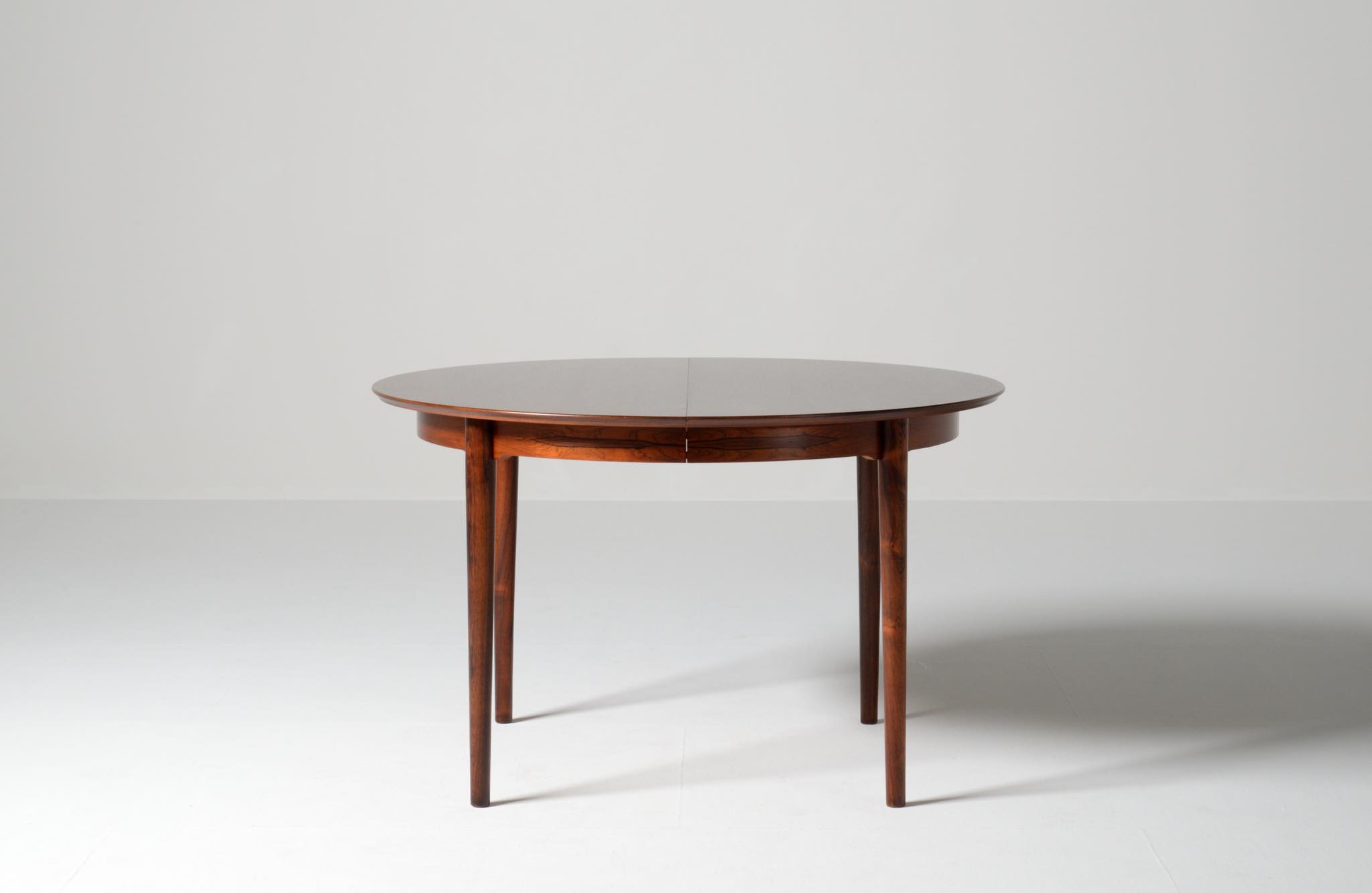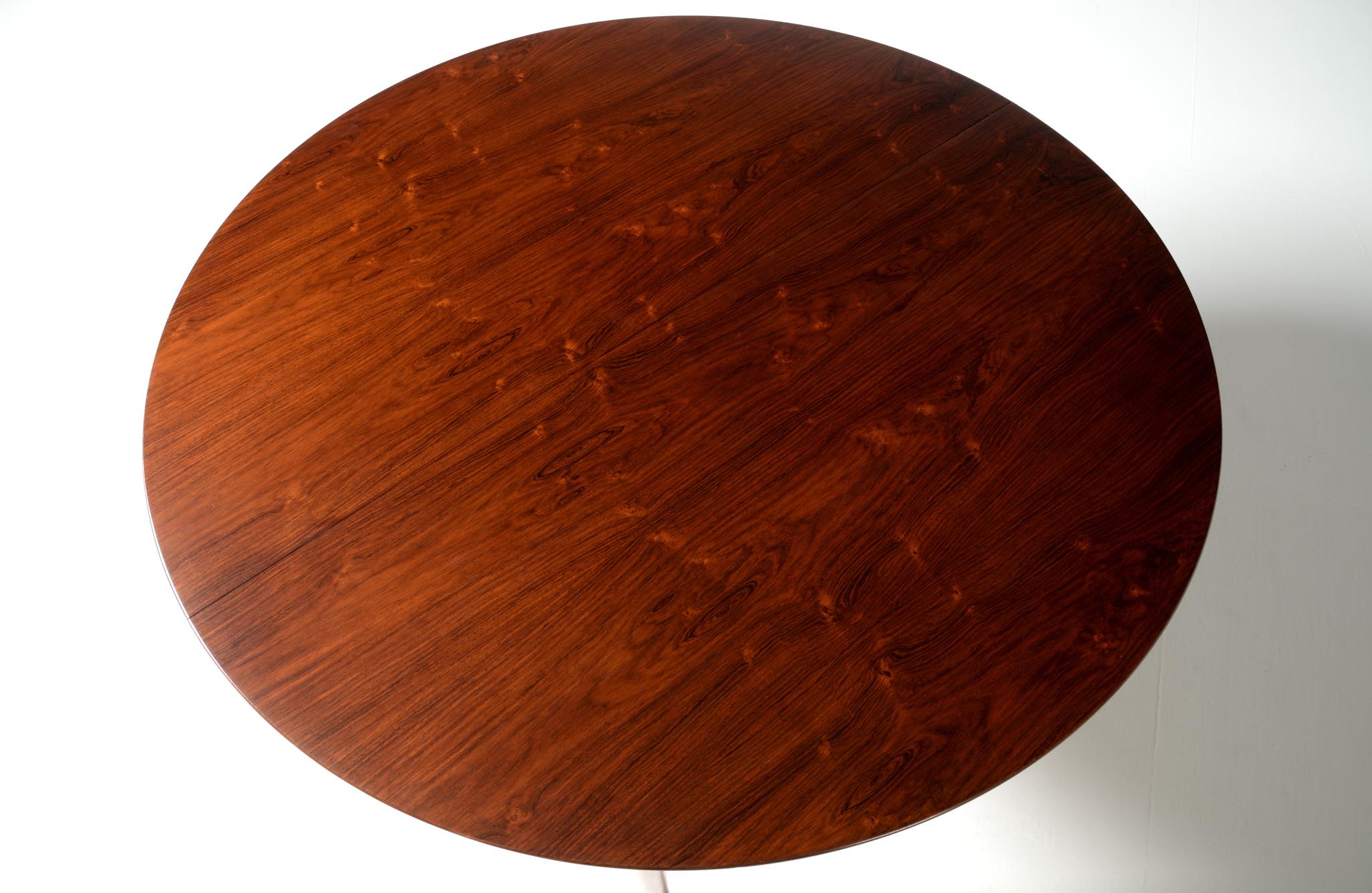 デンマークの家具工房、Helge Sibast/ヘルエ・シバストによるダイニングテーブルです。1960年代に作られたものでしょう。天板縁の作りと脚のデザインに特徴のあるモデルで、当時人気を博したようです。ブラジル原産と思しきローズウッド材が用いられており、板目で木取りされた細かな木目文様が現れています。エクステンションリーフは1枚備わり、天板の拡張が行えます。
