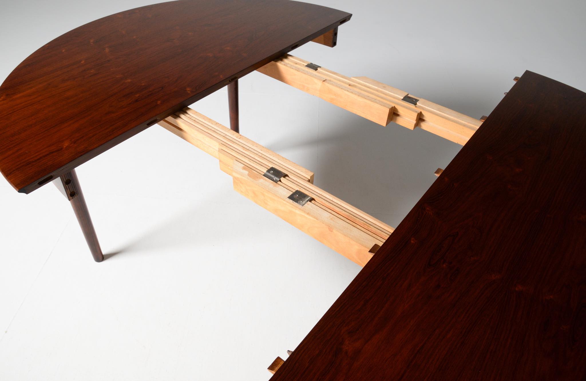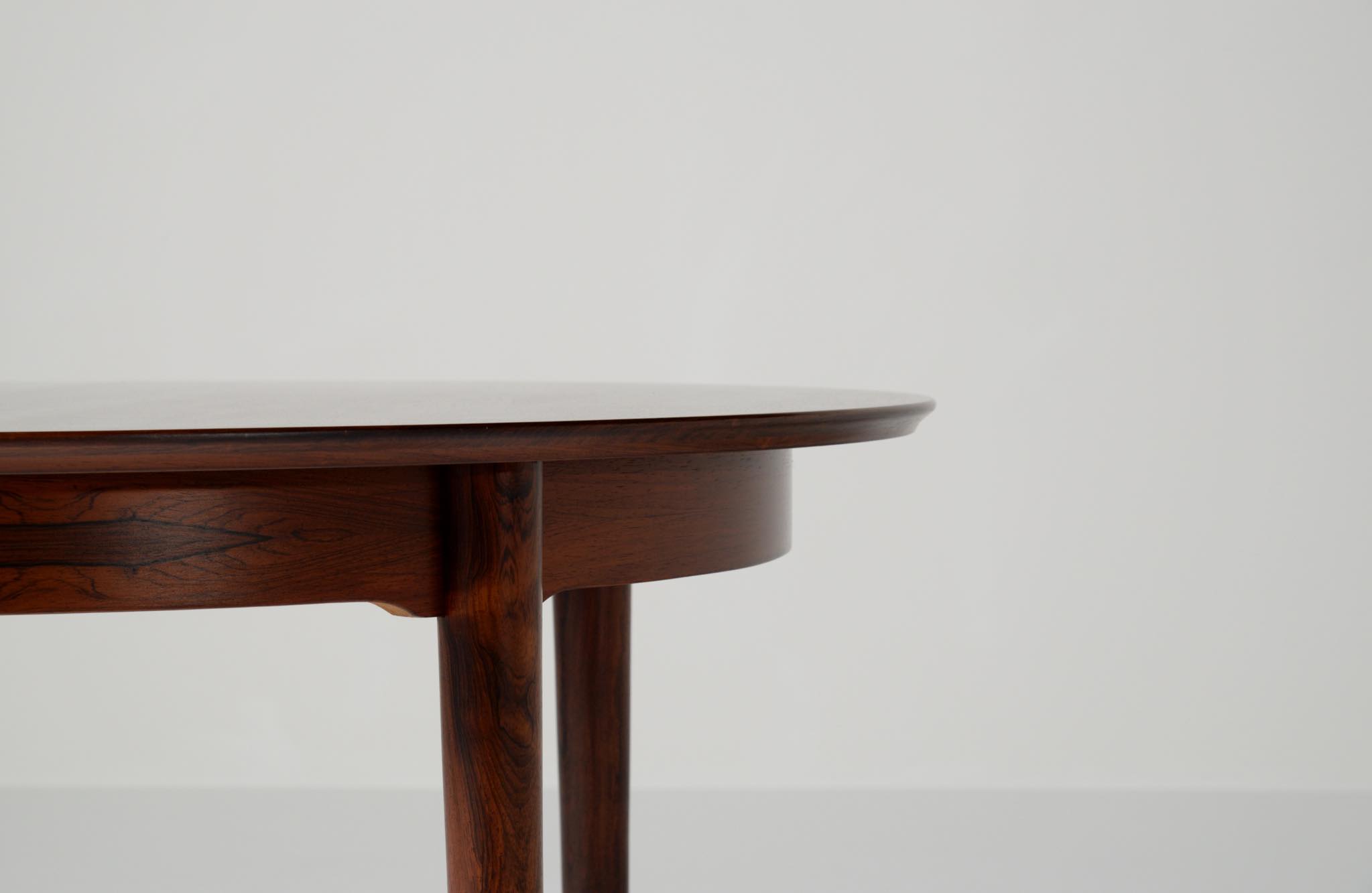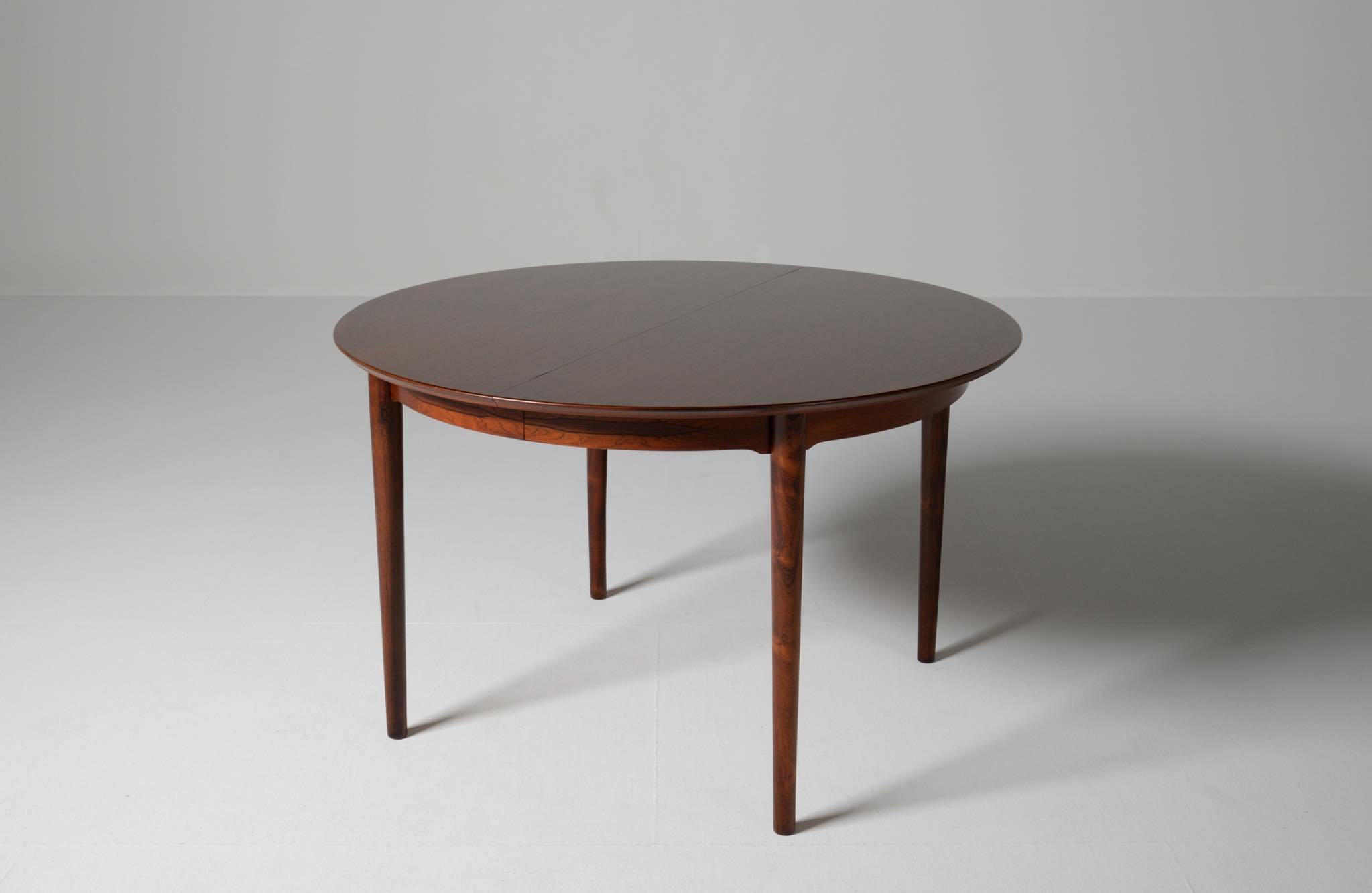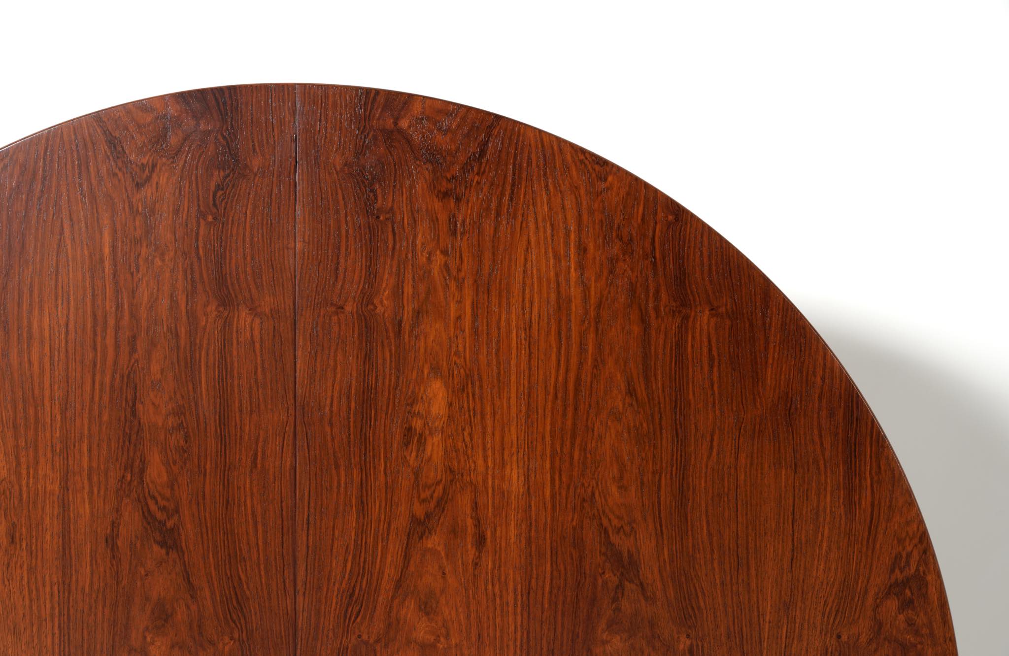 デンマークの家具工房、Helge Sibast/ヘルエ・シバストによるダイニングテーブルです。1960年代に作られたものでしょう。天板縁の作りと脚のデザインに特徴のあるモデルで、当時人気を博したようです。ブラジル原産と思しきローズウッド材が用いられており、板目で木取りされた細かな木目文様が現れています。エクステンションリーフは1枚備わり、天板の拡張が行えます。