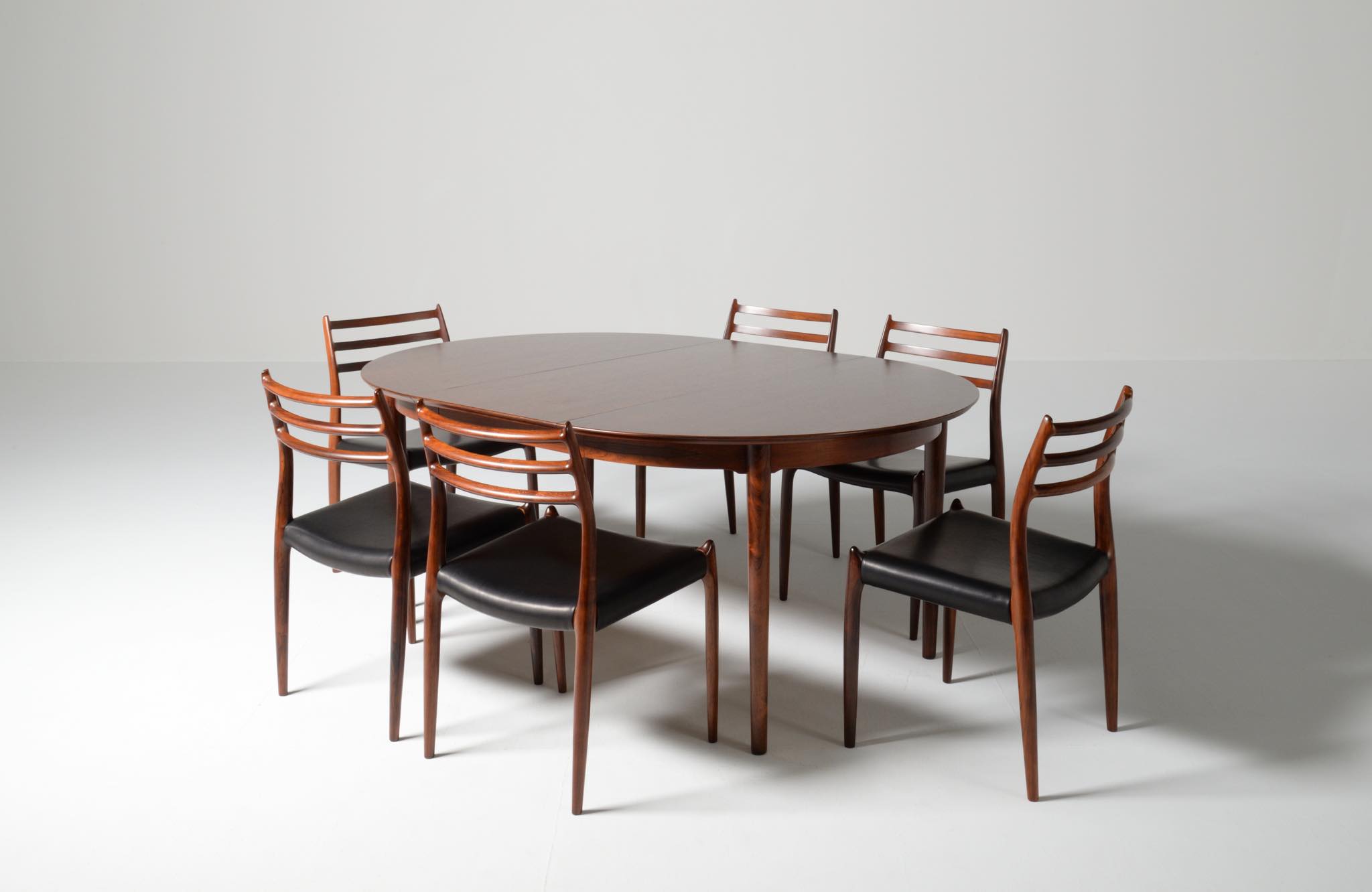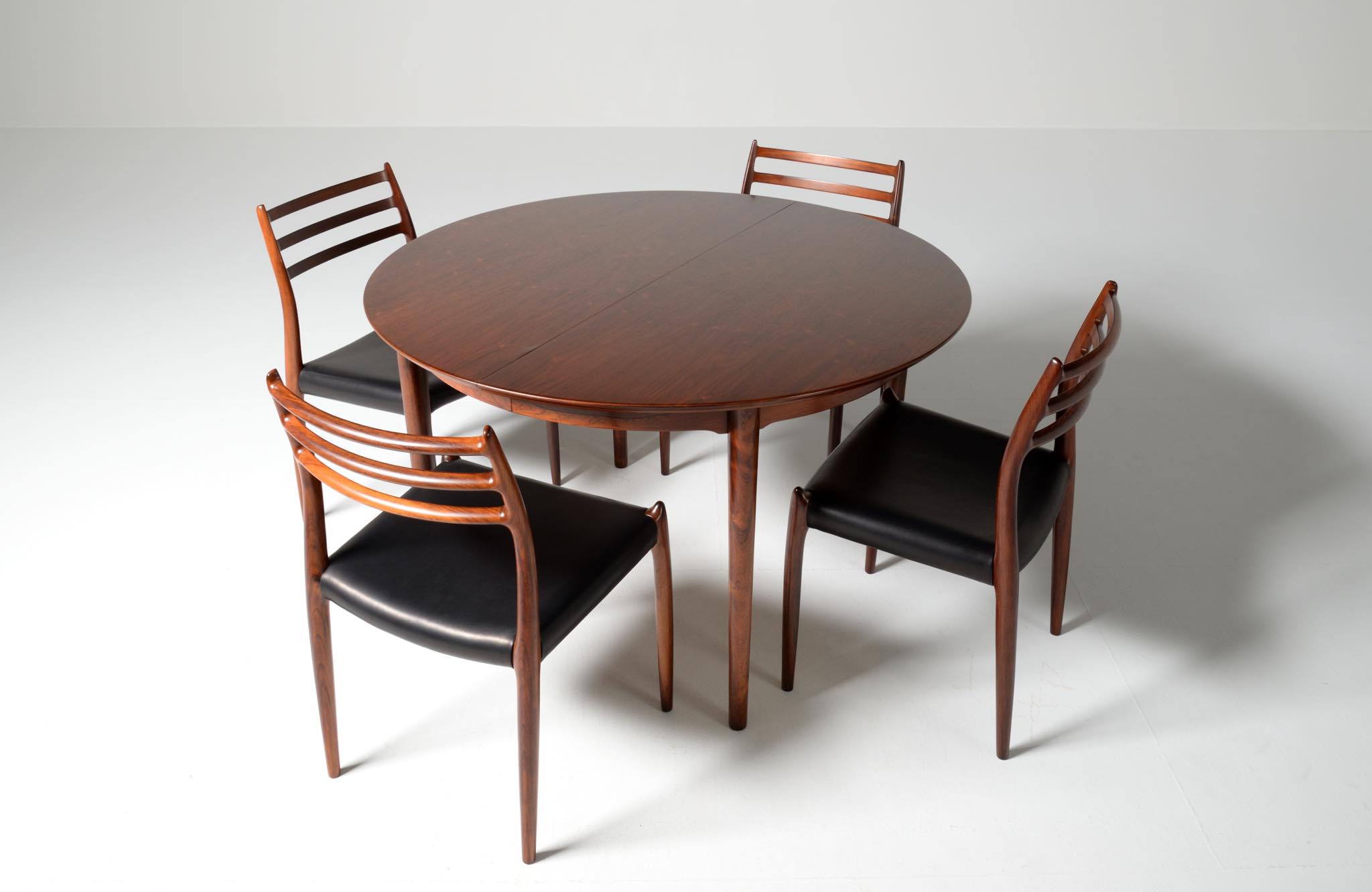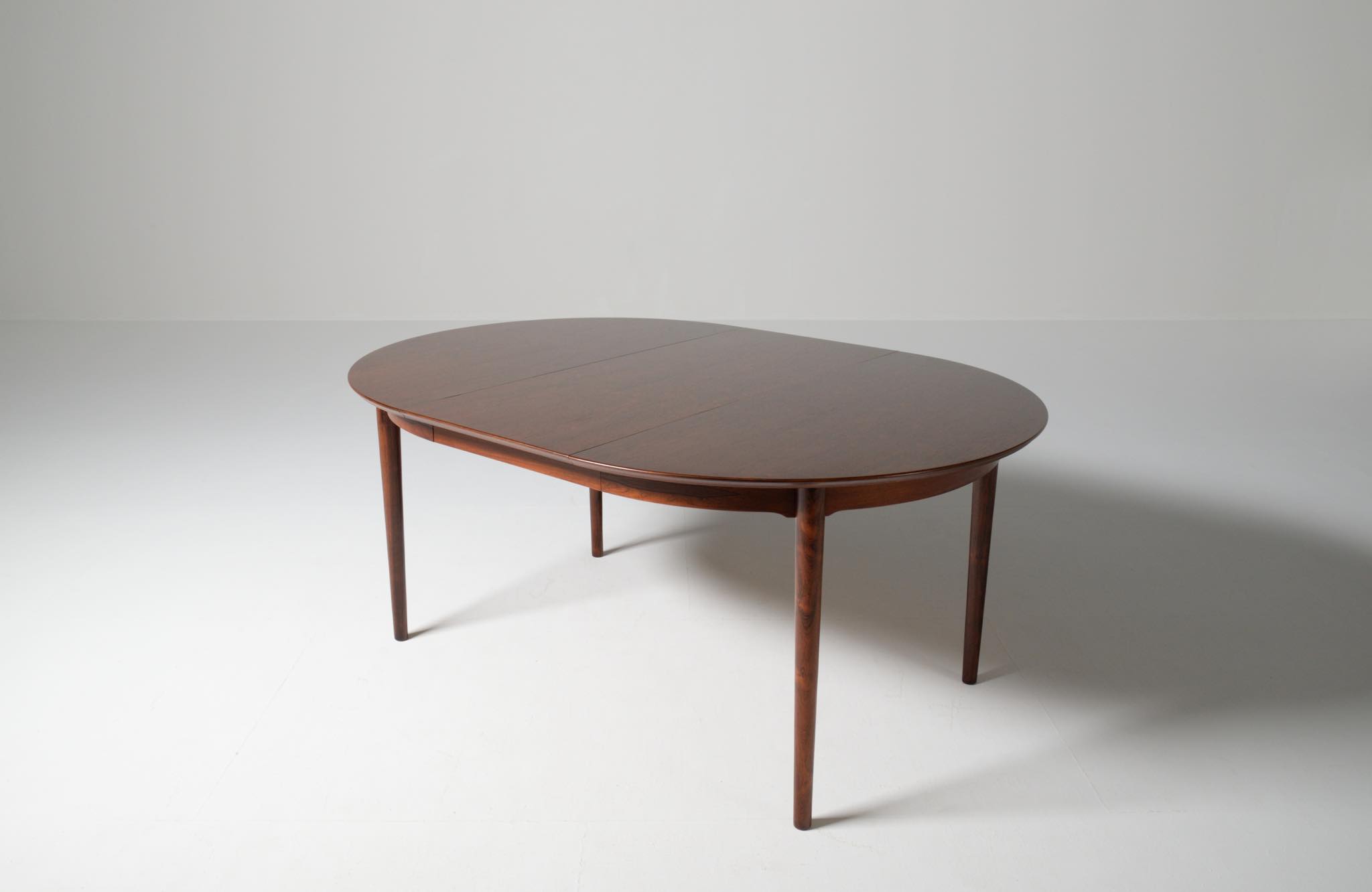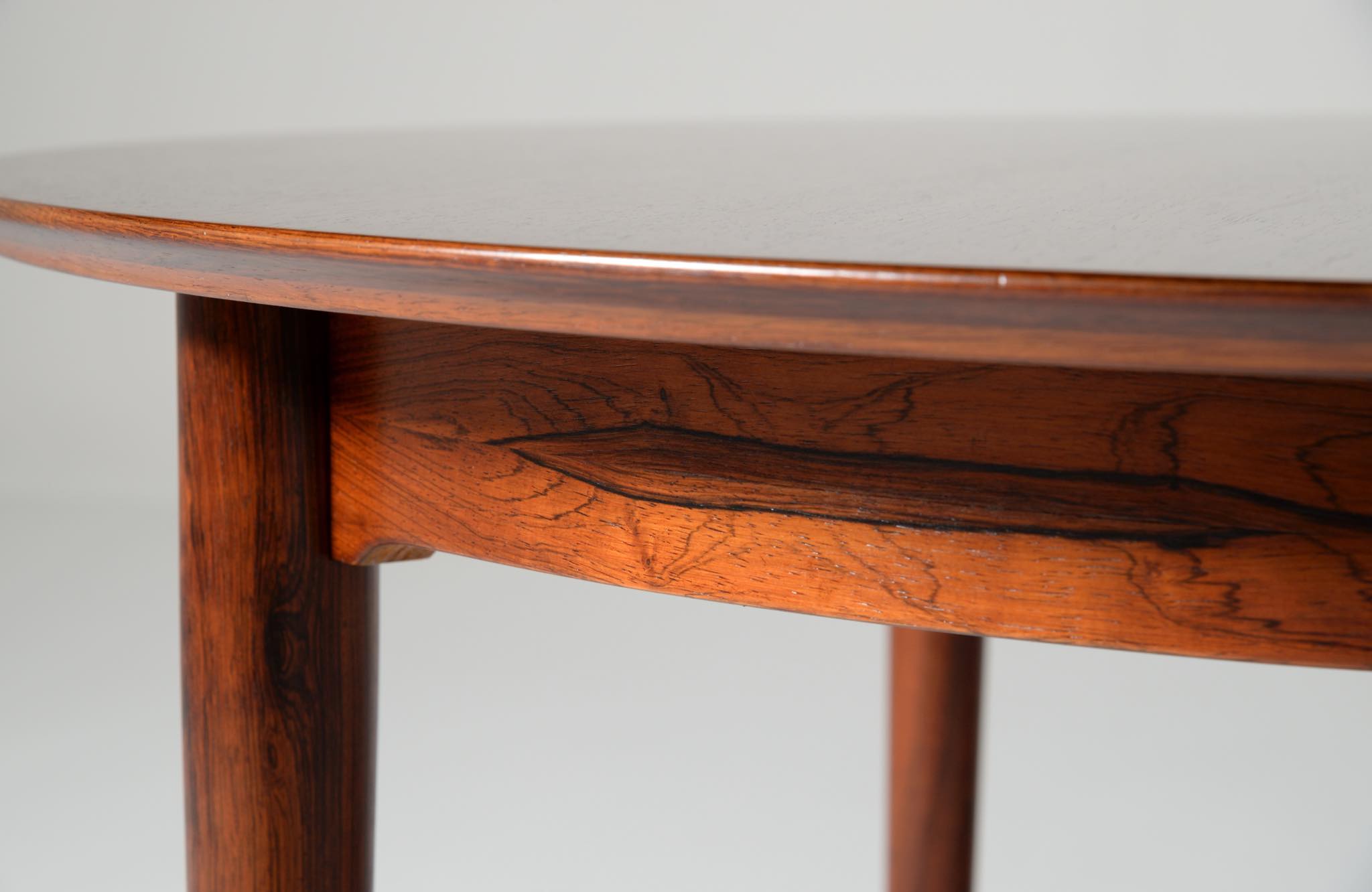 デンマークの家具工房、Helge Sibast/ヘルエ・シバストによるダイニングテーブルです。1960年代に作られたものでしょう。天板縁の作りと脚のデザインに特徴のあるモデルで、当時人気を博したようです。ブラジル原産と思しきローズウッド材が用いられており、板目で木取りされた細かな木目文様が現れています。エクステンションリーフは1枚備わり、天板の拡張が行えます。