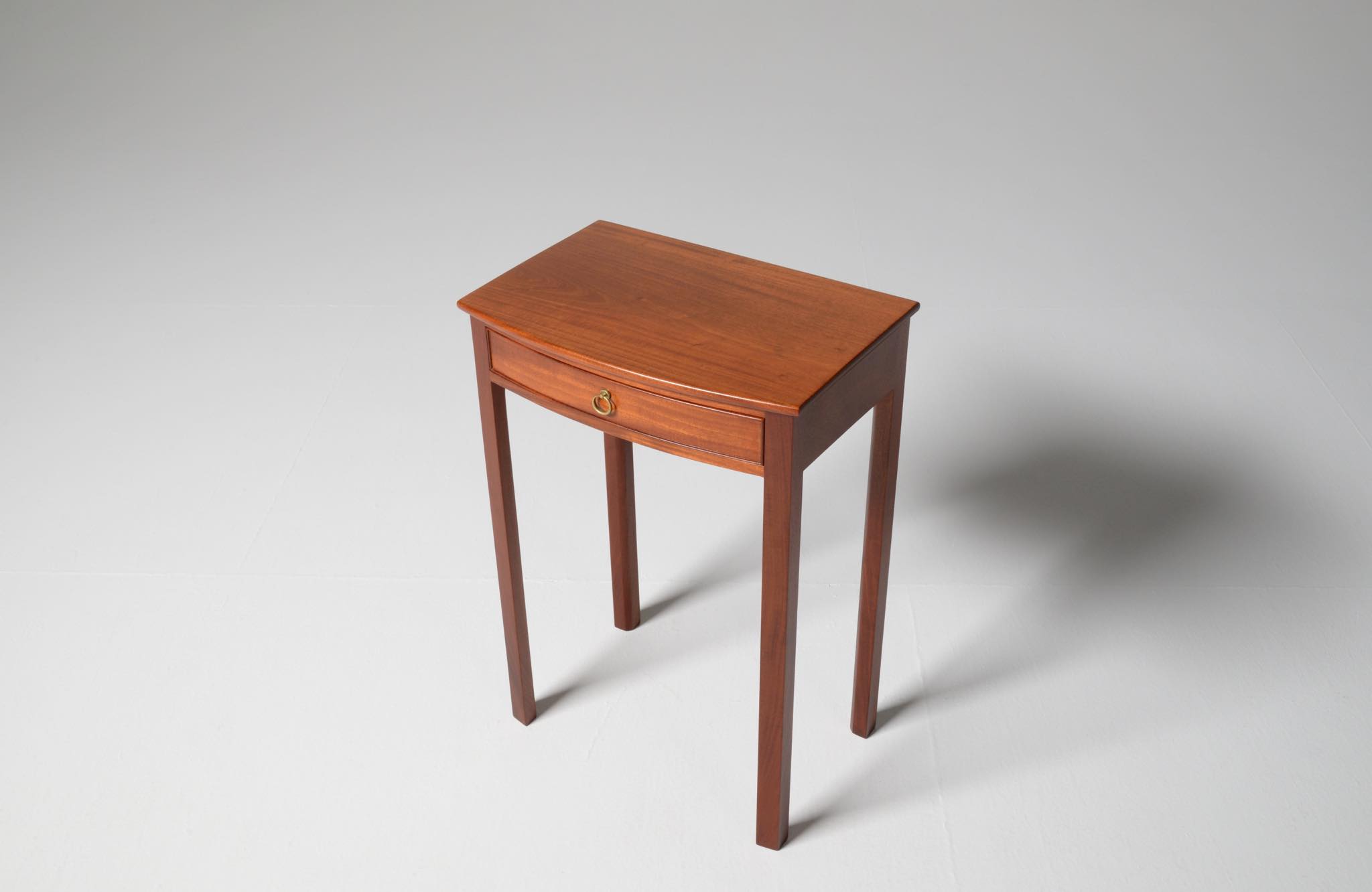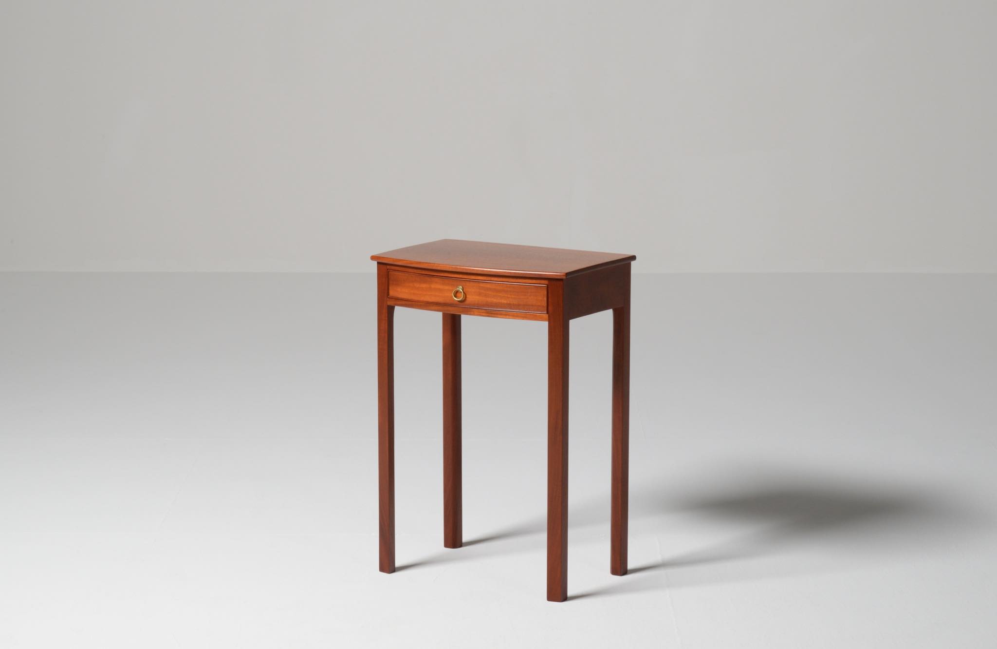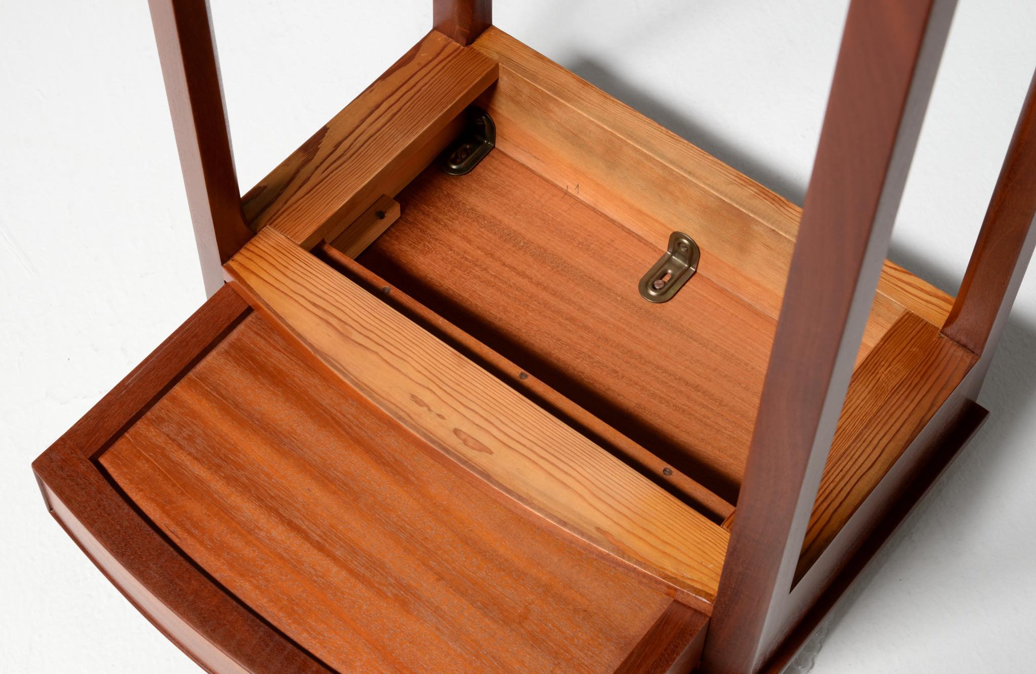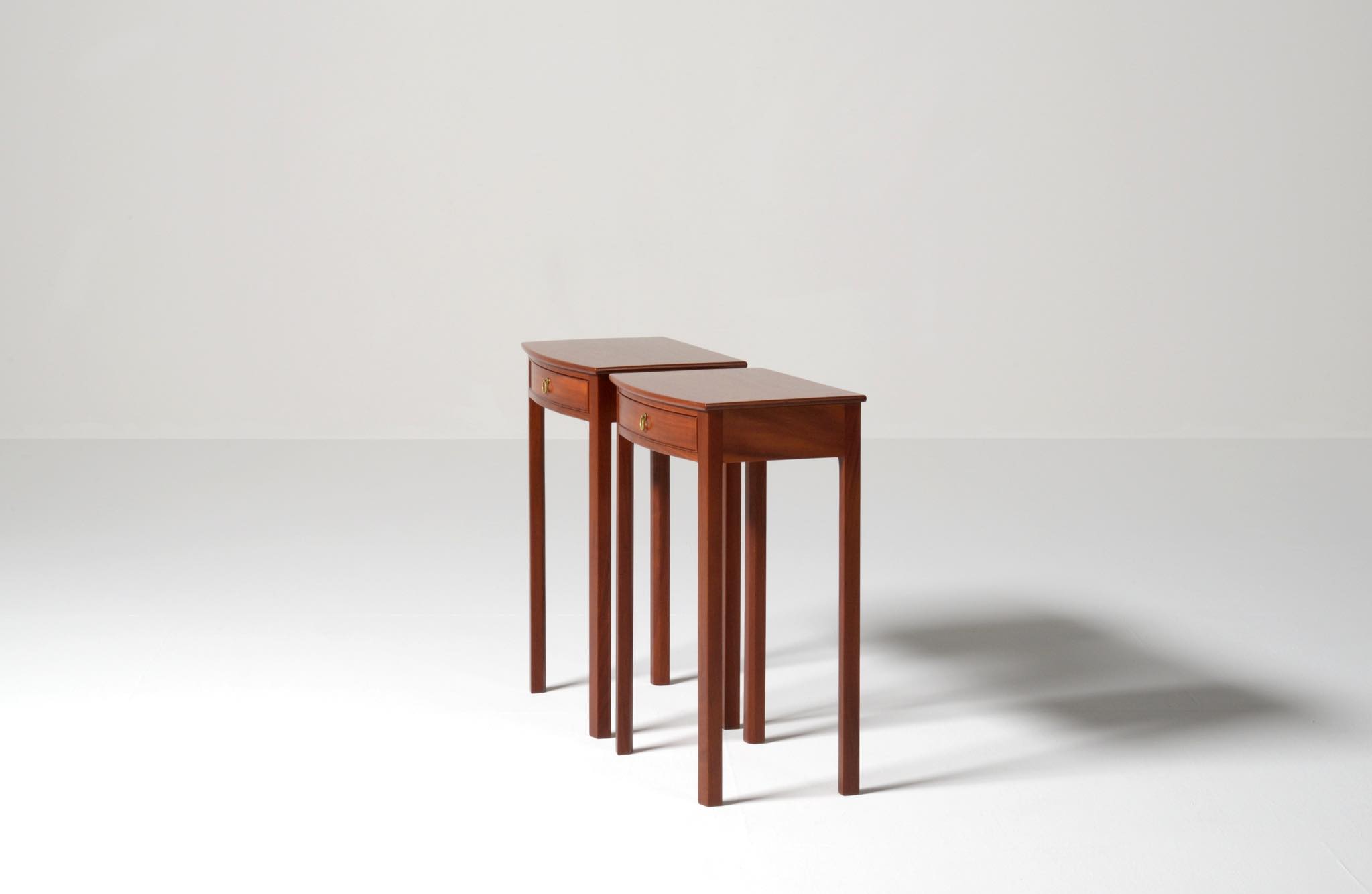 デンマークを代表する家具デザイナーの Ole Wanscher/オーレ・ヴァンシャーによるベッドサイドテーブル一対です。1950~60年代に作られたもので、マホガニー材が用いられています。サイドテーブルとしては高さ60センチと高めに設計されており、特注品であった可能性があります。天板は無垢材で作られており、引手は真鍮製、抽斗の内部も白木ではなくマホガニーで作るなど、贅沢な作行きです。こちらは一対での販売となります。