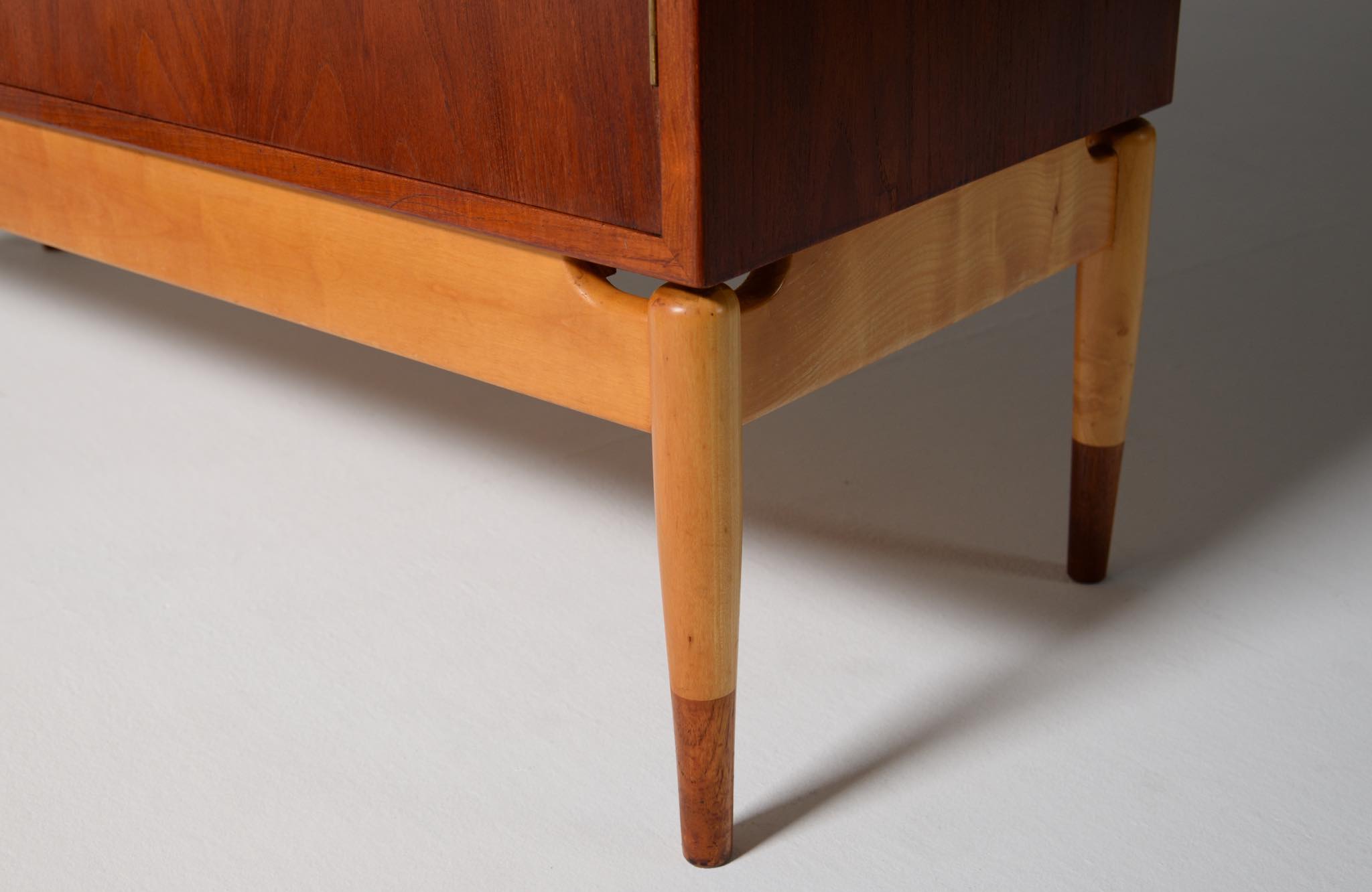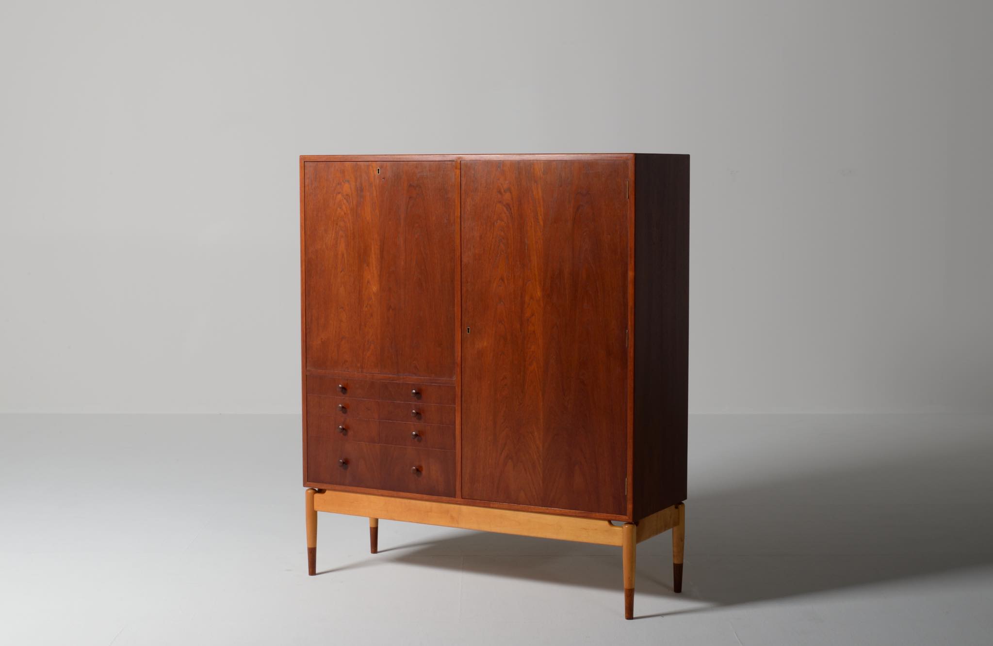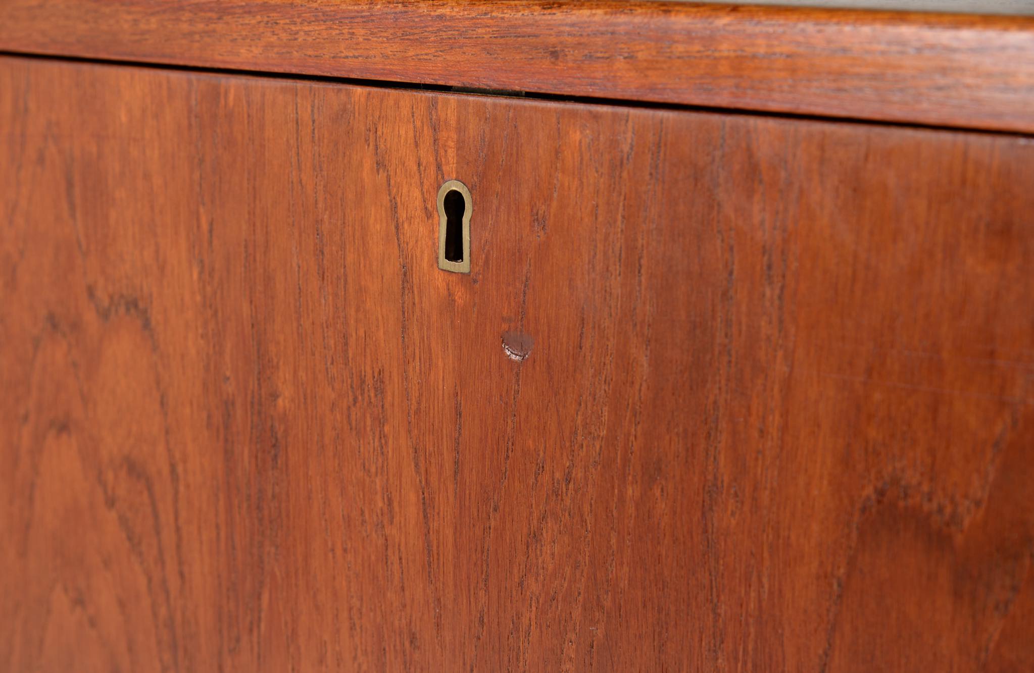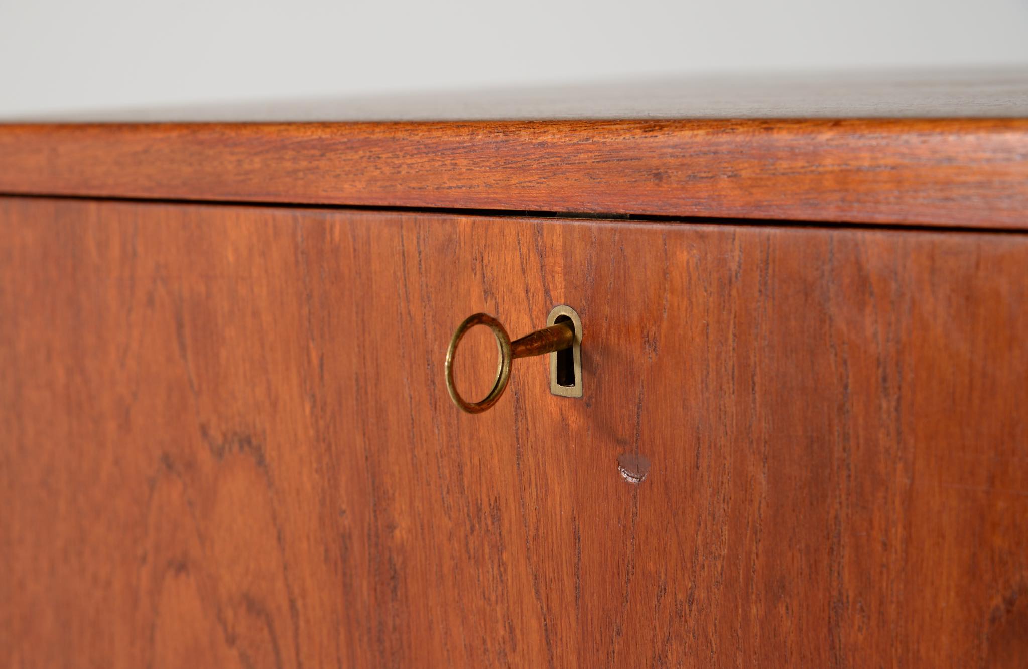 デンマークを代表する家具デザイナー、建築家のFinn Juhl/フィン・ユールによるカップボードキャビネット、1950年代頃のものでしょう。チーク材の本体に、メープル材の脚が備わります。来客用の食器やバーキャビネットとしたもので、あおり式の扉は作業用テーブルを兼ねています。あおり扉の鍵穴の下に打痕があり、また、右扉の内側にパテ補修が見られますが、概ね綺麗な状態です。