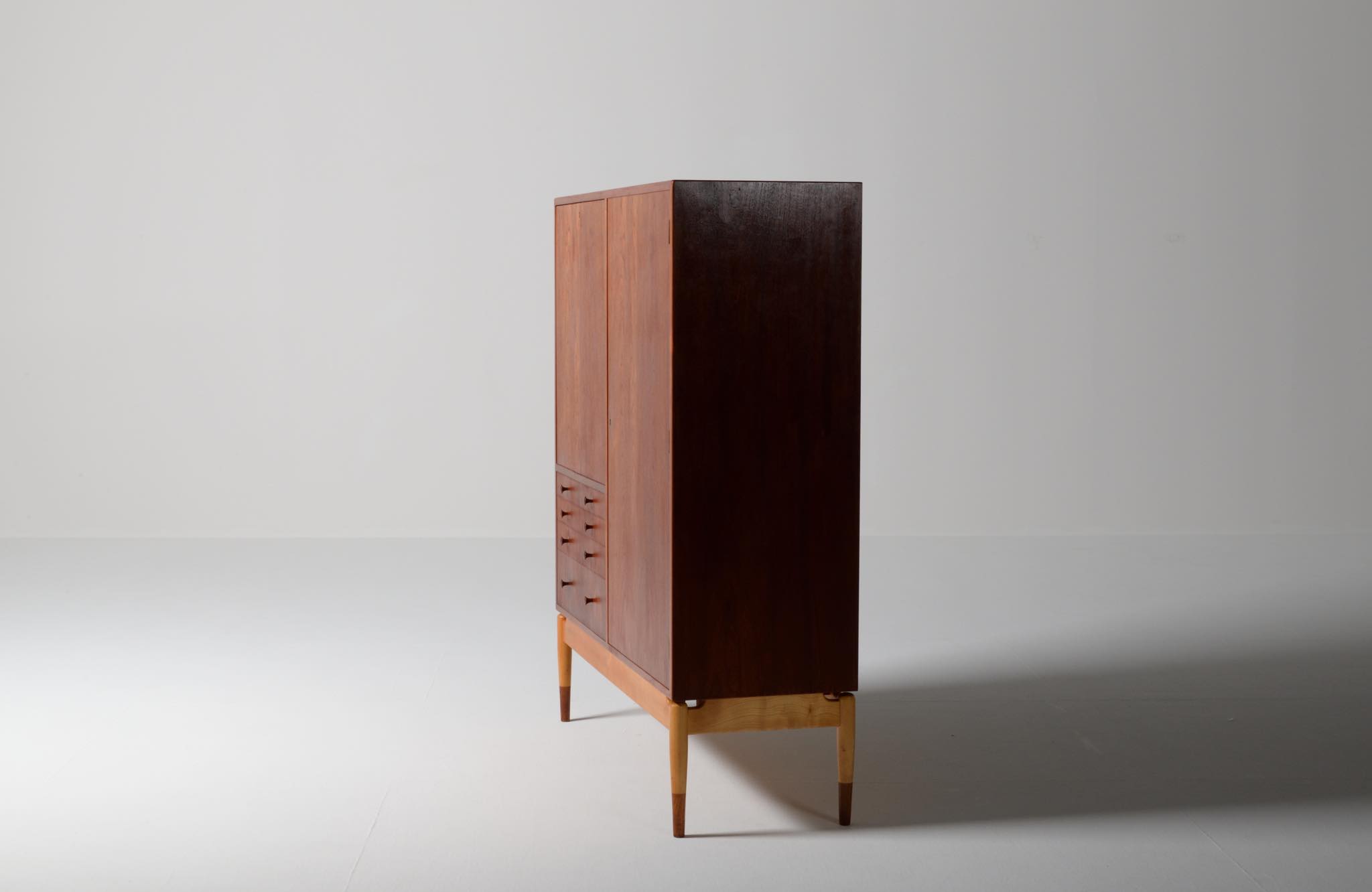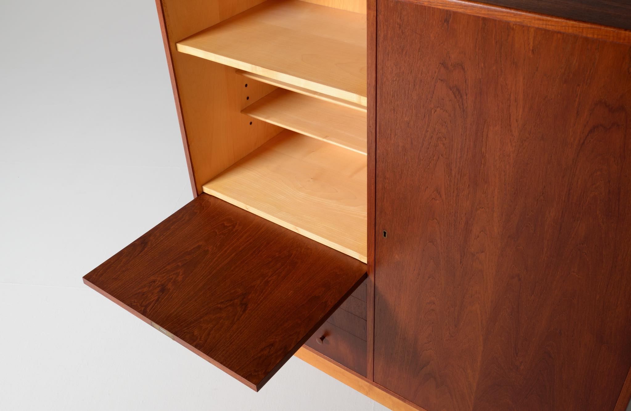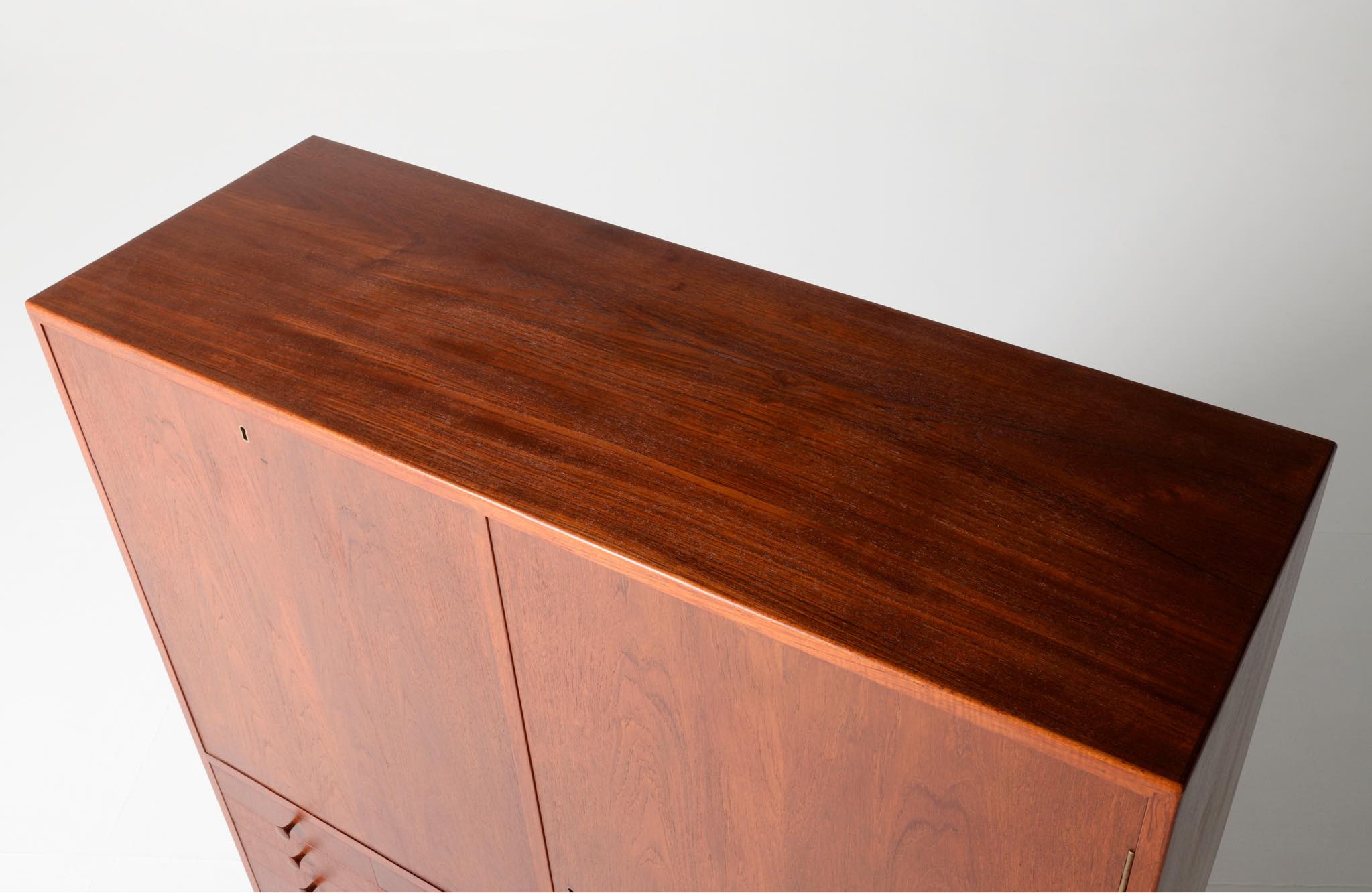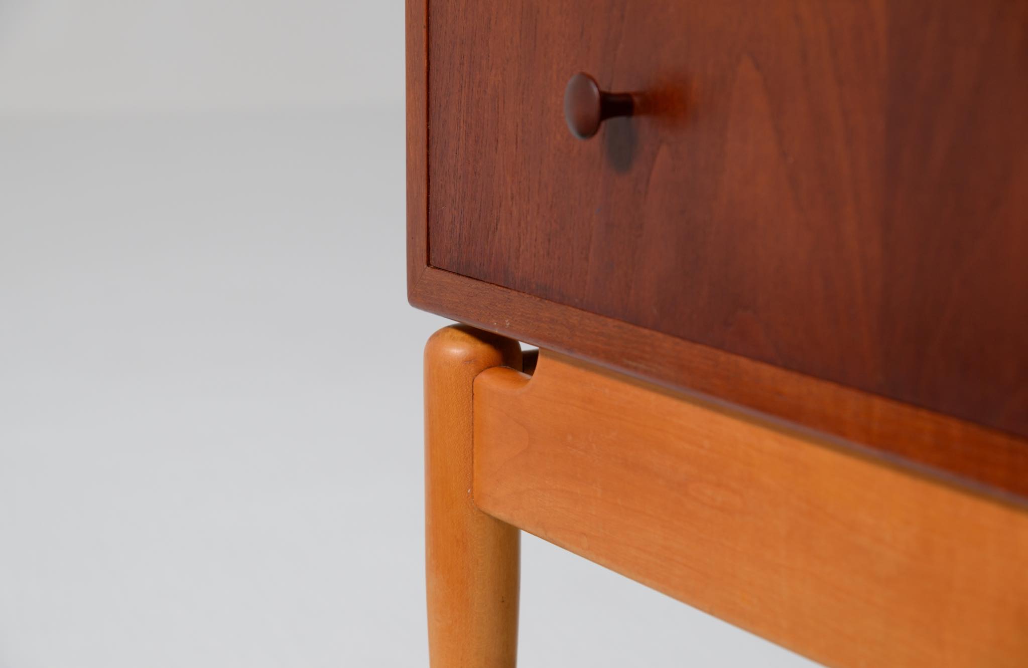 デンマークを代表する家具デザイナー、建築家のFinn Juhl/フィン・ユールによるカップボードキャビネット、1950年代頃のものでしょう。チーク材の本体に、メープル材の脚が備わります。来客用の食器やバーキャビネットとしたもので、あおり式の扉は作業用テーブルを兼ねています。あおり扉の鍵穴の下に打痕があり、また、右扉の内側にパテ補修が見られますが、概ね綺麗な状態です。