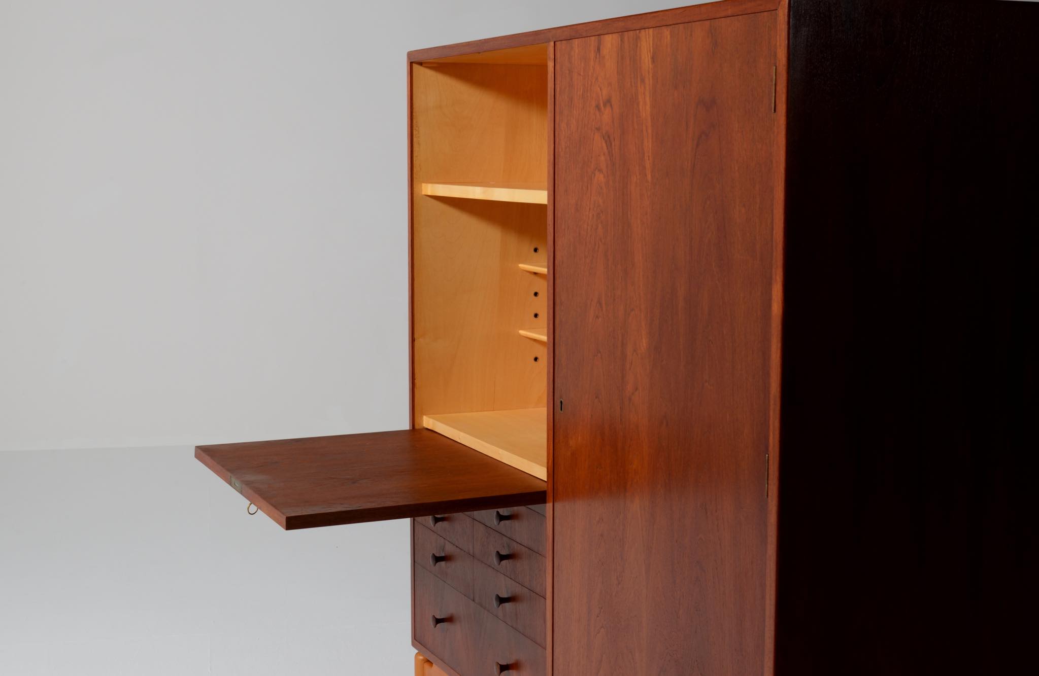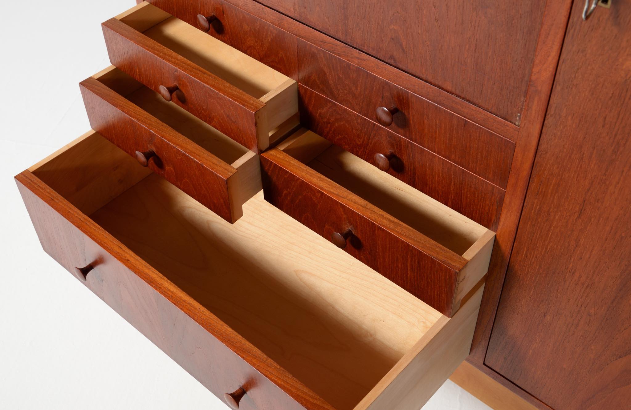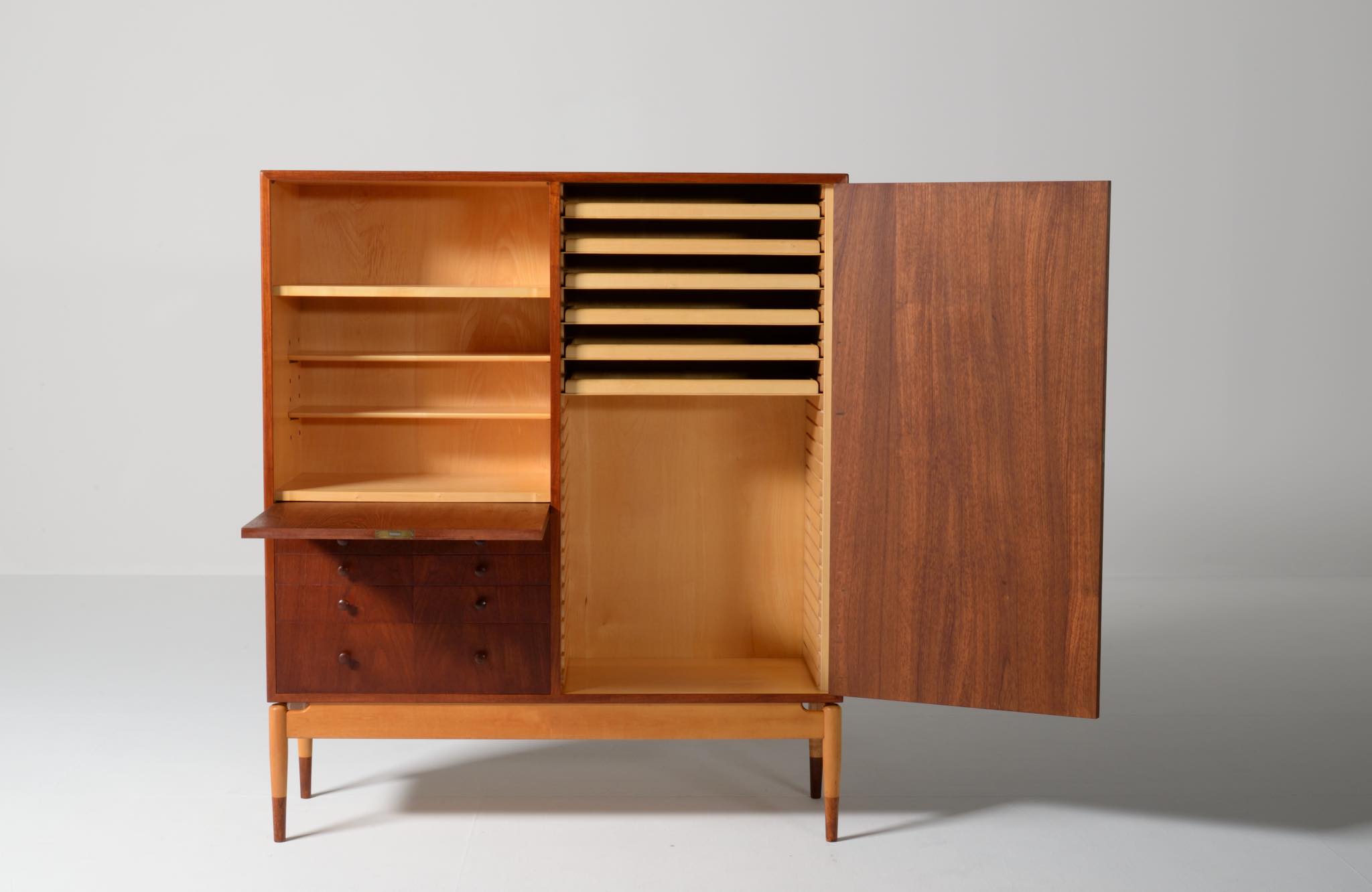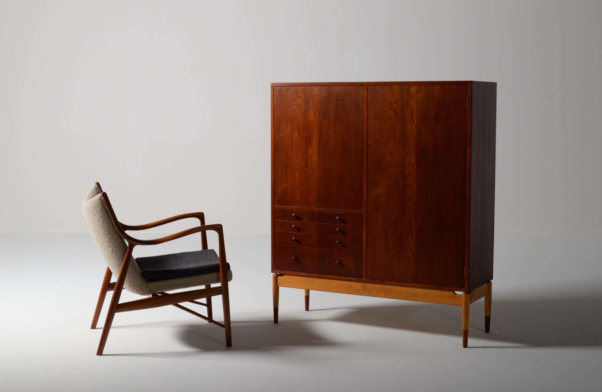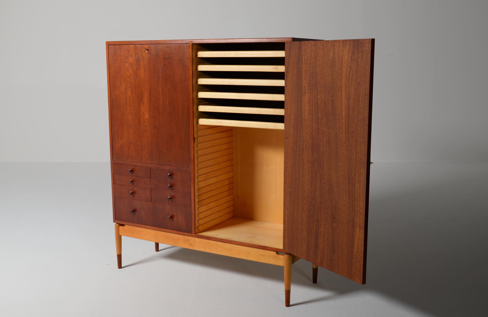 デンマークを代表する家具デザイナー、建築家のFinn Juhl/フィン・ユールによるカップボードキャビネット、1950年代頃のものでしょう。チーク材の本体に、メープル材の脚が備わります。来客用の食器やバーキャビネットとしたもので、あおり式の扉は作業用テーブルを兼ねています。あおり扉の鍵穴の下に打痕があり、また、右扉の内側にパテ補修が見られますが、概ね綺麗な状態です。