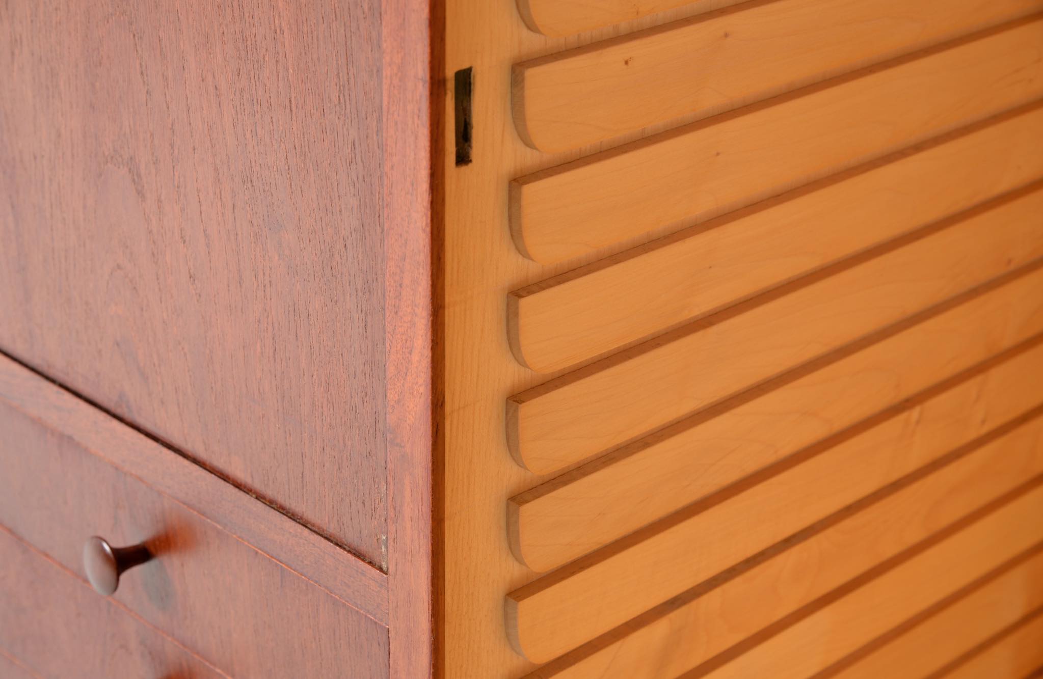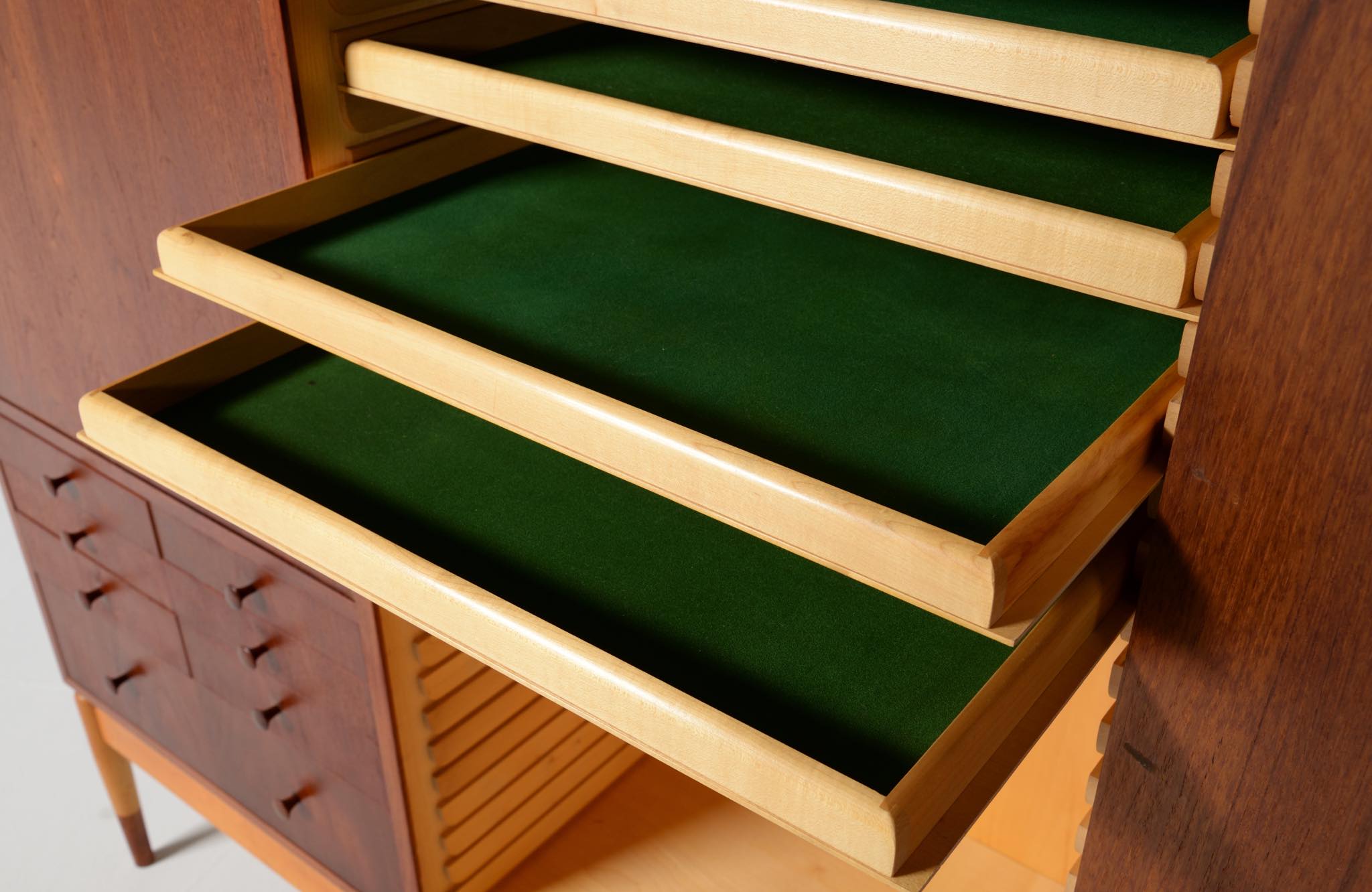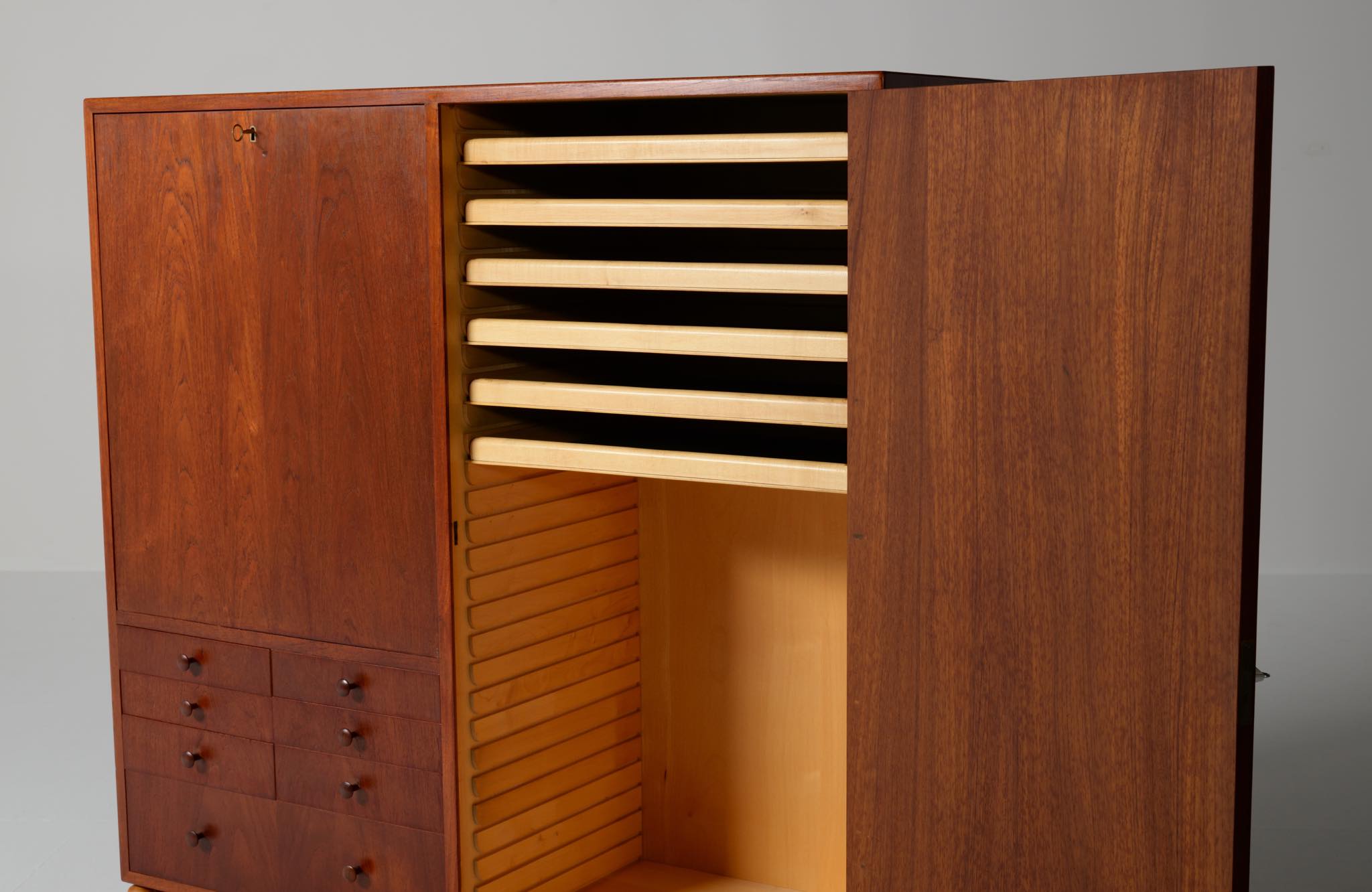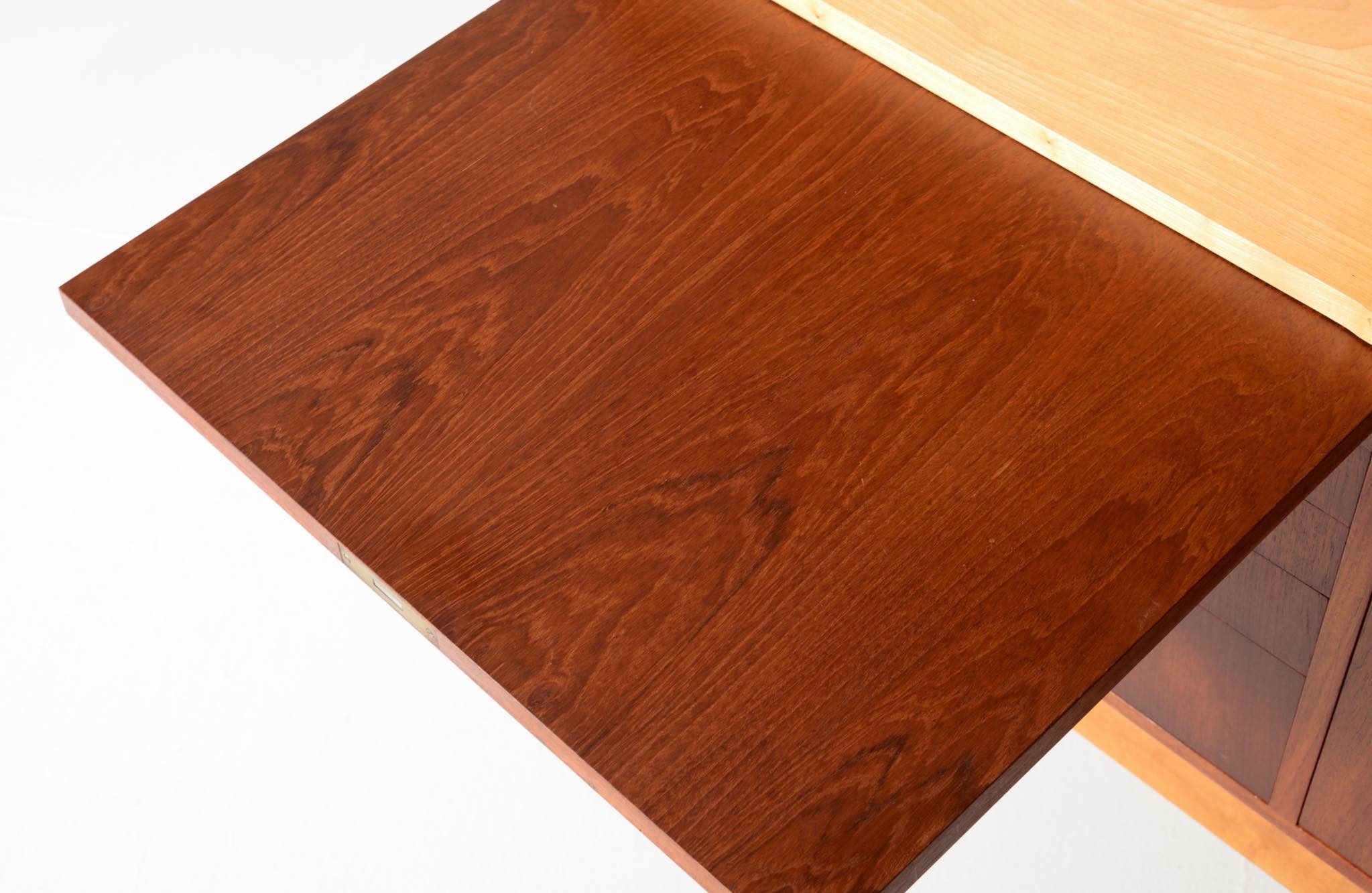 デンマークを代表する家具デザイナー、建築家のFinn Juhl/フィン・ユールによるカップボードキャビネット、1950年代頃のものでしょう。チーク材の本体に、メープル材の脚が備わります。来客用の食器やバーキャビネットとしたもので、あおり式の扉は作業用テーブルを兼ねています。あおり扉の鍵穴の下に打痕があり、また、右扉の内側にパテ補修が見られますが、概ね綺麗な状態です。