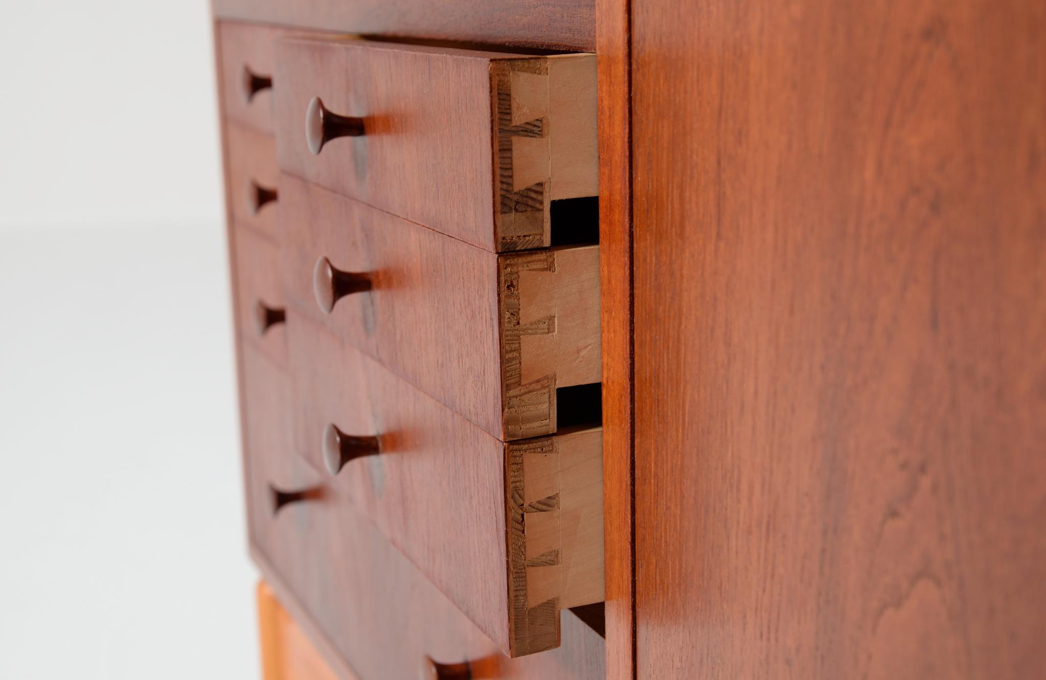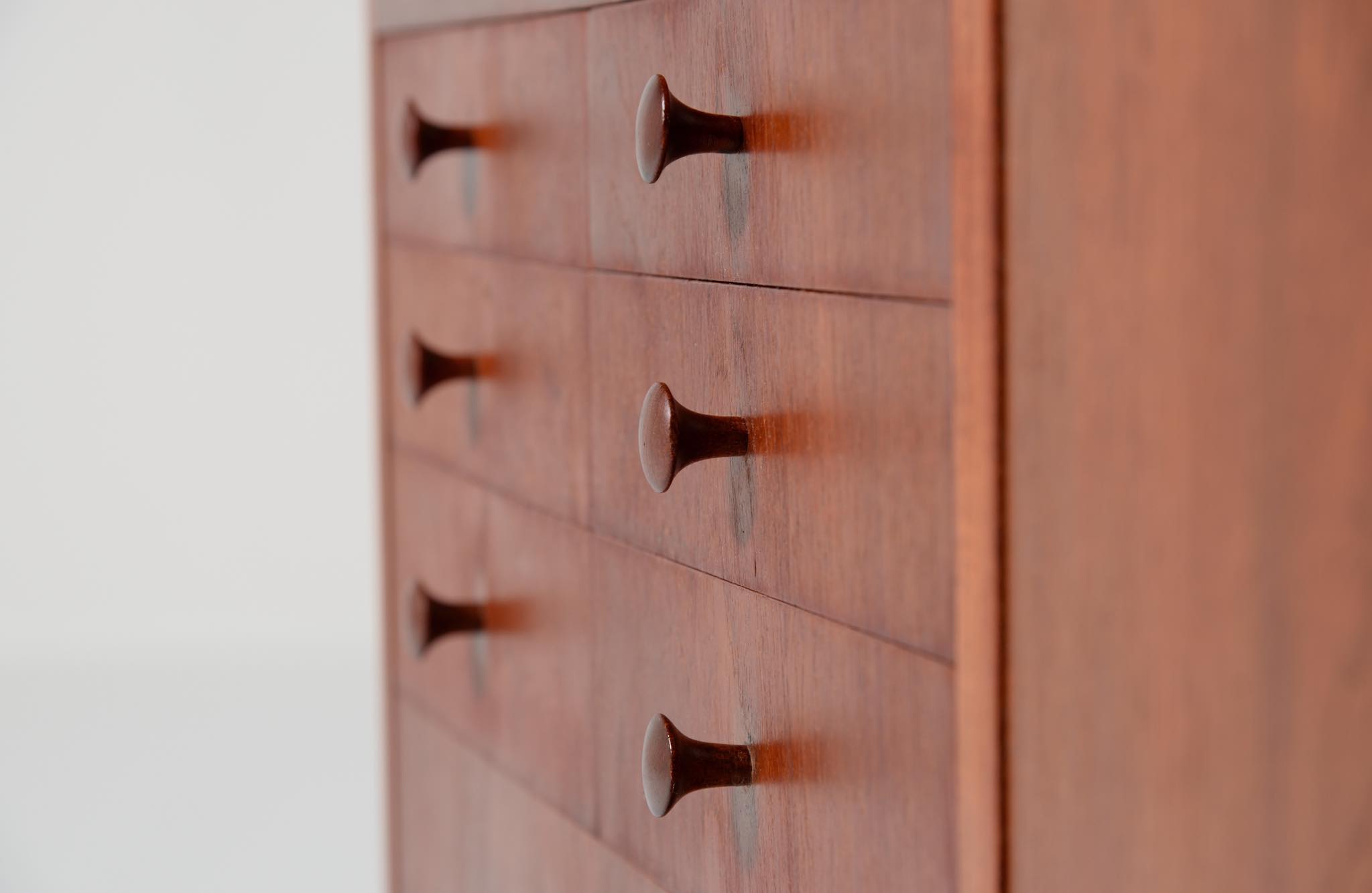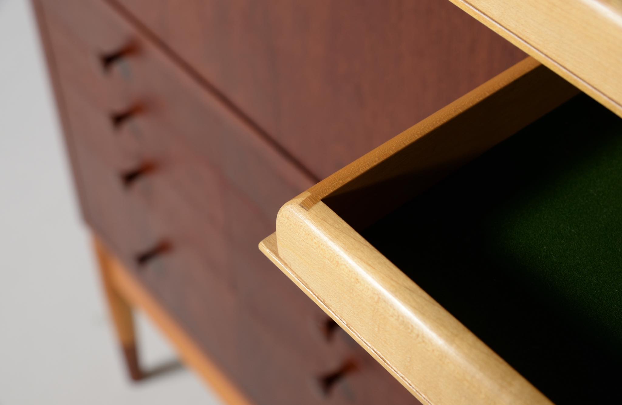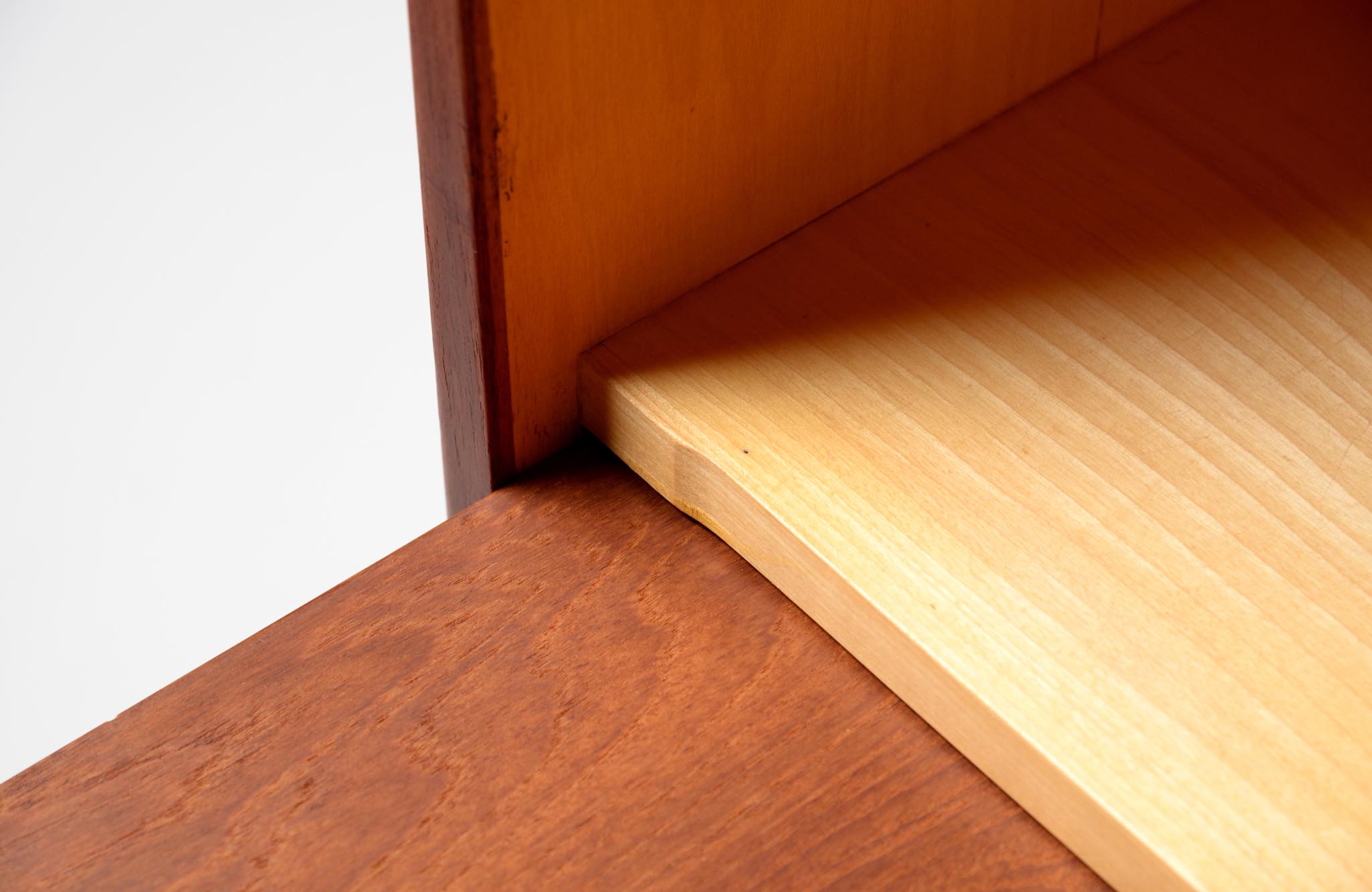 デンマークを代表する家具デザイナー、建築家のFinn Juhl/フィン・ユールによるカップボードキャビネット、1950年代頃のものでしょう。チーク材の本体に、メープル材の脚が備わります。来客用の食器やバーキャビネットとしたもので、あおり式の扉は作業用テーブルを兼ねています。あおり扉の鍵穴の下に打痕があり、また、右扉の内側にパテ補修が見られますが、概ね綺麗な状態です。