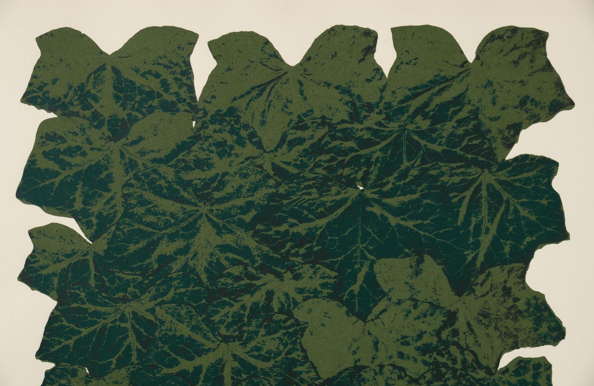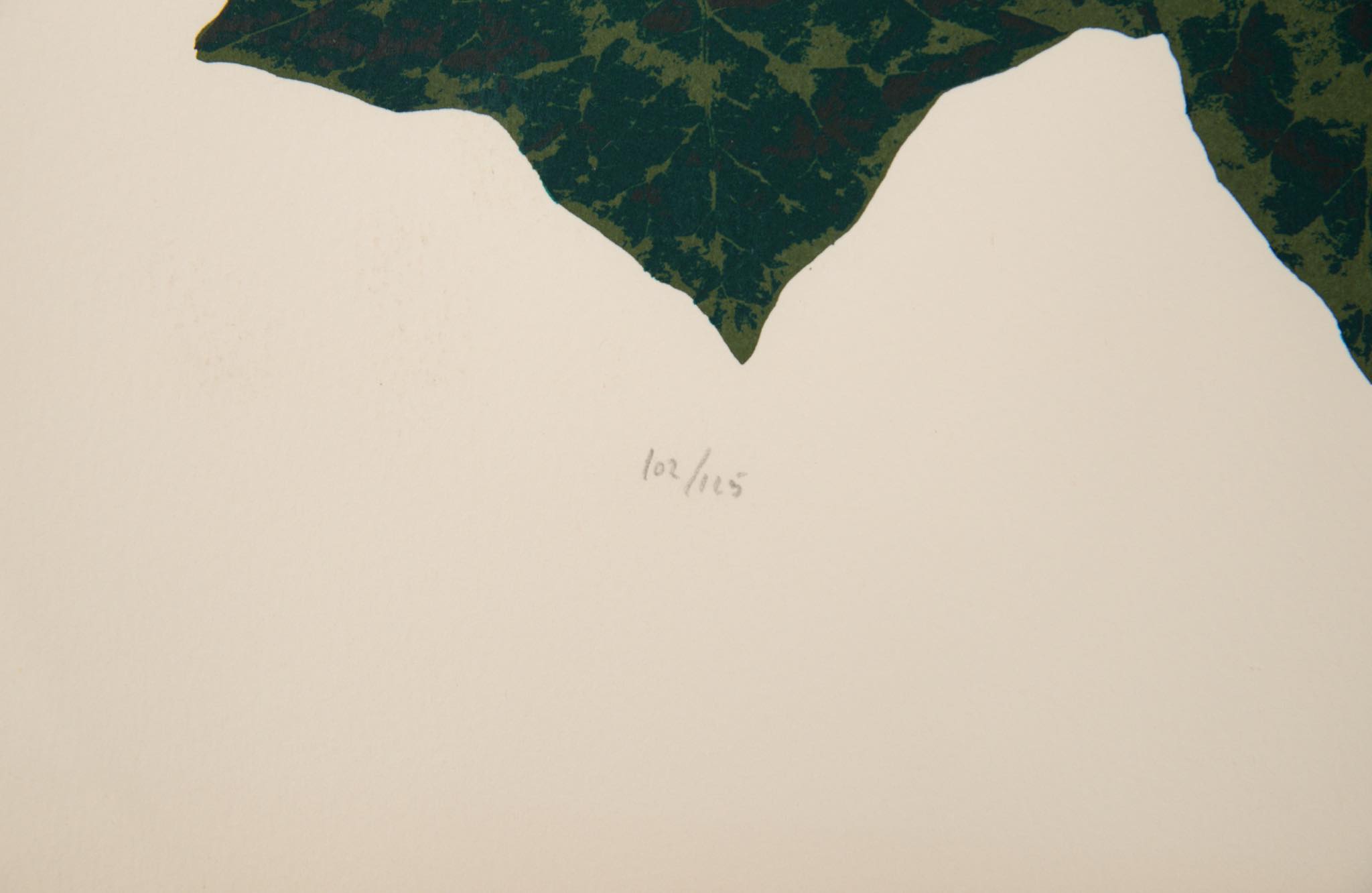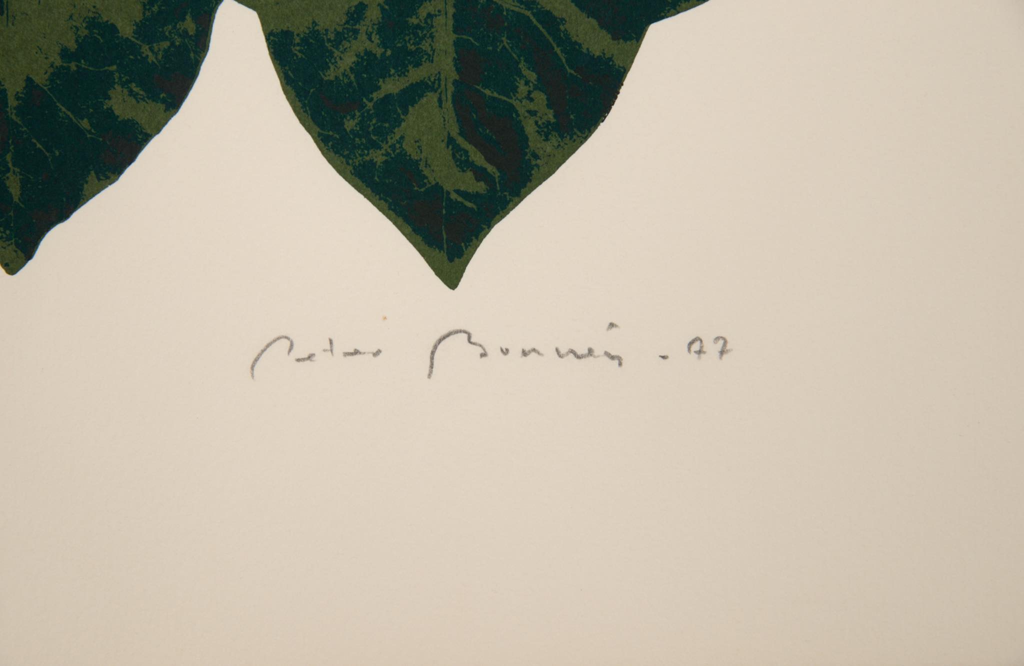 デンマークの芸術家、Peter Bonnén/ピーター・ボンネンによるリトグラフ作品です。1977年に刷られたもので、折り重なるアイビーの葉が一つの塊となり、別な物体にも見えるような、彫刻家らしい表現の作品です。オリジナルの木製フレームに表面的な劣化が見られたので塗装にて整え、内部のマットを新調しました。コンディションは良好です。