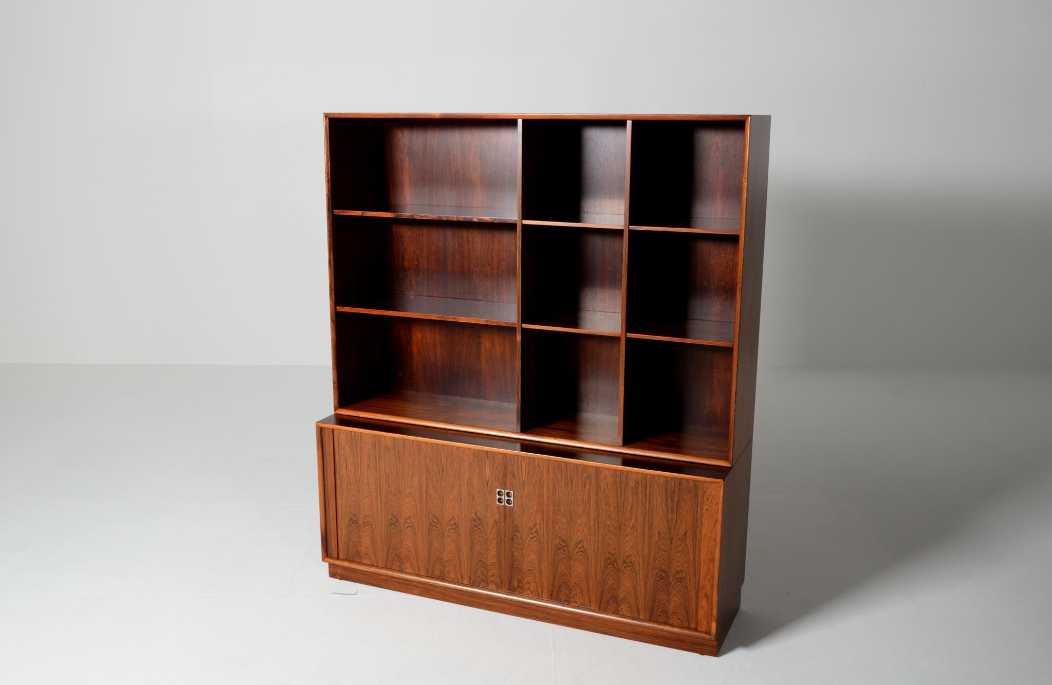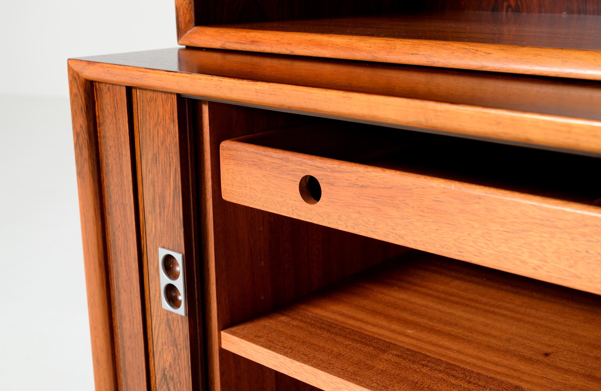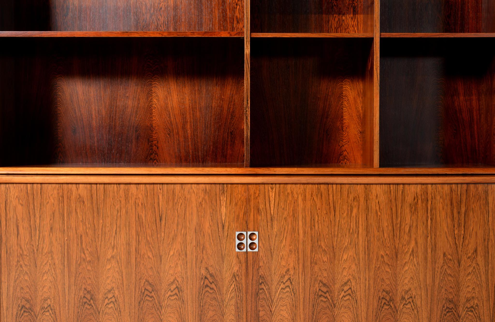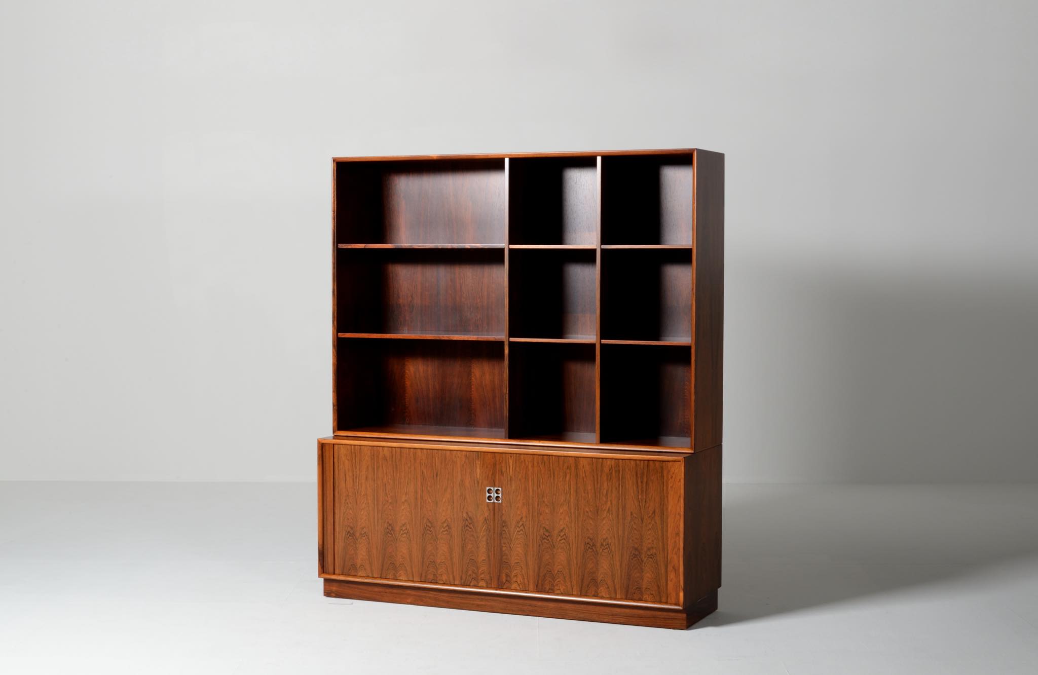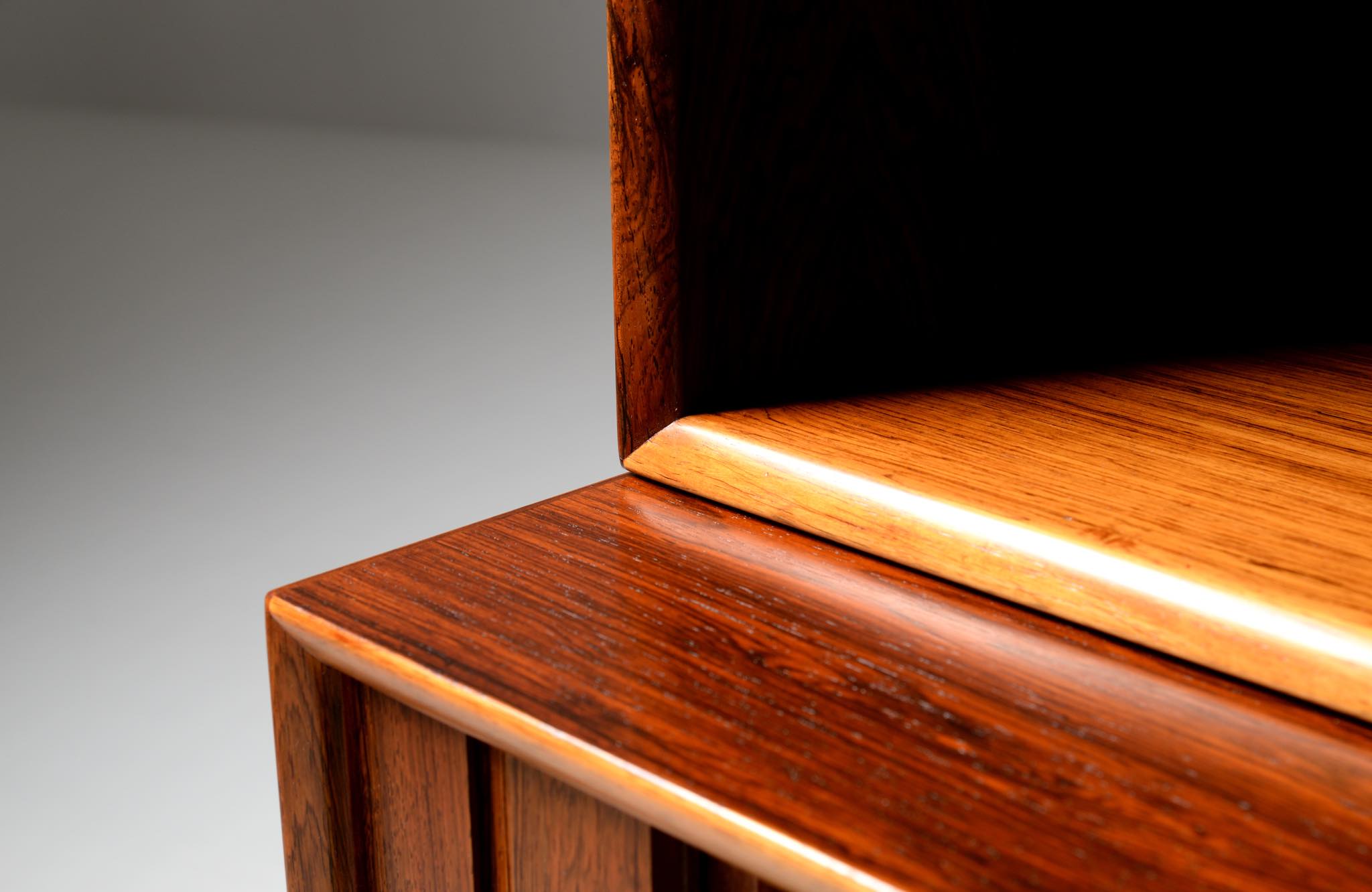 Arne Vodder/アルネ・ヴォッダーによるブックケースキャビネット、1960年代に作られたものでしょう。ローズウッドを用いたもので、蛇腹の扉が特徴です。指を挿し込んで開閉する引手は、1960年代当時の新たなデザインの流れを象徴しています。各棚板は差し替えが可能で、必要に応じて棚板の位置を変えることができます。コンディションは良好です。