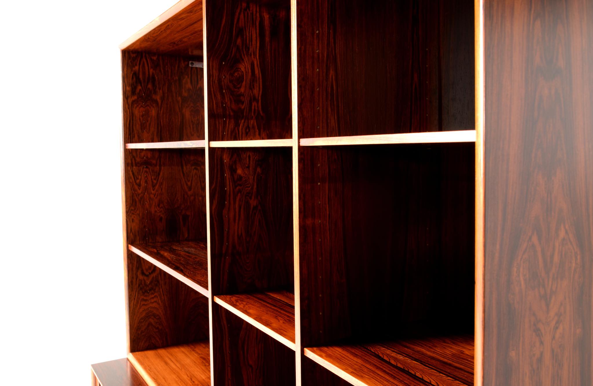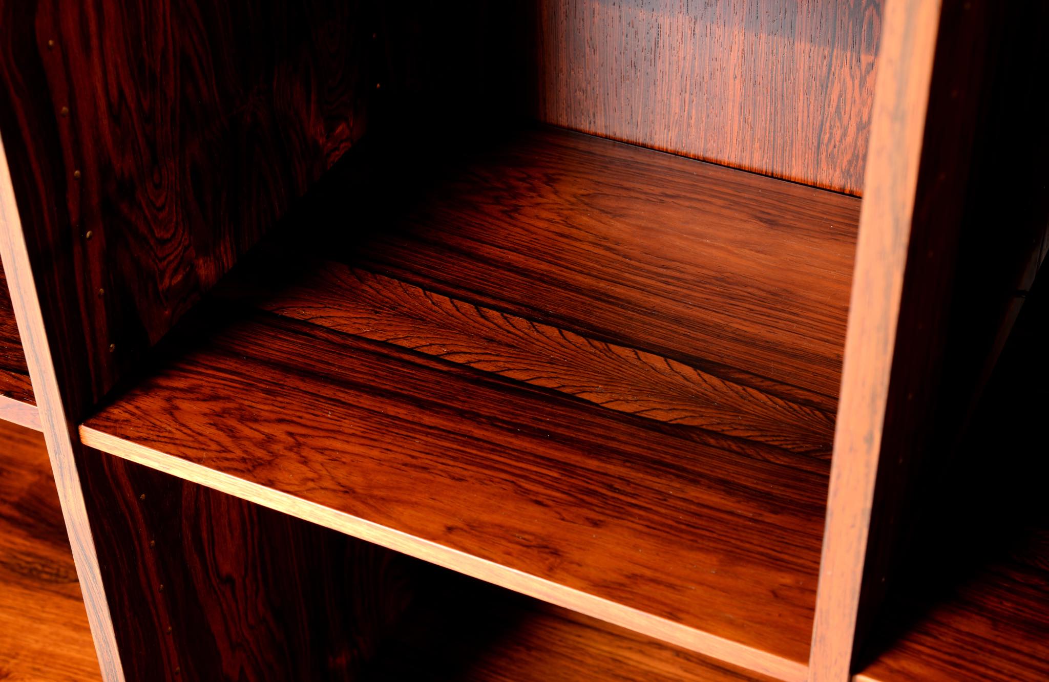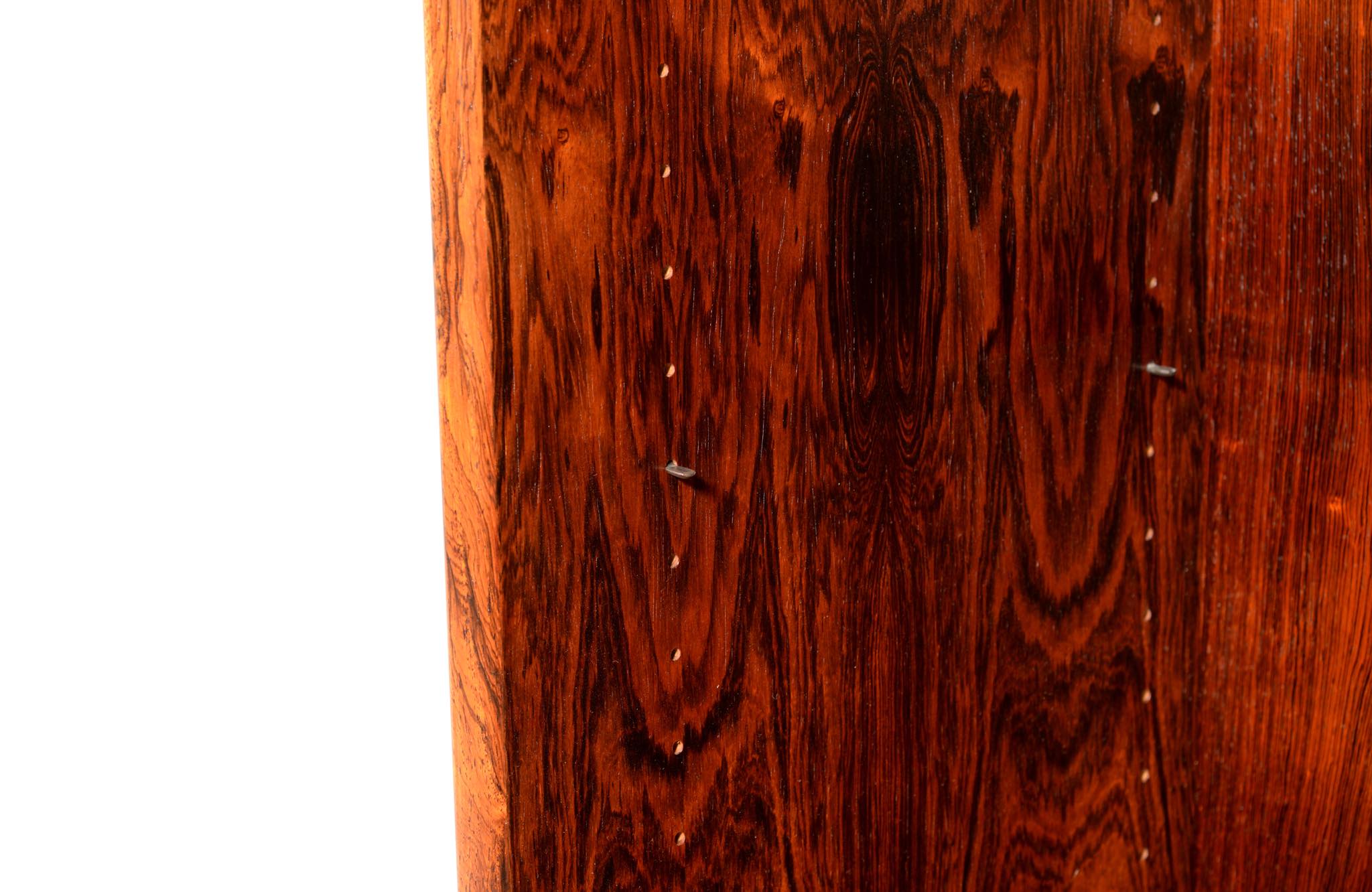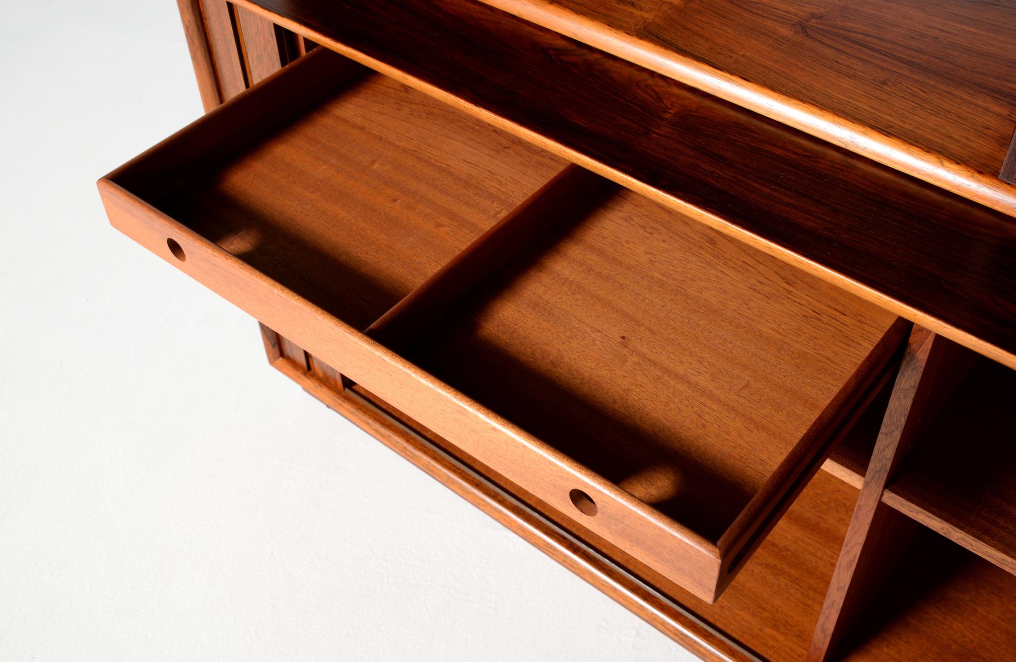 Arne Vodder/アルネ・ヴォッダーによるブックケースキャビネット、1960年代に作られたものでしょう。ローズウッドを用いたもので、蛇腹の扉が特徴です。指を挿し込んで開閉する引手は、1960年代当時の新たなデザインの流れを象徴しています。各棚板は差し替えが可能で、必要に応じて棚板の位置を変えることができます。コンディションは良好です。