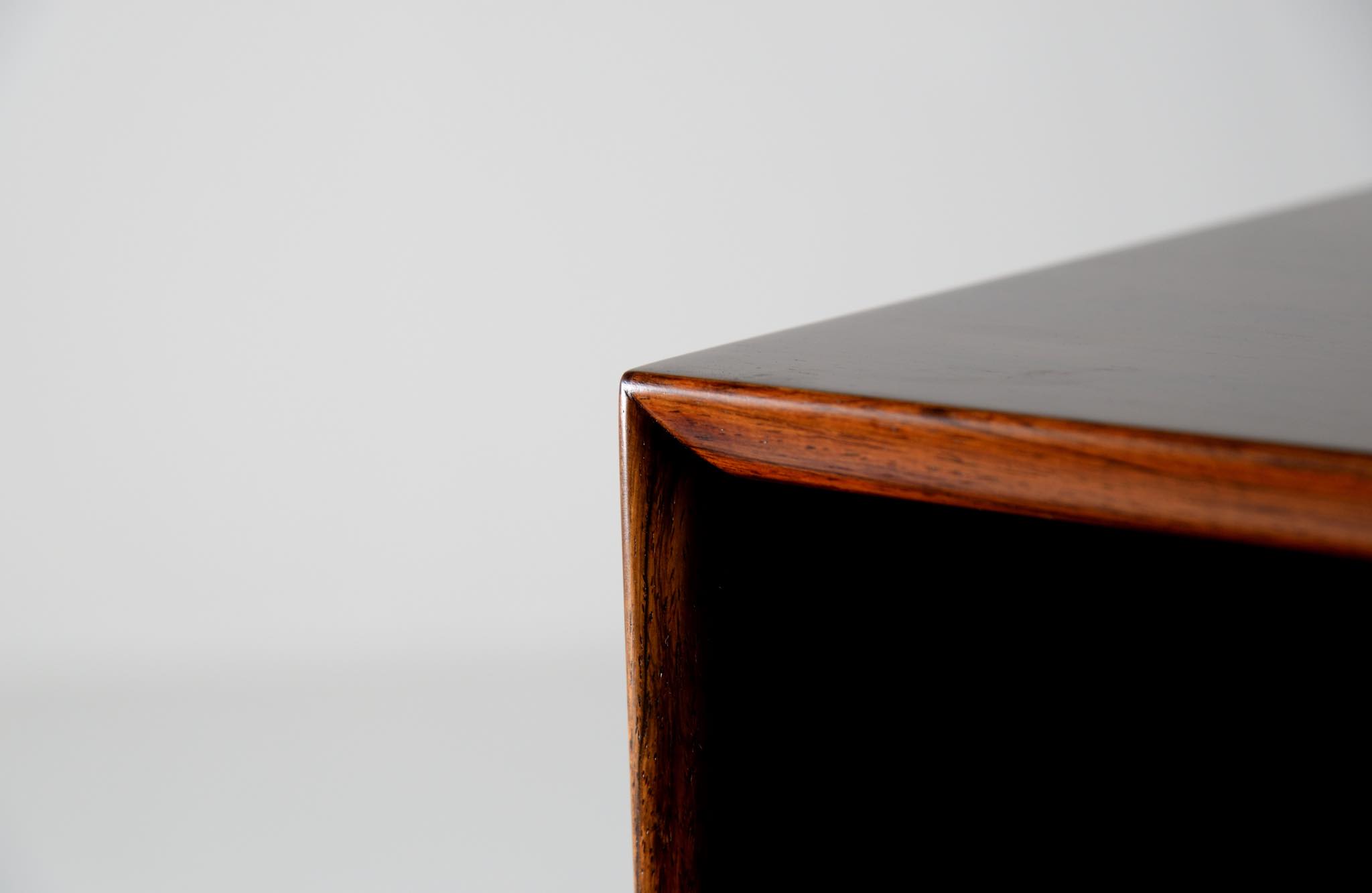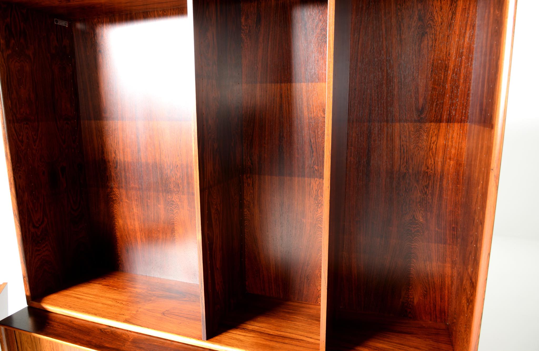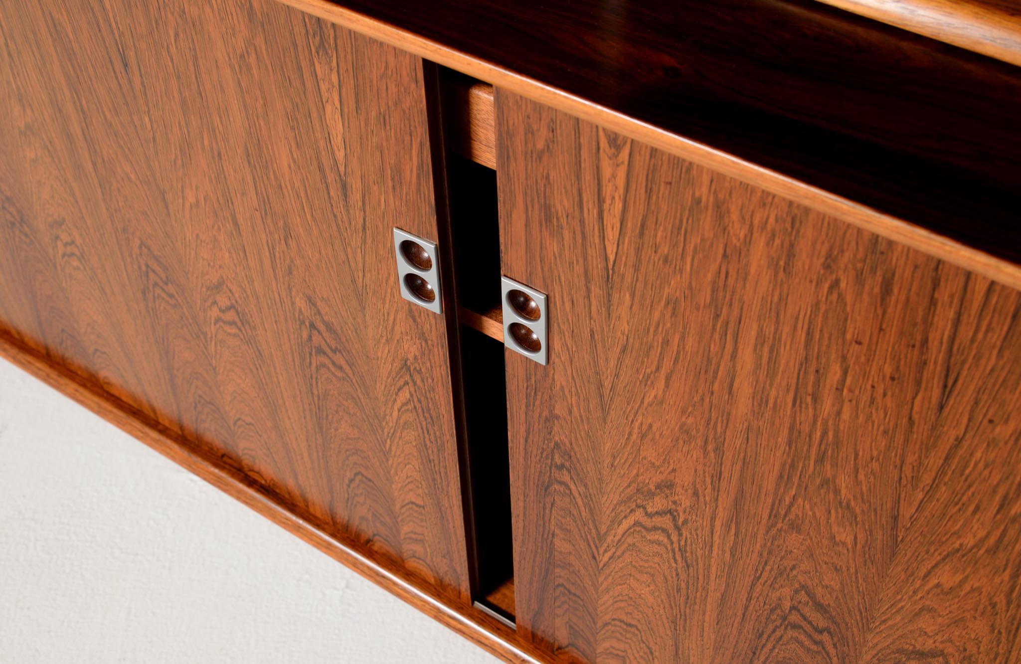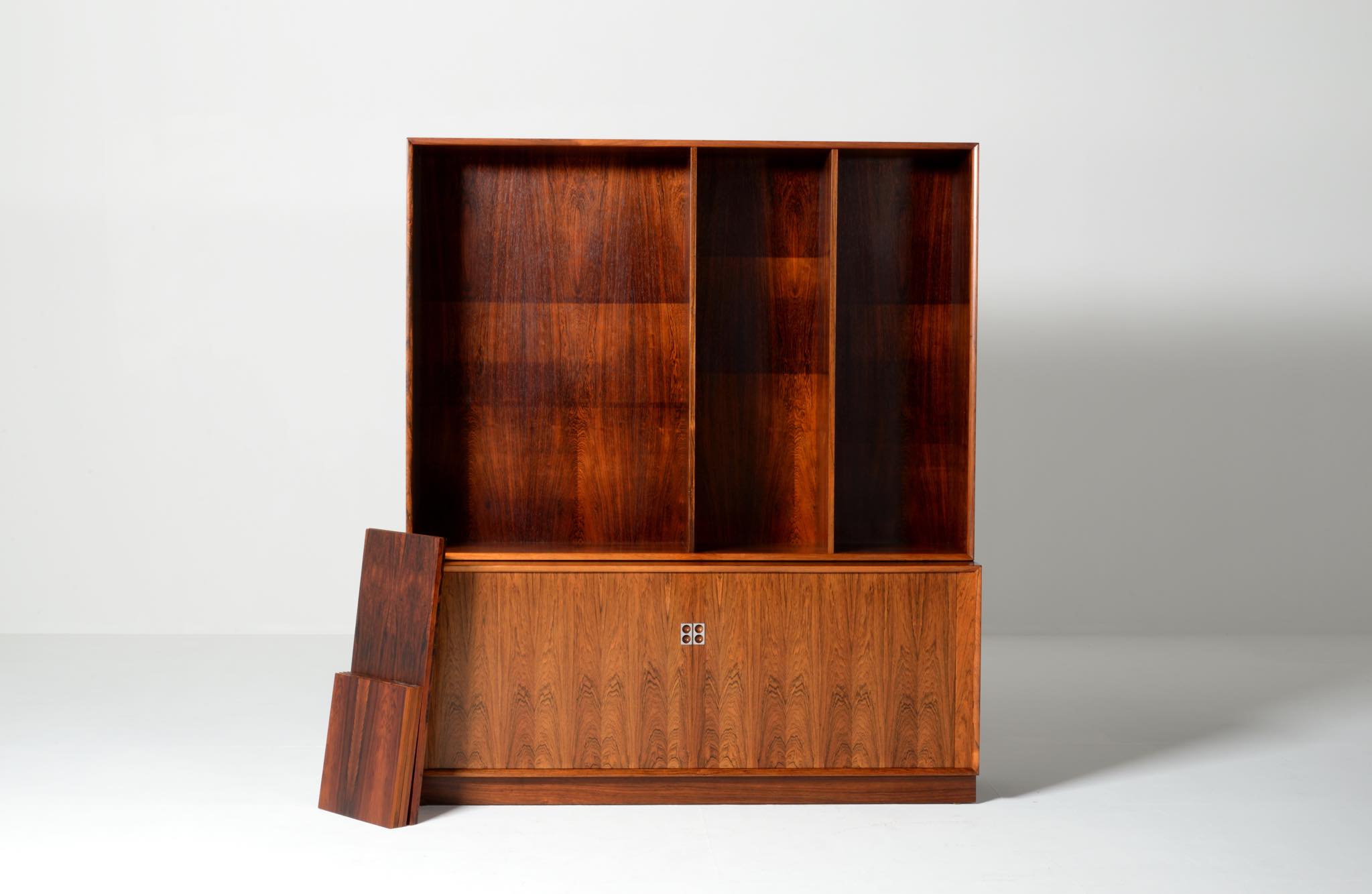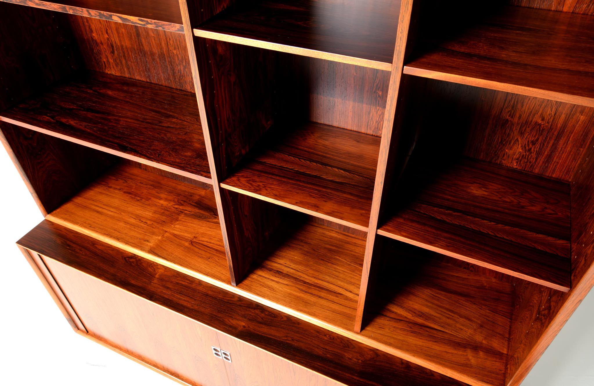 Arne Vodder/アルネ・ヴォッダーによるブックケースキャビネット、1960年代に作られたものでしょう。ローズウッドを用いたもので、蛇腹の扉が特徴です。指を挿し込んで開閉する引手は、1960年代当時の新たなデザインの流れを象徴しています。各棚板は差し替えが可能で、必要に応じて棚板の位置を変えることができます。コンディションは良好です。
