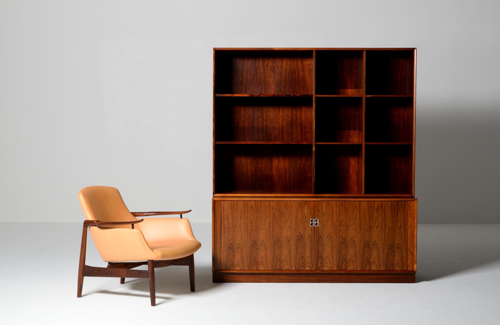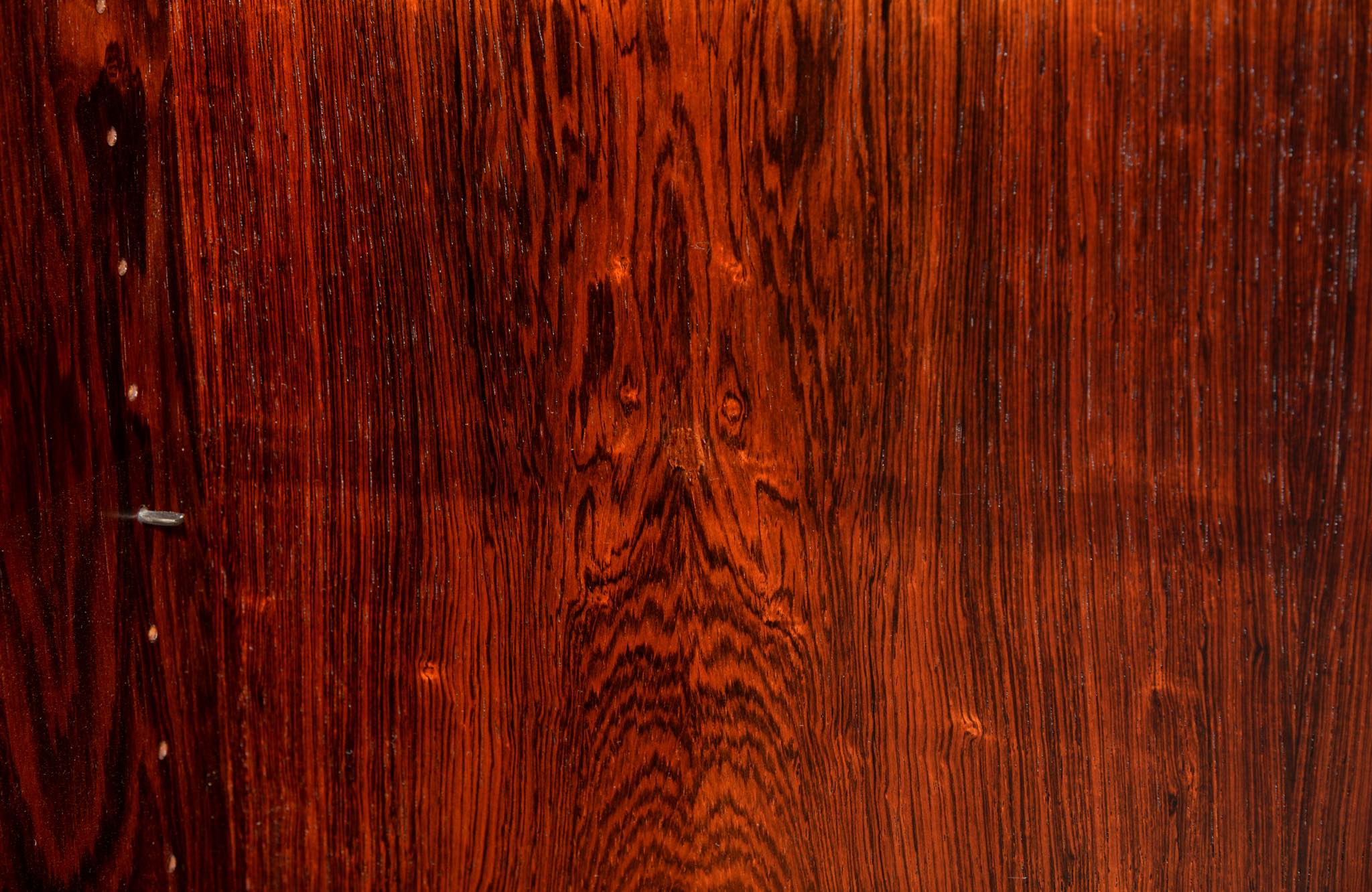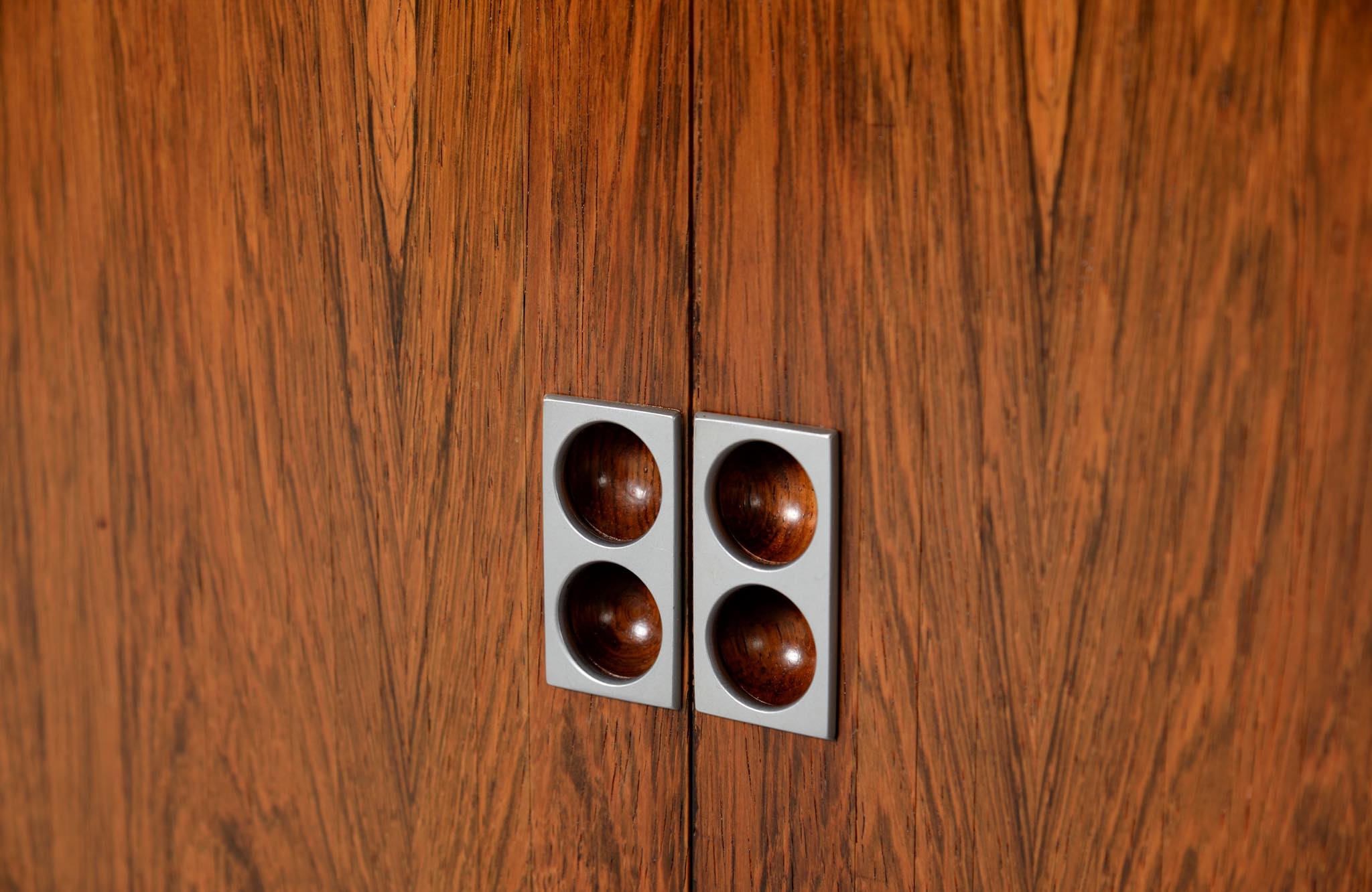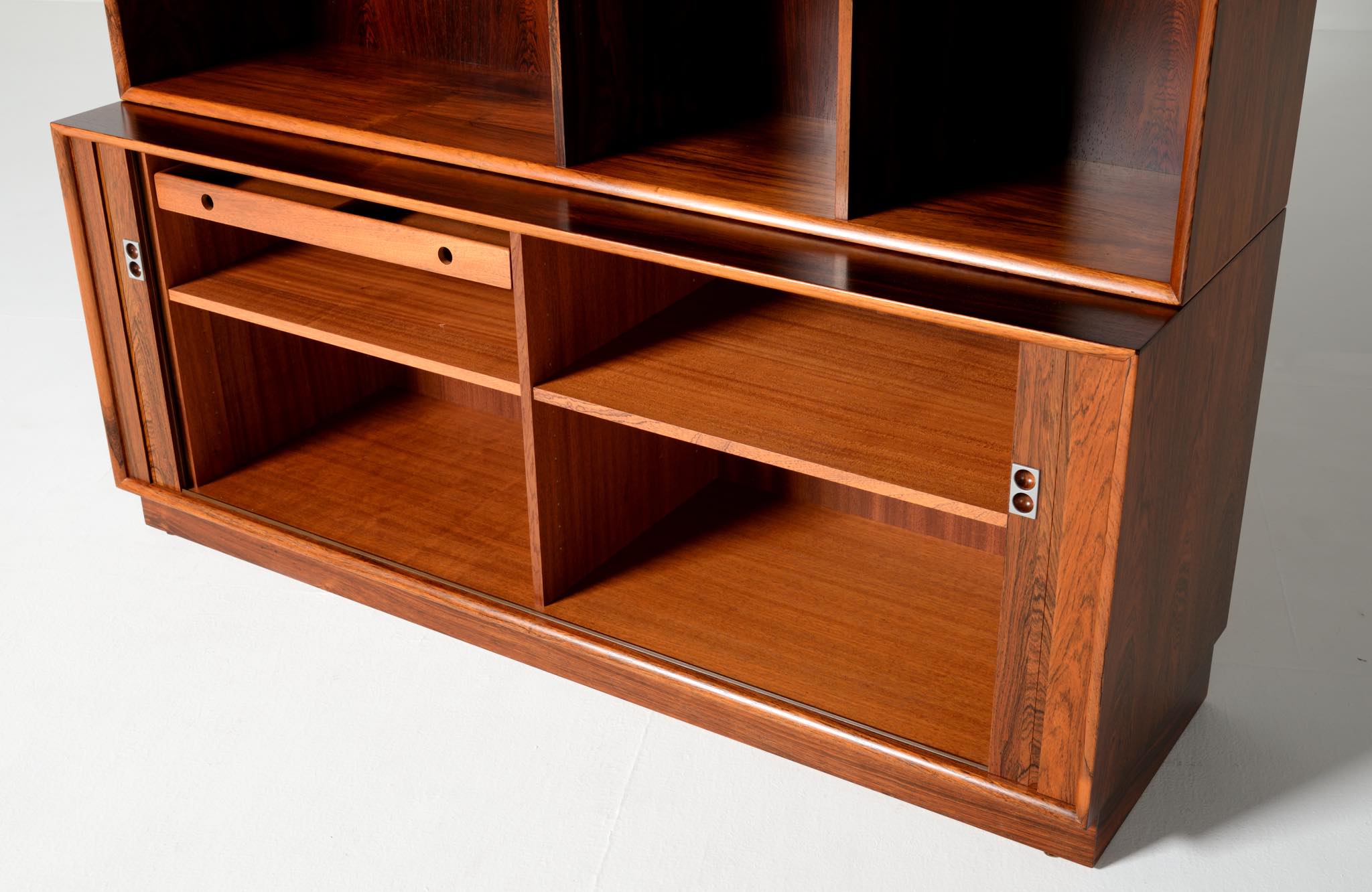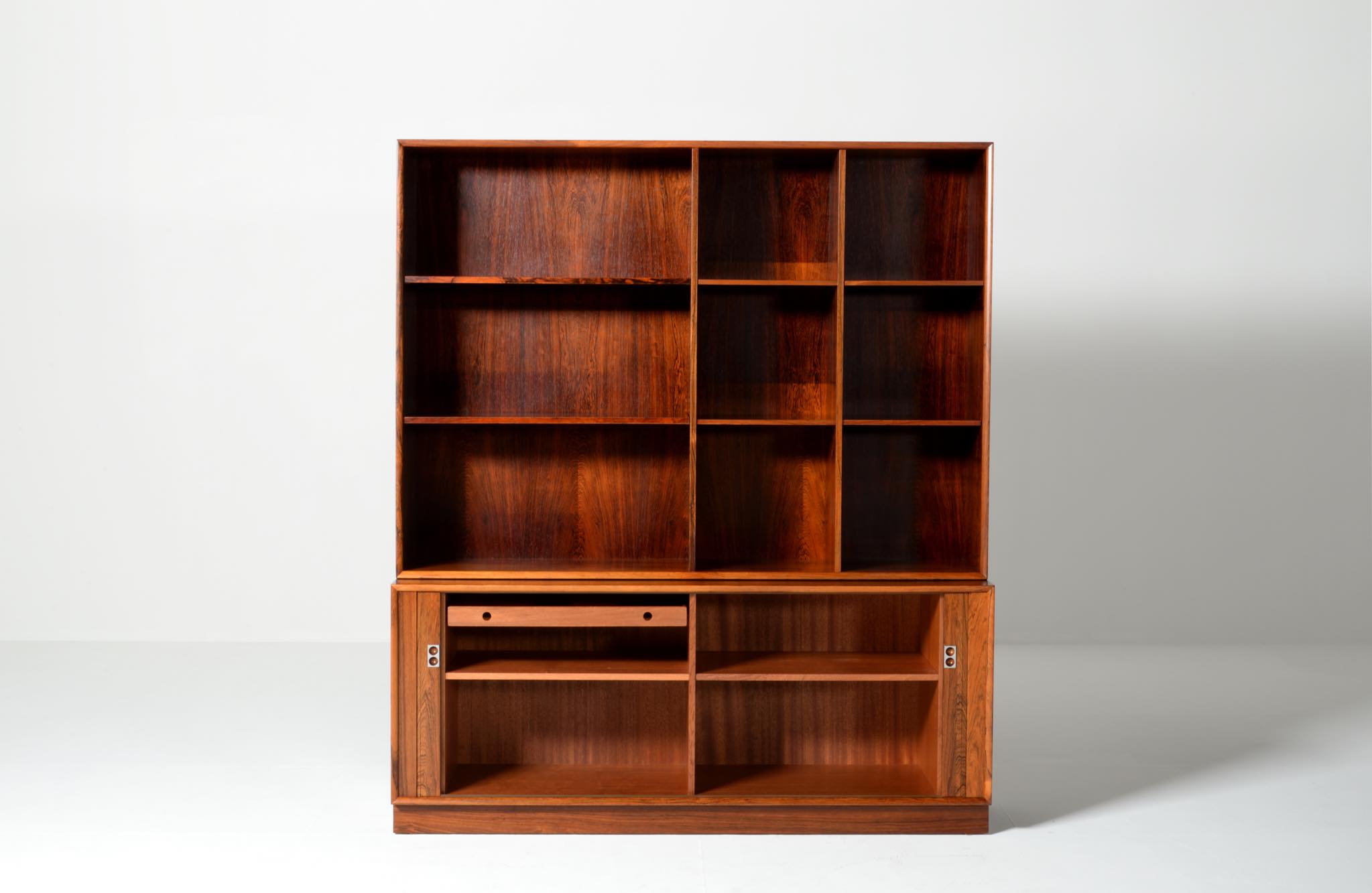 Arne Vodder/アルネ・ヴォッダーによるブックケースキャビネット、1960年代に作られたものでしょう。ローズウッドを用いたもので、蛇腹の扉が特徴です。指を挿し込んで開閉する引手は、1960年代当時の新たなデザインの流れを象徴しています。各棚板は差し替えが可能で、必要に応じて棚板の位置を変えることができます。コンディションは良好です。