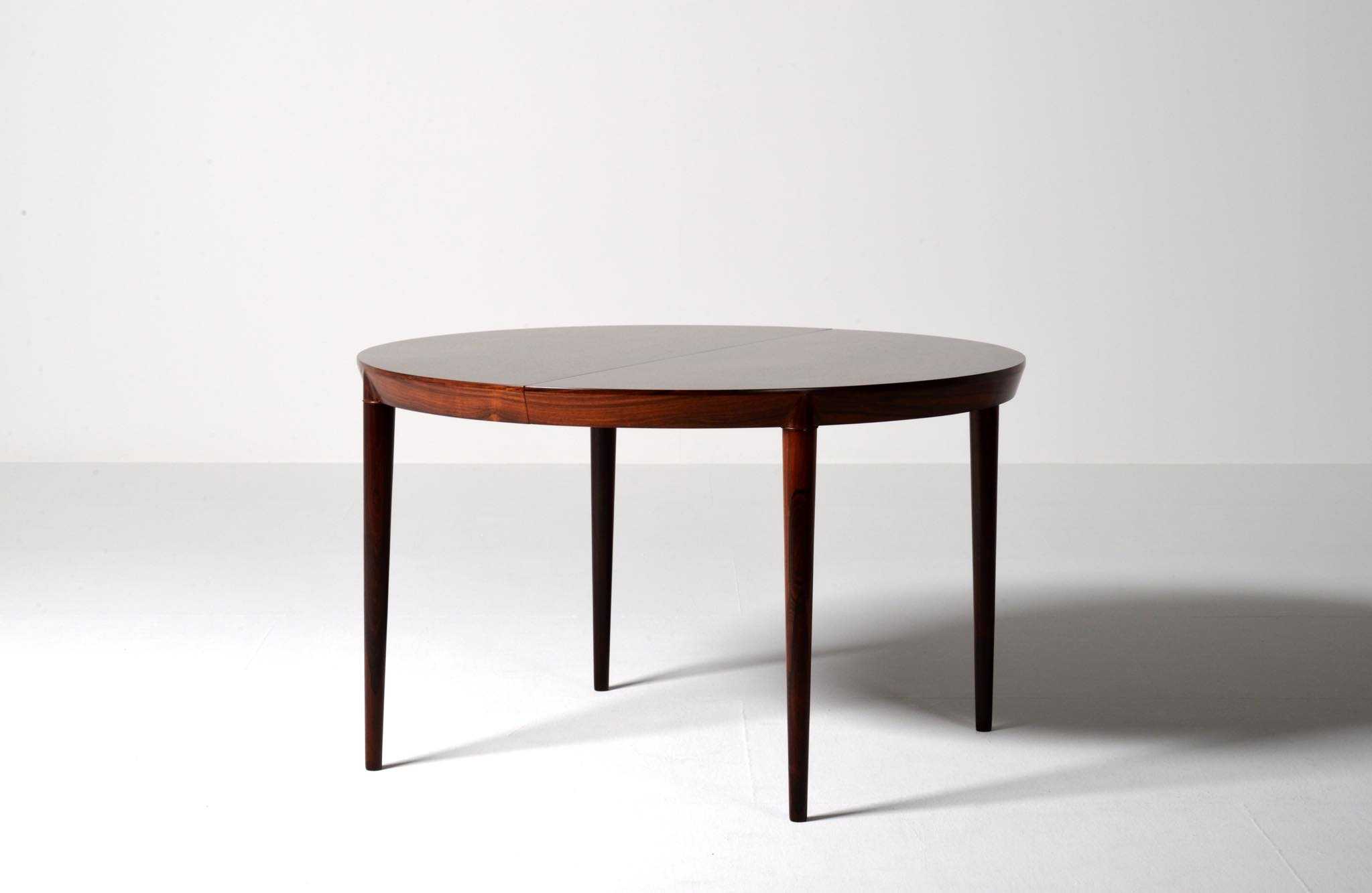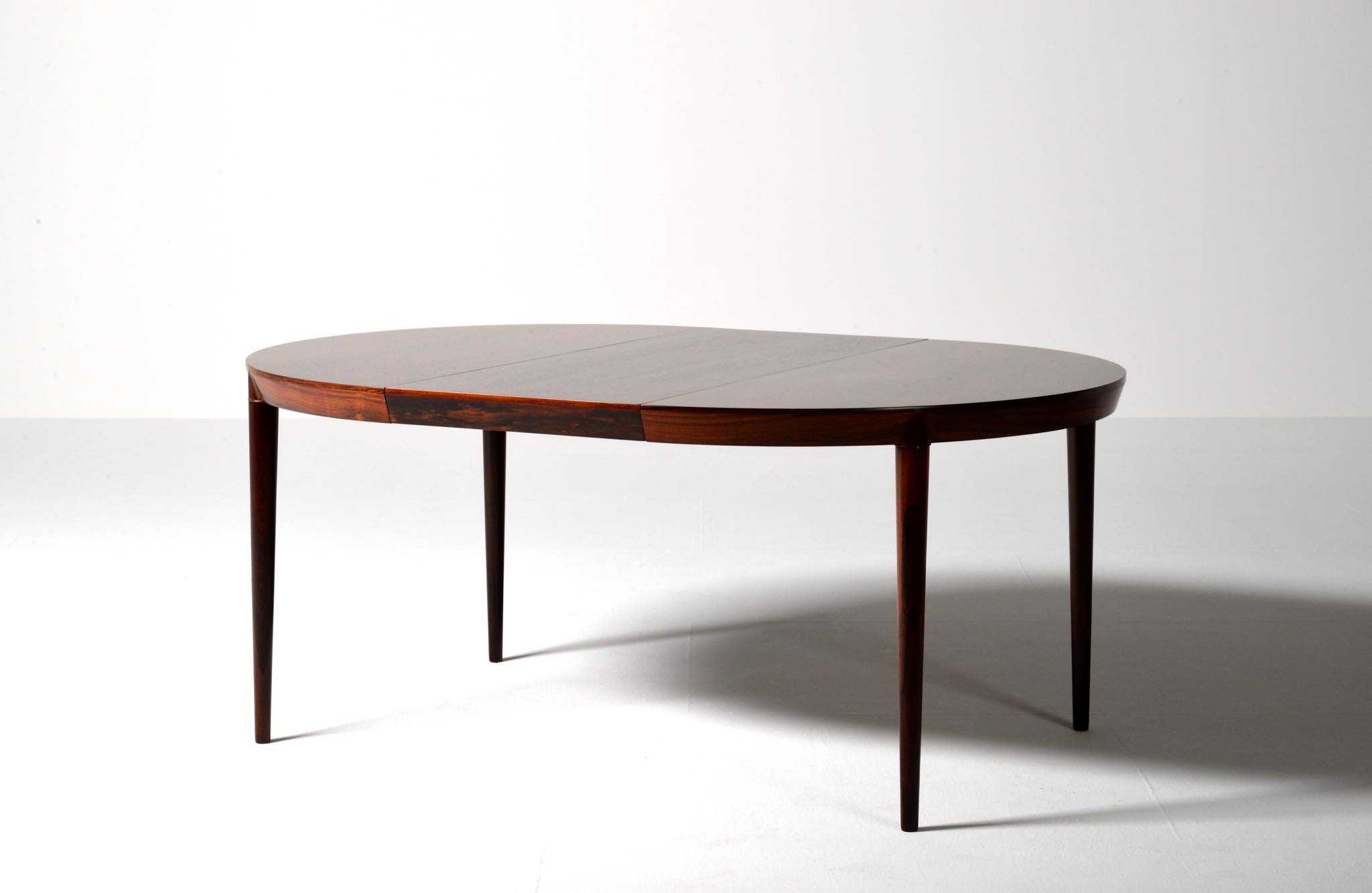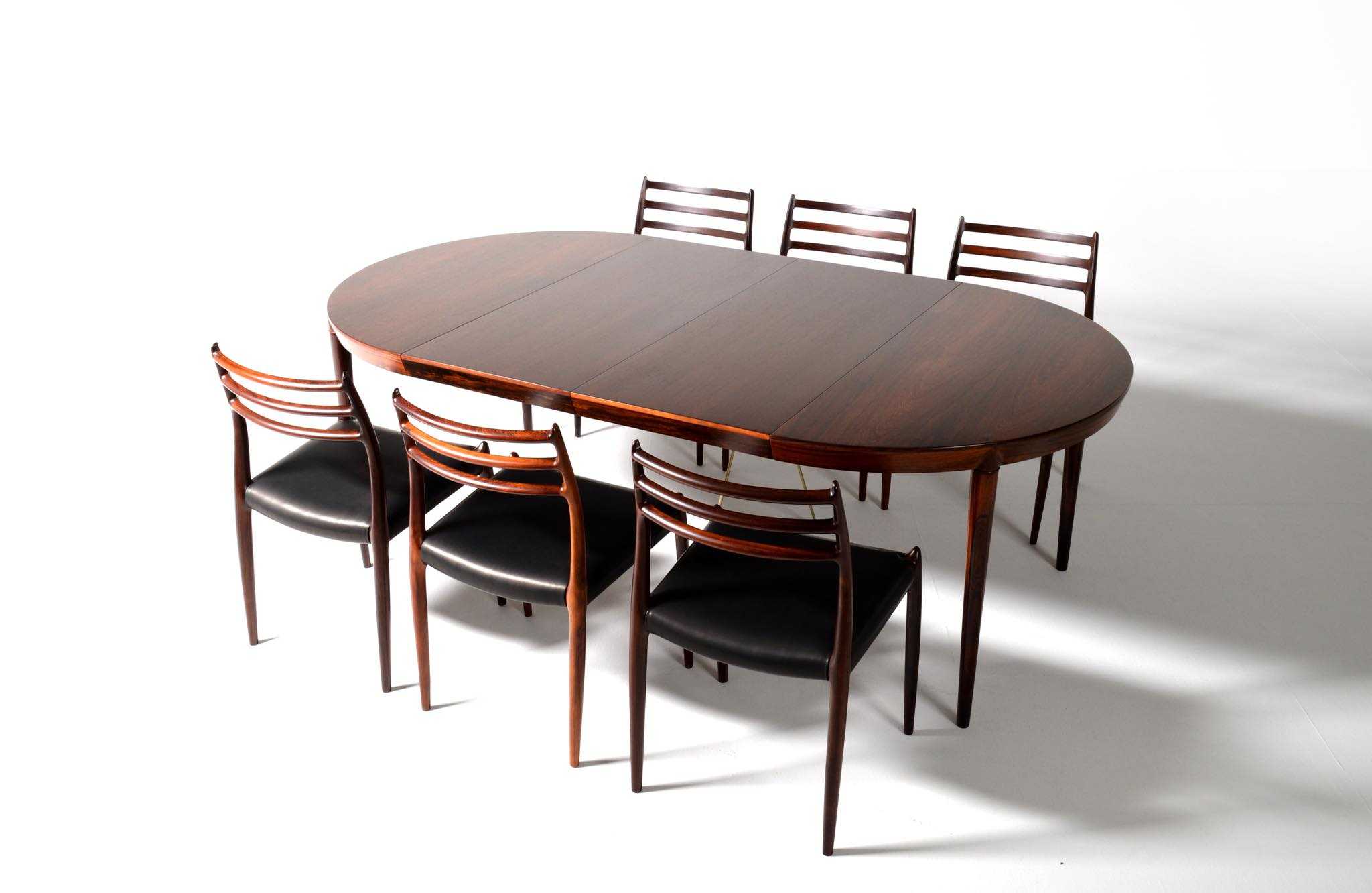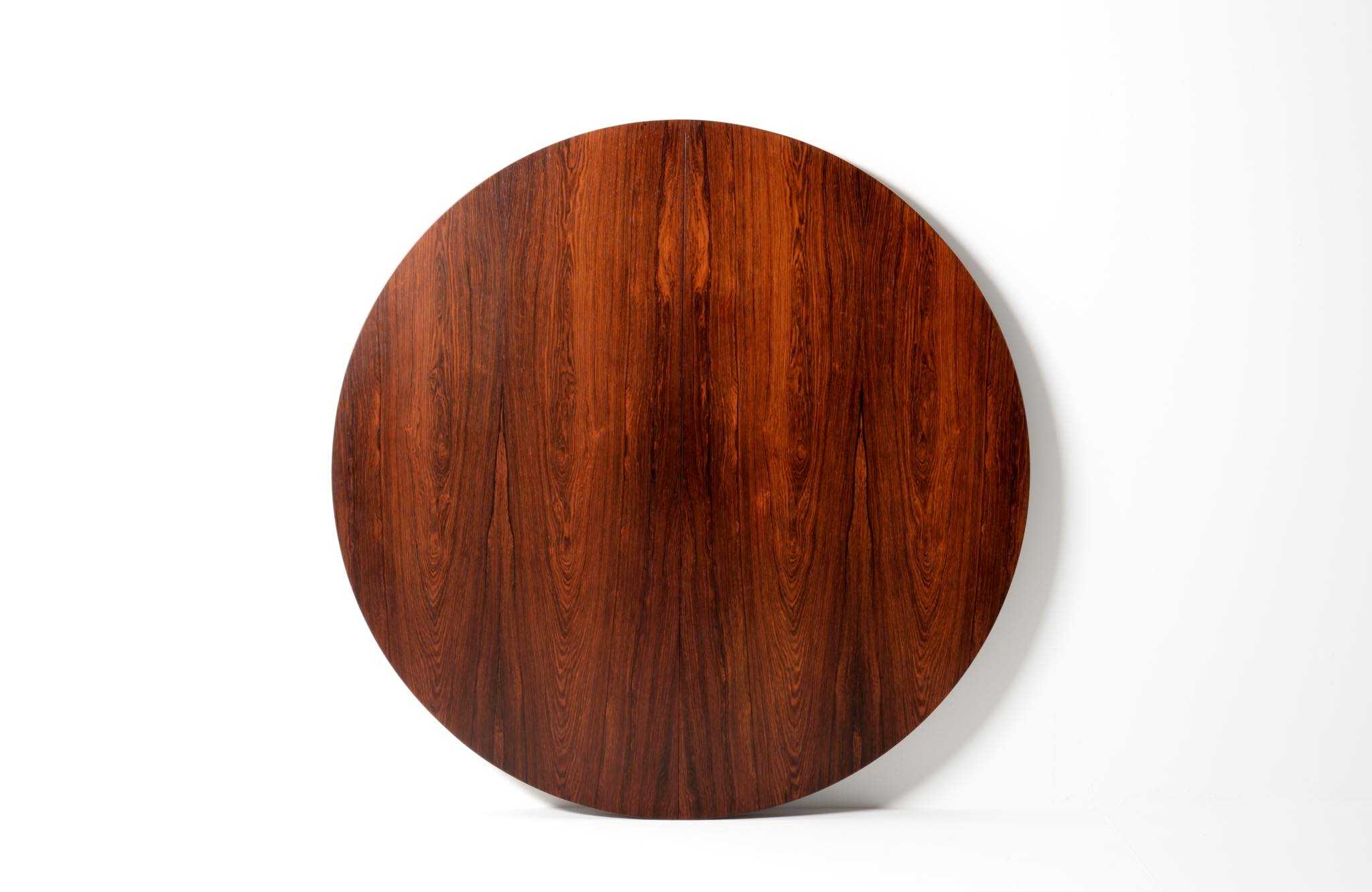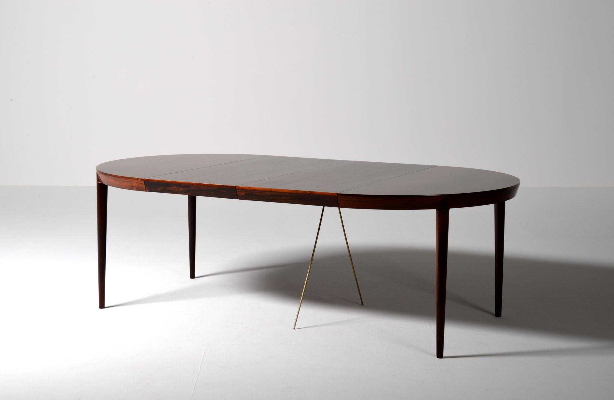 デンマークの家具デザイナー、Erik Riisager Hansen/エリック・リサガー・ハンセンによるダイニングテーブルです。1960年代頃に作られたものでしょう。脚の接合に特徴があり、有機的でシャープなデザインのモデルです。ブラジル原産と思しきローズウッドが木取りされており、ダイナミックな板目文様が魅力です。エクステンションリーフが2枚付属し、天板面積の拡張が行えます。天板表面は再塗装を施しました。主天板に僅かなパテ処理がありますが、コンディションは良好です。