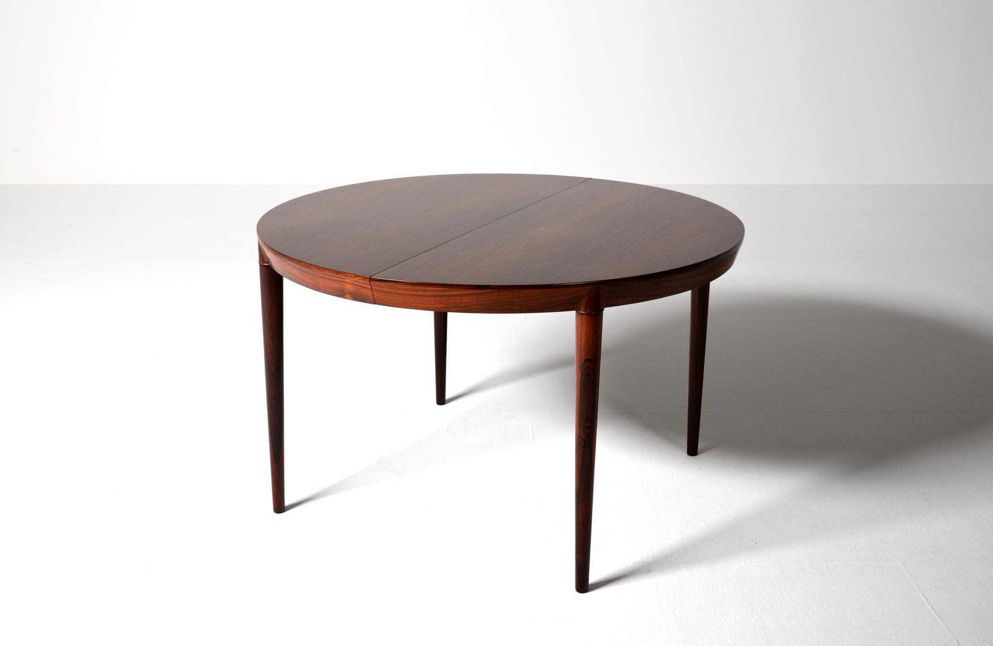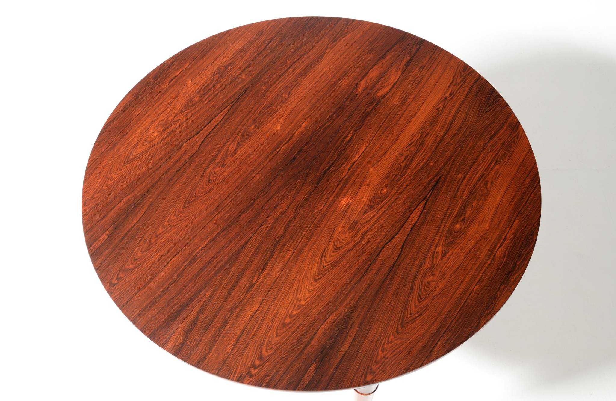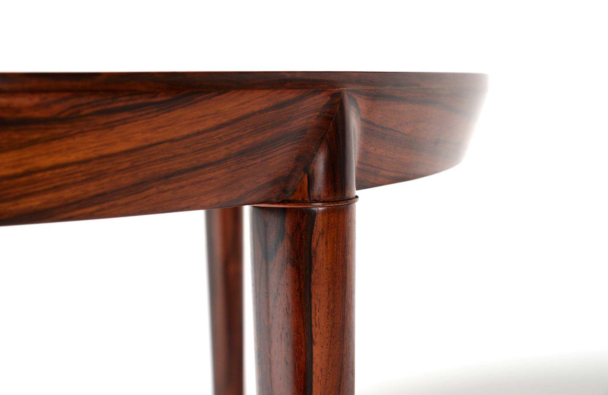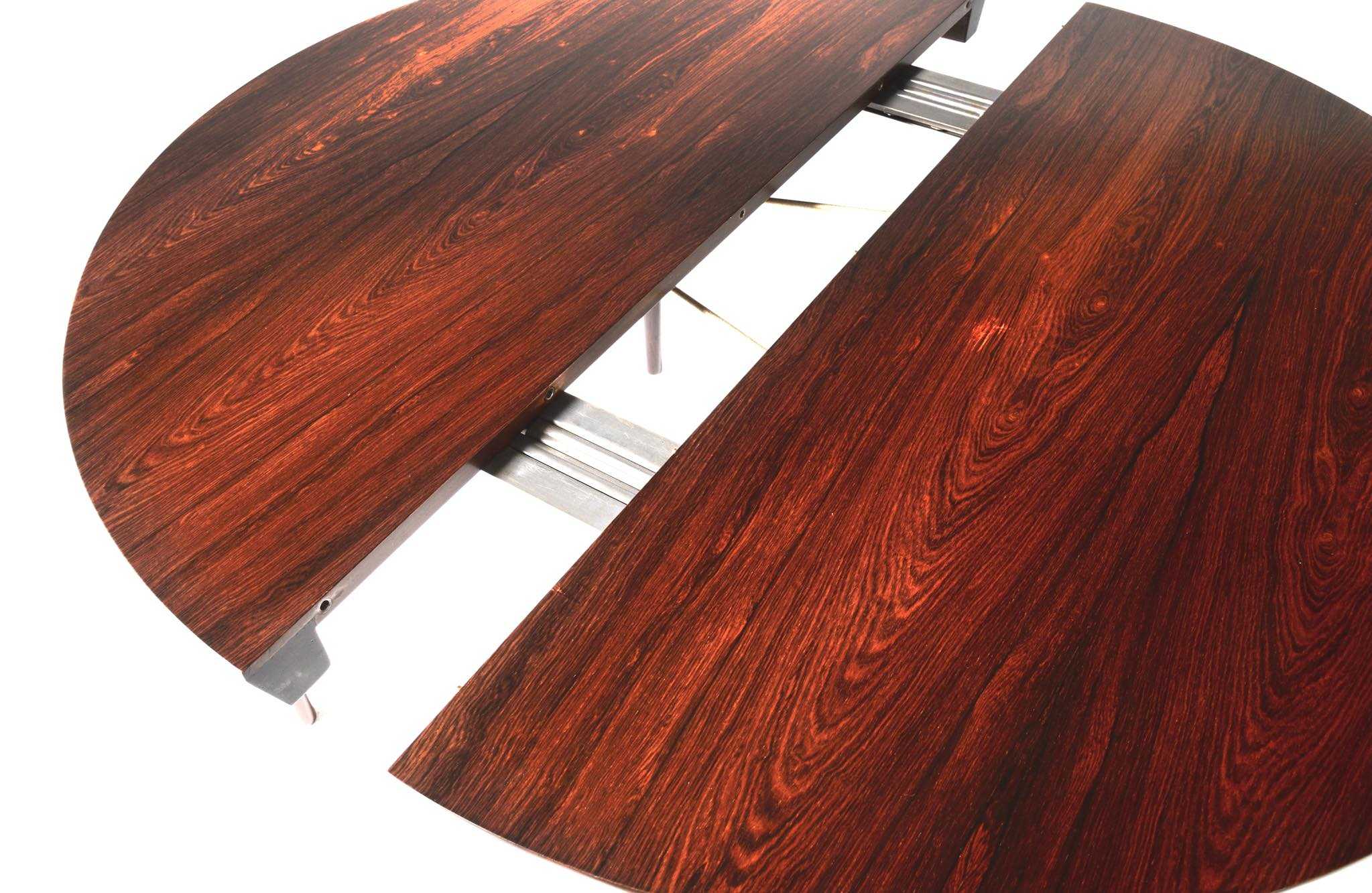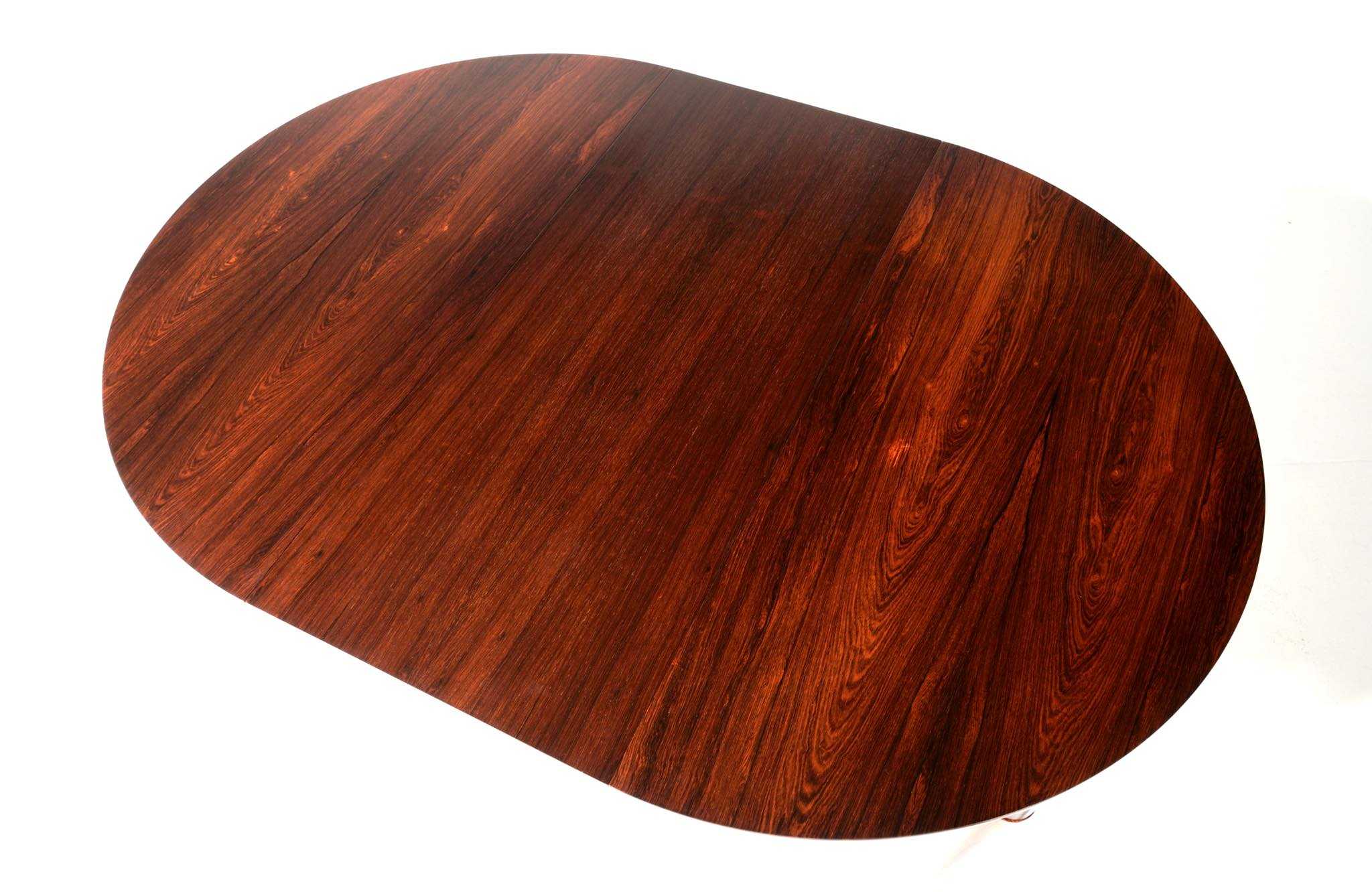 デンマークの家具デザイナー、Erik Riisager Hansen/エリック・リサガー・ハンセンによるダイニングテーブルです。1960年代頃に作られたものでしょう。脚の接合に特徴があり、有機的でシャープなデザインのモデルです。ブラジル原産と思しきローズウッドが木取りされており、ダイナミックな板目文様が魅力です。エクステンションリーフが2枚付属し、天板面積の拡張が行えます。天板表面は再塗装を施しました。主天板に僅かなパテ処理がありますが、コンディションは良好です。