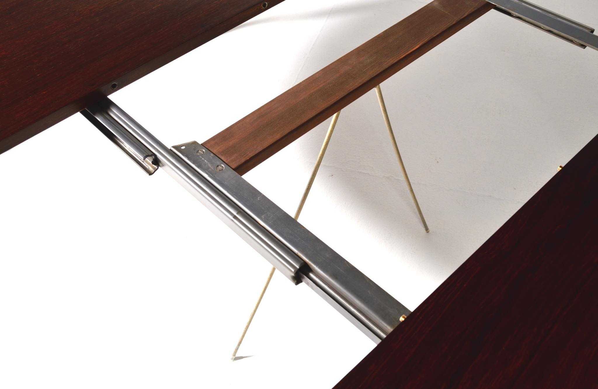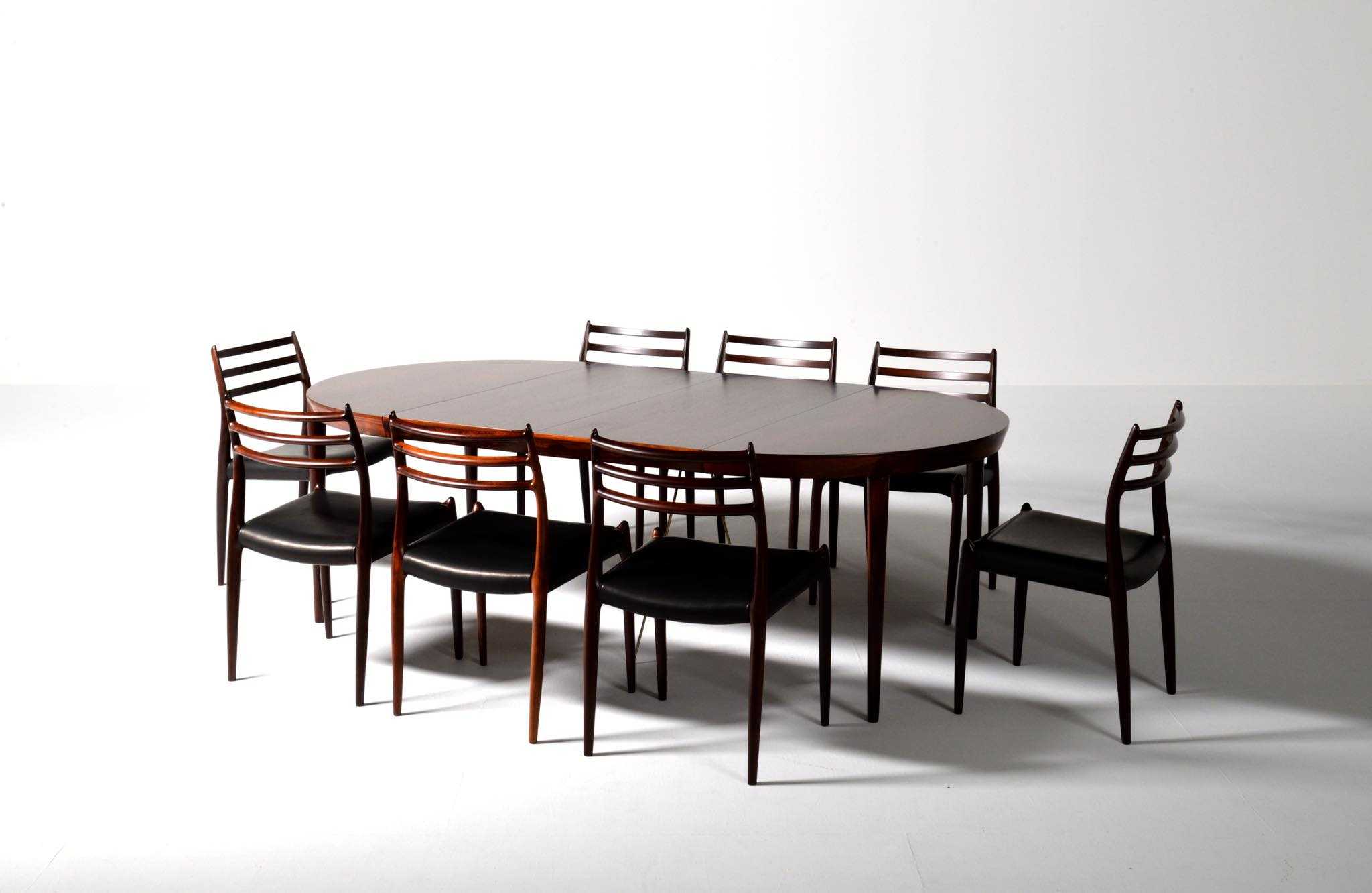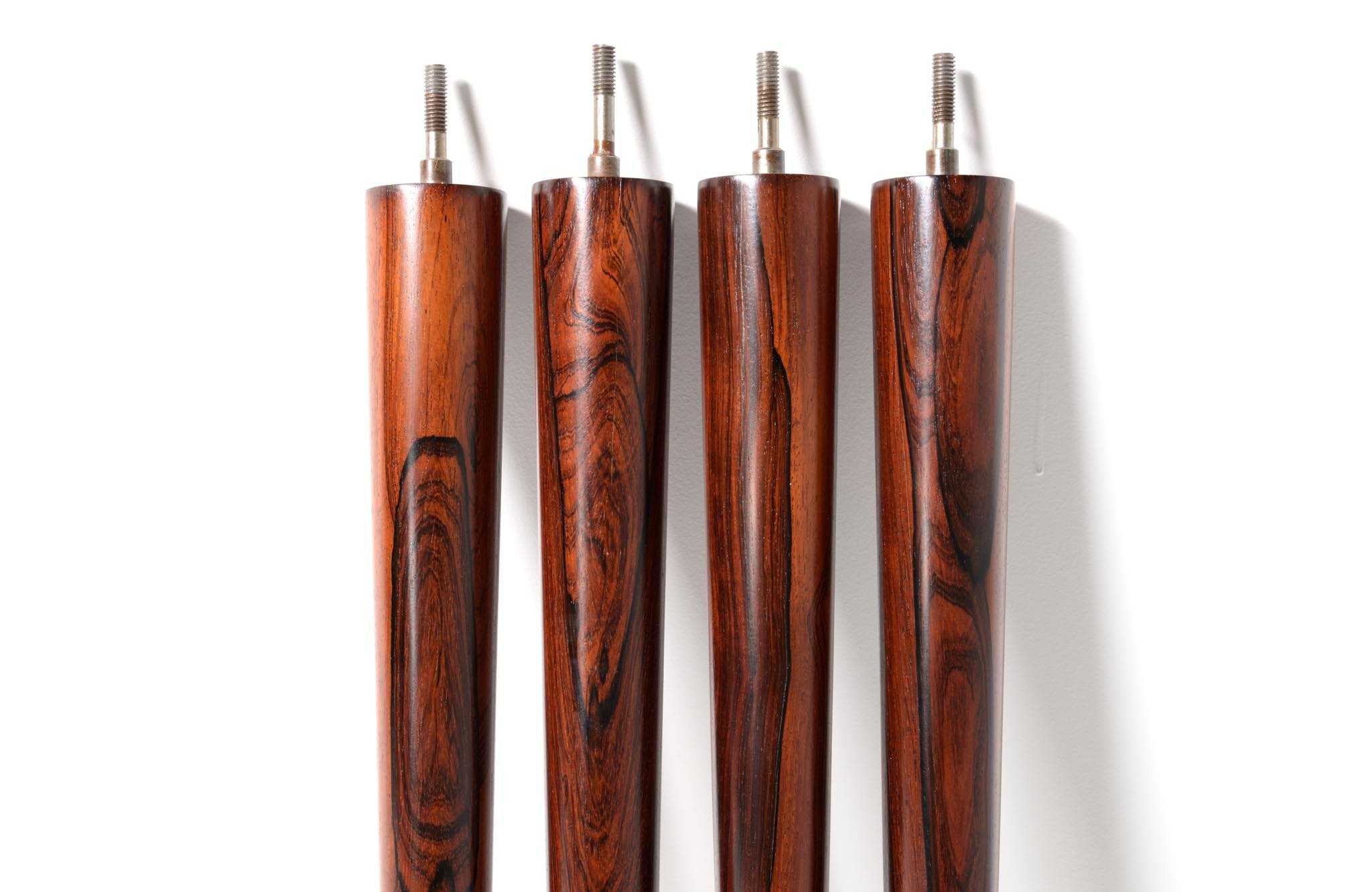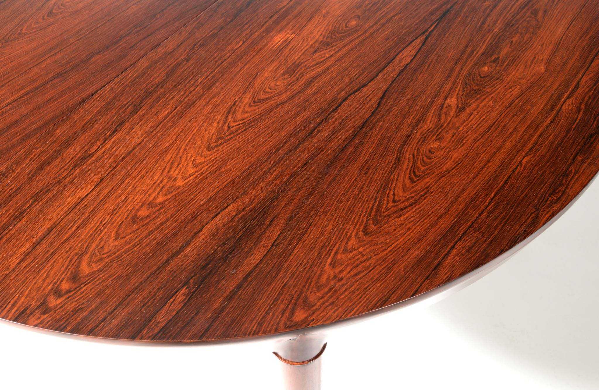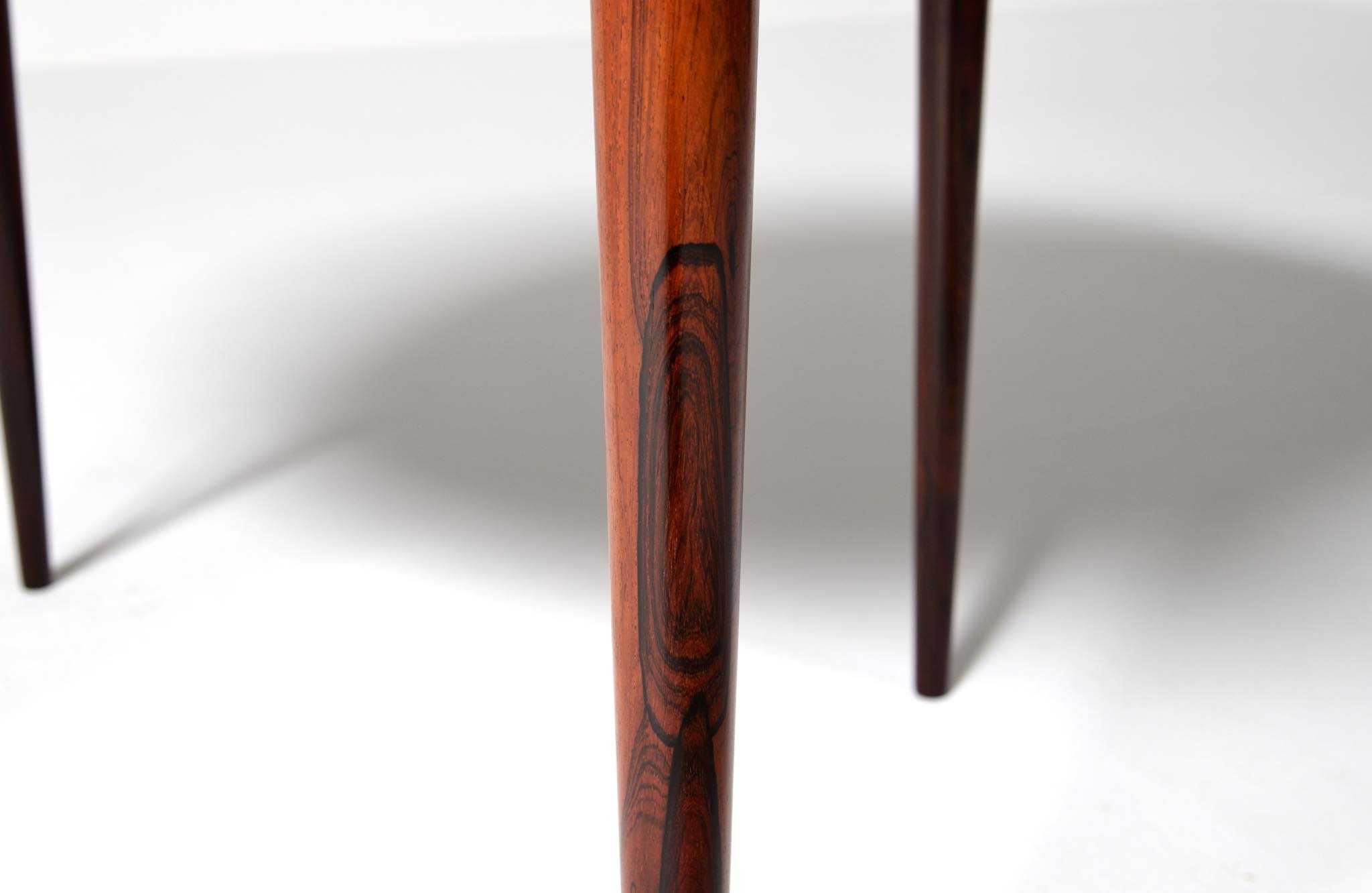 デンマークの家具デザイナー、Erik Riisager Hansen/エリック・リサガー・ハンセンによるダイニングテーブルです。1960年代頃に作られたものでしょう。脚の接合に特徴があり、有機的でシャープなデザインのモデルです。ブラジル原産と思しきローズウッドが木取りされており、ダイナミックな板目文様が魅力です。エクステンションリーフが2枚付属し、天板面積の拡張が行えます。天板表面は再塗装を施しました。主天板に僅かなパテ処理がありますが、コンディションは良好です。