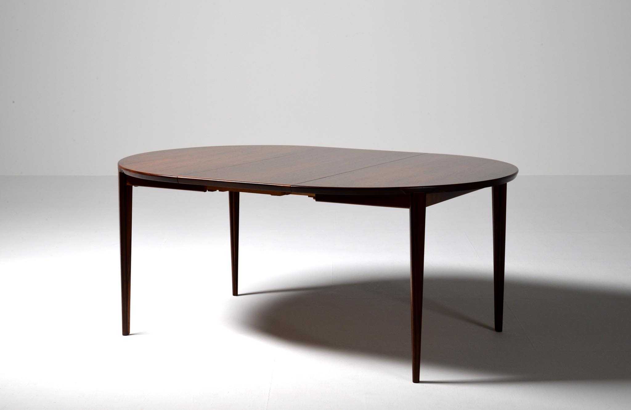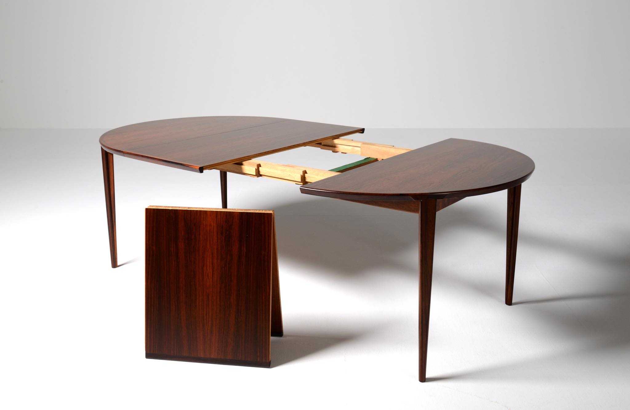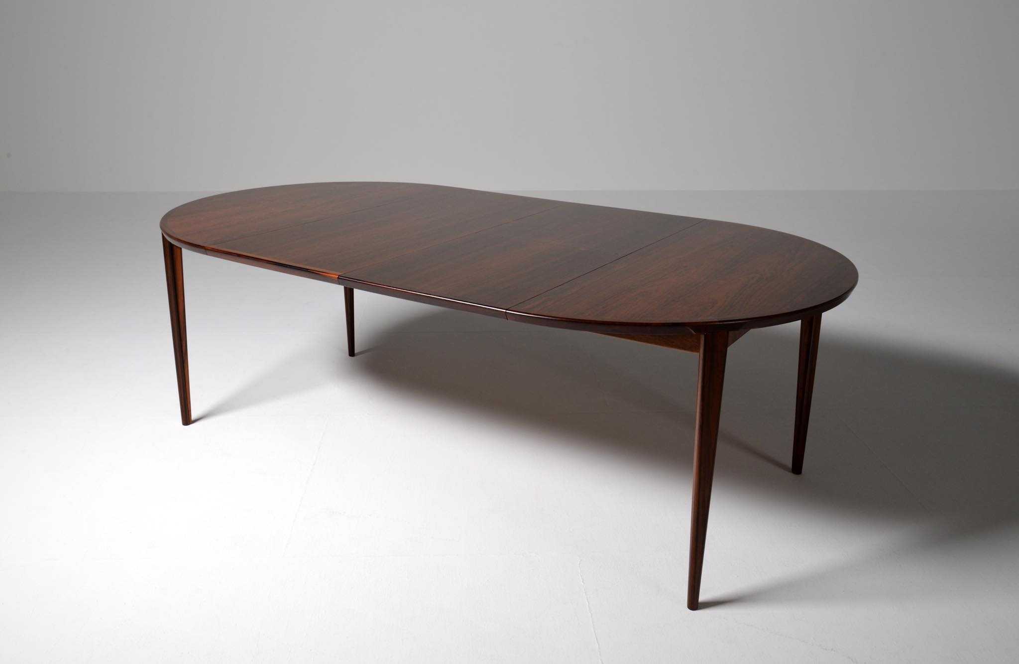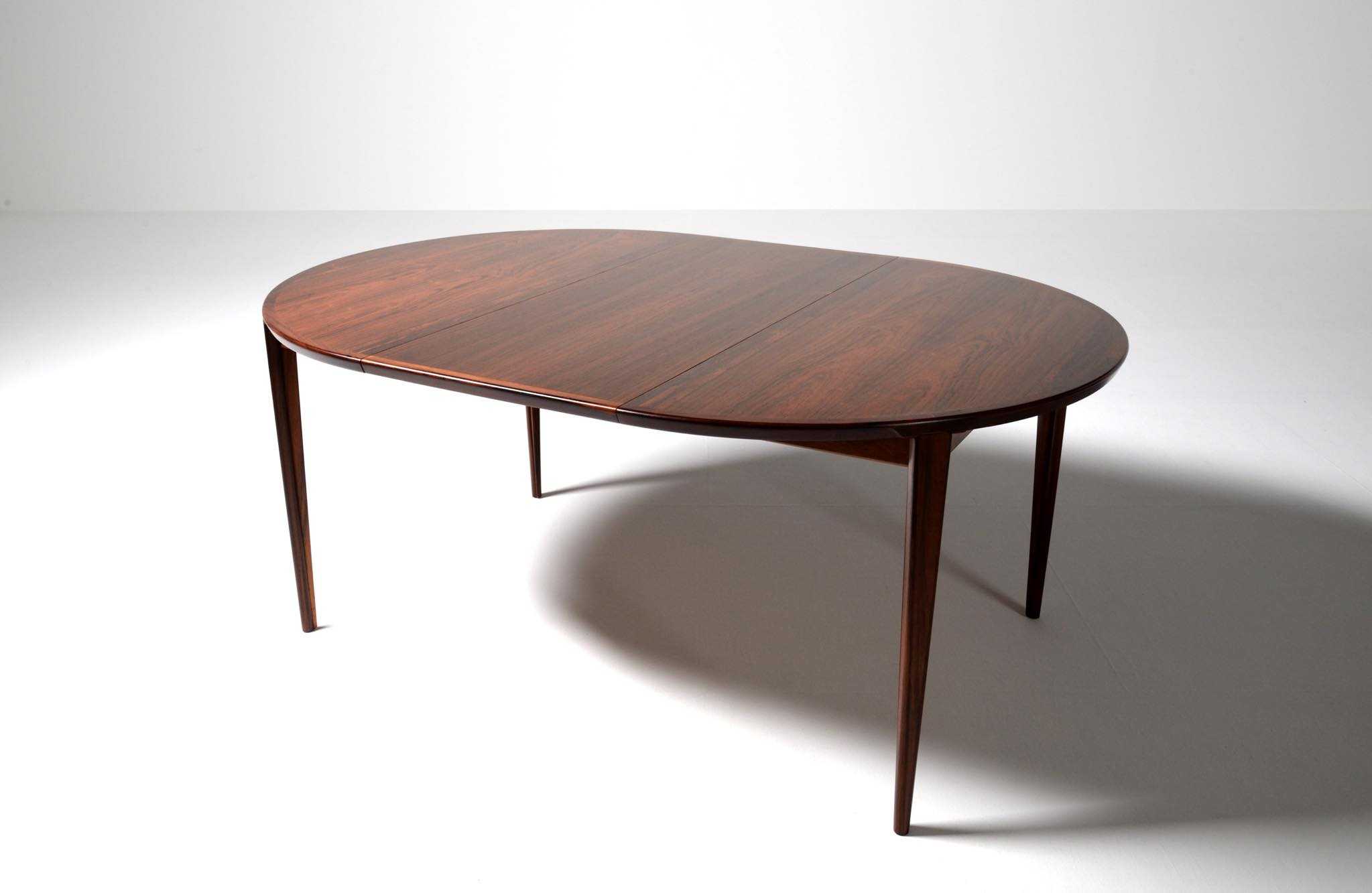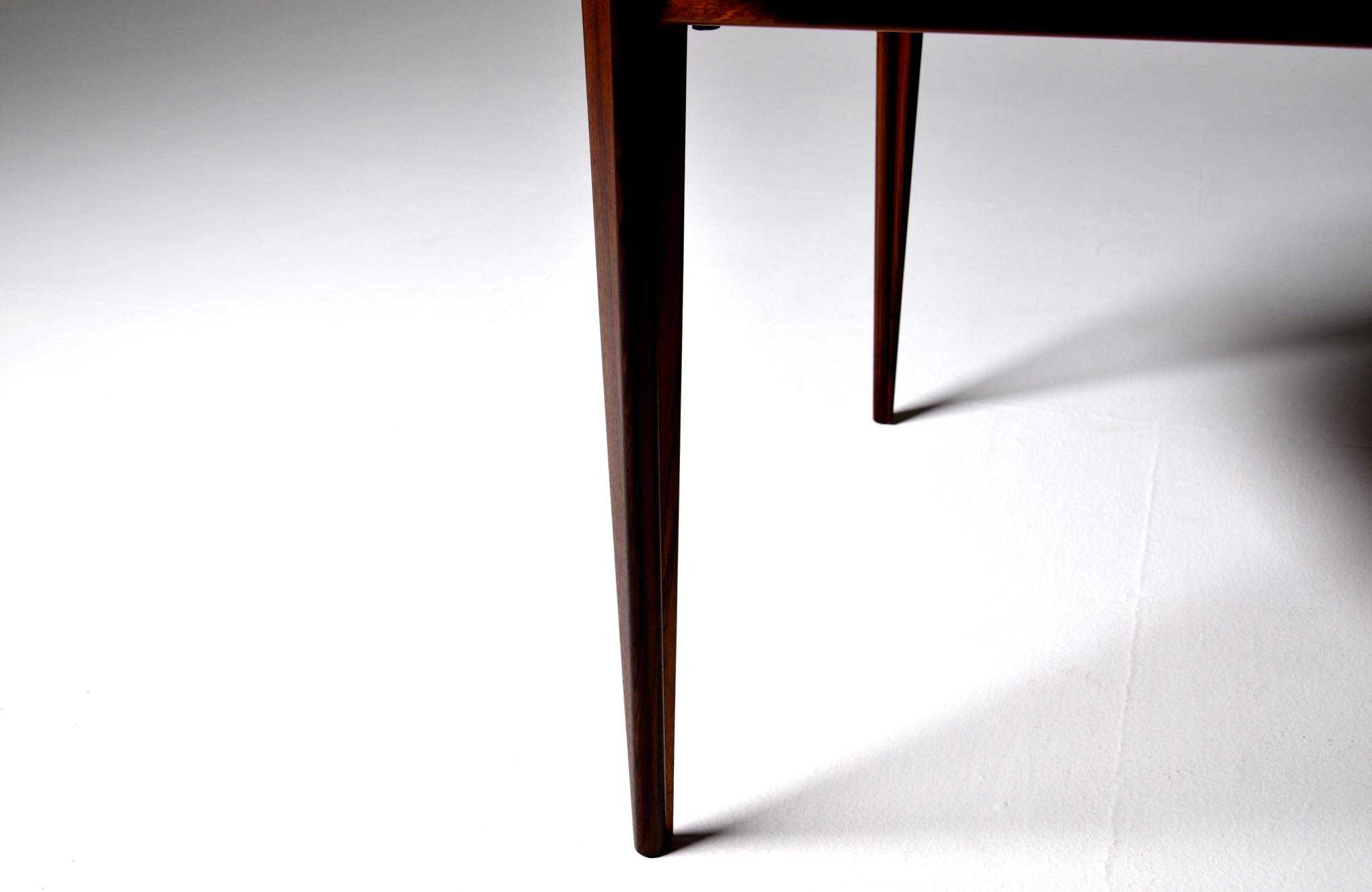 1960年代頃に活動した家具デザイナーでキャビネットメーカーのHenry Rosengren Hansen/ヘンリー・ローセングレン・ハンセンによるダイニングテーブルです。天板のエッジとそれに連なる脚の接合に特徴があり、高度な技術と特異なデザインが魅力のテーブルです。脚は角や丸ではなく「T」字型で作られており、より薄く空間的な圧迫感を軽減させながら強度を保てるように設計されています。表面の塗膜に劣化が見られたため再塗装を施しました。主天板のエクステンションリーフを設置する面に僅かな呼継補修がありますが、コンディションは良好です。