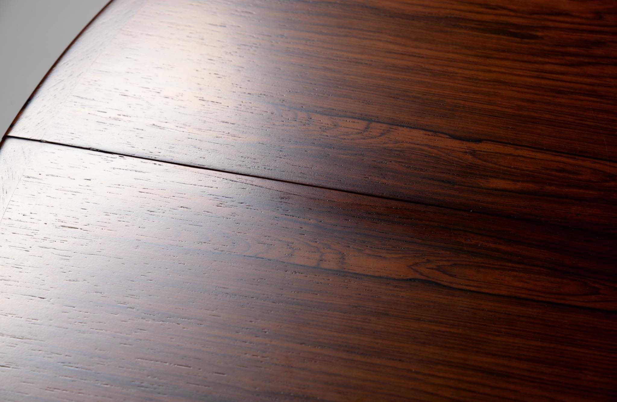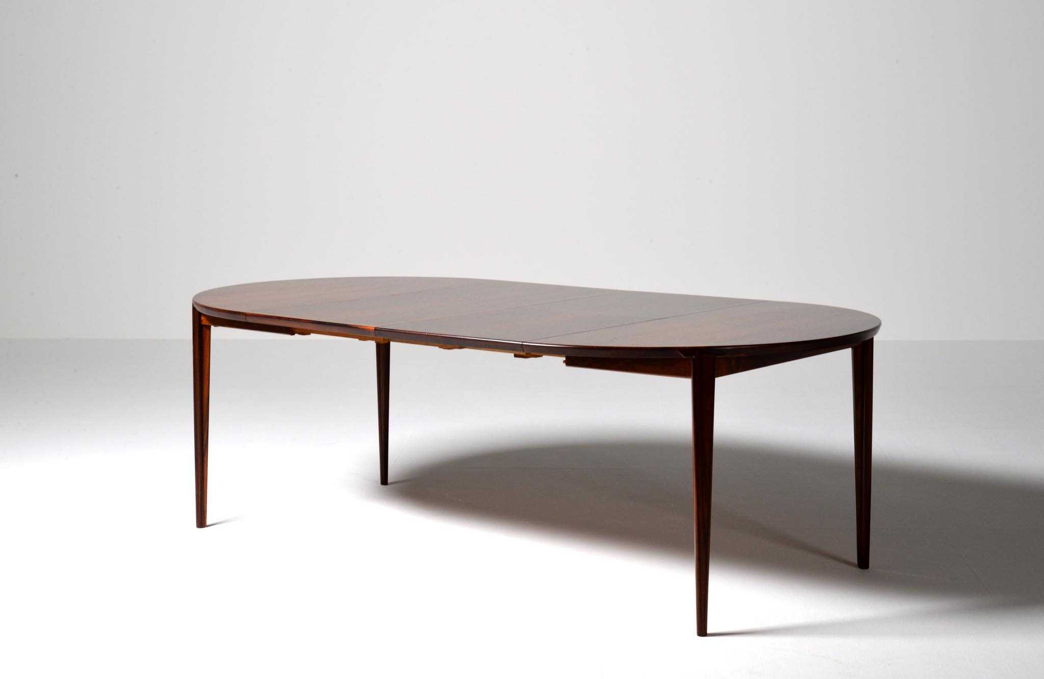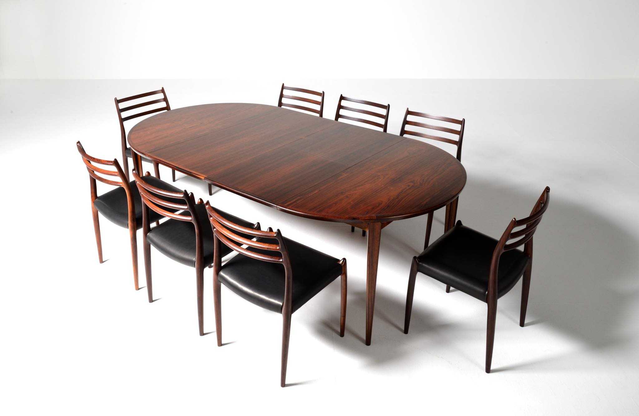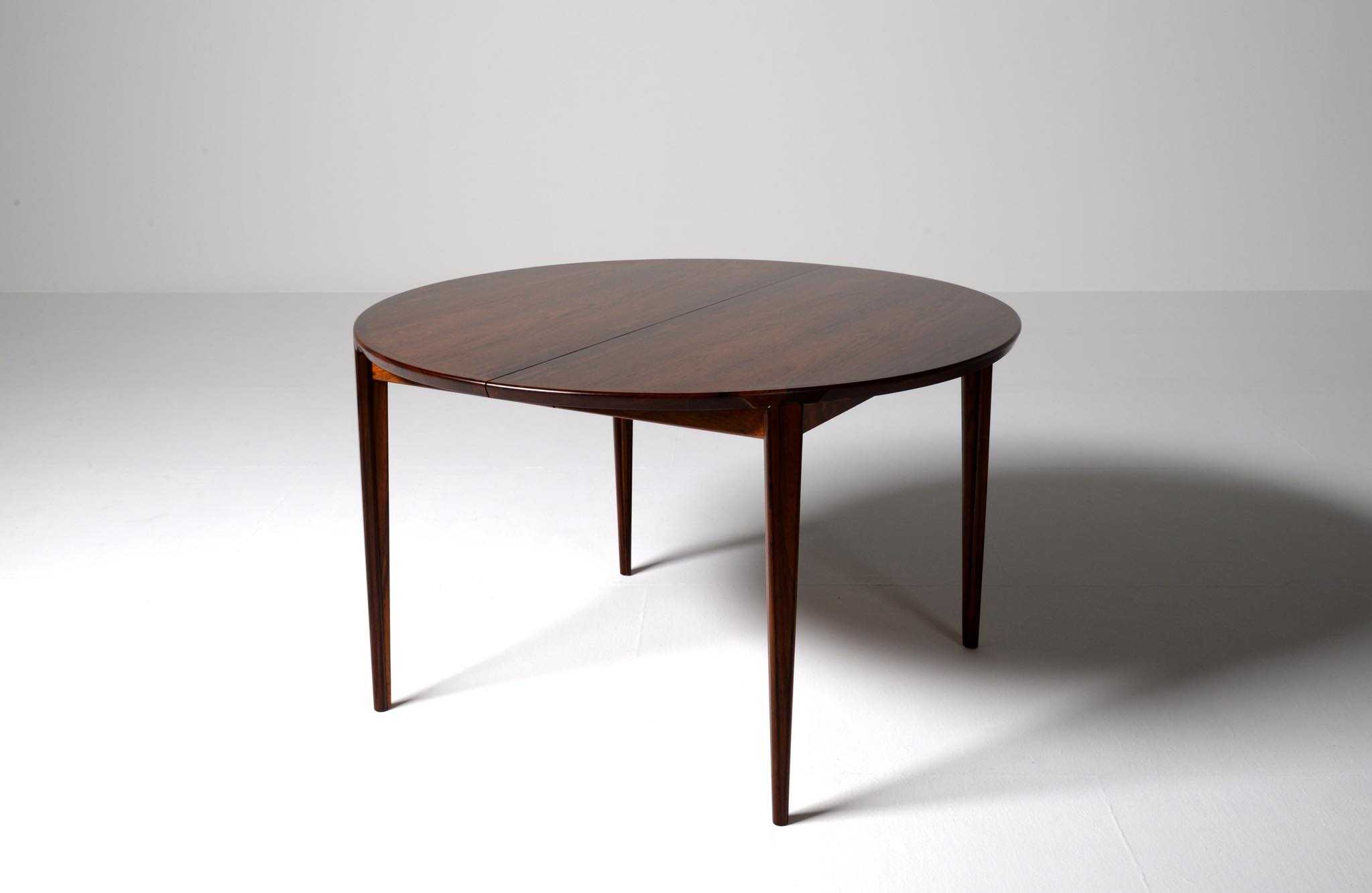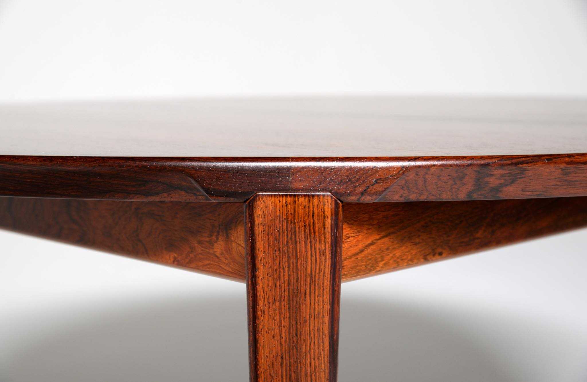 1960年代頃に活動した家具デザイナーでキャビネットメーカーのHenry Rosengren Hansen/ヘンリー・ローセングレン・ハンセンによるダイニングテーブルです。天板のエッジとそれに連なる脚の接合に特徴があり、高度な技術と特異なデザインが魅力のテーブルです。脚は角や丸ではなく「T」字型で作られており、より薄く空間的な圧迫感を軽減させながら強度を保てるように設計されています。表面の塗膜に劣化が見られたため再塗装を施しました。主天板のエクステンションリーフを設置する面に僅かな呼継補修がありますが、コンディションは良好です。