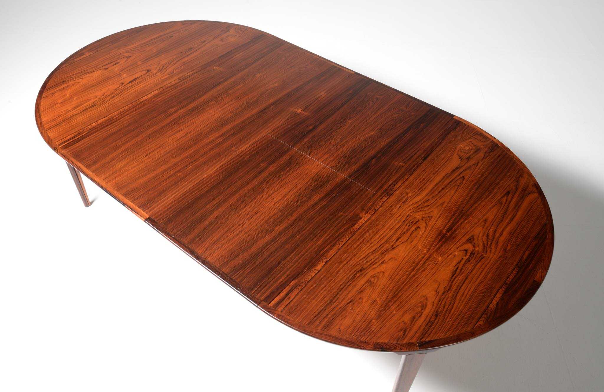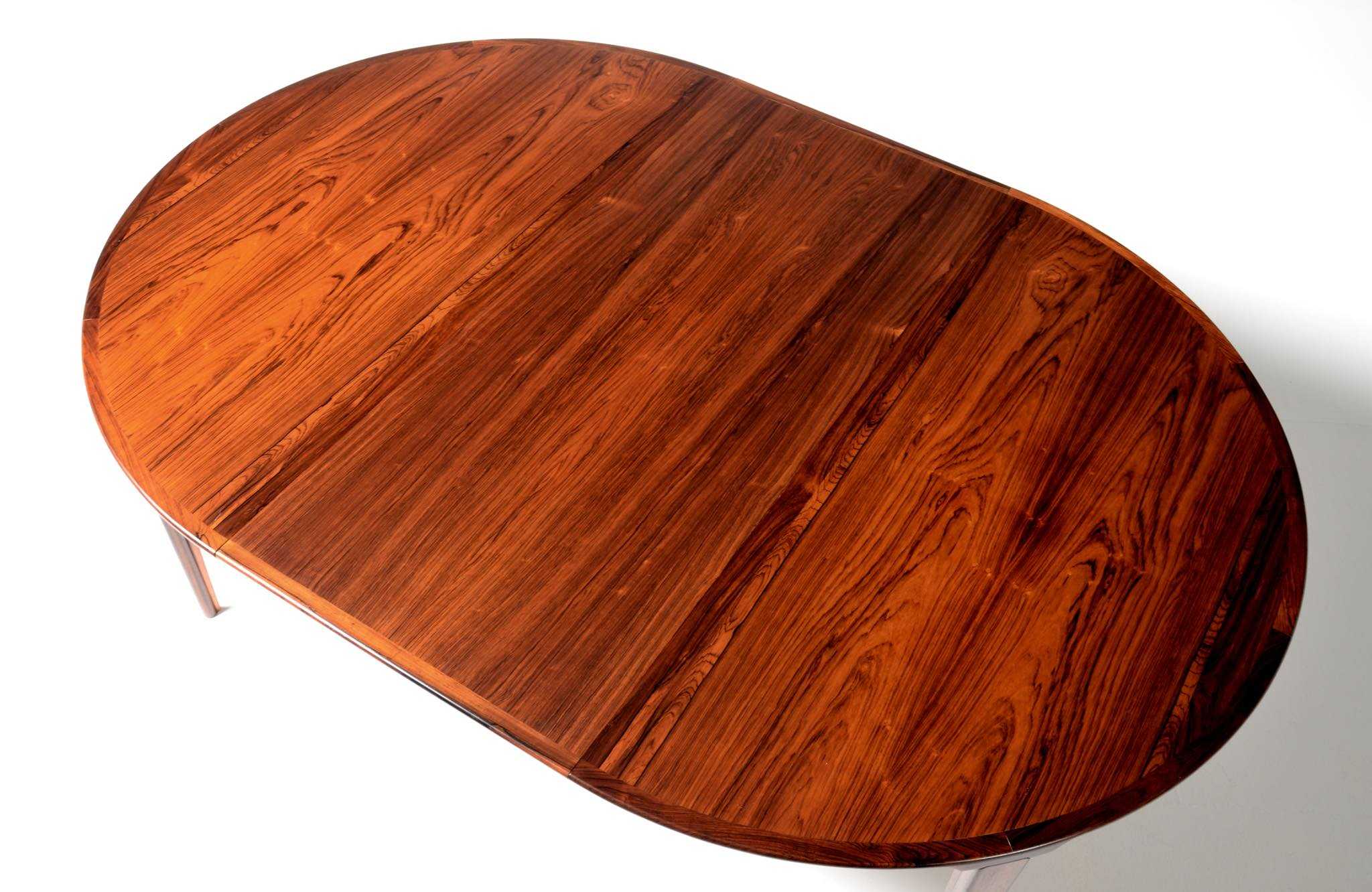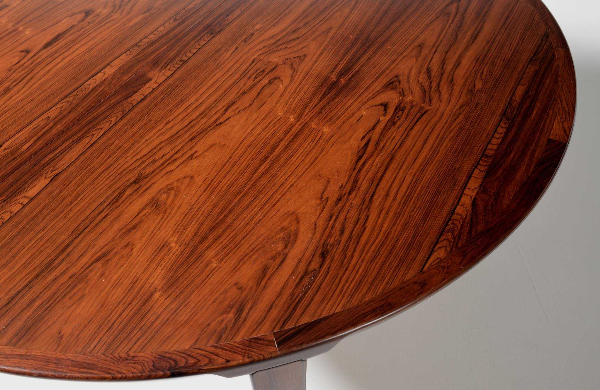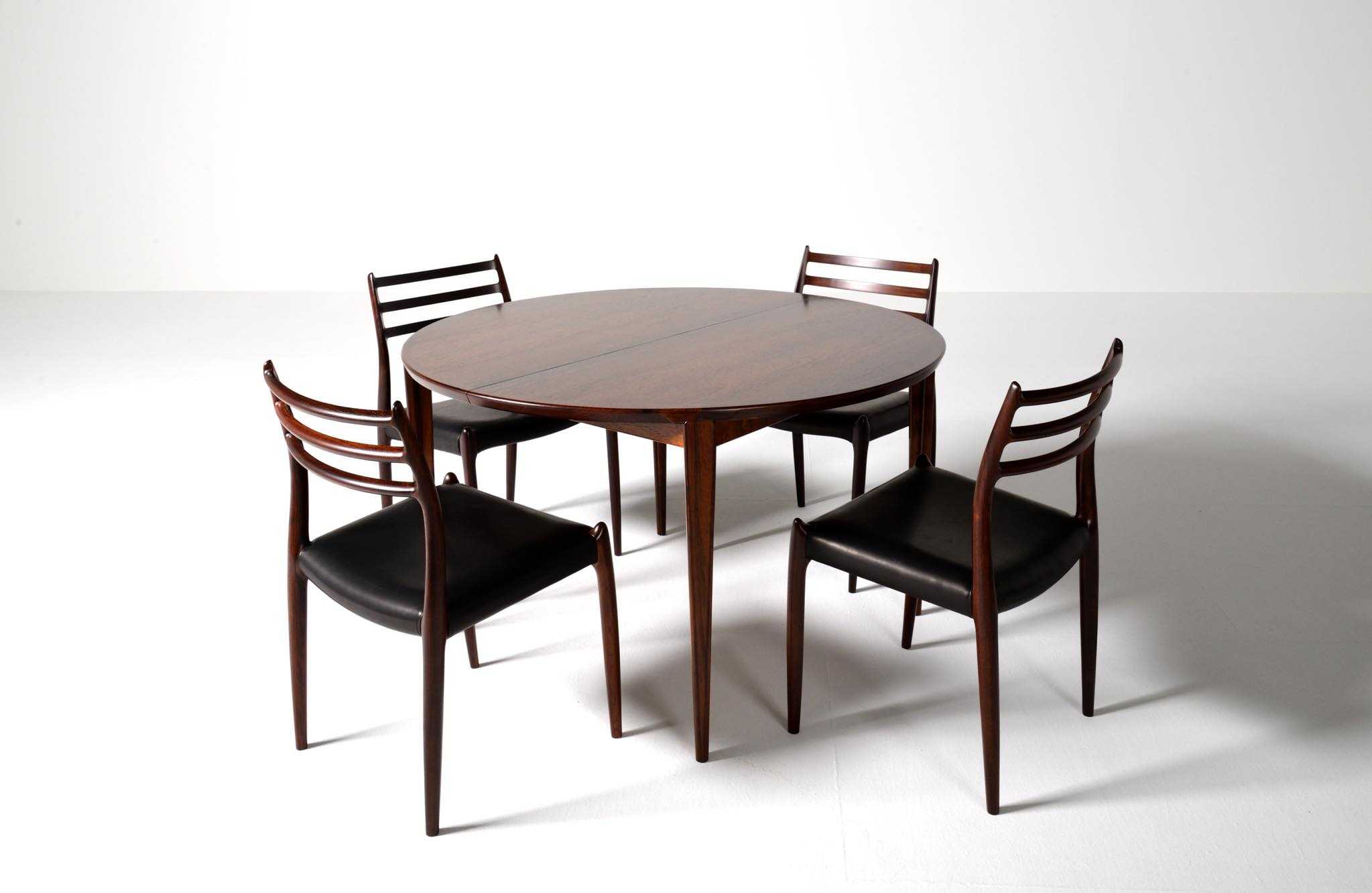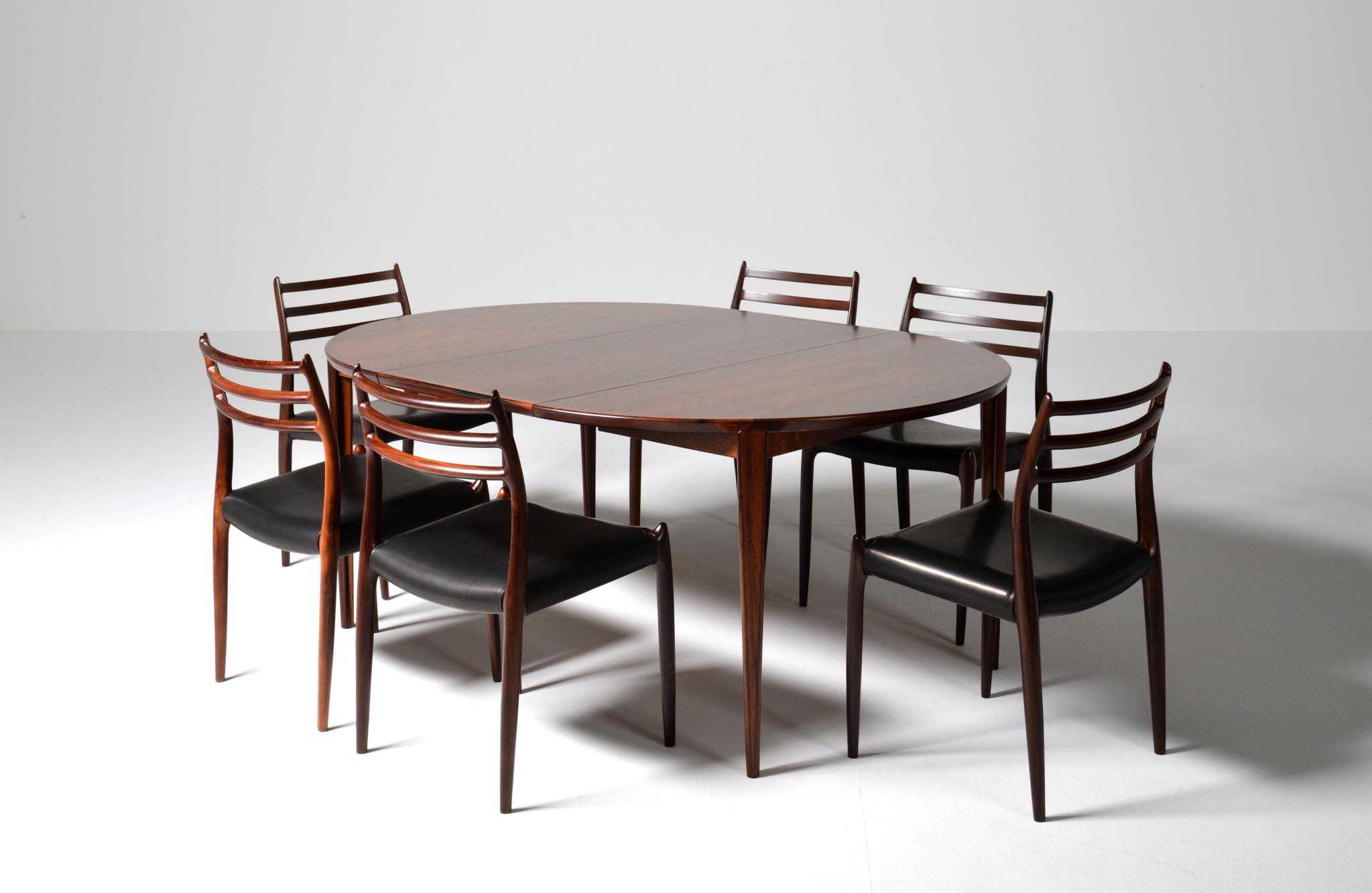 1960年代頃に活動した家具デザイナーでキャビネットメーカーのHenry Rosengren Hansen/ヘンリー・ローセングレン・ハンセンによるダイニングテーブルです。天板のエッジとそれに連なる脚の接合に特徴があり、高度な技術と特異なデザインが魅力のテーブルです。脚は角や丸ではなく「T」字型で作られており、より薄く空間的な圧迫感を軽減させながら強度を保てるように設計されています。表面の塗膜に劣化が見られたため再塗装を施しました。主天板のエクステンションリーフを設置する面に僅かな呼継補修がありますが、コンディションは良好です。