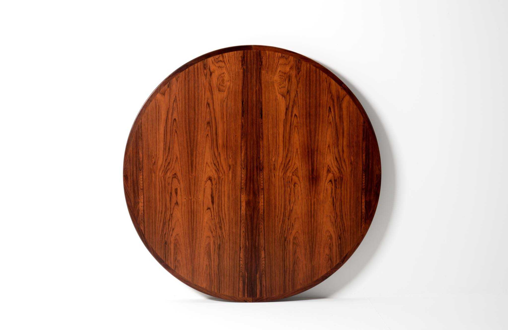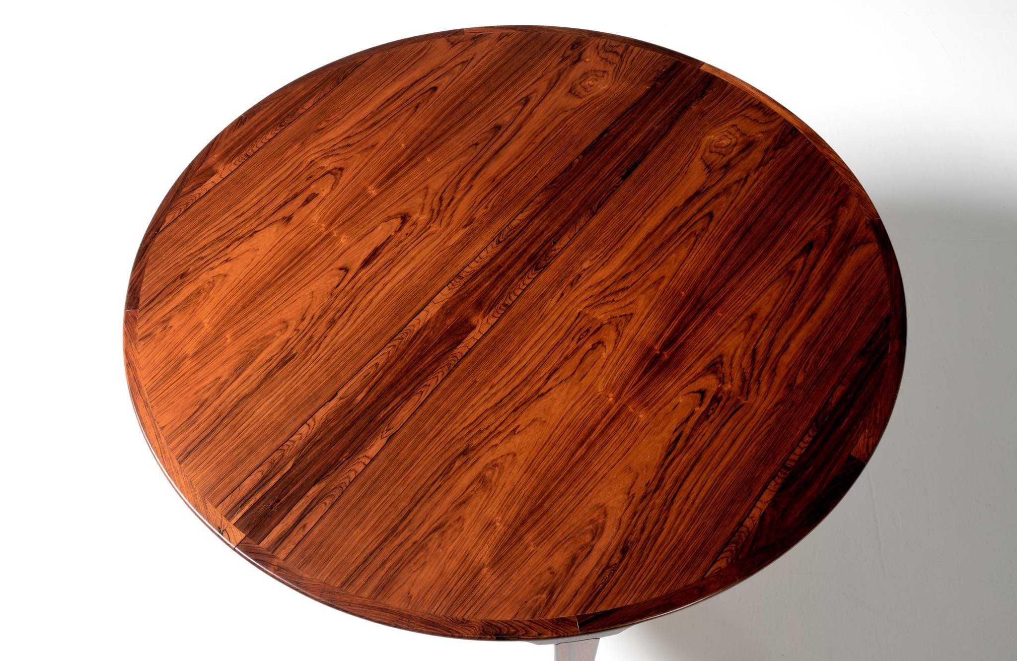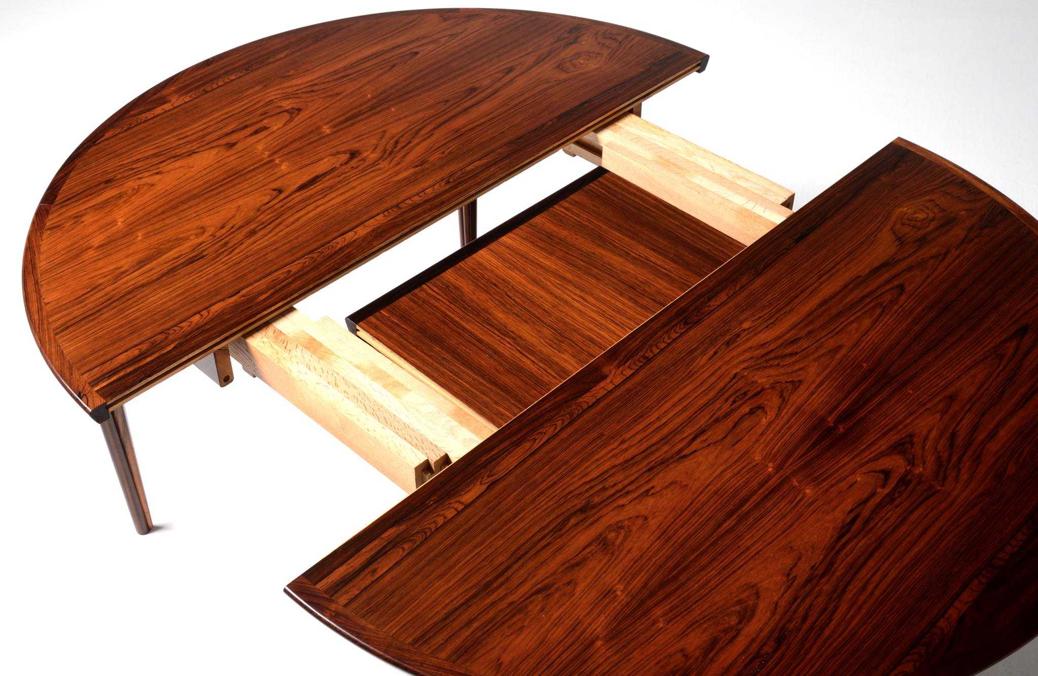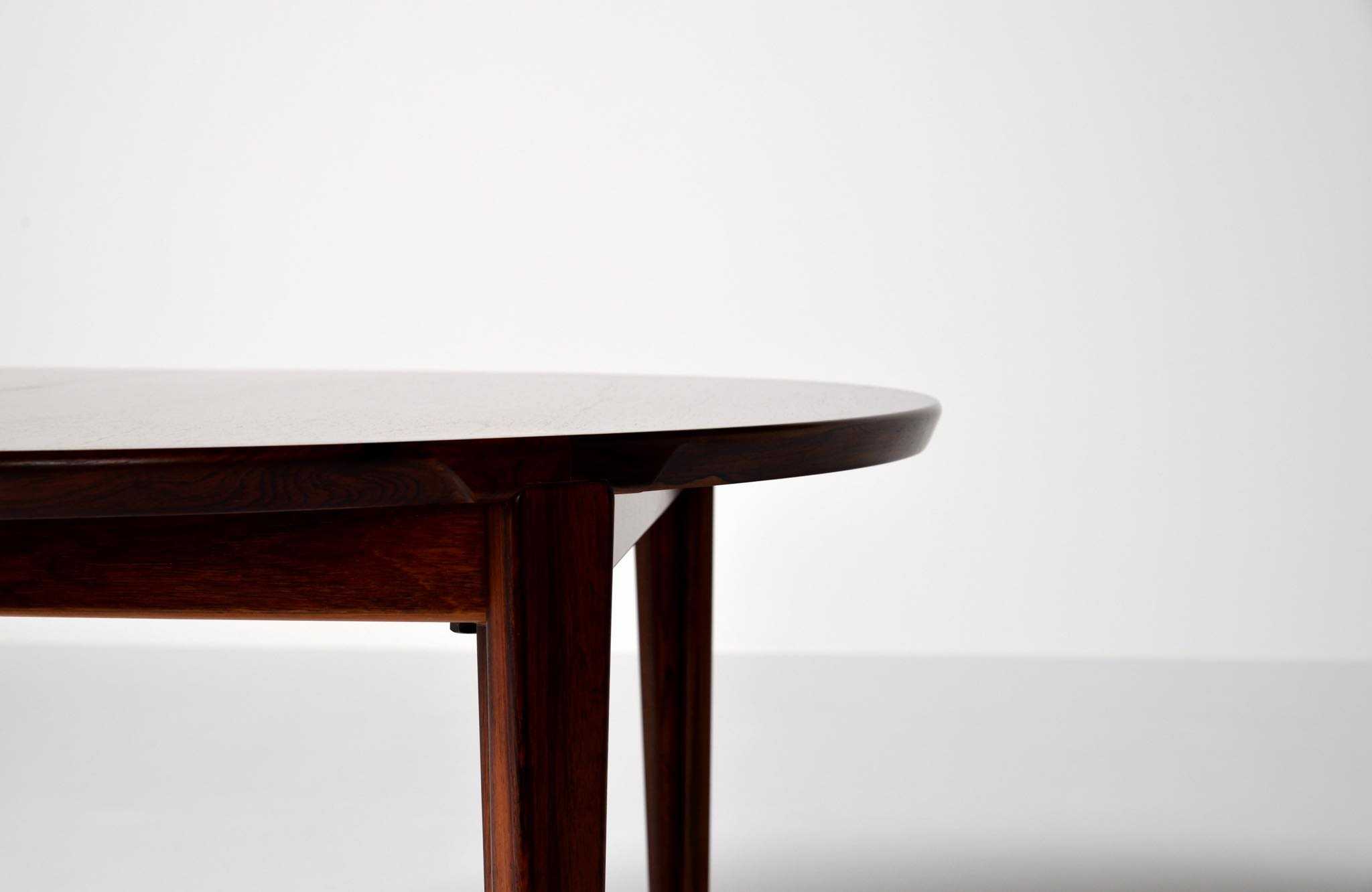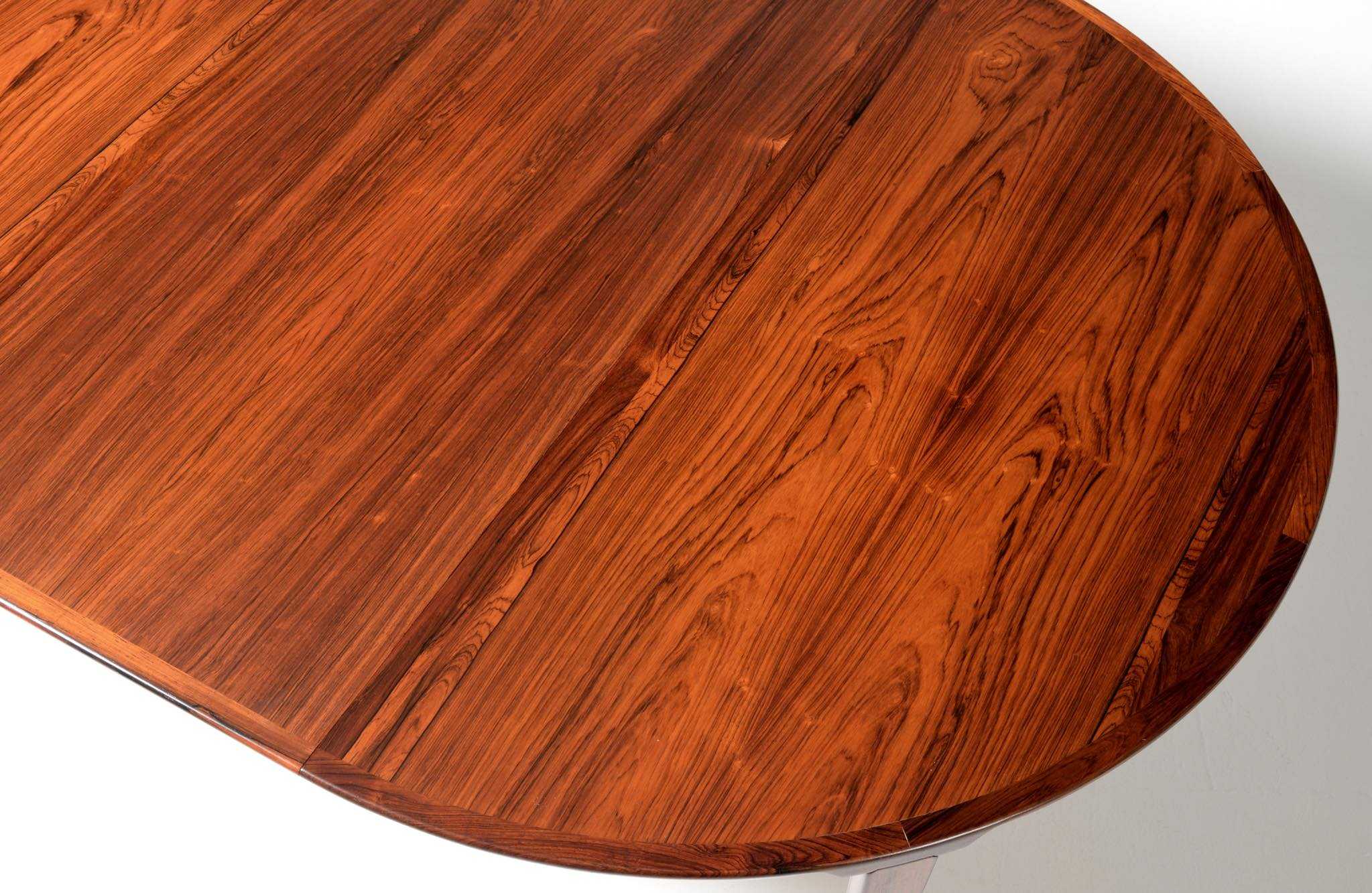1960年代頃に活動した家具デザイナーでキャビネットメーカーのHenry Rosengren Hansen/ヘンリー・ローセングレン・ハンセンによるダイニングテーブルです。天板のエッジとそれに連なる脚の接合に特徴があり、高度な技術と特異なデザインが魅力のテーブルです。脚は角や丸ではなく「T」字型で作られており、より薄く空間的な圧迫感を軽減させながら強度を保てるように設計されています。表面の塗膜に劣化が見られたため再塗装を施しました。主天板のエクステンションリーフを設置する面に僅かな呼継補修がありますが、コンディションは良好です。