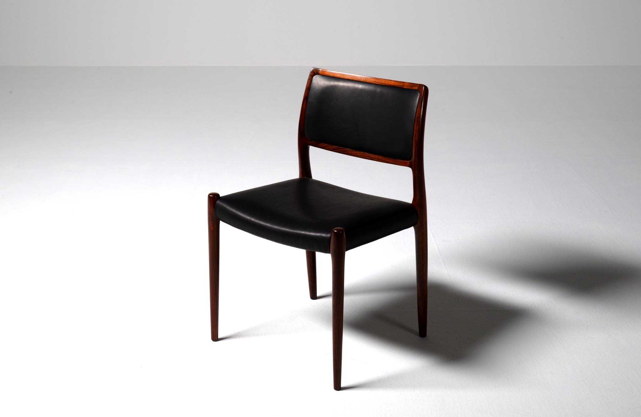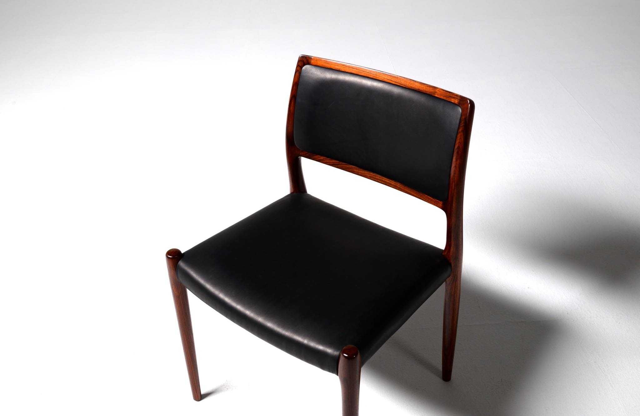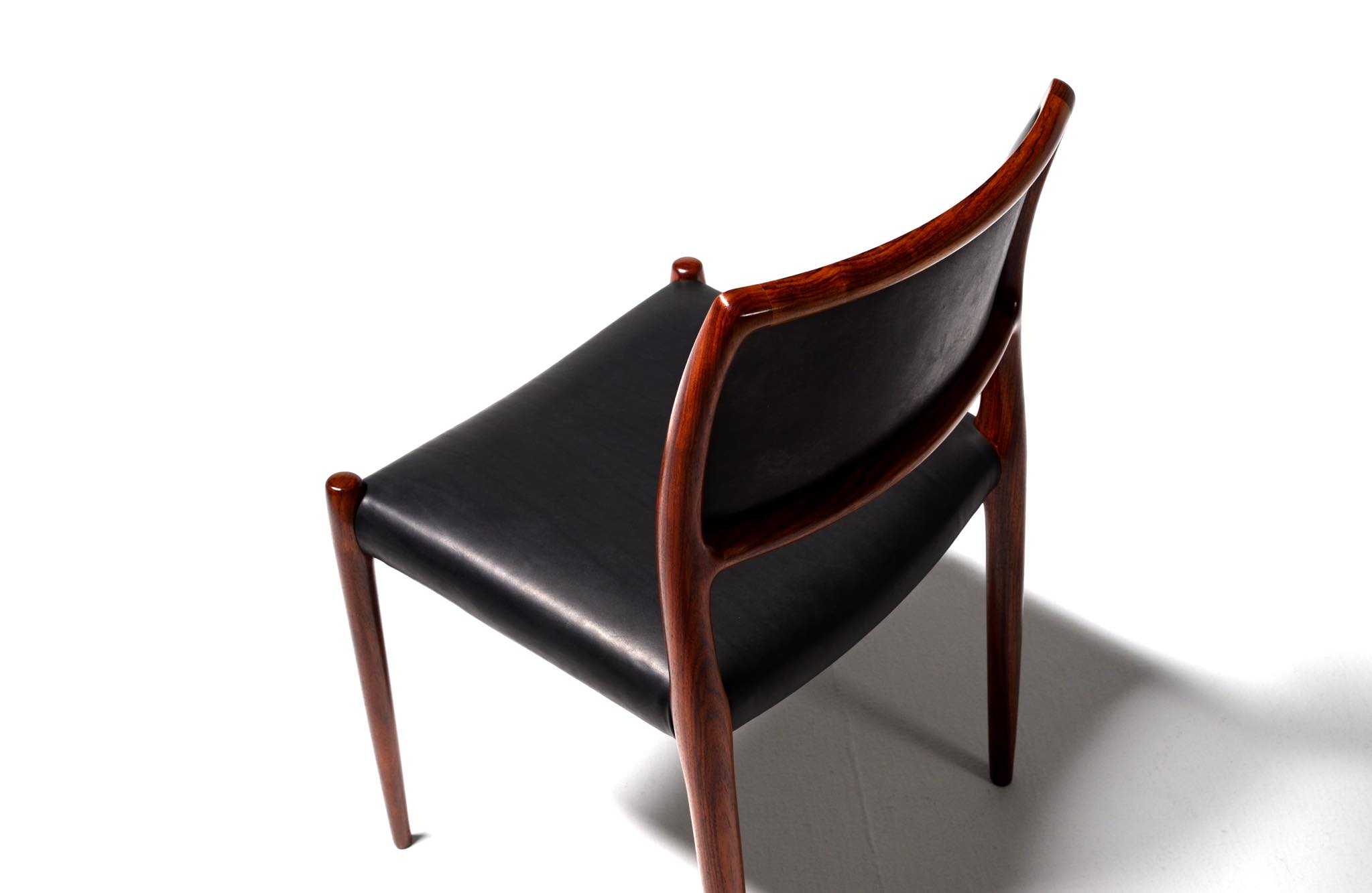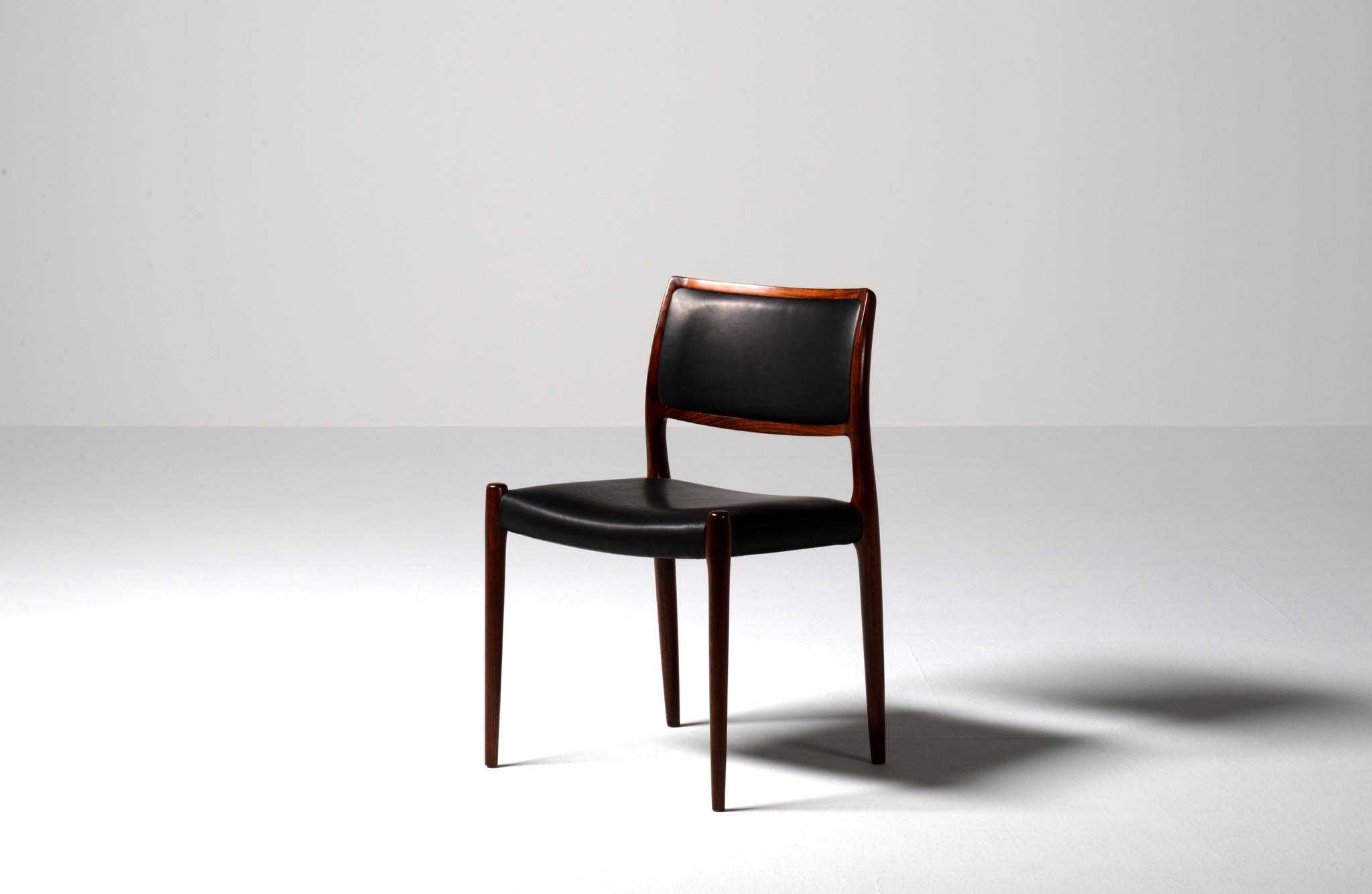 デンマークの家具工房、J.L. Møller/J.L.モラーによるダイニングチェア "Model 80" 4脚セットです。創業者のN.O. Moller/ニルス・オット・モラーによって1968年に発表されたモデルで、こちらはその頃に作られたものでしょう。背もたれにも張り込みのあるモデルで、背あたりが柔らかく、とても座りやすい設計です。木目文様に見応えのあるローズウッドが使われており、座面はデンマークの皮革メーカー”CAMO leather” の黒色皮革にて張り替えました。こちらは4脚セットでの販売となります。